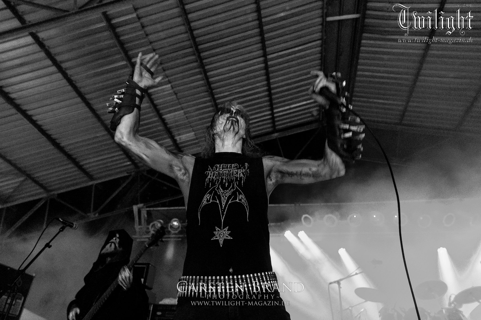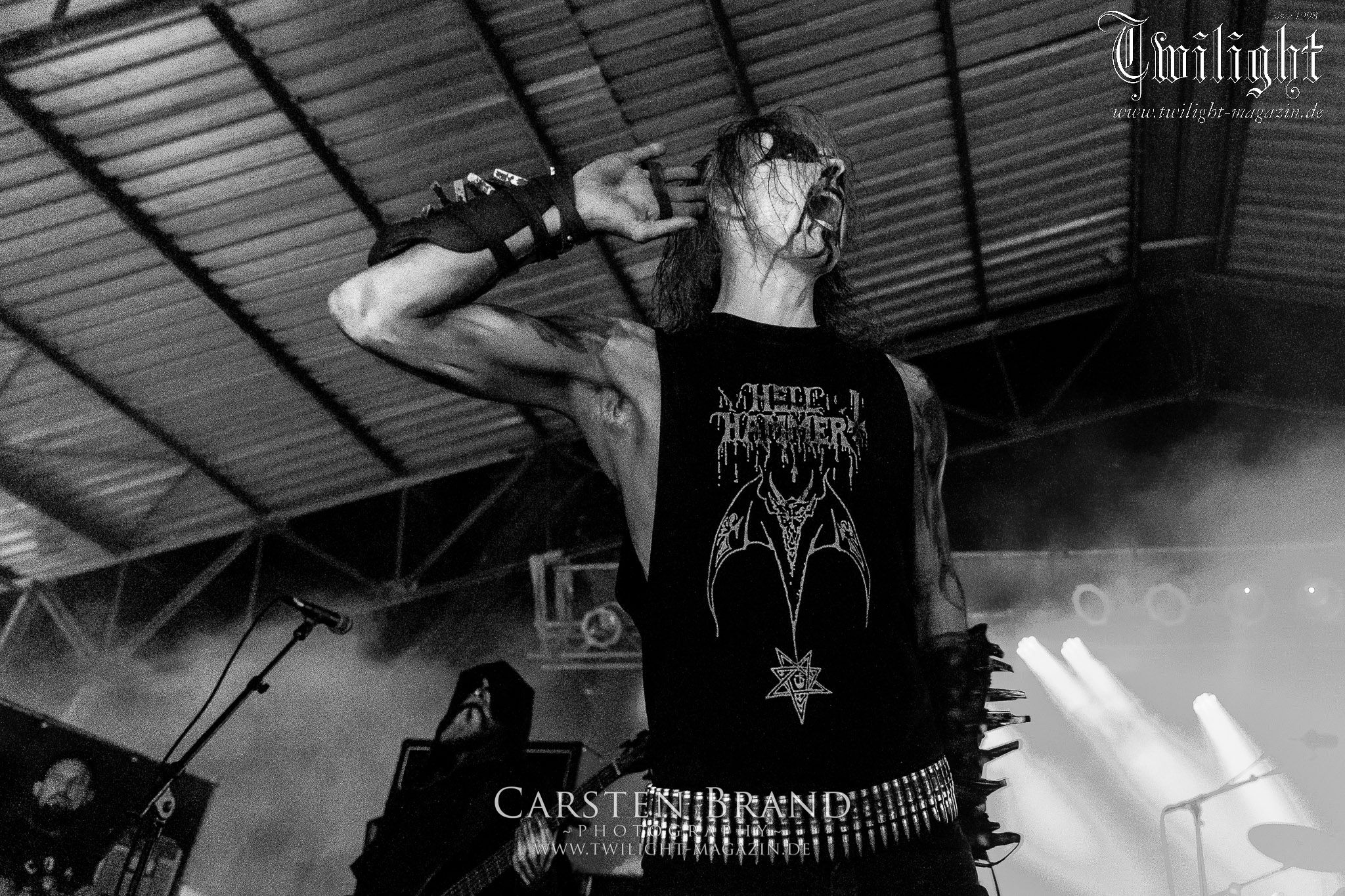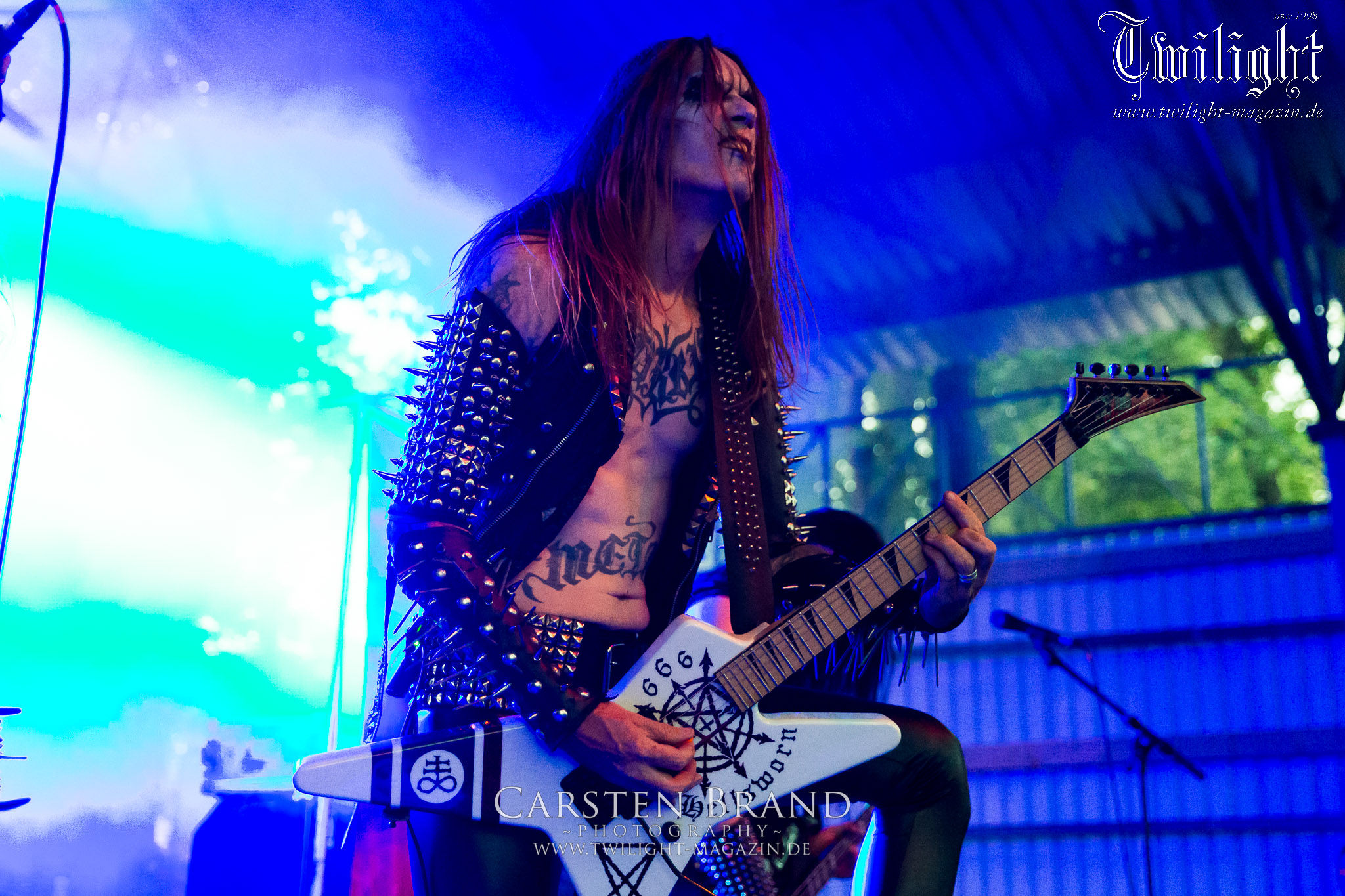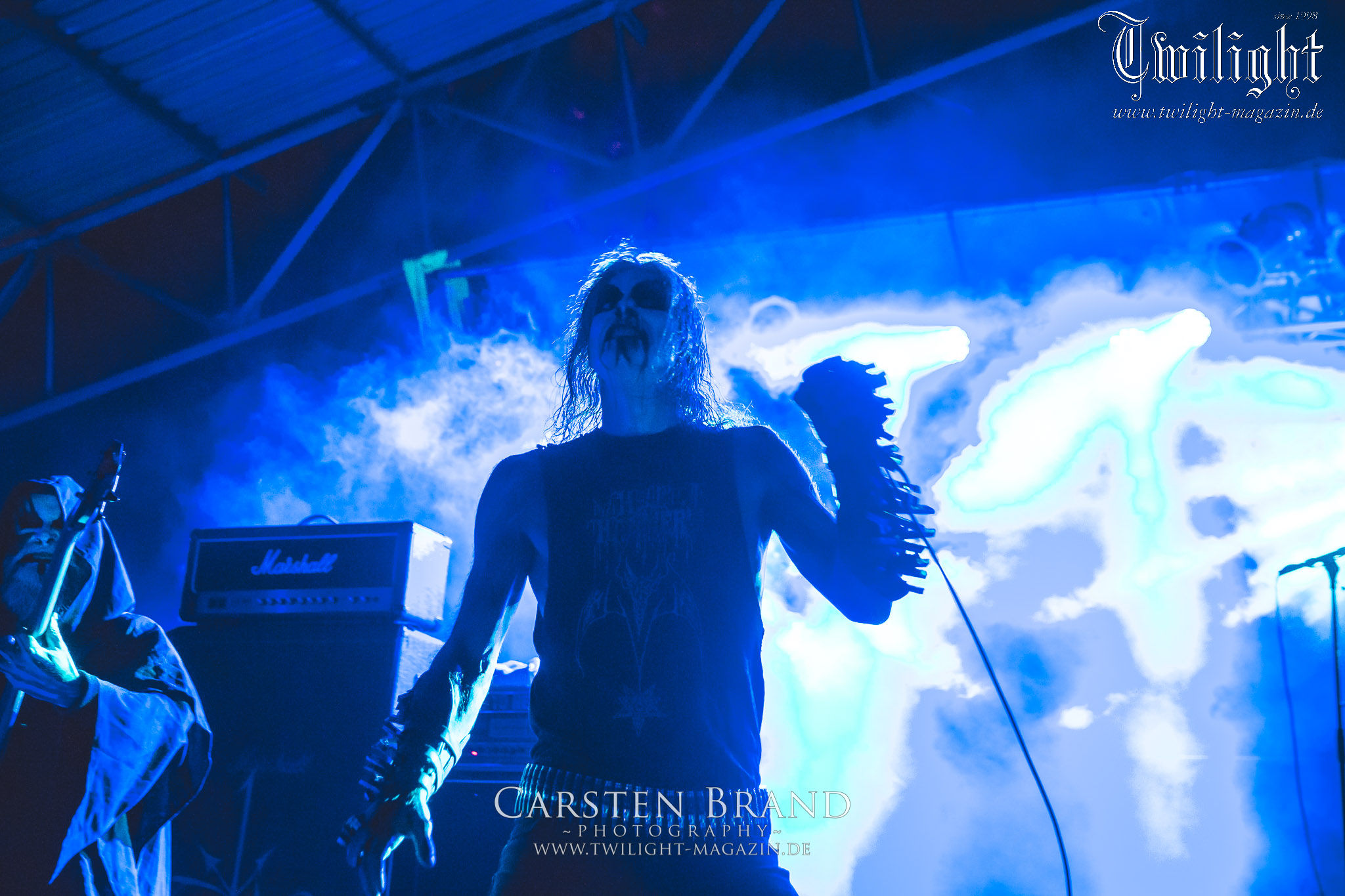 Es ist der technischen Probleme am Vormittag geschuldet, dass man sich zu später Stunde zwischen WANDAR im Zelt und 1349 auf der Hauptbühne entscheiden muss. Allerdings reicht mir der Soundcheck, bei den im Vorfeld der Veröffentlichungen ihres brandneuen Albums "Zyklus" mit Vorschusslorbeeren überschütteten Hallenser, dass mein Platz unter den Baumkronen statt unter der Zeltplane ist. Wer auch immer bei 1349 an diesem Abend hinter den Kesseln sitzt. Frost ist es definitiv nicht. Der große schlacksige Kerl steht ihm aber spielerisch um nichts nach. Die Norweger zelebrieren eine imponierende Mischung aus traditioneller nordischer Raserei und Avangarde, die mir weit mehr zusagt, als der atmosphärische Heiden-(Black)-Metal aus Sachsen-Anhalt. Atmosphäre können 1349 auch, allerdings ist diese musikalisch weitaus packender, tiefgehender, vor allem aber abgrundtief böser, nicht nur, weil perfekt vom dezenten, blauen Licht in Szene gesetzt.