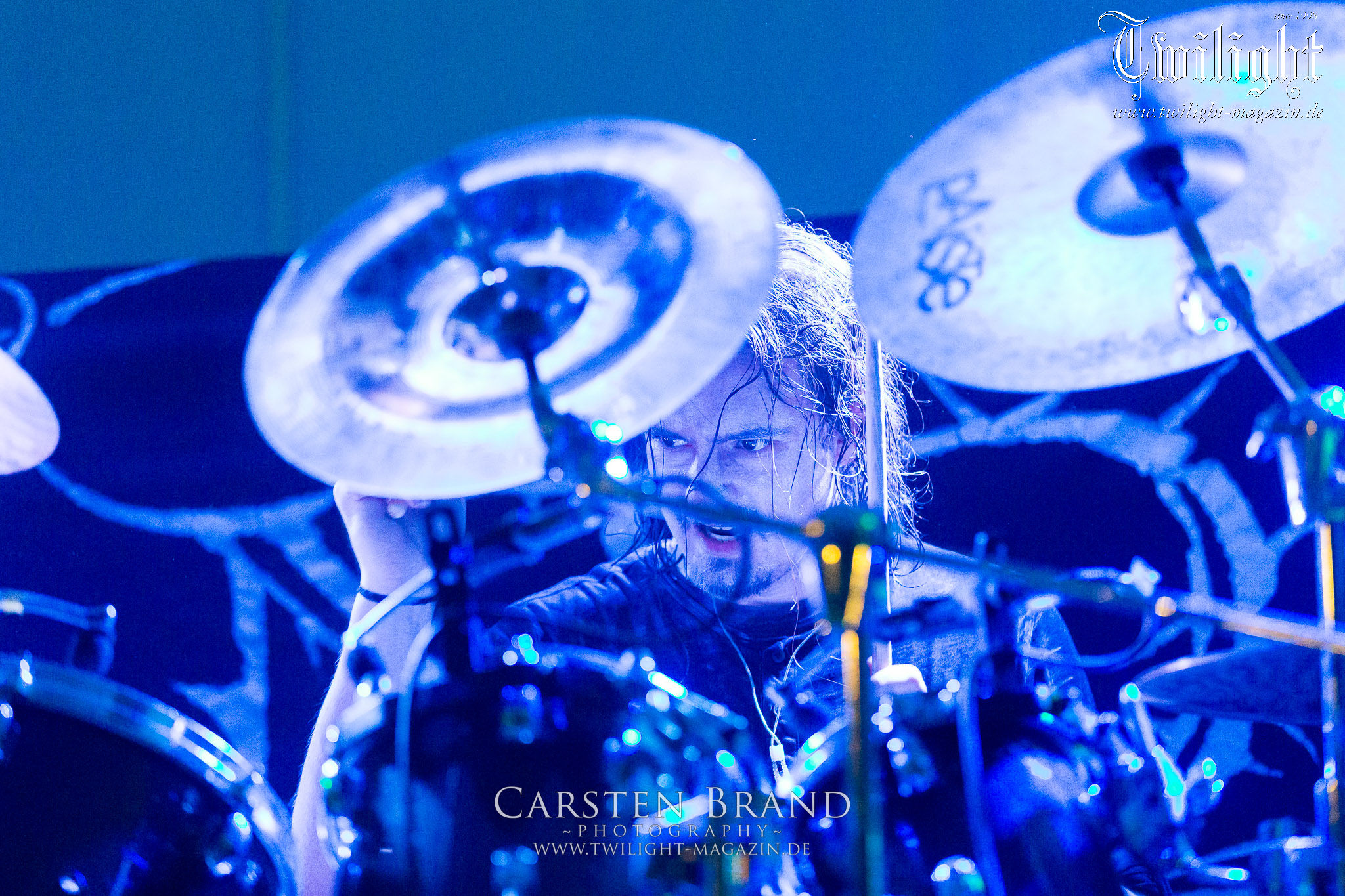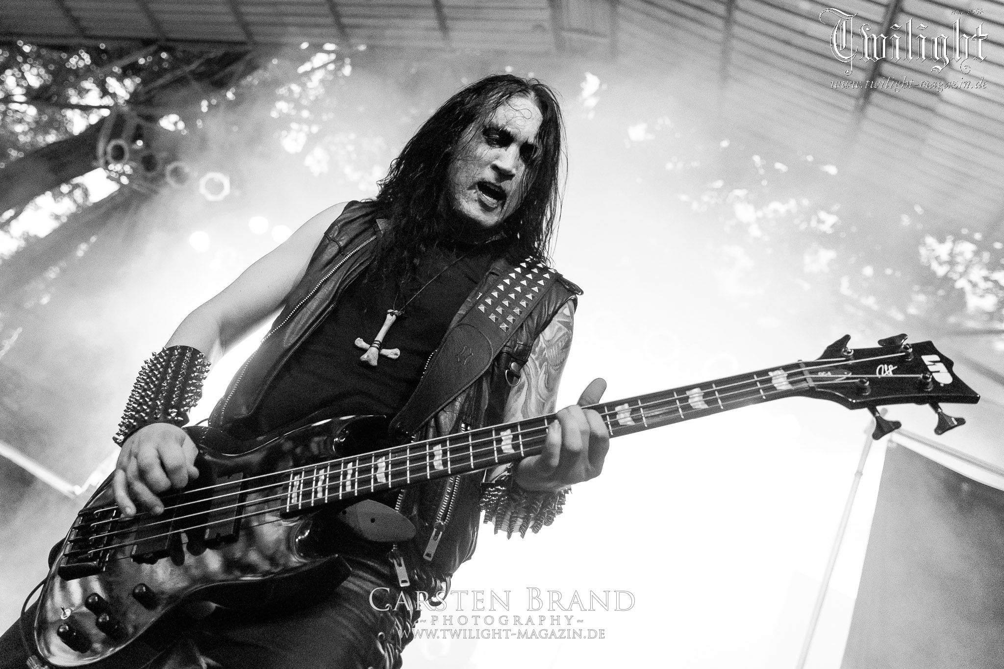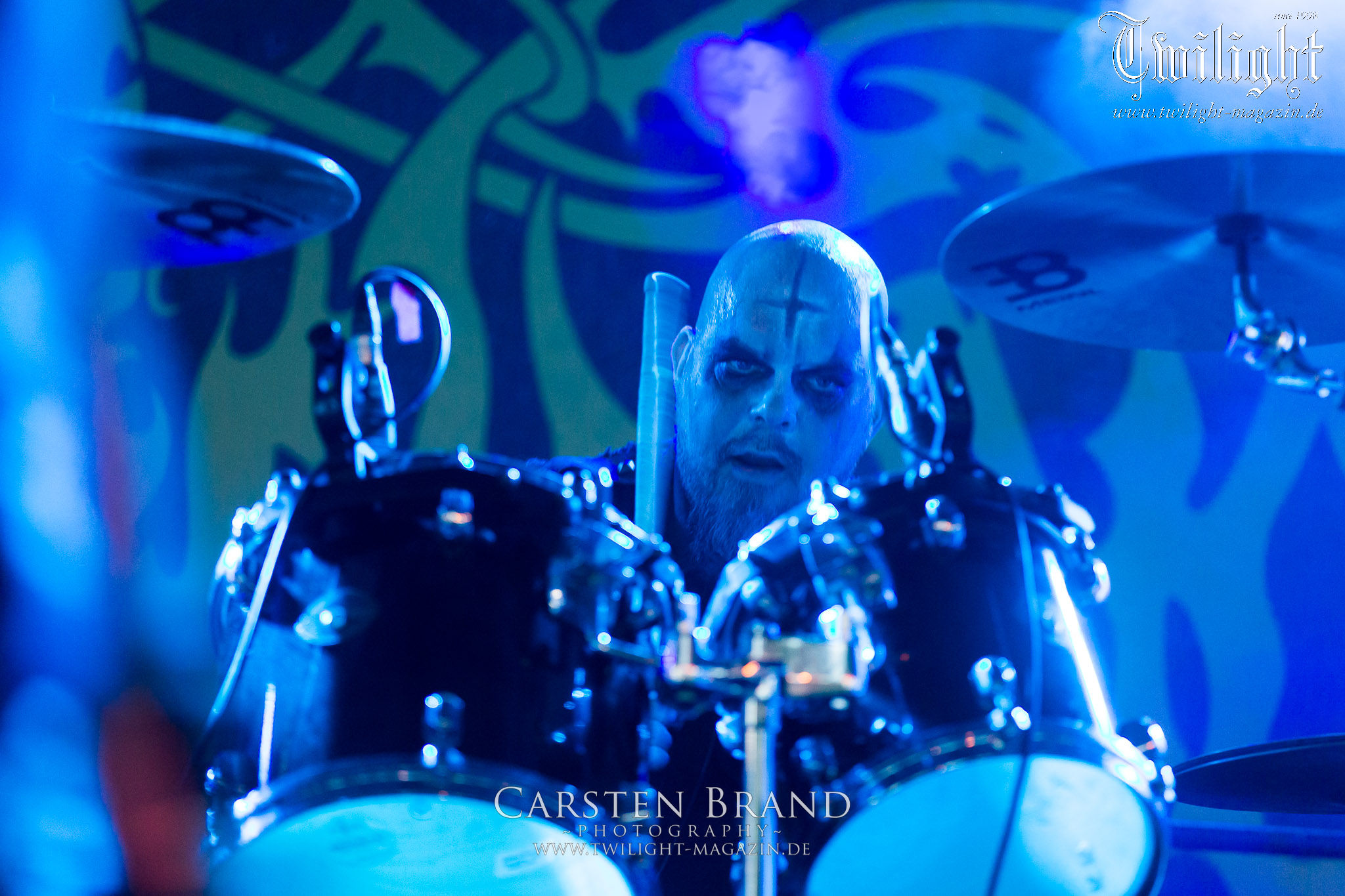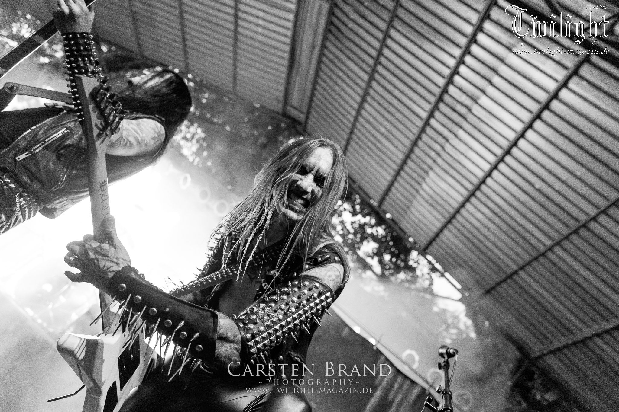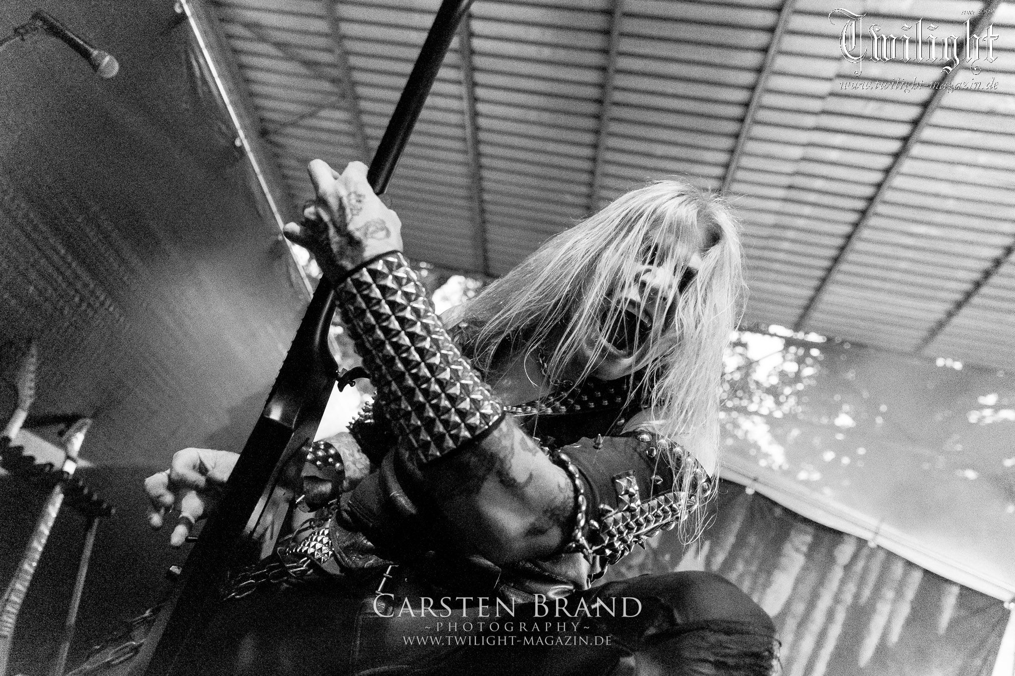 Es ist der technischen Probleme am Vormittag geschuldet, dass man sich zu später Stunde zwischen WANDAR im Zelt und 1349 auf der Hauptbühne entscheiden muss. Allerdings reicht mir der Soundcheck, bei den im Vorfeld der Veröffentlichungen ihres brandneuen Albums "Zyklus" mit Vorschusslorbeeren überschütteten Hallenser, dass mein Platz unter den Baumkronen statt unter der Zeltplane ist. Wer auch immer bei 1349 an diesem Abend hinter den Kesseln sitzt. Frost ist es definitiv nicht. Der große schlacksige Kerl steht ihm aber spielerisch um nichts nach. Die Norweger zelebrieren eine imponierende Mischung aus traditioneller nordischer Raserei und Avangarde, die mir weit mehr zusagt, als der atmosphärische Heiden-(Black)-Metal aus Sachsen-Anhalt. Atmosphäre können 1349 auch, allerdings ist diese musikalisch weitaus packender, tiefgehender, vor allem aber abgrundtief böser, nicht nur, weil perfekt vom dezenten, blauen Licht in Szene gesetzt.