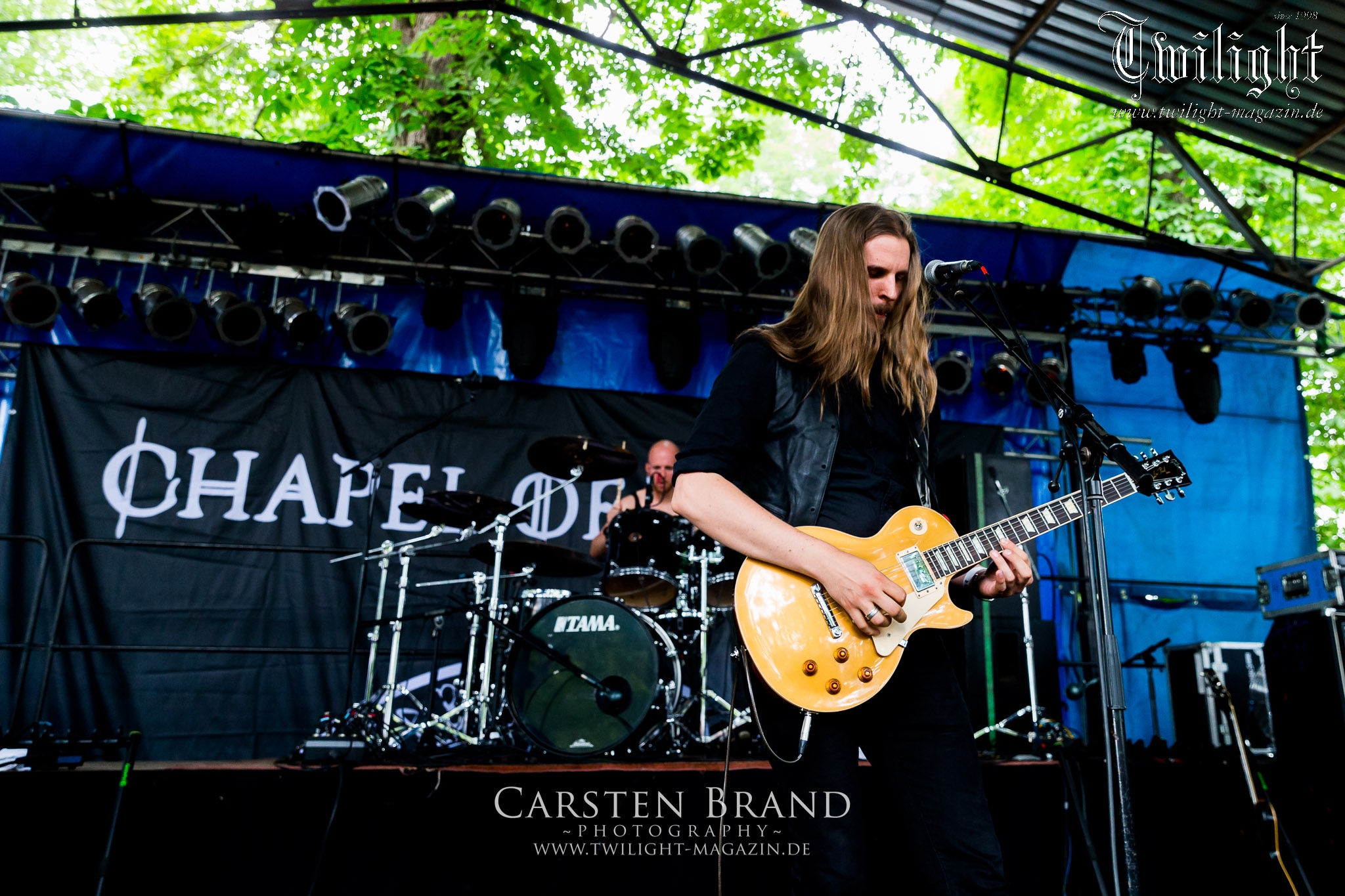 Am frühen Nachmittag wird dann im Zelt bei VERHEERER wieder angegriffen. Die Jungs aus dem hohen Norden spielen erfreulich klischeefreien, rasanten, melodischen Black Metal und werden im Underground in den letzen ein zwei Jahren durchaus gefeiert. So richtig packen will mich das, was auf der Bühne abgeht und aus den Boxen schallt, leider nicht. Es fehlt mir da einfach an entscheidender Stelle Biss, Leidenschaft und Feuer, aber das ist nur meine persönliche Wahrnehmung. Die Death-/Goregrind-Attacke von INHUME setze ich anschließend aus, wobei danach schon eines meiner heißerwarteten Highlights des diesjährigen IN FLAMMEN OPEN AIR wartet. CHAPEL OF DISEASE haben mit ihrem aktuellen Album "...And As We Have Seen The Storm, We Have Embraced The Eye" nicht nur einen gewaltigen Schritt nach vorn gemacht. Nein, das Kölner Quartett hat aus meiner Sicht ein absolut eigenständiges Referenzwerk zwischen klassischem Rock, Black und Death Metal vorgelegt. Daher wundert es kaum, dass das Album bei der Setlist, wie schon beim Rock Hard Festival im Fokus steht. Chapel Of Disease wissen mit diesem überragenden Songmaterial und ihren musikalischen Qualitäten ohne jeglichen Firlefanz und Pseudo-Gepose auszukommen. Hier stehen vier Leute auf der Bühne, die ihre mächtigen Kompositionen zelebrieren. Der Rest ist pure Emotion. Ganz stark!!! BULLET schießen in Sachen Retro-Hardrock/Heavy Metal bei ihrem Auftritt über meine persönliche Erträglichkeitsskala hinaus. Der erdige, kantige und auch griffige Sound inkl. stilechter Umsetzung mit jeder Menge Nieten und Gepose der Band, die den Schweden-Reigen am heutigen Nachmittag auf der Hauptbühne eröffnet, will mir einfach nicht zusagen. Vielleicht spielen Bullet einfach nur zur falschen Zeit aber auf Konserve hatte ich die Herren aus dem Elch-Reservat irgendwie zündender in Erinnerung.