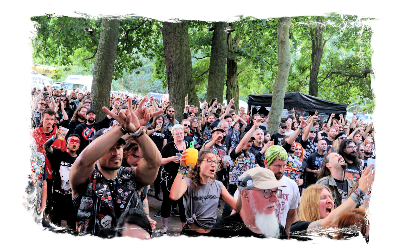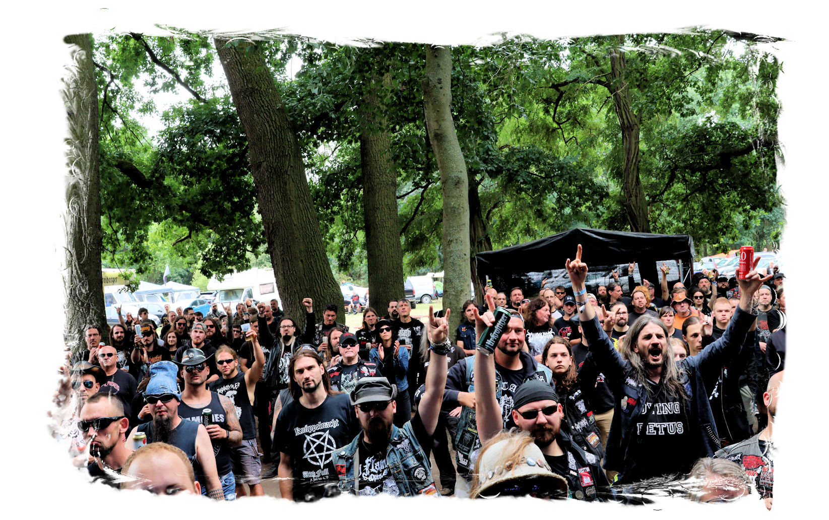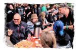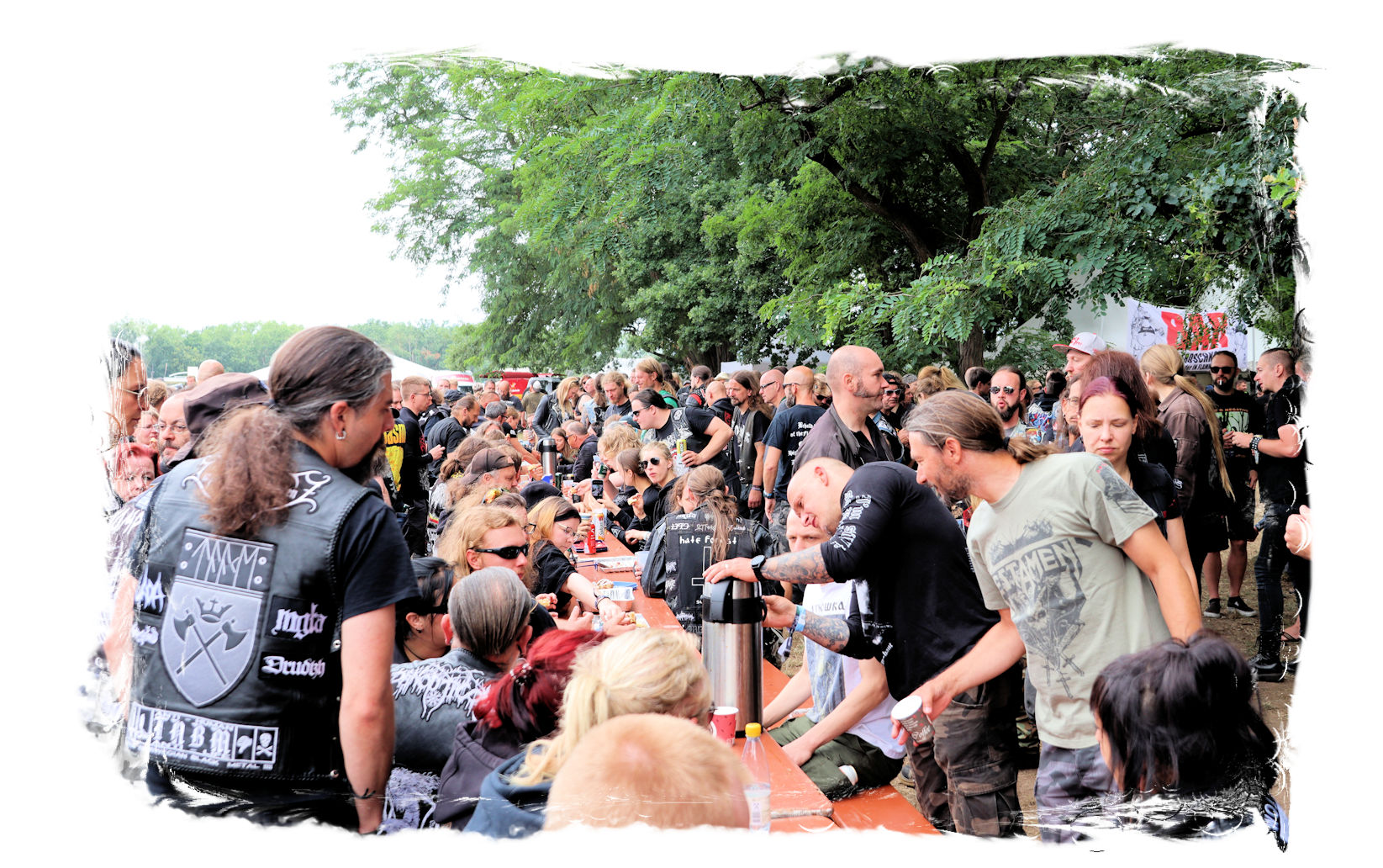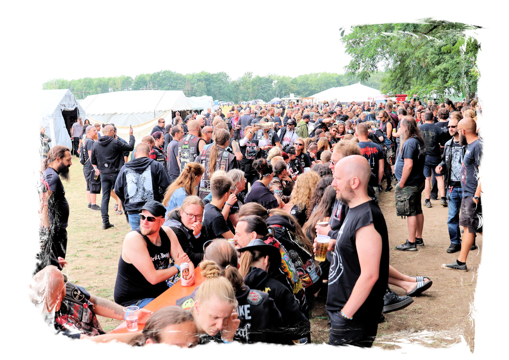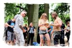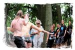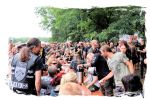Trotzdem startet der Samstag traditionell pünktlich um 10:00 Uhr morgens am Stand von Ketzer Records. Extremsportler Hebbe versammelt erneut zu so beachtlicher Stunde am finalen Festival-Tag eine Meute von 30-50 Metalheads, die zeigt, dass sich Sport und Heavy Metal nicht ausschließen. Und schon geht´s los auf eine gemütliche Runde von acht Kilometern um den angrenzenden "großen Teich". Jeder in seinem Tempo, wobei niemand zurück gelassen wird, inkl. Obligatorischer (Bade-)Pause am Strandbad. Zurück auf dem Gelände werden wir schon mit Bananen, Melone, Cider, Pfeffi und Wasser erwartet. "Survival"-Urkunden von Thomas gibt es in diesem Jahr leider nicht, dafür kredenzen Ketzer Records für jeden eine CD aus dem aktuellen Programm. Trotz Phantom-Erkältung, so startet es sich verdammt cool in den Tag.