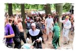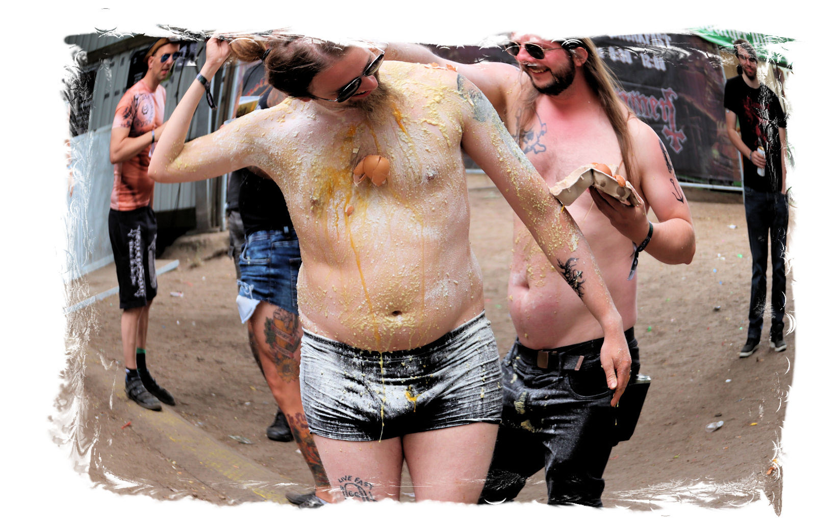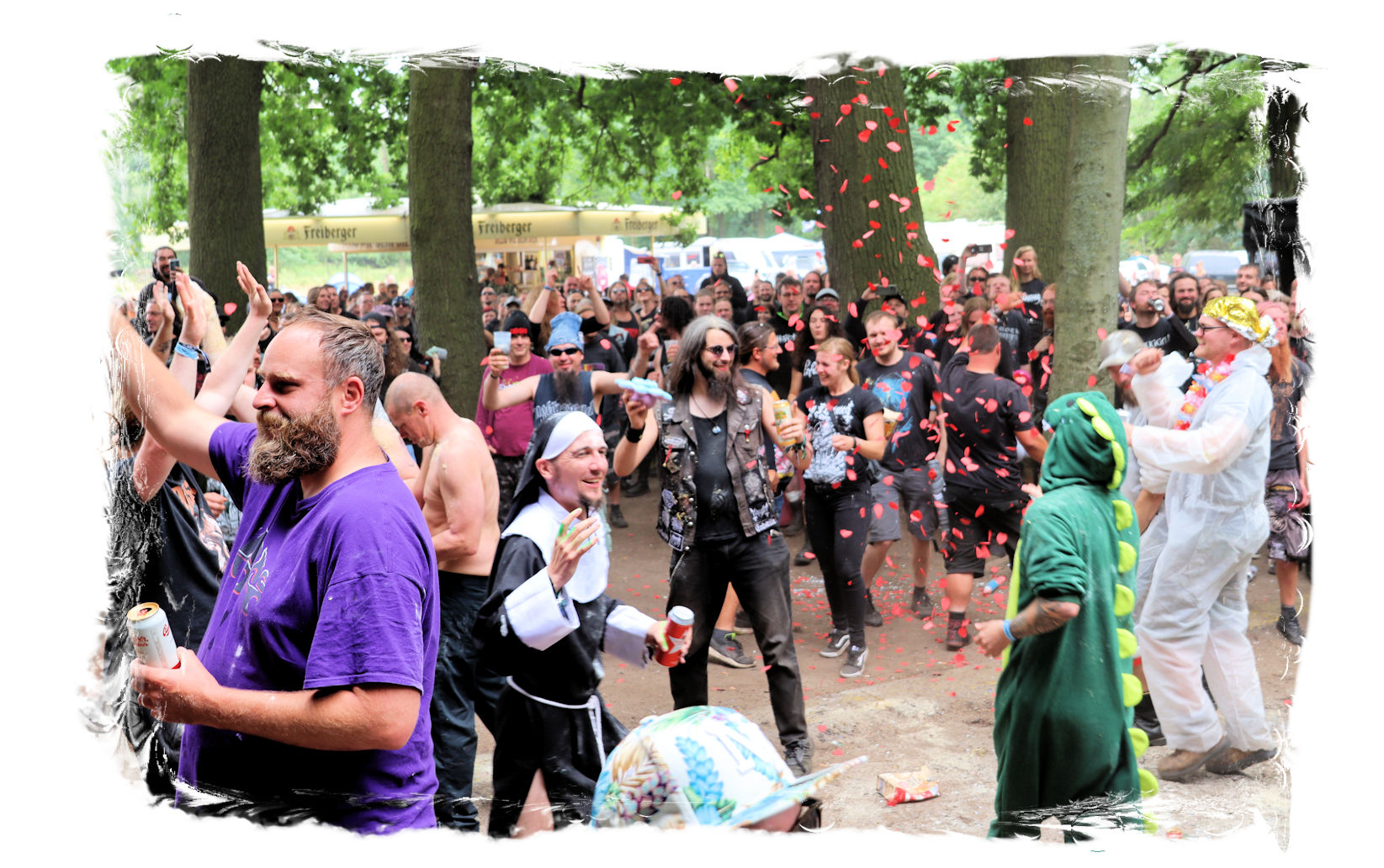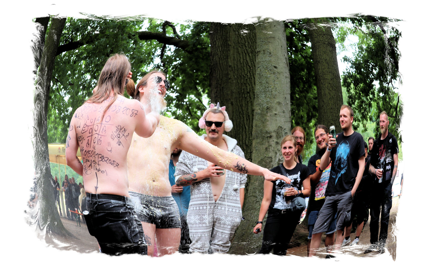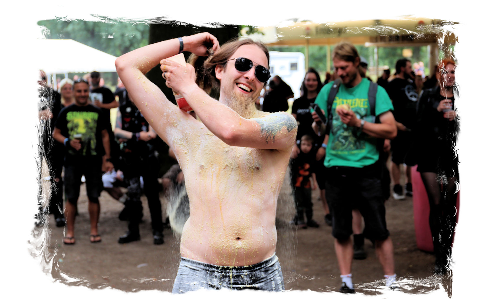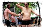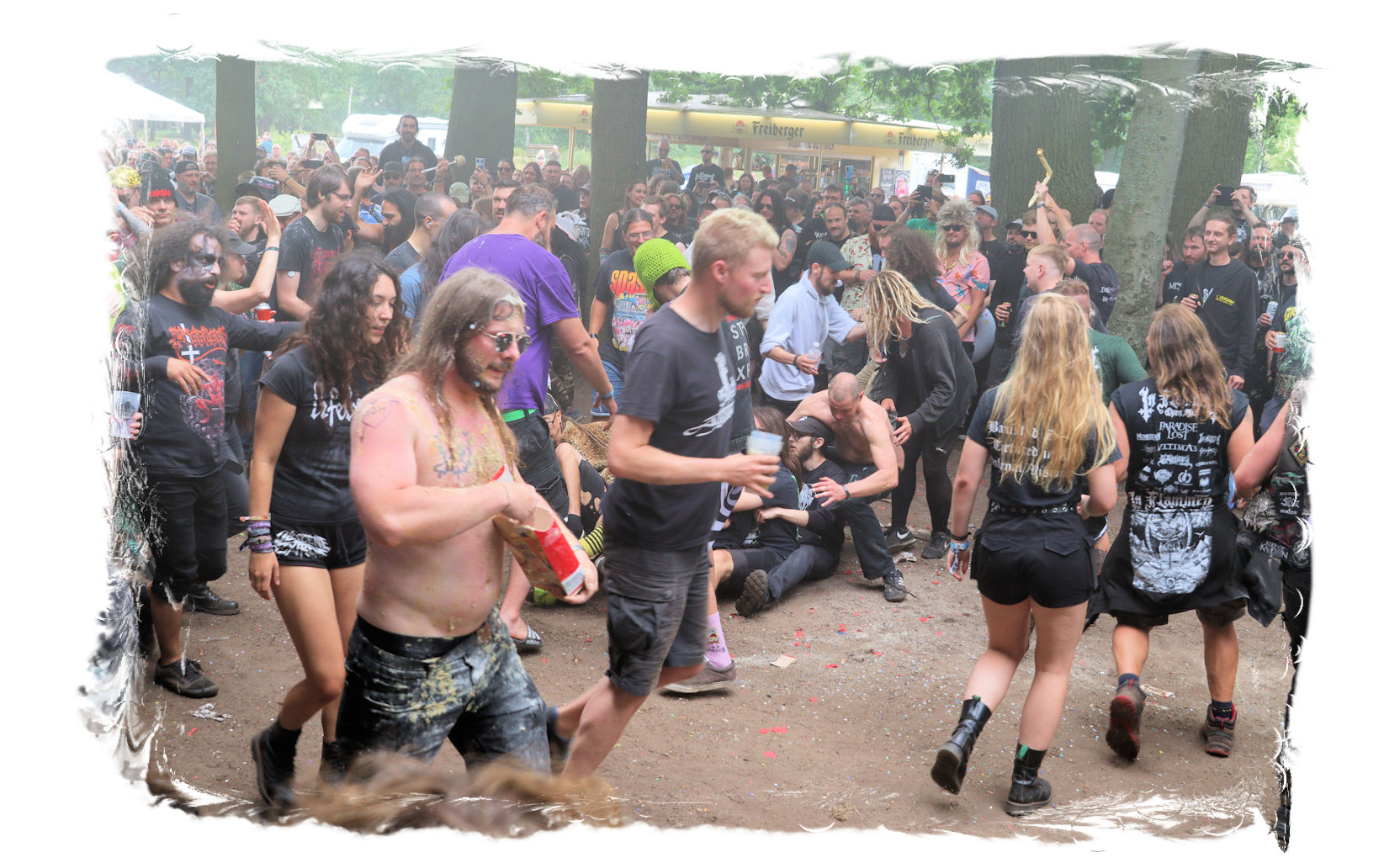 Trotzdem startet der Samstag traditionell pünktlich um 10:00 Uhr morgens am Stand von Ketzer Records. Extremsportler Hebbe versammelt erneut zu so beachtlicher Stunde am finalen Festival-Tag eine Meute von 30-50 Metalheads, die zeigt, dass sich Sport und Heavy Metal nicht ausschließen. Und schon geht´s los auf eine gemütliche Runde von acht Kilometern um den angrenzenden "großen Teich". Jeder in seinem Tempo, wobei niemand zurück gelassen wird, inkl. Obligatorischer (Bade-)Pause am Strandbad. Zurück auf dem Gelände werden wir schon mit Bananen, Melone, Cider, Pfeffi und Wasser erwartet. "Survival"-Urkunden von Thomas gibt es in diesem Jahr leider nicht, dafür kredenzen Ketzer Records für jeden eine CD aus dem aktuellen Programm. Trotz Phantom-Erkältung, so startet es sich verdammt cool in den Tag.