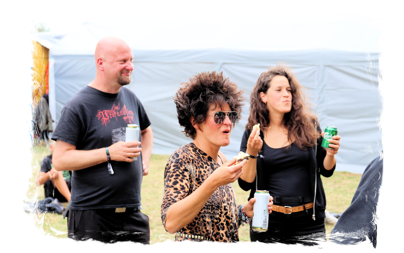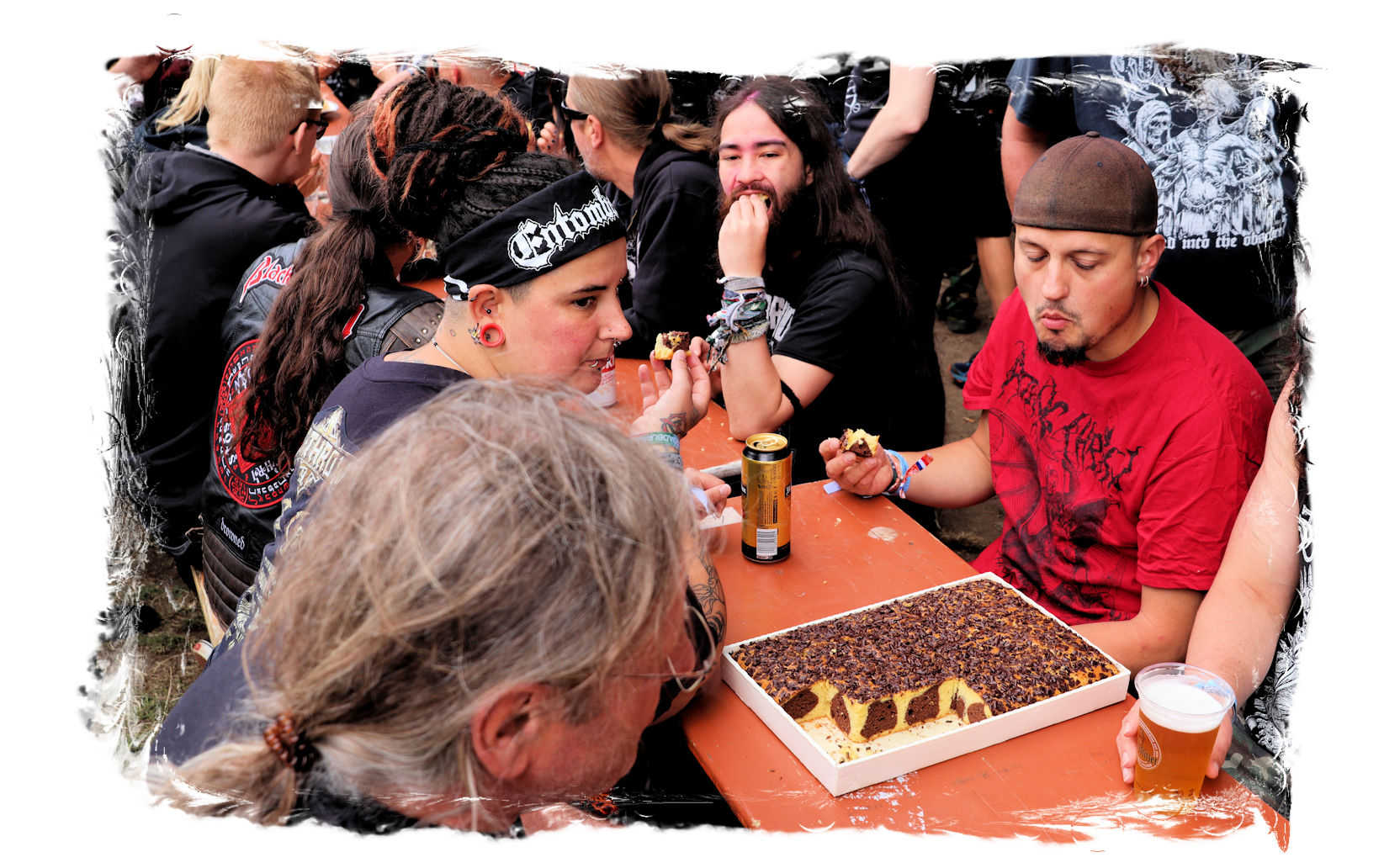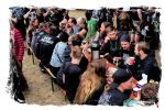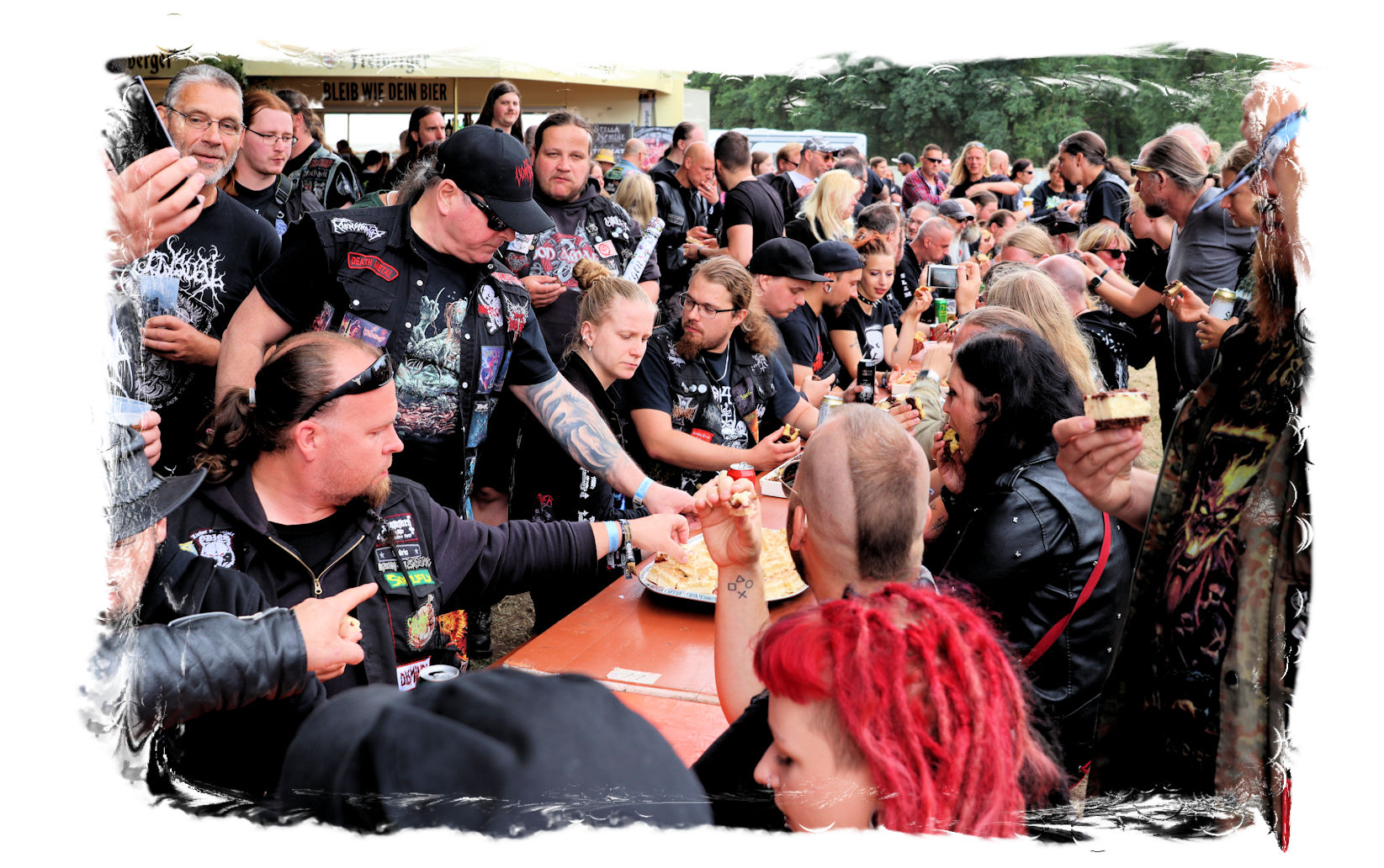 Für den musikalischen Hallo-Wach-Effekt sorgen dann zur Mittagszeit die Chilenen von DEZAZTRE NATURAL. Was für eine herrlich angepisste und abgefuckte Mischung aus Thrash Metal und Hardcore mit spanischen Texten. Mit diesem Südamerika-Brett einer höchst agilen und rotzigen Band hat der Tag gleich sein erstes Ausrufezeichen und ich meinen ersten Latte Machiato mit Baileys. Schließlich gilt es sich, auf die längste Kuchentafel der Festivalsaison einzustimmen.