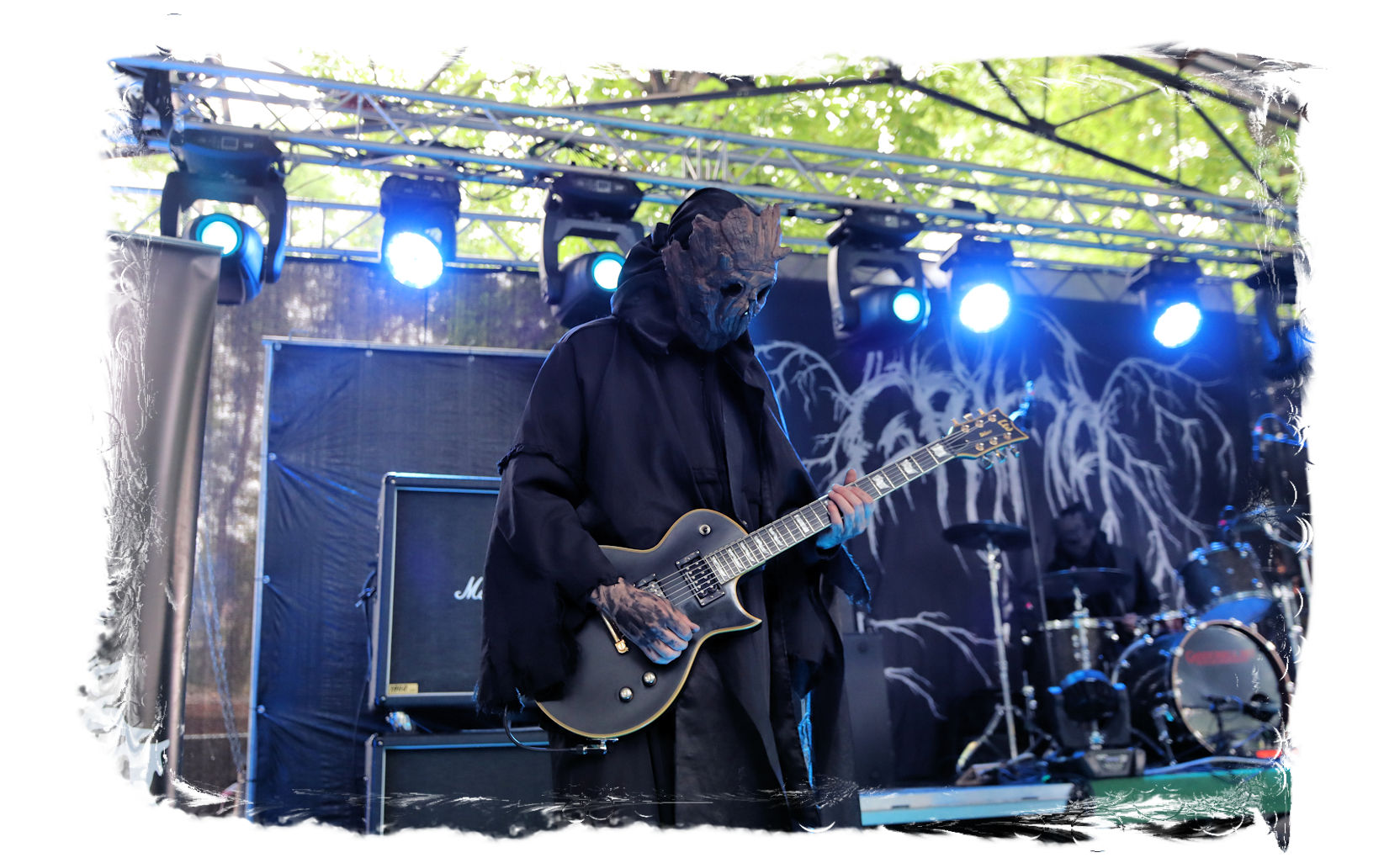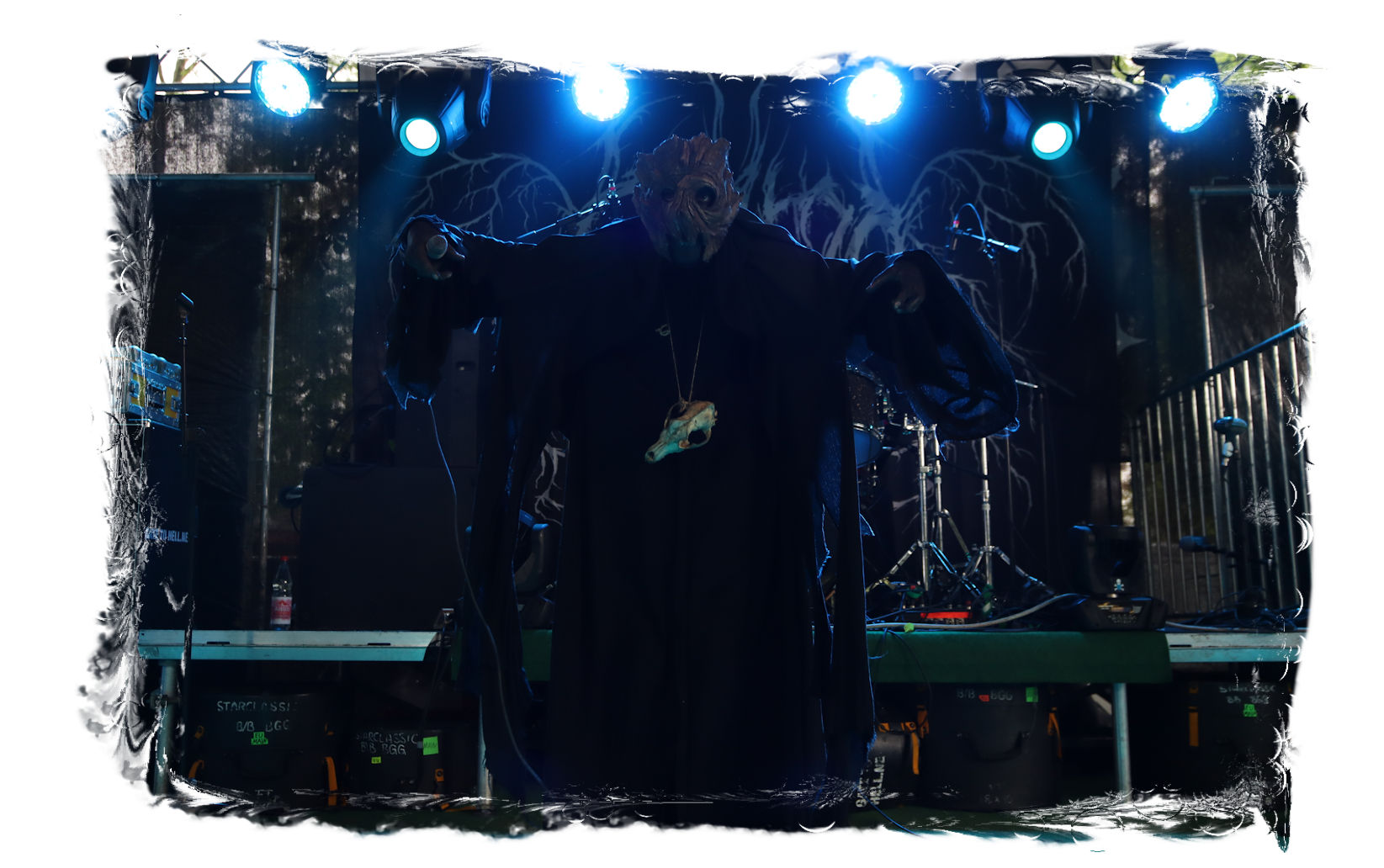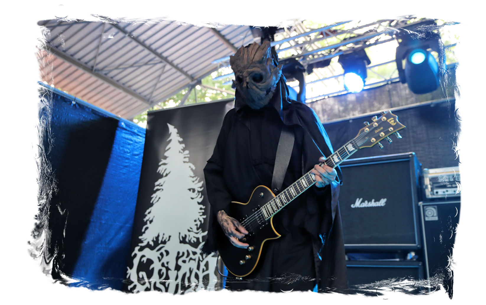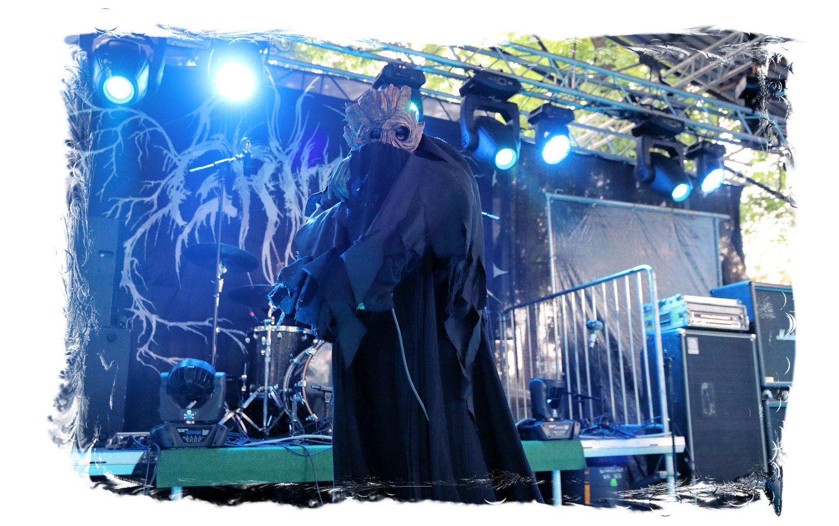 Der Start des diesjährigen IN FLAMMEN OPEN AIRs obliegt den beiden, besetzungstechnisch miteinander verflochtenen Bands ULTAR und GRIMA. Erstere lasse ich mit ihrem atmosphärischen, leicht progressiven Doom-Death noch aus, da die Band nicht so meine Kragenweite ist, während nicht nur ich auf Grima besonders gespannt bin. Denn der nicht weniger atmosphärische Black Metal, der von der weiten und einzigartigen Landschaft Sibiriens beeinflusst ist, weckt nicht nur in den aufwändigen und wunderschönen Videos der Band Emotionen. Bittersüß, introvertiert mit einer unnahbaren und epischen Note tragen die Songs des in schwarze Roben gewandete Quartetts durch den wohlig flirrenden Set. Die Gesichter sind hinter Masken verborgen, die Baumrinde und Borke nachempfunden sind. Richtige Highlights lassen sich in der Show nicht ausmachen und doch sorgen Grima für den einen oder anderen wohligen emotionalen Schauer und einen super Einstand für den restlichen Abend. Wohlig ums Herz dürfte es nicht nur mir geworden sein, anlässlich des Umstandes, nach zwei Jahren Abstinenz (die Ferienlager mal ausgenommen) endlich wieder im heiligen Hain vor der Bühne des Entenfangs stehen zu dürfen. So viele Menschen, die man viel zu lange nicht gesehen hat und nicht herzen durfte. Mir fällt es auch im Nachhinein noch schwer, meine vielen, großen, kleinen und intensiven, überbordenden Emotionen in Worte zu fassen. Aber ich denke alle, die dabei waren, dürften in etwa wissen, was ich meine...