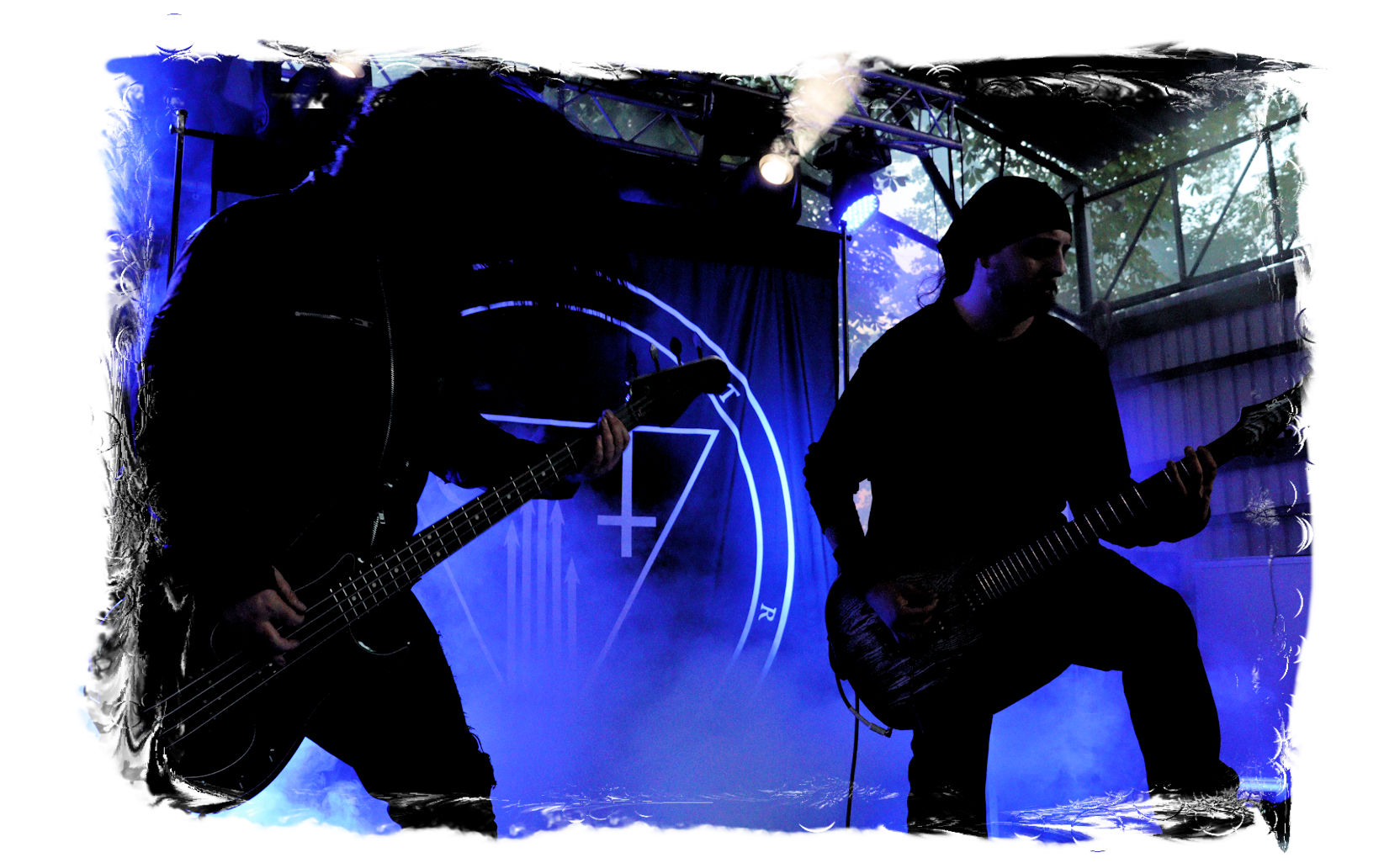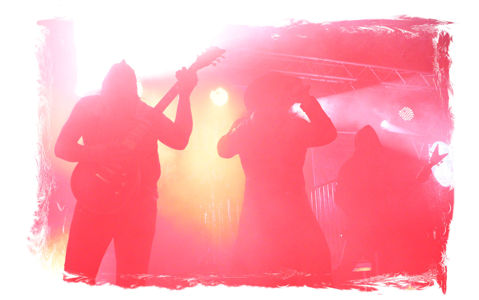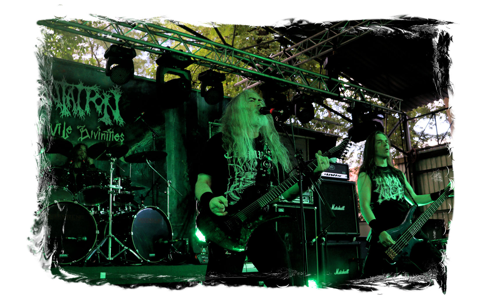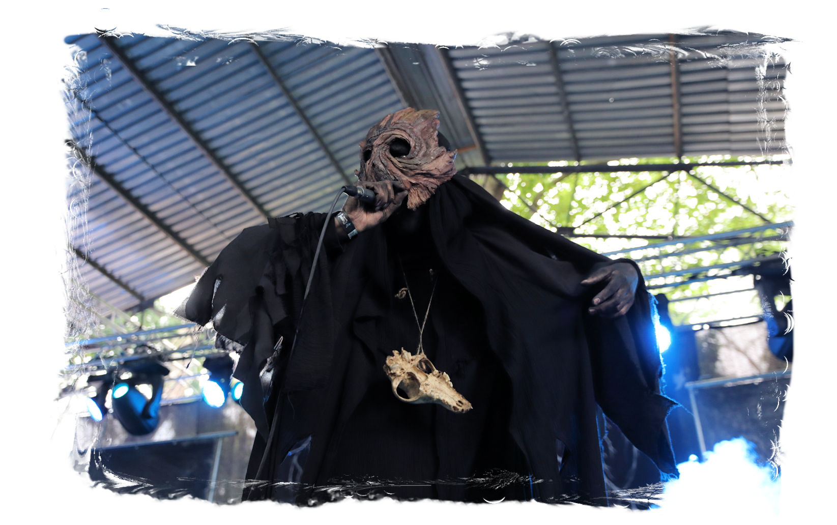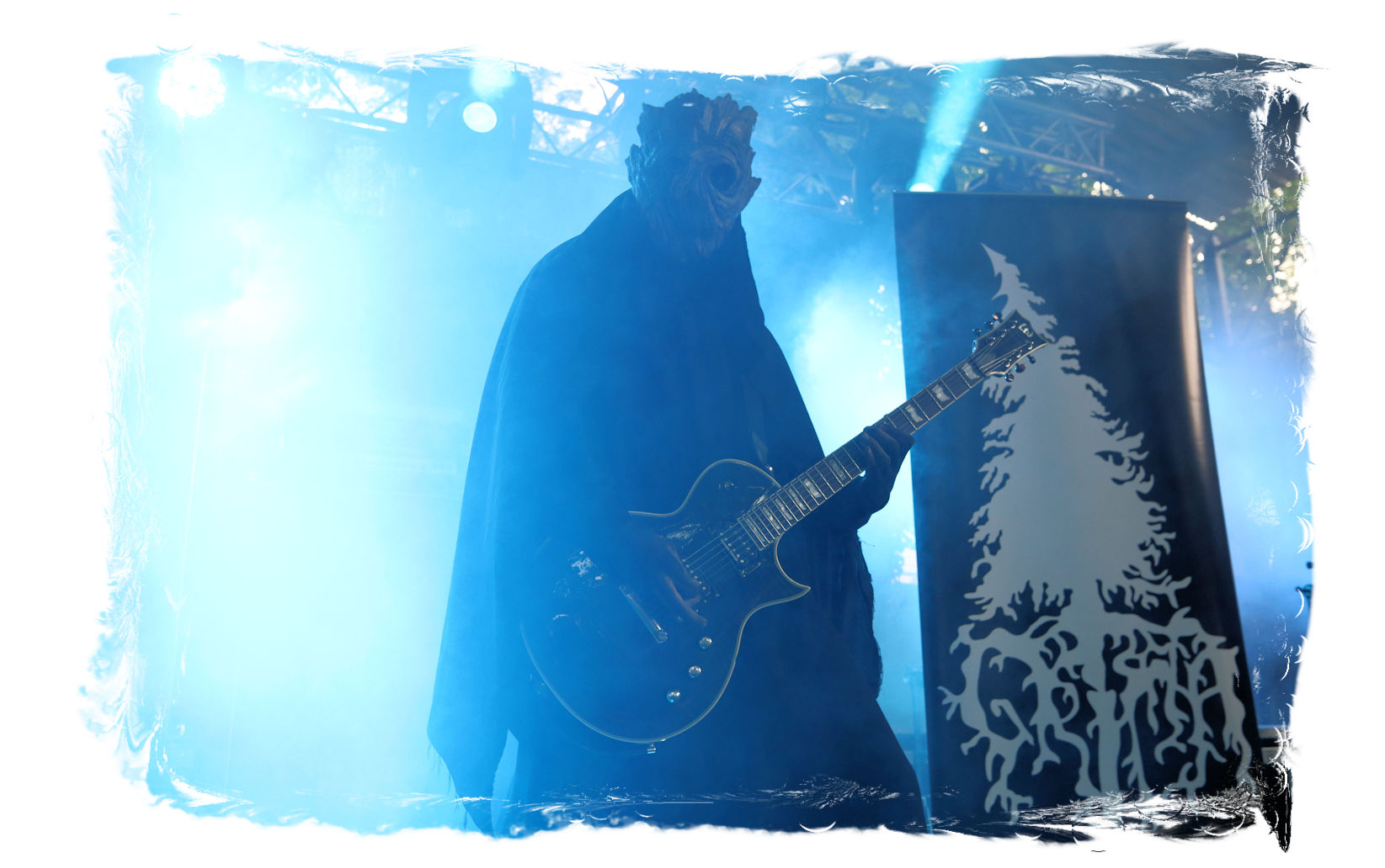Der Start des diesjährigen IN FLAMMEN OPEN AIRs obliegt den beiden, besetzungstechnisch miteinander verflochtenen Bands ULTAR und GRIMA. Erstere lasse ich mit ihrem atmosphärischen, leicht progressiven Doom-Death noch aus, da die Band nicht so meine Kragenweite ist, während nicht nur ich auf Grima besonders gespannt bin. Denn der nicht weniger atmosphärische Black Metal, der von der weiten und einzigartigen Landschaft Sibiriens beeinflusst ist, weckt nicht nur in den aufwändigen und wunderschönen Videos der Band Emotionen. Bittersüß, introvertiert mit einer unnahbaren und epischen Note tragen die Songs des in schwarze Roben gewandete Quartetts durch den wohlig flirrenden Set. Die Gesichter sind hinter Masken verborgen, die Baumrinde und Borke nachempfunden sind. Richtige Highlights lassen sich in der Show nicht ausmachen und doch sorgen Grima für den einen oder anderen wohligen emotionalen Schauer und einen super Einstand für den restlichen Abend. Wohlig ums Herz dürfte es nicht nur mir geworden sein, anlässlich des Umstandes, nach zwei Jahren Abstinenz (die Ferienlager mal ausgenommen) endlich wieder im heiligen Hain vor der Bühne des Entenfangs stehen zu dürfen. So viele Menschen, die man viel zu lange nicht gesehen hat und nicht herzen durfte. Mir fällt es auch im Nachhinein noch schwer, meine vielen, großen, kleinen und intensiven, überbordenden Emotionen in Worte zu fassen. Aber ich denke alle, die dabei waren, dürften in etwa wissen, was ich meine...