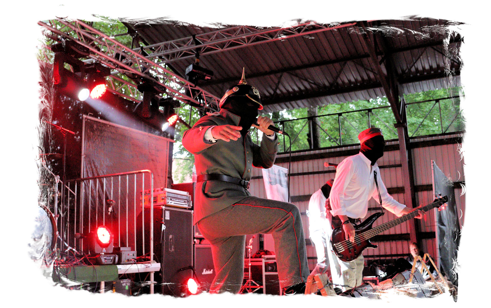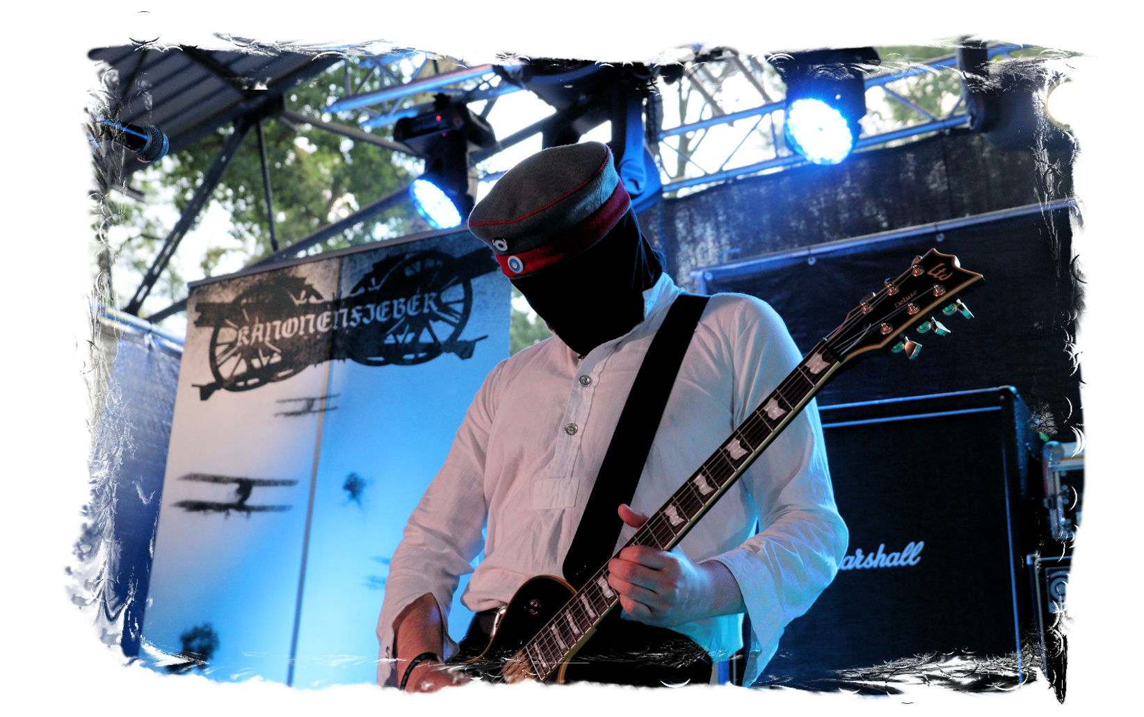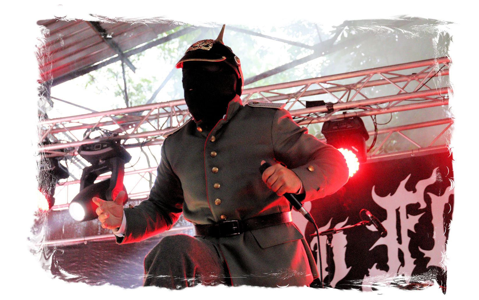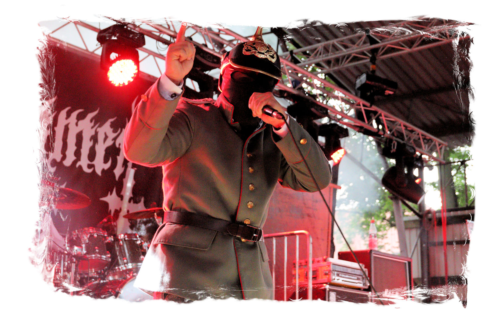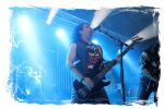 Die Ästhetik der Artworks und des Merchdesigns von KANONENFIEBER üben zugegenermaßen eine starke Faszination auf mich aus. Ich widerstand jedoch glücklicherweise dem Drang, mich dem Konsum hinzugeben, und wartete zunächst die Show des Fünfers ab. Nun ist es nicht erst, seitdem ein grausamer Krieg im Herzen Europas tobt, alles andere als originell, den Krieg (insbesondere WK l und WK ll) in den Fokus des Konzeptes zu stellen. In dieser Hinsicht kann man die Band aus Bamberg wohl irgendwo zwischen 1914 und Minenfeld verorten, wobei man im Vergleich zu vorgenannten Genrevertretern musikalisch eine ausgeprägte melodische Black Metal – Schlagseite an den Tag legt. Die Show ist ebenso wie die Artworks akkurat durchexerziert, die Bühne mit allerlei Requisiten in ein Schlachtfeld des ersten Weltkrieges verwandelt. Dementsprechend legt der uniformierte Stoßtrupp auch los, als müsse man den gegnerischen Schützengraben im Sturm nehmen. Das IN FLAMMEN – Publikum geht an diesem Abend erstmals so richtig steil und lässt sich nicht erst später am Merchstand so richtig mitreißen. Für mich ist das alles zwar sehr unterhaltsam, insgesamt fehlt es mir musikalisch gesehen jedoch auf Dauer ziemlich an Substanz. Pickelhaube hin, Landsermütze her, die zusätzlichen Stofftüten sind aus meiner Sicht dann definitiv drüber, nicht nur weil es für mich bis heute eine unumstößliche Regel gibt: Säcke überm Kopf dürfen bei mir lediglich Midnight und Uada tragen, Punkt!