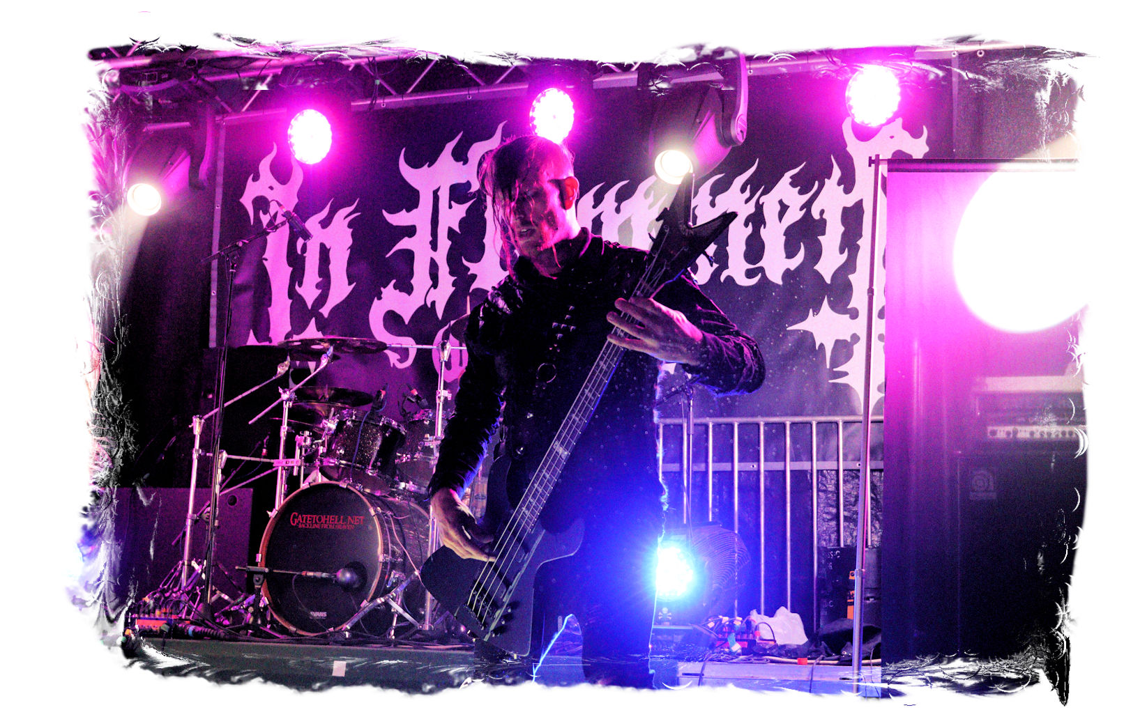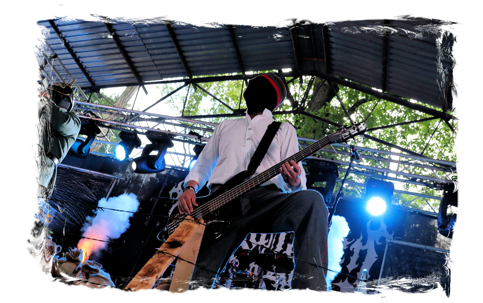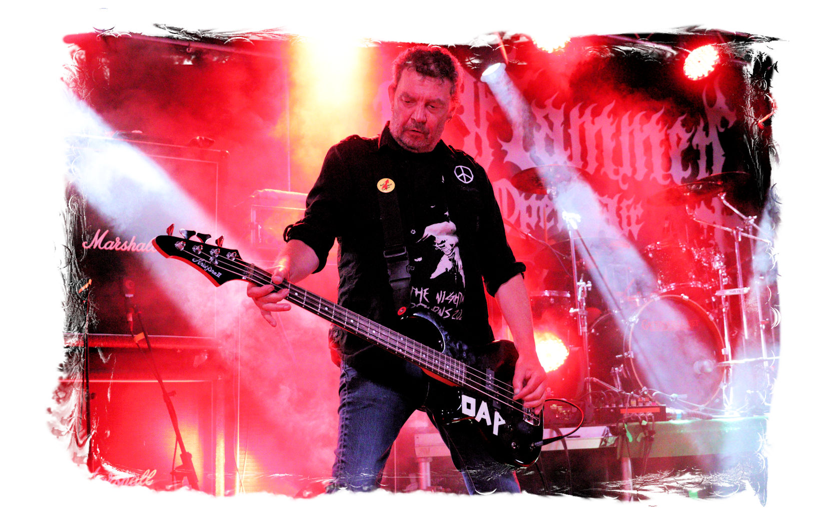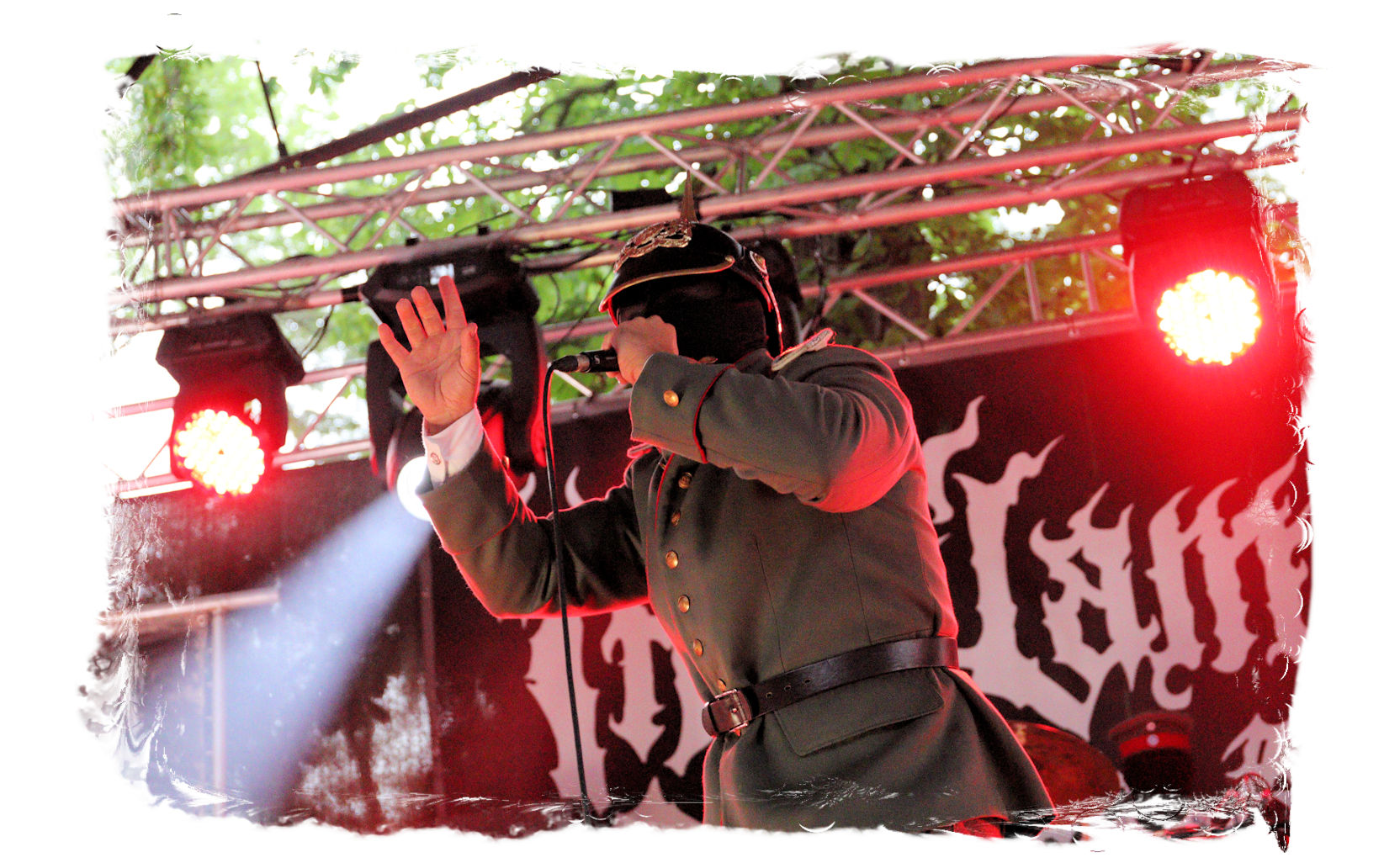 Die Ästhetik der Artworks und des Merchdesigns von KANONENFIEBER üben zugegenermaßen eine starke Faszination auf mich aus. Ich widerstand jedoch glücklicherweise dem Drang, mich dem Konsum hinzugeben, und wartete zunächst die Show des Fünfers ab. Nun ist es nicht erst, seitdem ein grausamer Krieg im Herzen Europas tobt, alles andere als originell, den Krieg (insbesondere WK l und WK ll) in den Fokus des Konzeptes zu stellen. In dieser Hinsicht kann man die Band aus Bamberg wohl irgendwo zwischen 1914 und Minenfeld verorten, wobei man im Vergleich zu vorgenannten Genrevertretern musikalisch eine ausgeprägte melodische Black Metal – Schlagseite an den Tag legt. Die Show ist ebenso wie die Artworks akkurat durchexerziert, die Bühne mit allerlei Requisiten in ein Schlachtfeld des ersten Weltkrieges verwandelt. Dementsprechend legt der uniformierte Stoßtrupp auch los, als müsse man den gegnerischen Schützengraben im Sturm nehmen. Das IN FLAMMEN – Publikum geht an diesem Abend erstmals so richtig steil und lässt sich nicht erst später am Merchstand so richtig mitreißen. Für mich ist das alles zwar sehr unterhaltsam, insgesamt fehlt es mir musikalisch gesehen jedoch auf Dauer ziemlich an Substanz. Pickelhaube hin, Landsermütze her, die zusätzlichen Stofftüten sind aus meiner Sicht dann definitiv drüber, nicht nur weil es für mich bis heute eine unumstößliche Regel gibt: Säcke überm Kopf dürfen bei mir lediglich Midnight und Uada tragen, Punkt!