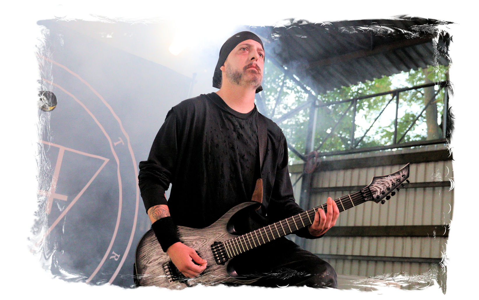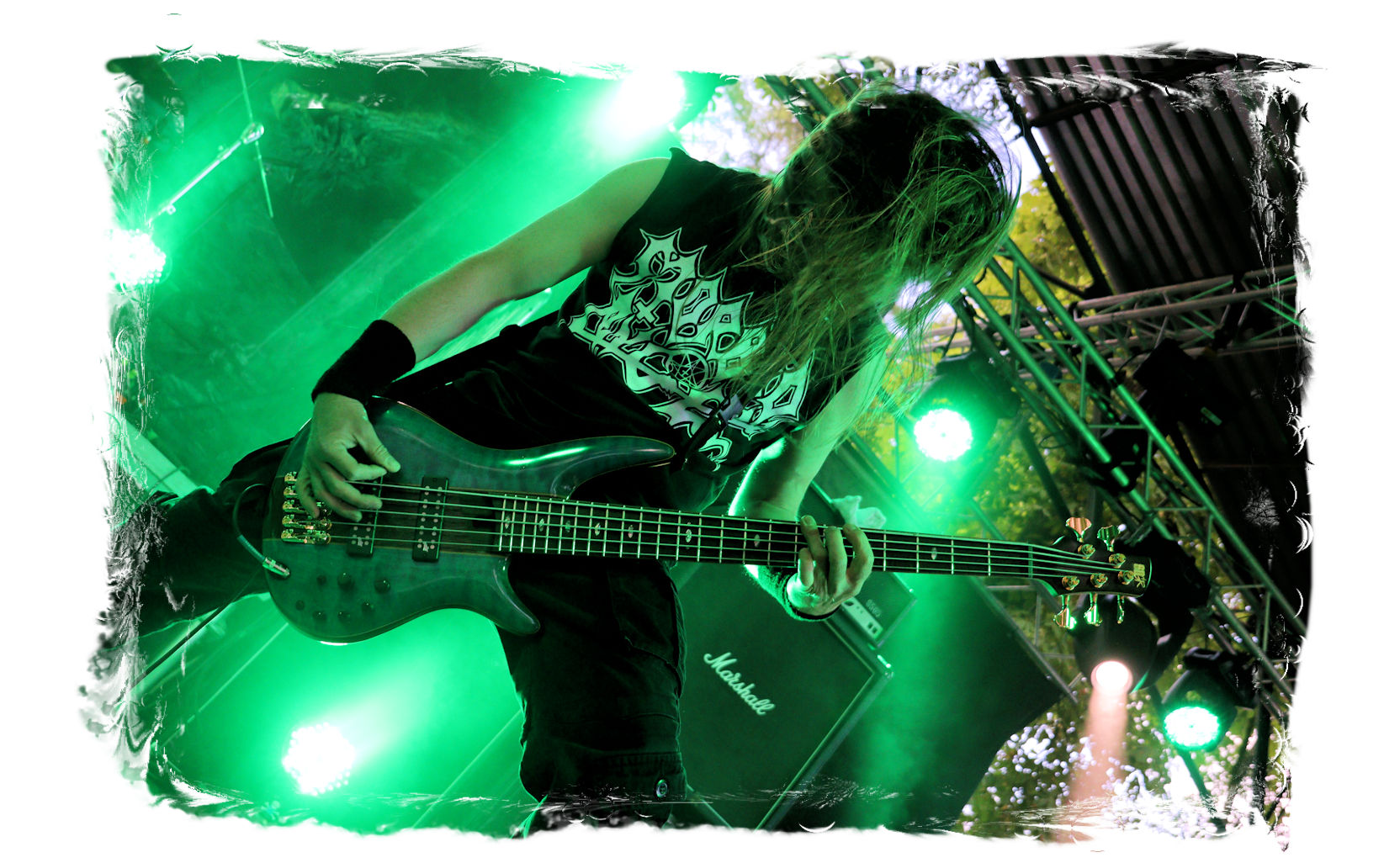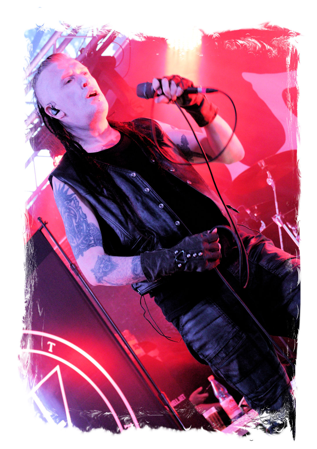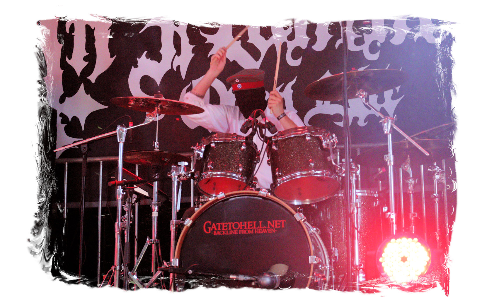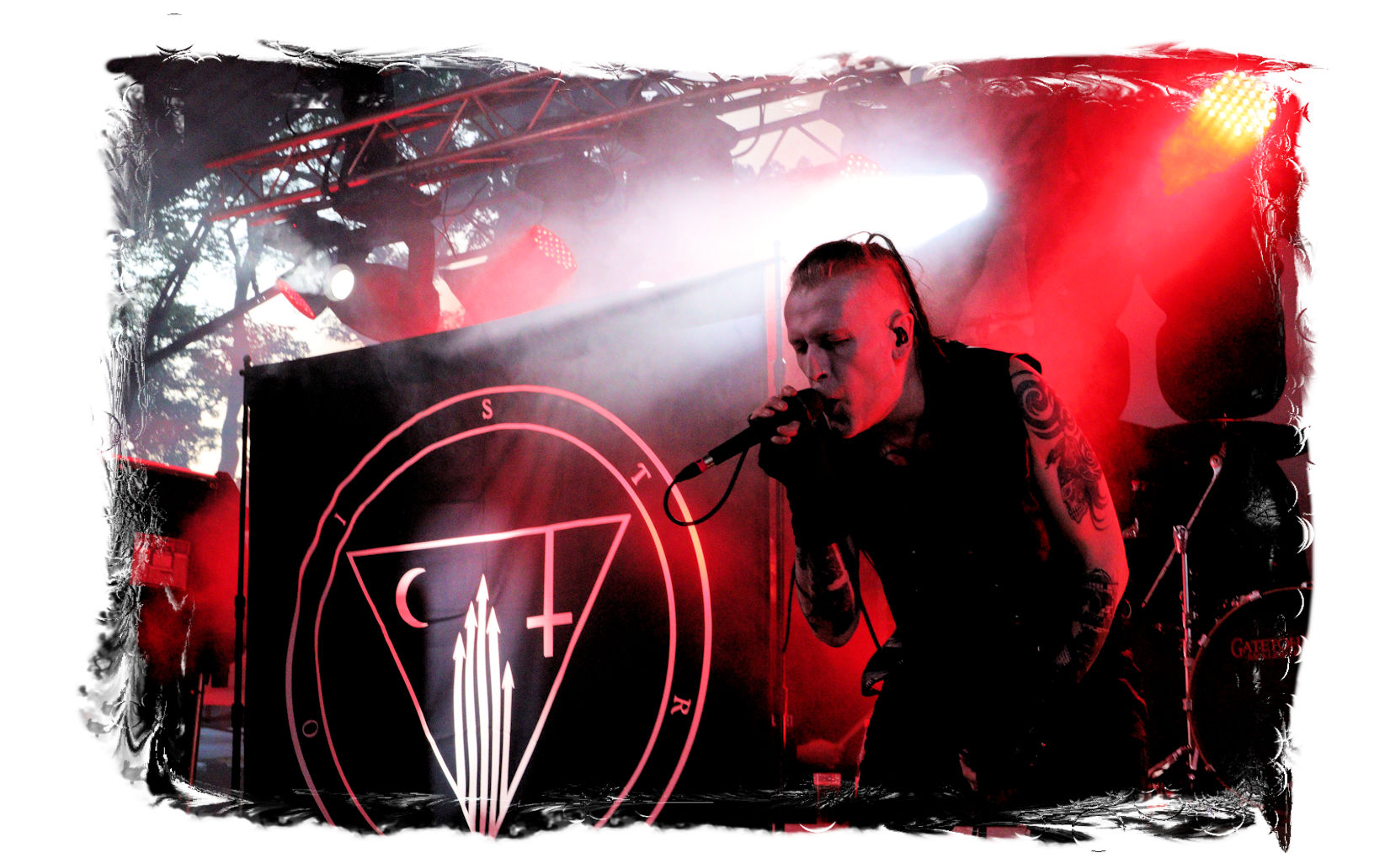 Die Ästhetik der Artworks und des Merchdesigns von KANONENFIEBER üben zugegenermaßen eine starke Faszination auf mich aus. Ich widerstand jedoch glücklicherweise dem Drang, mich dem Konsum hinzugeben, und wartete zunächst die Show des Fünfers ab. Nun ist es nicht erst, seitdem ein grausamer Krieg im Herzen Europas tobt, alles andere als originell, den Krieg (insbesondere WK l und WK ll) in den Fokus des Konzeptes zu stellen. In dieser Hinsicht kann man die Band aus Bamberg wohl irgendwo zwischen 1914 und Minenfeld verorten, wobei man im Vergleich zu vorgenannten Genrevertretern musikalisch eine ausgeprägte melodische Black Metal – Schlagseite an den Tag legt. Die Show ist ebenso wie die Artworks akkurat durchexerziert, die Bühne mit allerlei Requisiten in ein Schlachtfeld des ersten Weltkrieges verwandelt. Dementsprechend legt der uniformierte Stoßtrupp auch los, als müsse man den gegnerischen Schützengraben im Sturm nehmen. Das IN FLAMMEN – Publikum geht an diesem Abend erstmals so richtig steil und lässt sich nicht erst später am Merchstand so richtig mitreißen. Für mich ist das alles zwar sehr unterhaltsam, insgesamt fehlt es mir musikalisch gesehen jedoch auf Dauer ziemlich an Substanz. Pickelhaube hin, Landsermütze her, die zusätzlichen Stofftüten sind aus meiner Sicht dann definitiv drüber, nicht nur weil es für mich bis heute eine unumstößliche Regel gibt: Säcke überm Kopf dürfen bei mir lediglich Midnight und Uada tragen, Punkt!