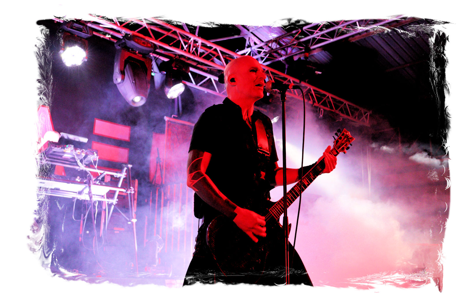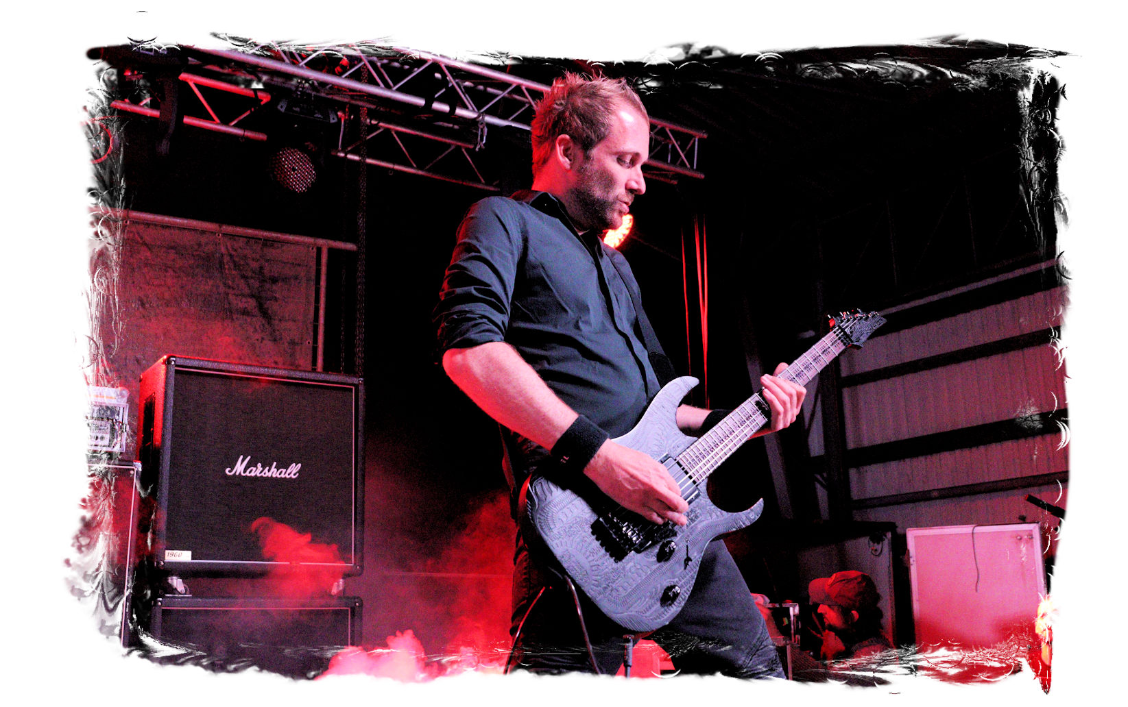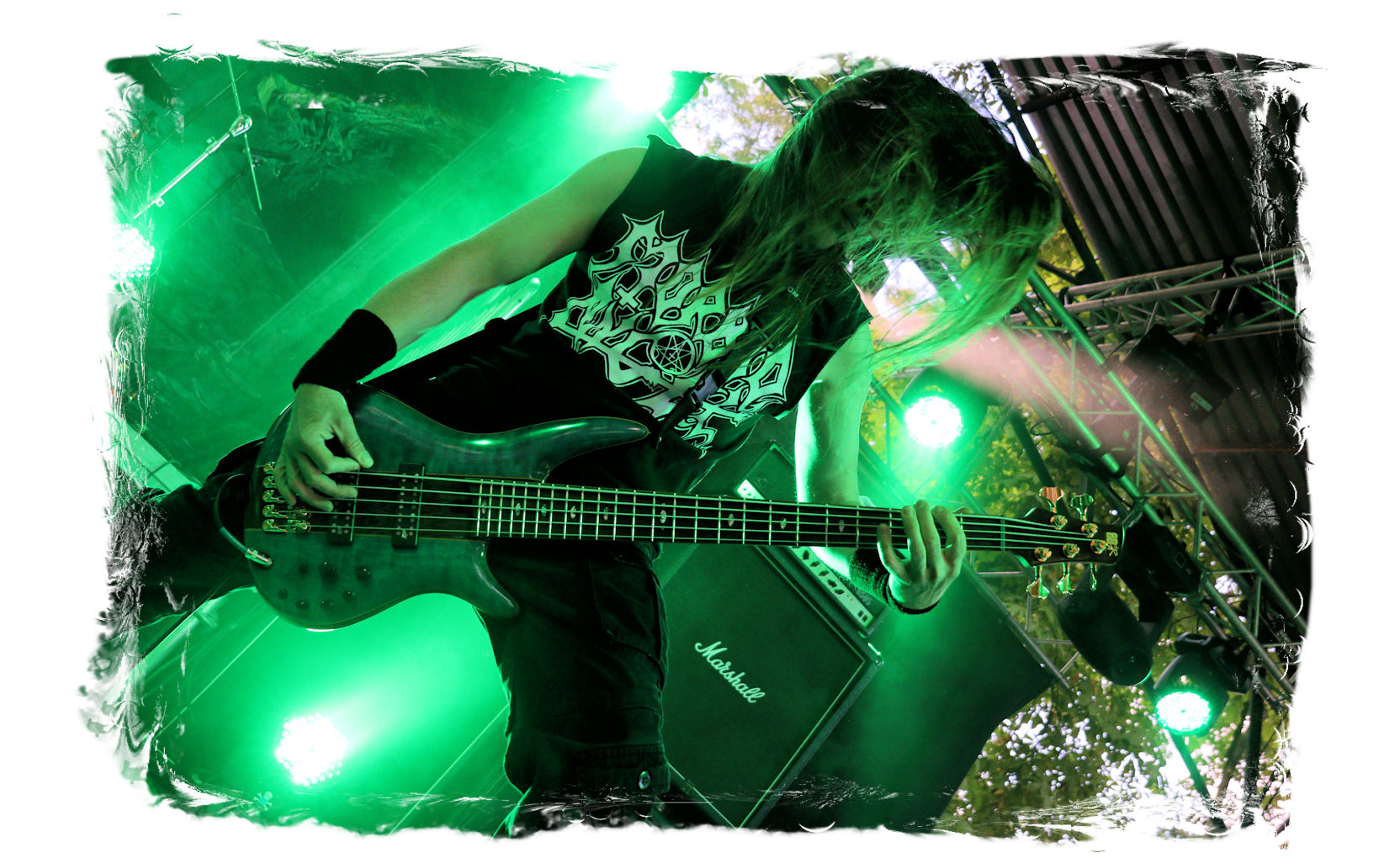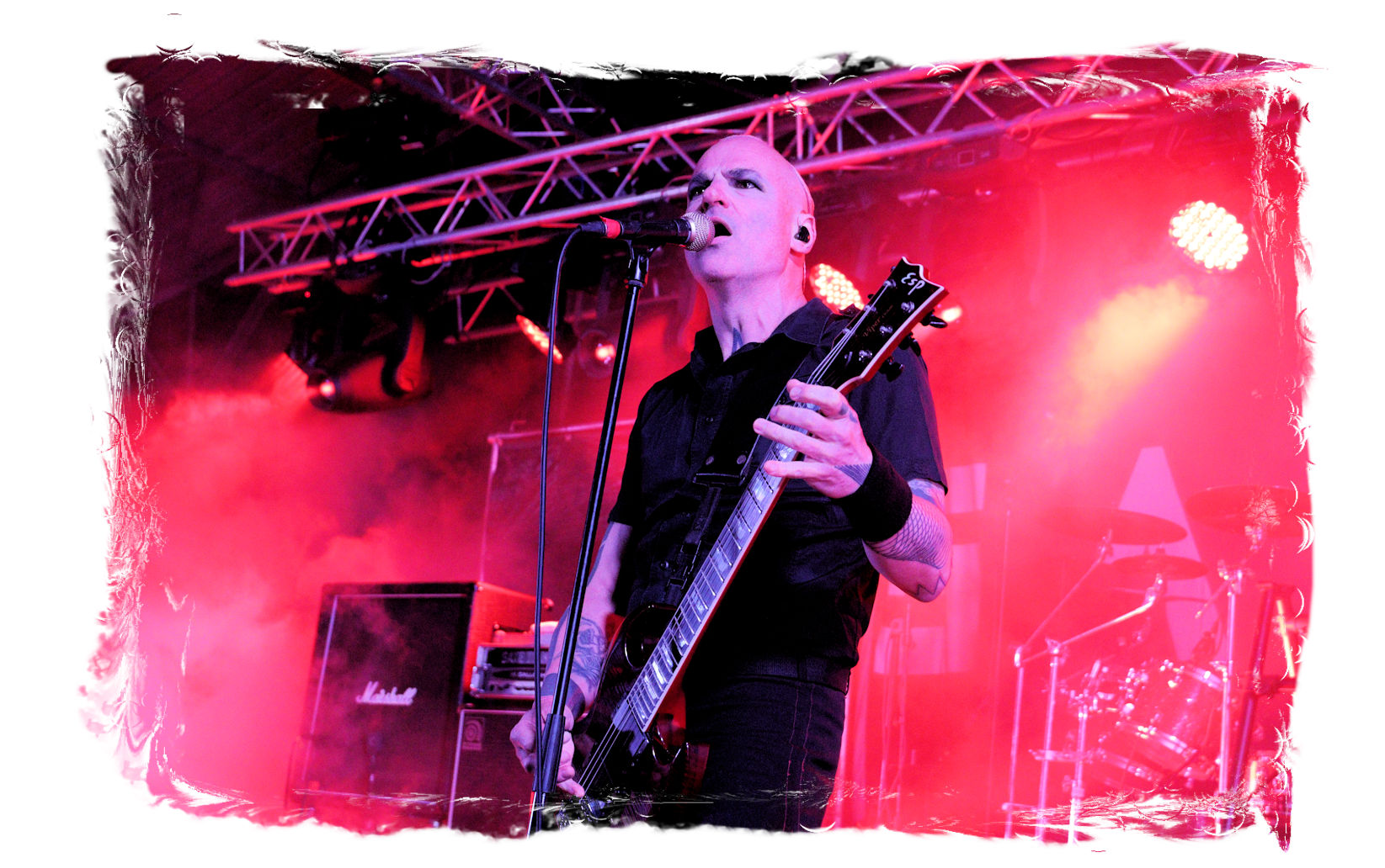 Die Ästhetik der Artworks und des Merchdesigns von KANONENFIEBER üben zugegenermaßen eine starke Faszination auf mich aus. Ich widerstand jedoch glücklicherweise dem Drang, mich dem Konsum hinzugeben, und wartete zunächst die Show des Fünfers ab. Nun ist es nicht erst, seitdem ein grausamer Krieg im Herzen Europas tobt, alles andere als originell, den Krieg (insbesondere WK l und WK ll) in den Fokus des Konzeptes zu stellen. In dieser Hinsicht kann man die Band aus Bamberg wohl irgendwo zwischen 1914 und Minenfeld verorten, wobei man im Vergleich zu vorgenannten Genrevertretern musikalisch eine ausgeprägte melodische Black Metal – Schlagseite an den Tag legt. Die Show ist ebenso wie die Artworks akkurat durchexerziert, die Bühne mit allerlei Requisiten in ein Schlachtfeld des ersten Weltkrieges verwandelt. Dementsprechend legt der uniformierte Stoßtrupp auch los, als müsse man den gegnerischen Schützengraben im Sturm nehmen. Das IN FLAMMEN – Publikum geht an diesem Abend erstmals so richtig steil und lässt sich nicht erst später am Merchstand so richtig mitreißen. Für mich ist das alles zwar sehr unterhaltsam, insgesamt fehlt es mir musikalisch gesehen jedoch auf Dauer ziemlich an Substanz. Pickelhaube hin, Landsermütze her, die zusätzlichen Stofftüten sind aus meiner Sicht dann definitiv drüber, nicht nur weil es für mich bis heute eine unumstößliche Regel gibt: Säcke überm Kopf dürfen bei mir lediglich Midnight und Uada tragen, Punkt!