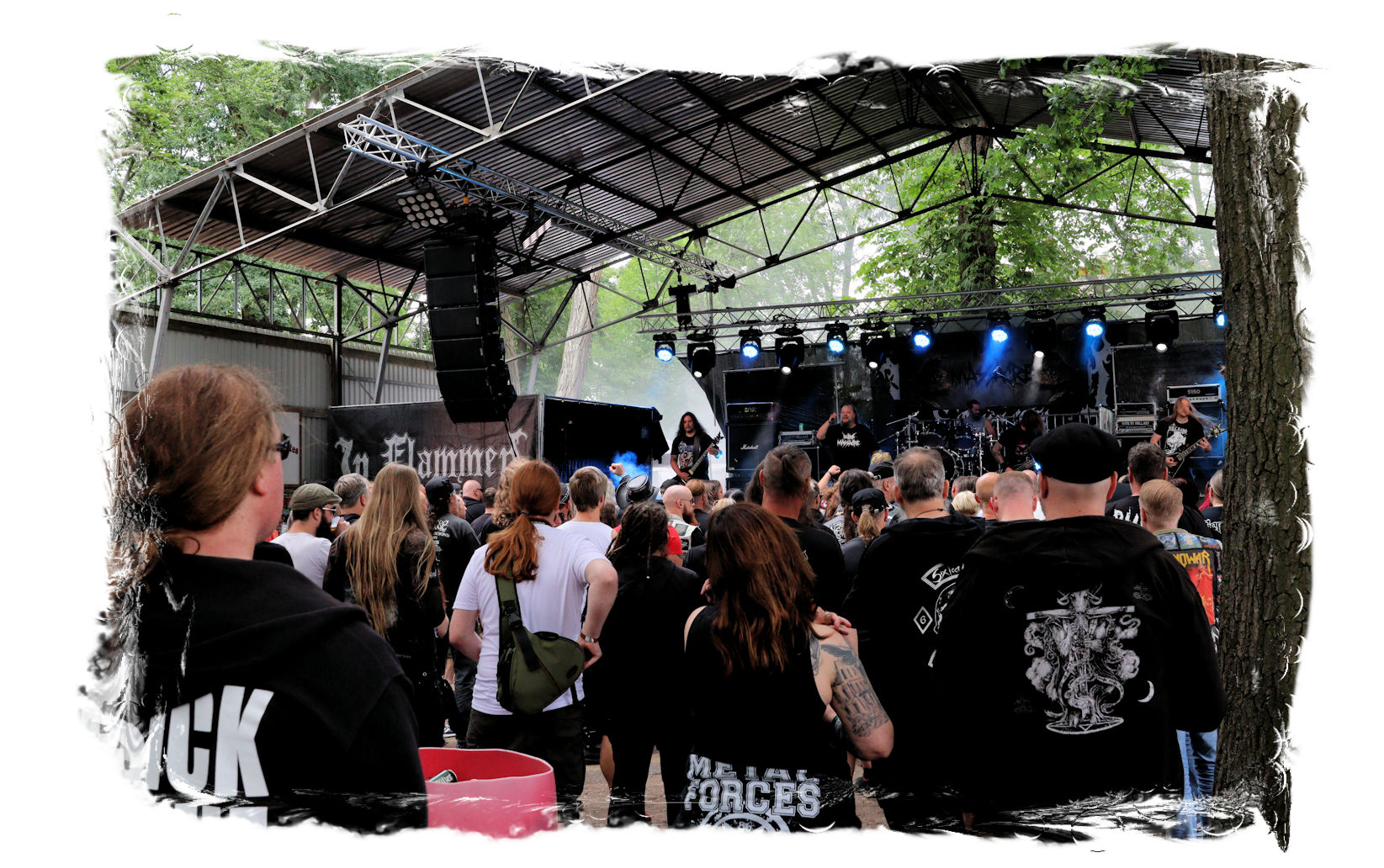 Seit 2019 ist das diesjährige IN FLAMMEN OPEN AIR tatsächlich mein erstes Festival, zu dem ich aufbreche. Das Underground Remains in Göttingen, zwei Wochen zuvor, klammere ich bewusst einmal aus. Und selbst die Anzahl der Konzerte, die ich seit Disillusion im Februar 2020 mitgemacht habe, kann ich nahezu an einer Hand abzählen. Entsprechend aufgeregt bin ich, als unsere überschaubare Truppe im Harz aufbricht. Die eigentlich lockeren zwei bis zweieinhalb Stunden Autofahrt nach Nordsachsen ziehen sich wie Gummi: Erst ist es eine fehlende Powerbank, die noch bei einem Elektronik-Kaufhaus geholt werden muss, dann Gewürze. Das Frühstück will als Grundlage für die Abendveranstaltung natürlich auch noch nachgeholt werden, von diversen Pinkelpausen ganz zu schweigen... Aber schließlich stehen wir dann doch endlich in der Zufahrt zum Festivalgelände am Entenfang in Torgau. Die Abfertigung der Autos verläuft überraschend reibungslos und zügig, so dass keine Langeweile aufkommt und die Vorfreude ins Unermessliche steigt.