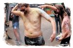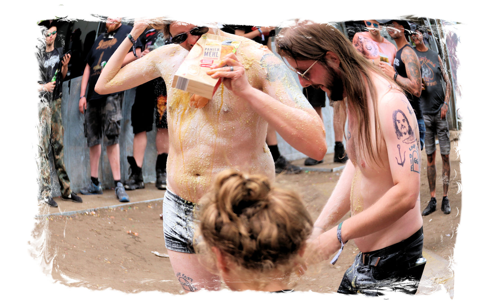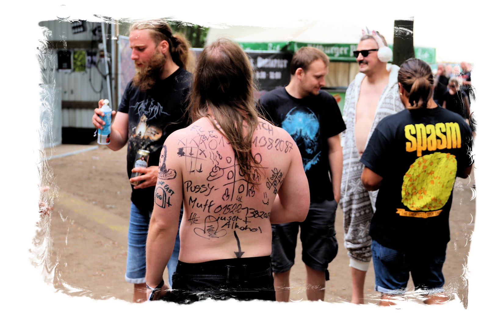 Fast wären wir in den Genuss gekommen, unser kleines aber feines Camp nach der obligatorischen Fahrzeugkontrolle und dem Go der Crew im Trockenen aufbauen zu können. Doch einmal mehr sind 50 % unserer Truppe zum Warten verdammt, während die anderen 50 % zurück gen Torgau cruisen, um die Aussteuer für das bevorstehende Wochenende aus dem Automaten der Bank des Vertrauens zu ziehen. Hurra! Es kommt, wie es kommen muss und wir bauen bei bestem Sprühregen Pavillon und Zelte auf, nachdem wir von der entspannten Crew unter Berücksichtung des Platzbedarfs für unsere Nachhut eingewiesen wurden. Doch auf Regen folgt bekanntlich Sonne und so bin ich beim Öffnen meines "Feierabendbieres" in zweierlei Hinsicht durch, noch bevor das Festival so richtig begonnen hat: Zunächst durchgeregnet und zugleich durchgeschwitzt. Bevor es los geht, ist also noch einmal Frischmachen angesagt.