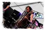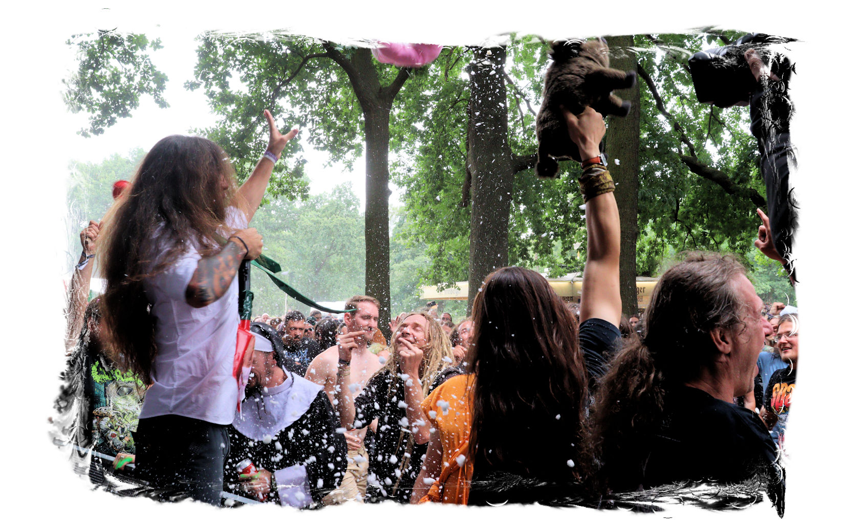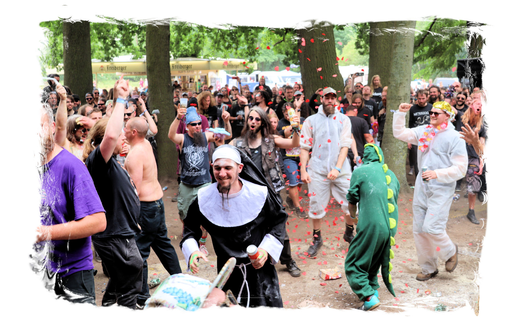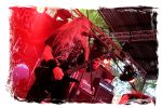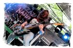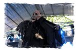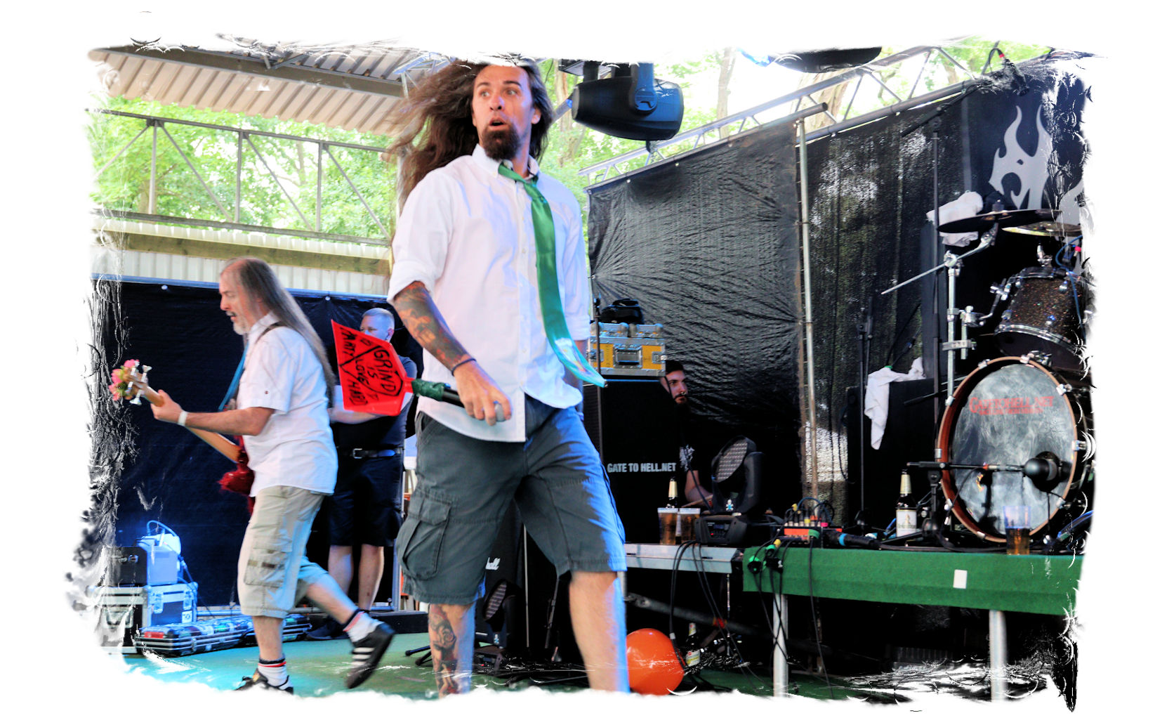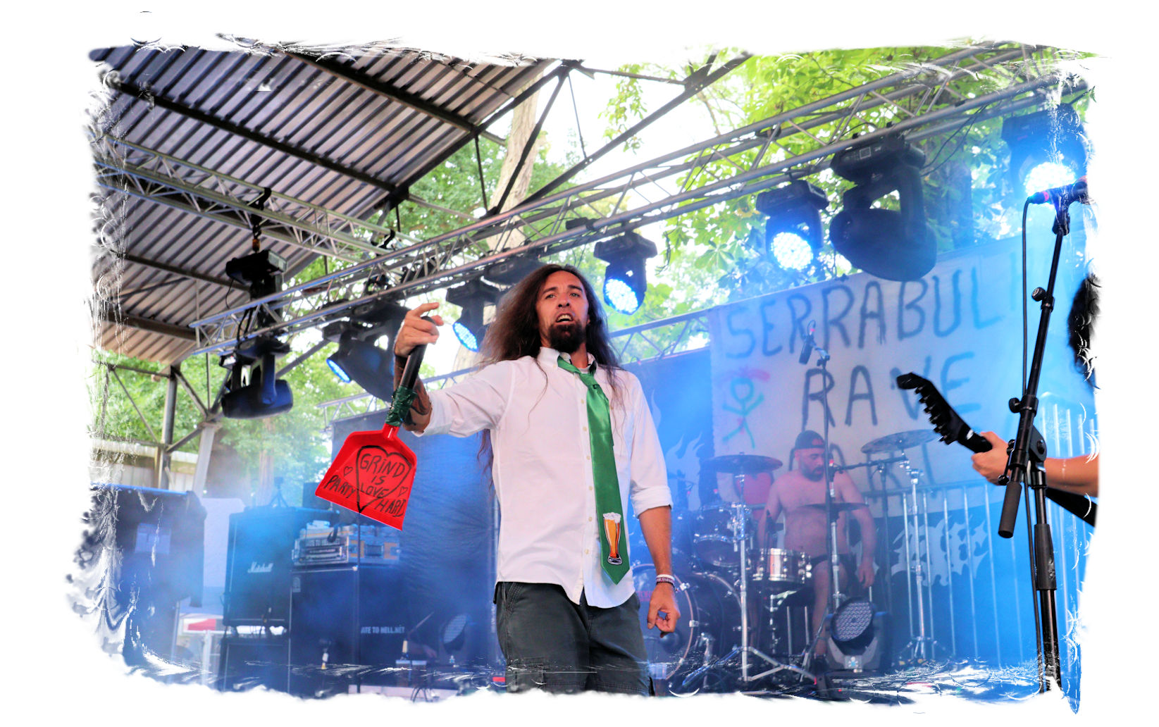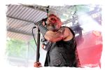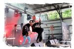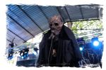 Nach der Mittagspause geht es mit SERRABULHO wahrlich episch weiter. Die Portugiesen sind auf dem IN FLAMMEN OPEN AIR bestens bekannt, "Serrabulho Rave Party" prangt auf dem Laken über dem Schlagwerk und kündet die unorthodoxe Show an, zu der sich zunehmend Grindcore-Jünger, Musik-Sportler, absonderlich ver- oder gekleidet, mit Klobürsten und Plüschtieren ausgestattet oder gar mit frisch aufgetragener Panade vor der Bühne versammeln... Als die Herren dann endlich, in Hemd und mit Krawatte die Bretter entern, gibt es kein Halten mehr. Sowohl vor, als auch auf der Bühne herrscht Ausnahmezustand. Konfettikanonen und pinke Bälle flankieren eine ausflippende Masse und eine Band, die sich sichtlich angetan durch ihren Set prügelt. Sänger Carlos Guerra geht dabei immer wieder auf Tuchfühlung mit den Fans, mischt sich unter das Publikum und/oder führt die Grindcore-Polonäse im Pit an. Fazit: Muss man gesehen haben. Zum Finale wird dann wiederum IN FLAMMEN-Chef Thomas auf die Bühne zitiert, um mit seinen Freunden einen Song zu performen.