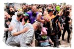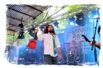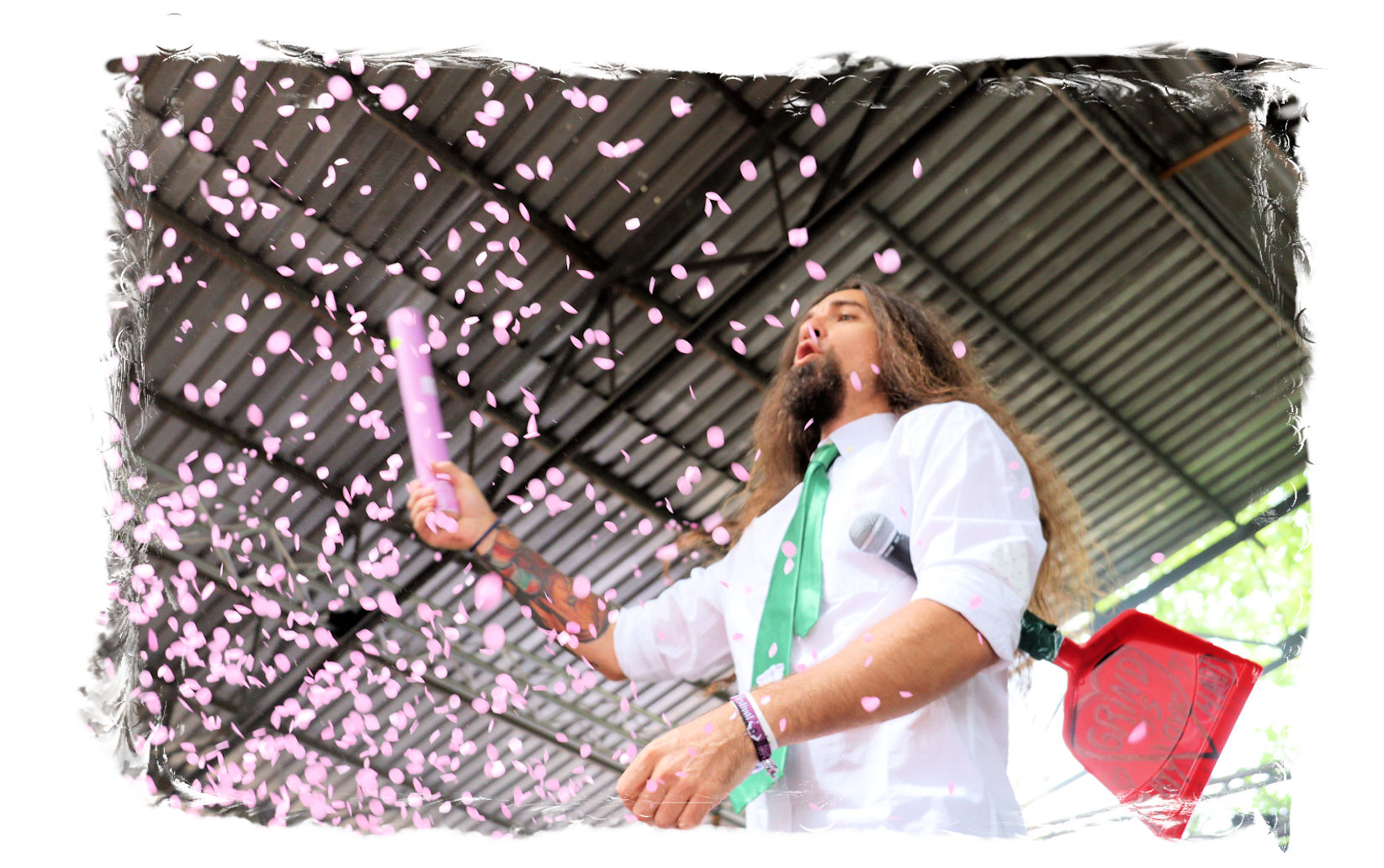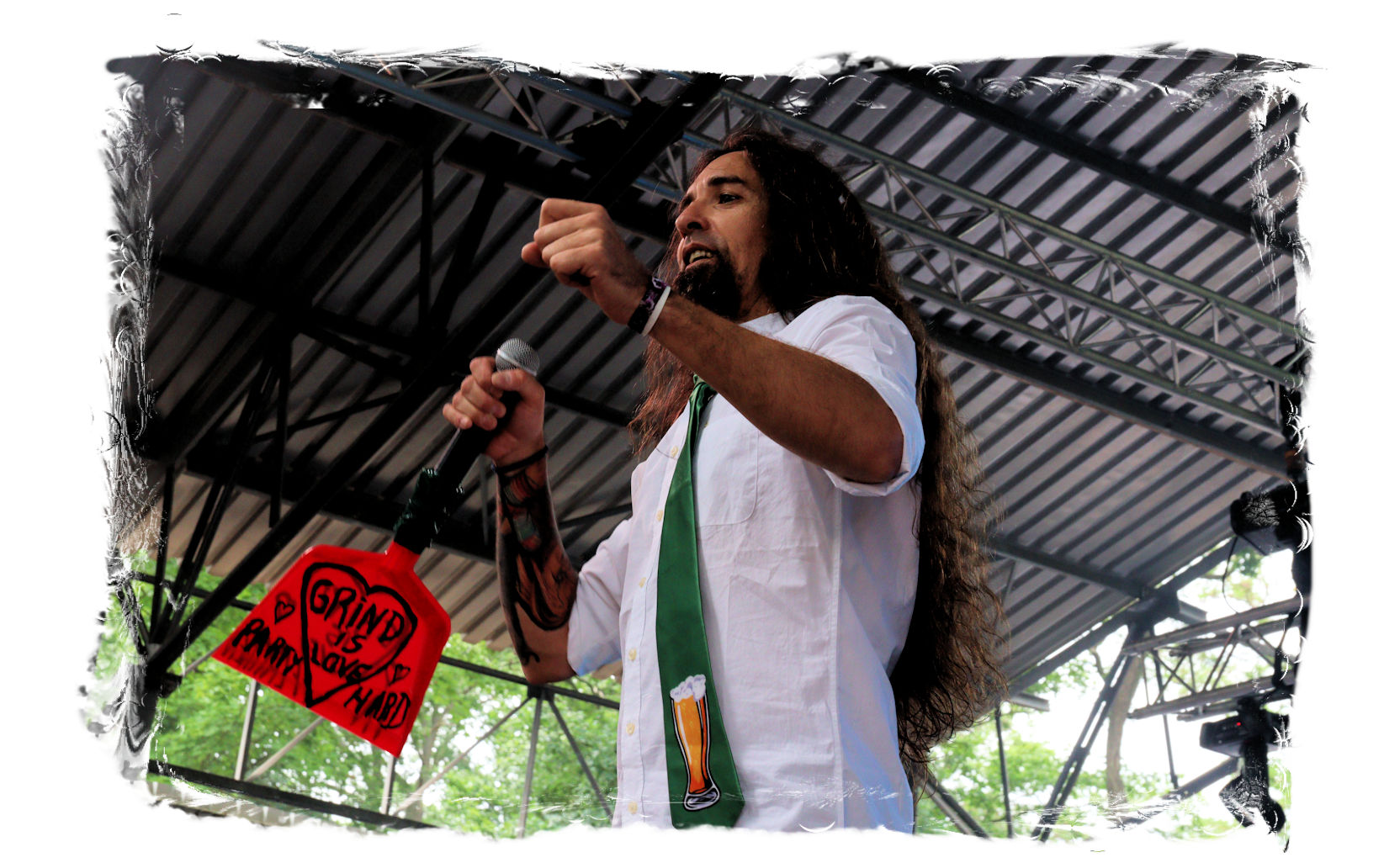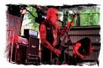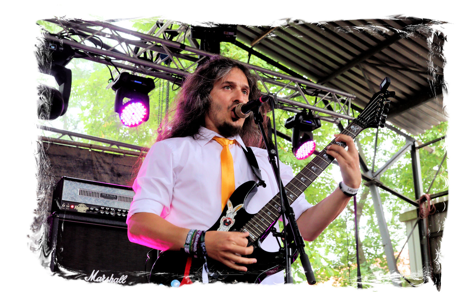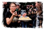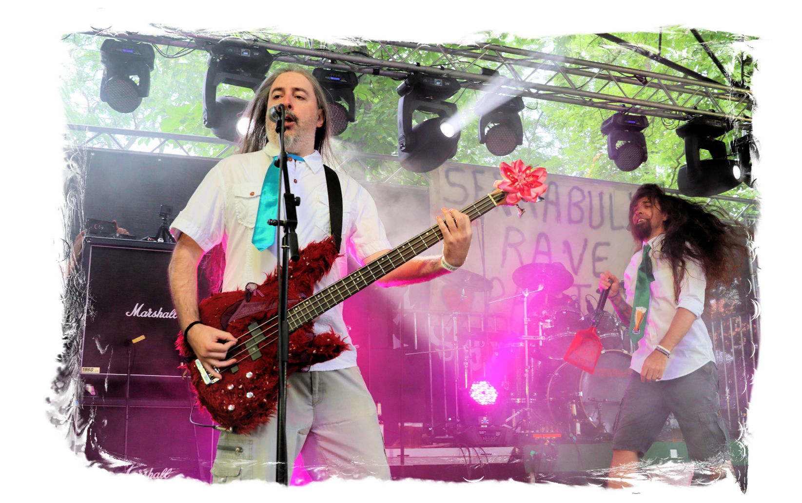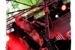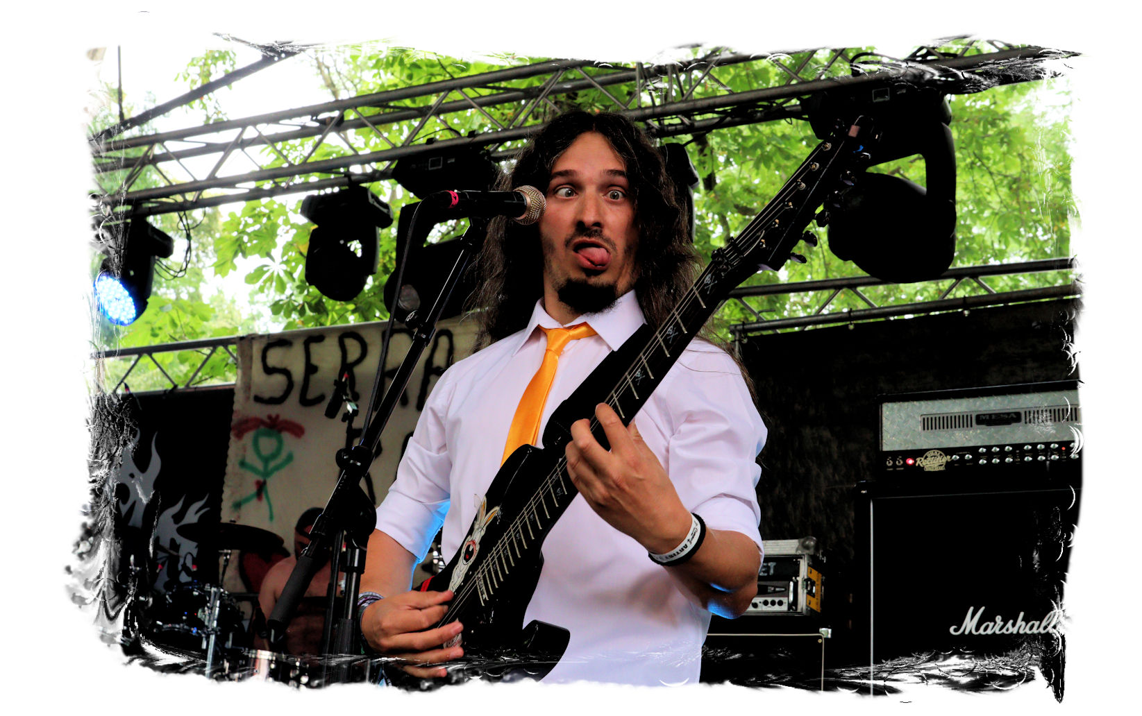 Nach der Mittagspause geht es mit SERRABULHO wahrlich episch weiter. Die Portugiesen sind auf dem IN FLAMMEN OPEN AIR bestens bekannt, "Serrabulho Rave Party" prangt auf dem Laken über dem Schlagwerk und kündet die unorthodoxe Show an, zu der sich zunehmend Grindcore-Jünger, Musik-Sportler, absonderlich ver- oder gekleidet, mit Klobürsten und Plüschtieren ausgestattet oder gar mit frisch aufgetragener Panade vor der Bühne versammeln... Als die Herren dann endlich, in Hemd und mit Krawatte die Bretter entern, gibt es kein Halten mehr. Sowohl vor, als auch auf der Bühne herrscht Ausnahmezustand. Konfettikanonen und pinke Bälle flankieren eine ausflippende Masse und eine Band, die sich sichtlich angetan durch ihren Set prügelt. Sänger Carlos Guerra geht dabei immer wieder auf Tuchfühlung mit den Fans, mischt sich unter das Publikum und/oder führt die Grindcore-Polonäse im Pit an. Fazit: Muss man gesehen haben. Zum Finale wird dann wiederum IN FLAMMEN-Chef Thomas auf die Bühne zitiert, um mit seinen Freunden einen Song zu performen.