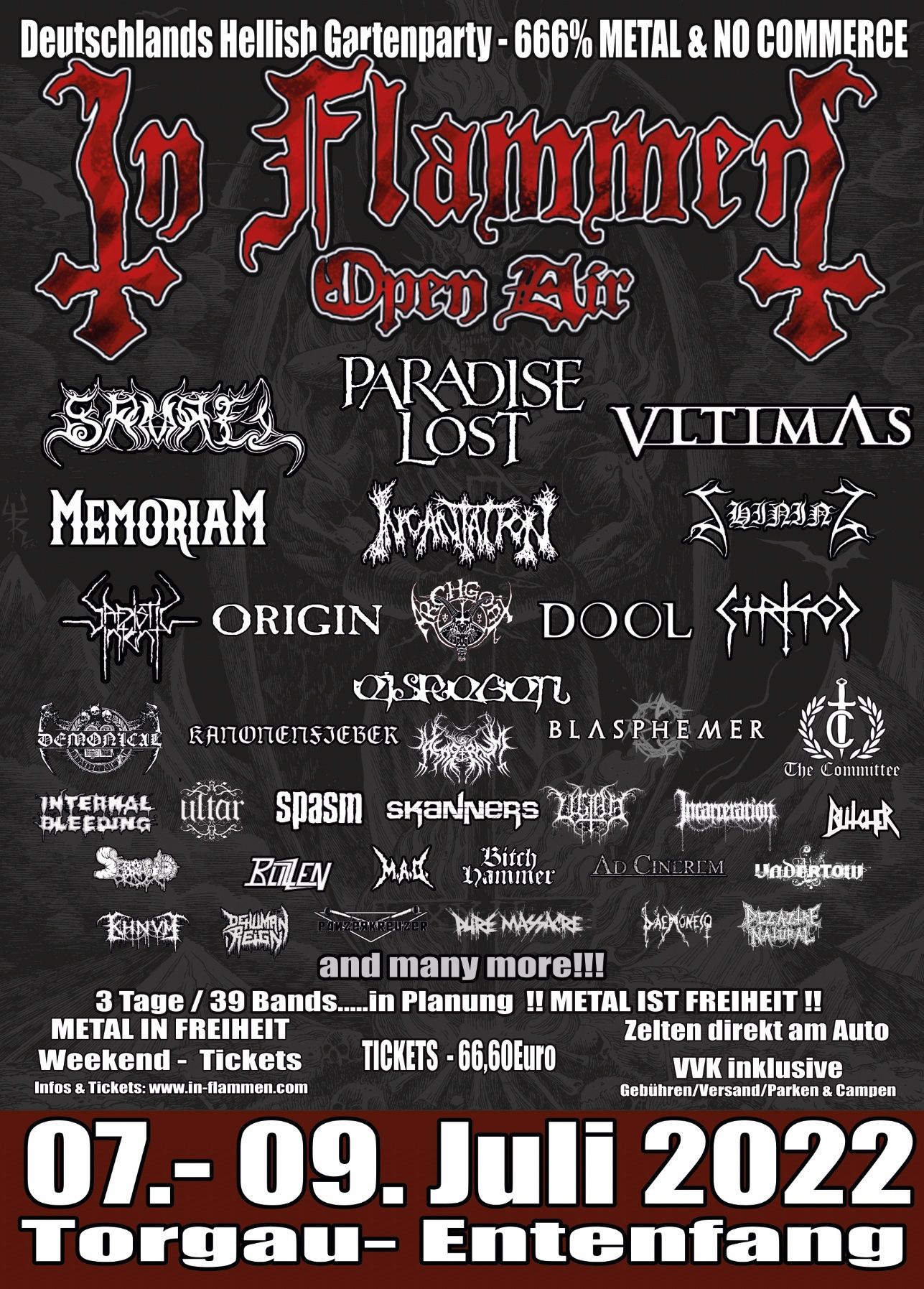 AD CINEREM, Archgoat, ASAGRAUM, BLASPHEMER, Blizzen, DAEMONESQ, DEHUMAN REIGN, Demonical, DEMORED, DEZAZTRE NATURAL, Dool, Eisregen, Entenfang, Festival, GRABAK, Grima, Heathen, IN FLAMMEN OPEN AIR, Incantation, Incarceration, KANONENFIEBER, KHNVM, Memoriam, MOSAIC, M_A_D_, ORIGIN, PANZERKREUZER, PURE MASSACRE, SADISTIC INTENT, Samael, Serrbulho, Sisters Of Suffocation, SKANNERS, SPASM, Strigoi, The Committee, Torgau, Ultar, Ultha, Vltimas, WILT