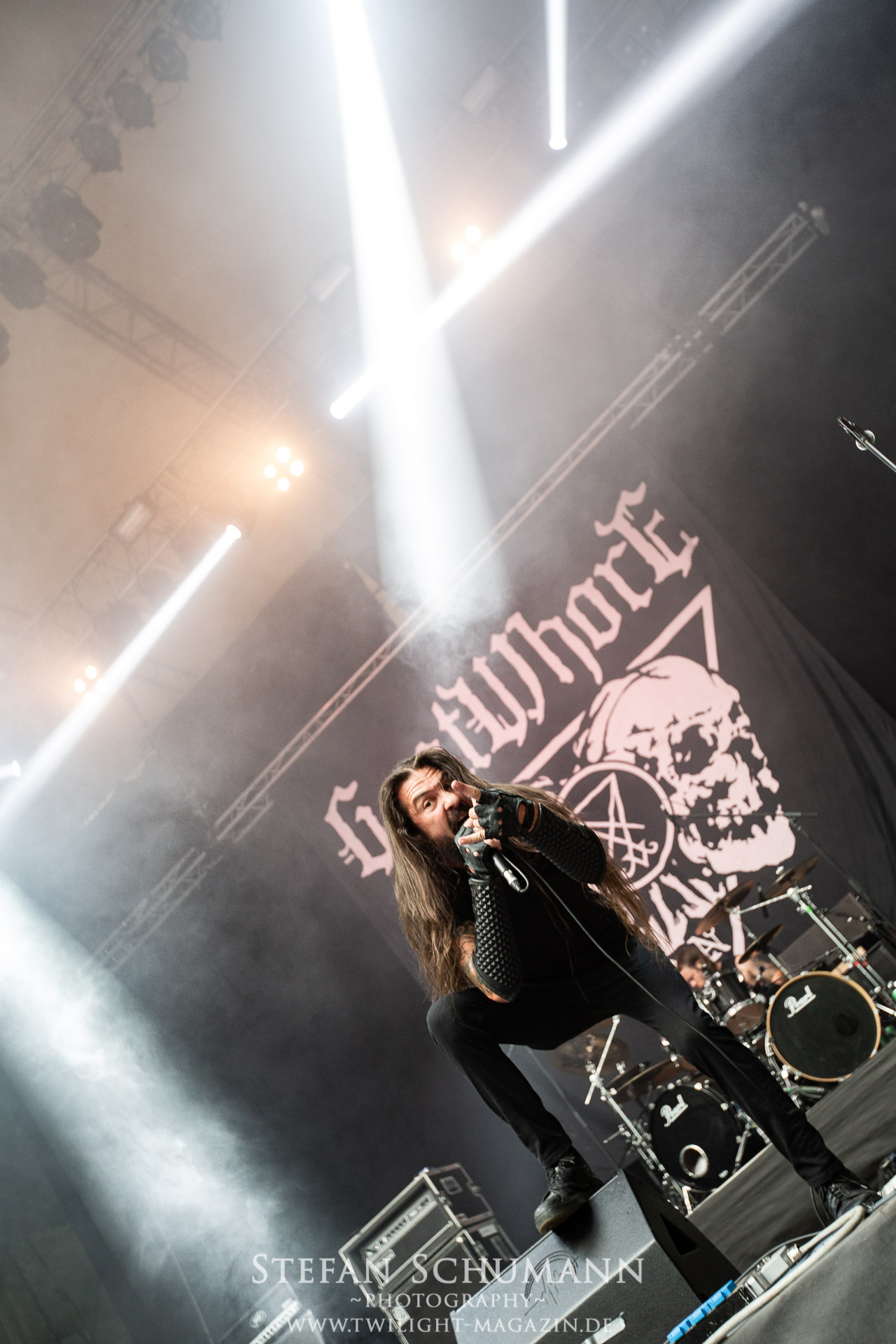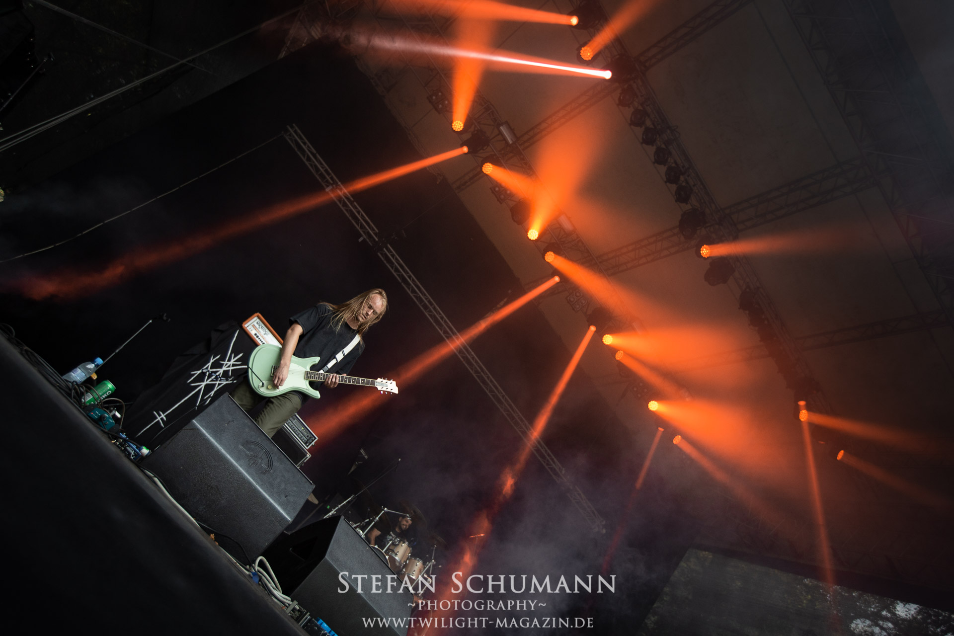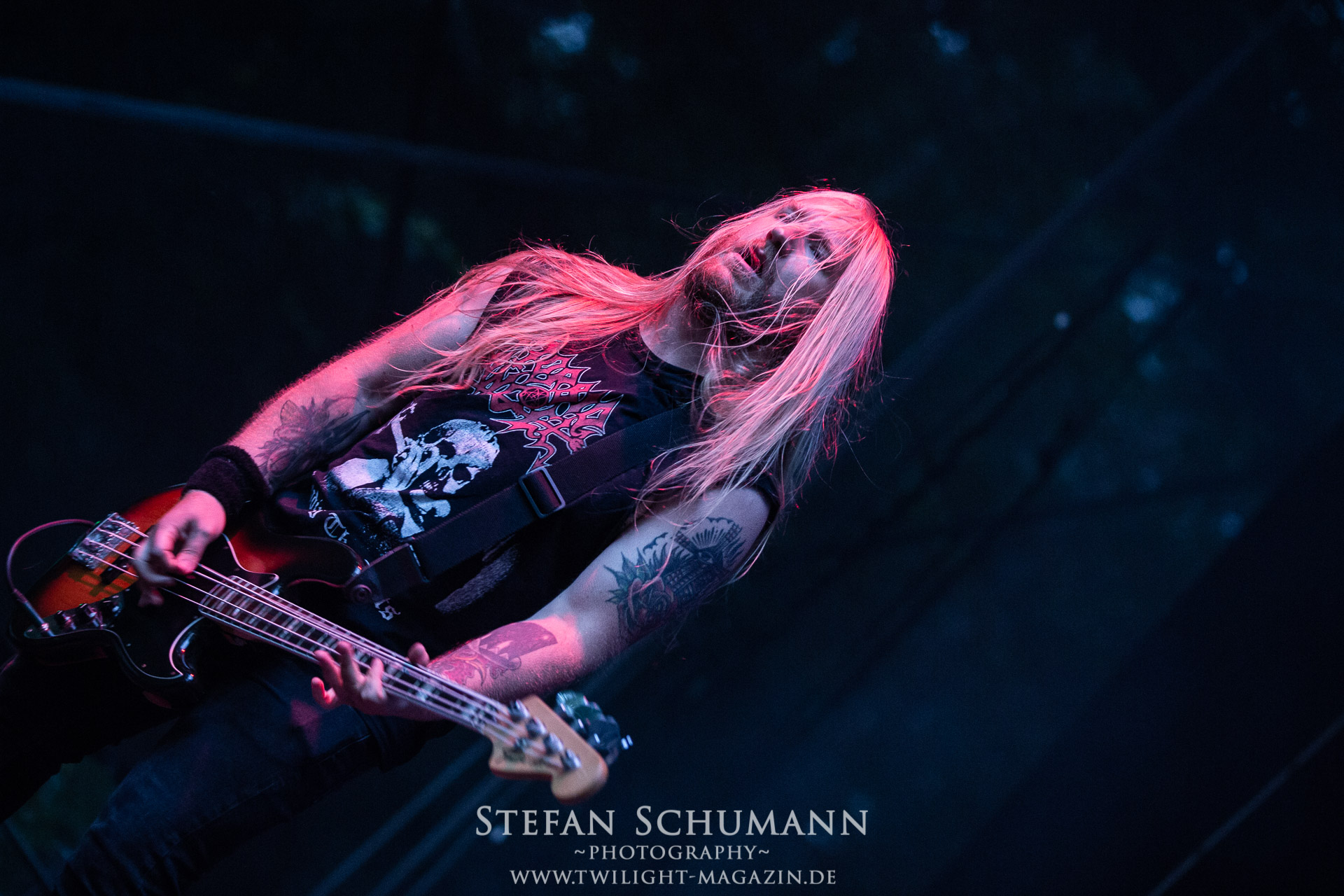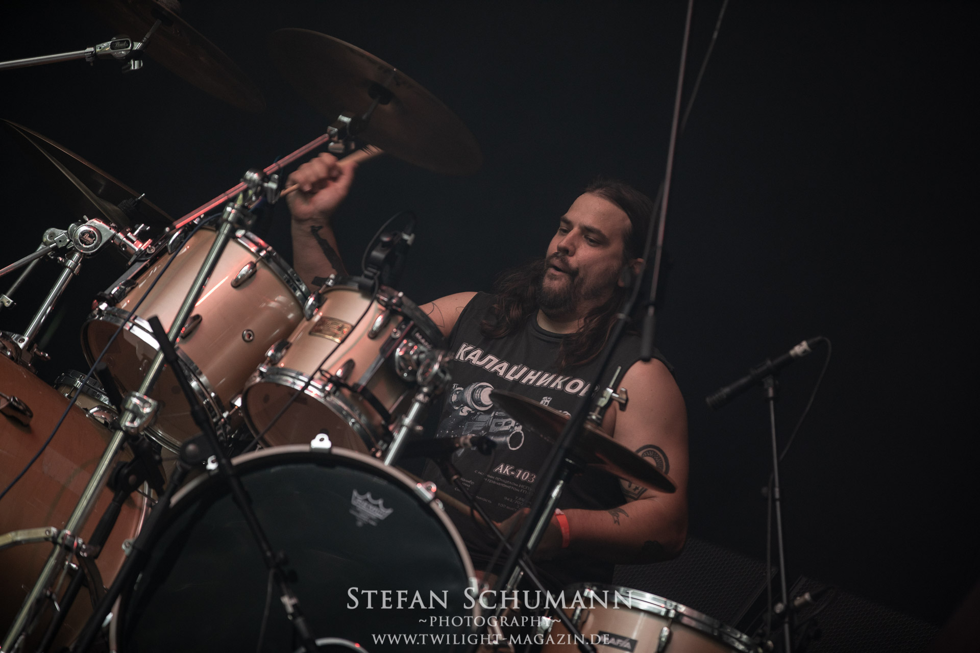 Der letzte Tag beginnt mit einem weiteren, inzwischen fast traditionellen, Überraschungsausflug zur Zweitbühne: Dort unterhalten gerade die jungen Schweizer TYRMFAR die circa 50 anwesenden Gestalten mit ihrer doch sehr bekömmlichen Black/Death-Metal-Mischung, die man sich bei den Großen der Szene abgeschaut hat. Die erste größere Menge findet sich dann vor dem mit Recht immer populärer werdenden Hamburger Duo MANTAR ein, die nur mit Gitarre, Schlagzeug und Gesang eine breitere Doom-Wand erzeugen als andere Bands zu fünft. Nach ihrem letzten Song „Era Borealis“ machen sie dann Platz für die Thrasher MUNICIPAL WASTE, die mit ihrem Anti-Trump-Backdrop politisch eindeutig Stellung beziehen. Auch wenn musikalisch nicht ganz so abwechslungsreich, hat das Publikum deinen Spaß und zerrt zahlreiche Aufblas-Gummitiere in die Circle-Pit.