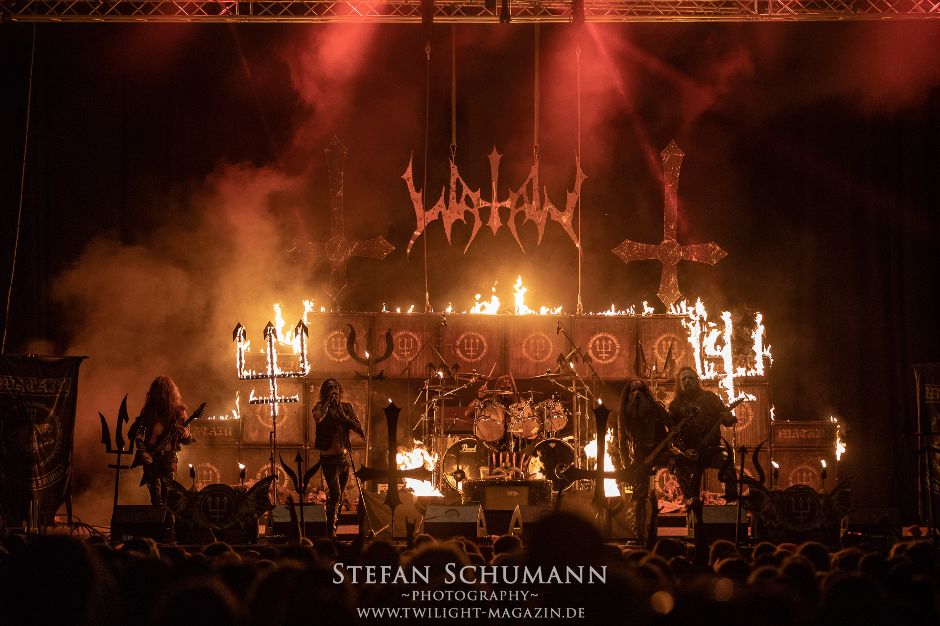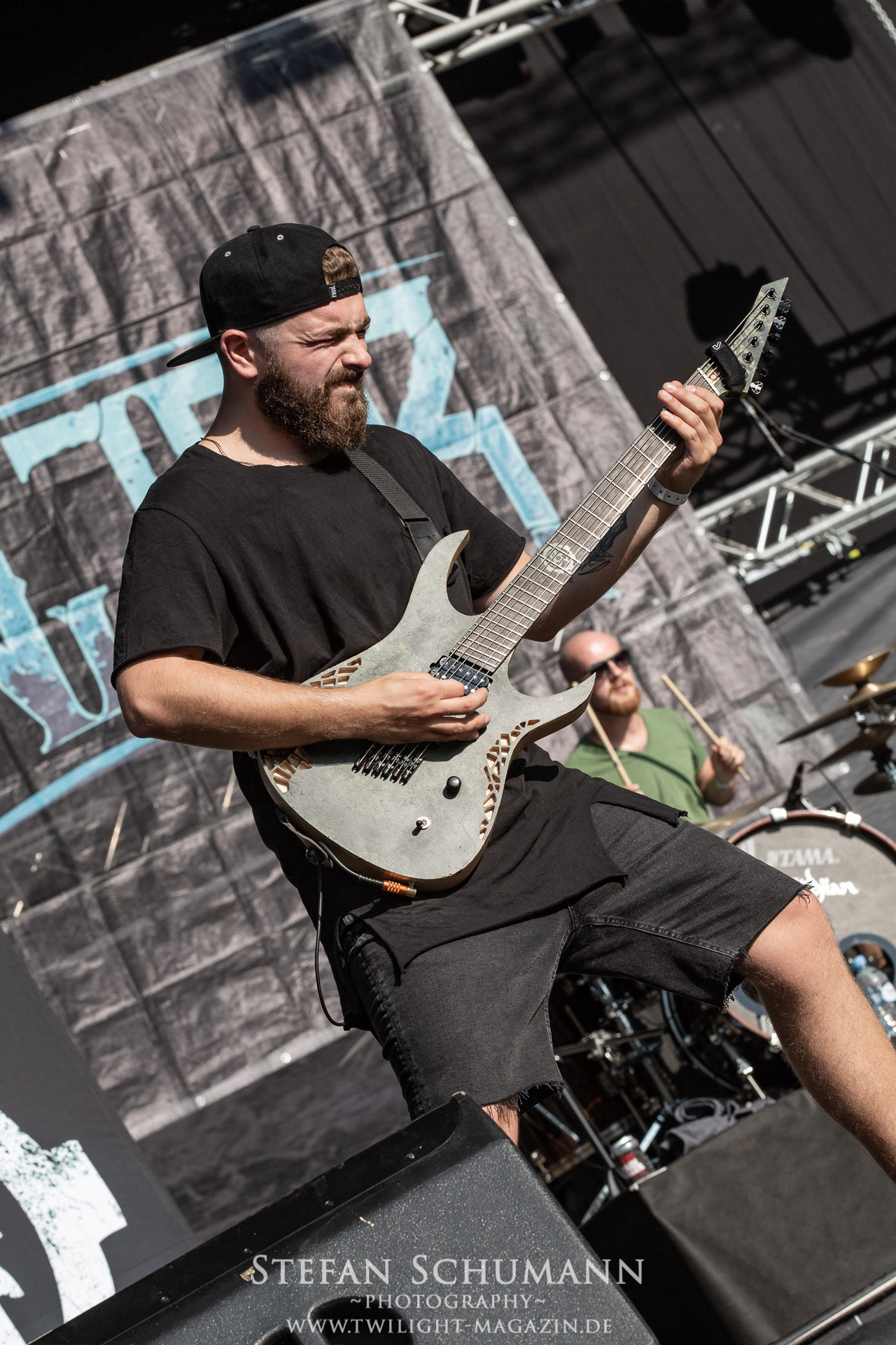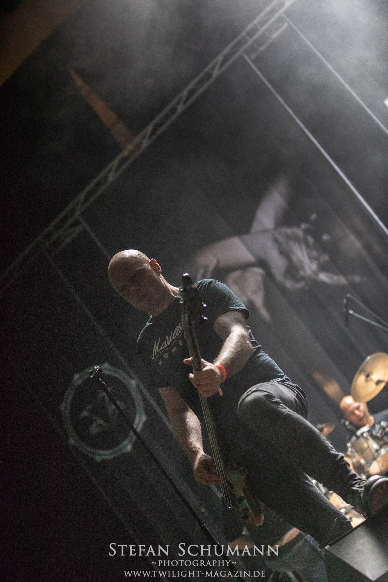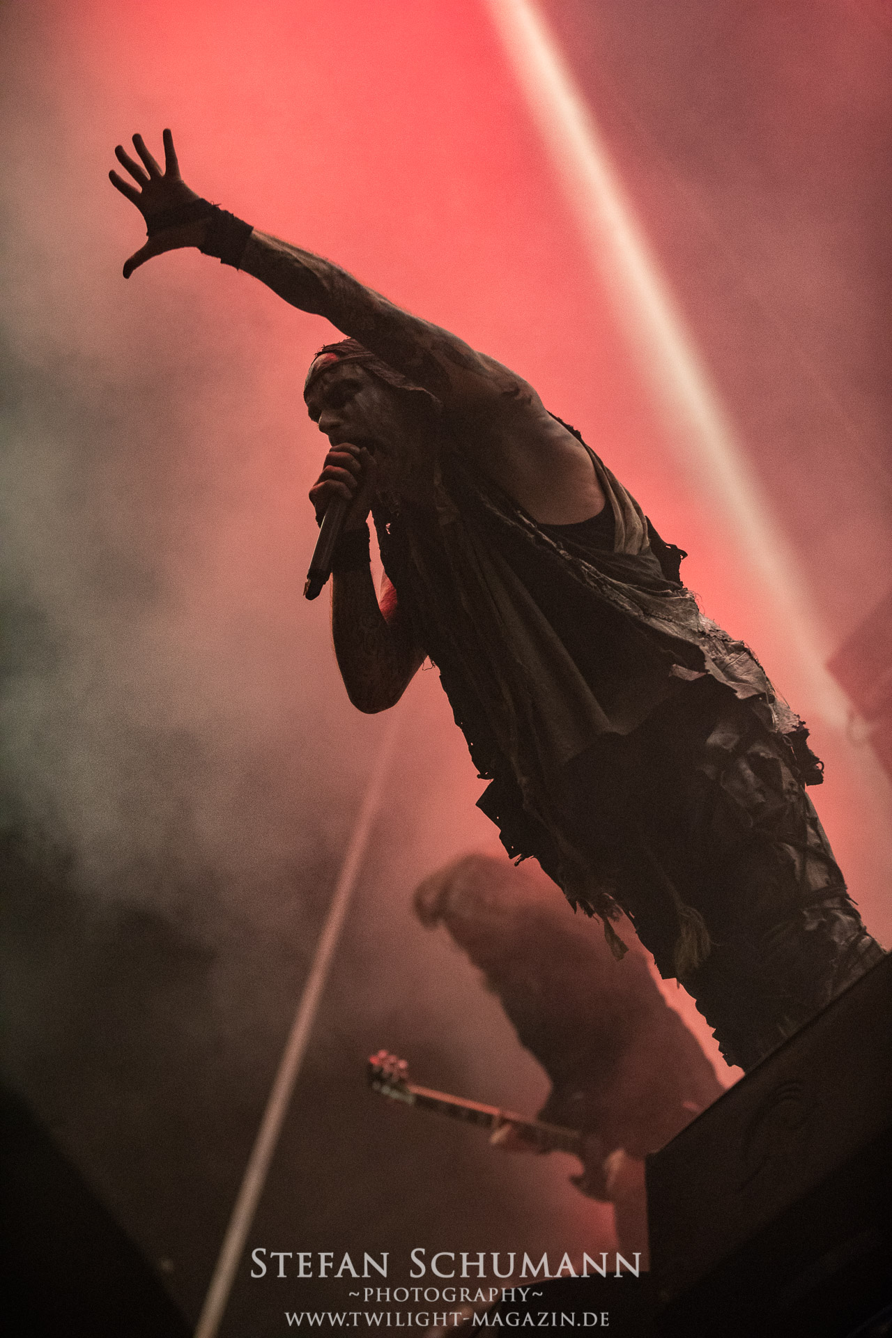 Der letzte Tag beginnt mit einem weiteren, inzwischen fast traditionellen, Überraschungsausflug zur Zweitbühne: Dort unterhalten gerade die jungen Schweizer TYRMFAR die circa 50 anwesenden Gestalten mit ihrer doch sehr bekömmlichen Black/Death-Metal-Mischung, die man sich bei den Großen der Szene abgeschaut hat. Die erste größere Menge findet sich dann vor dem mit Recht immer populärer werdenden Hamburger Duo MANTAR ein, die nur mit Gitarre, Schlagzeug und Gesang eine breitere Doom-Wand erzeugen als andere Bands zu fünft. Nach ihrem letzten Song „Era Borealis“ machen sie dann Platz für die Thrasher MUNICIPAL WASTE, die mit ihrem Anti-Trump-Backdrop politisch eindeutig Stellung beziehen. Auch wenn musikalisch nicht ganz so abwechslungsreich, hat das Publikum deinen Spaß und zerrt zahlreiche Aufblas-Gummitiere in die Circle-Pit.