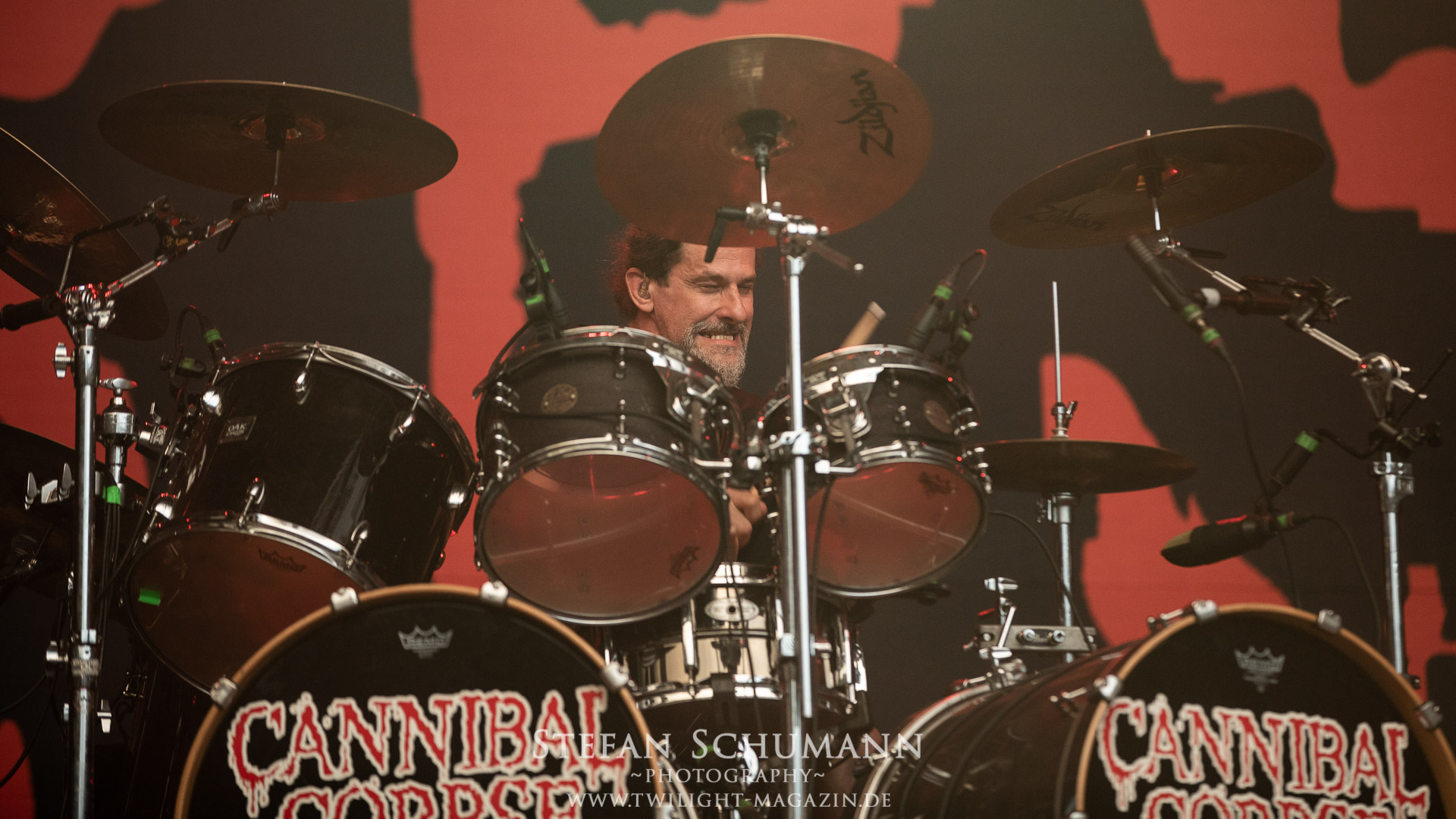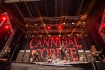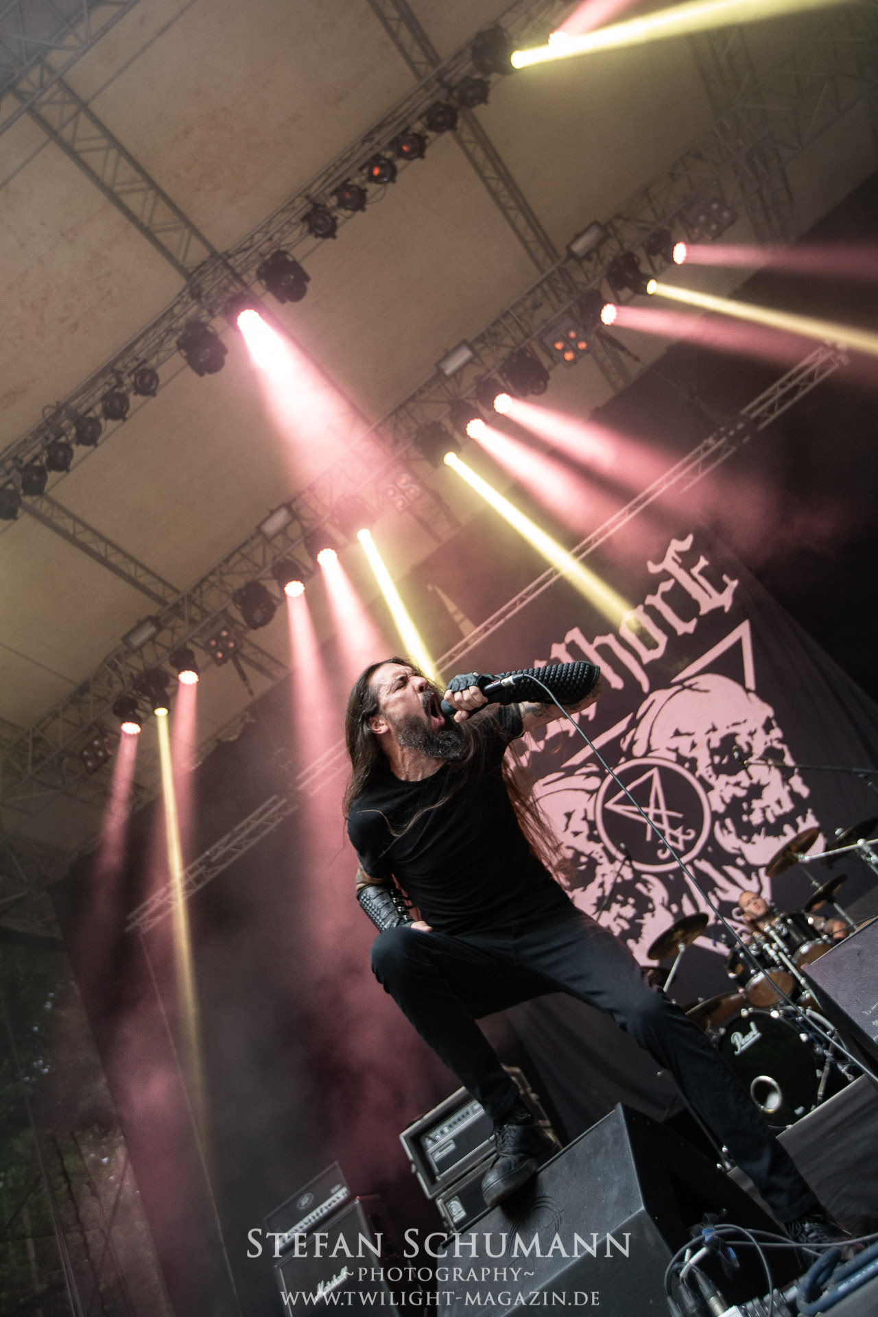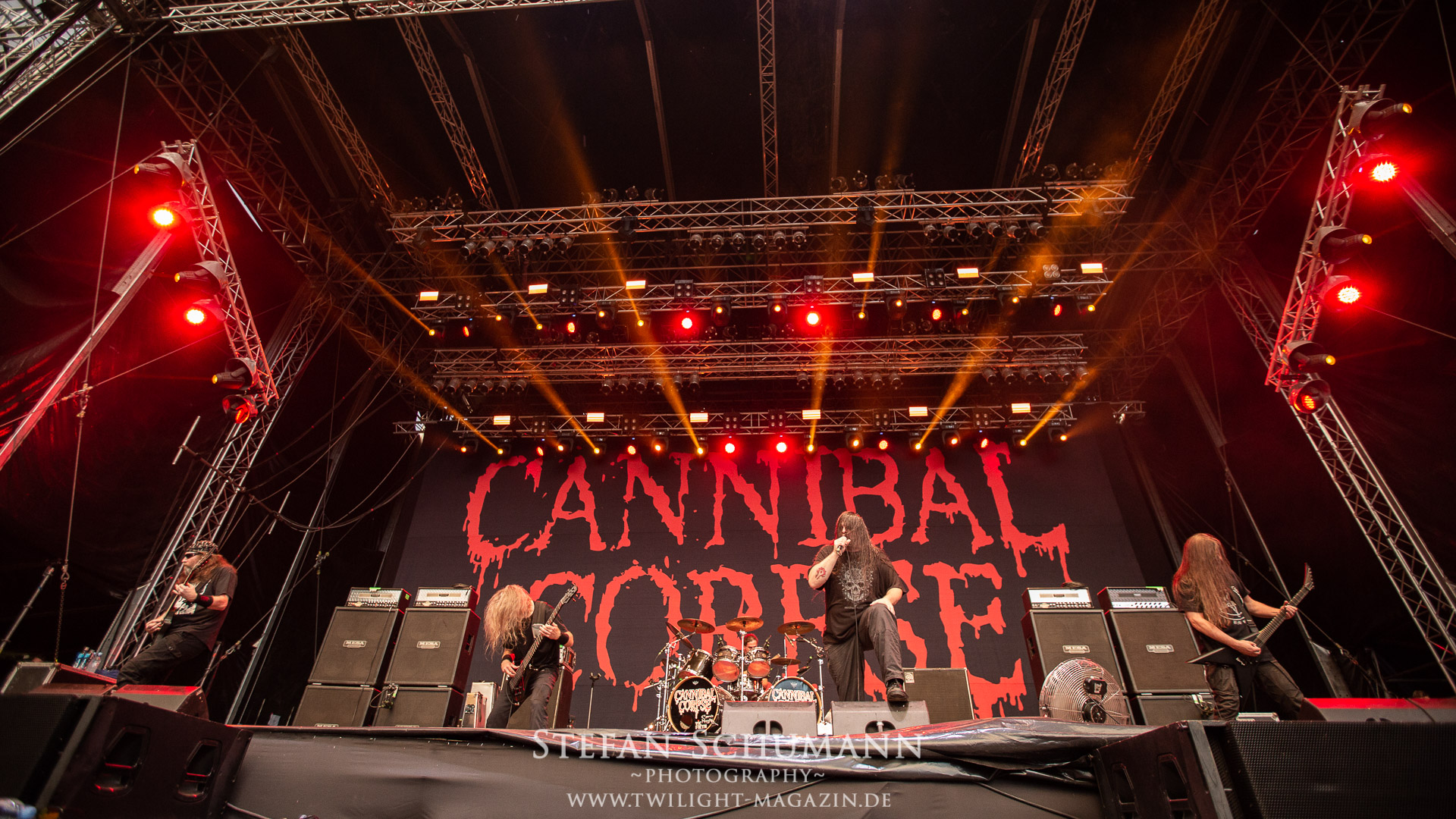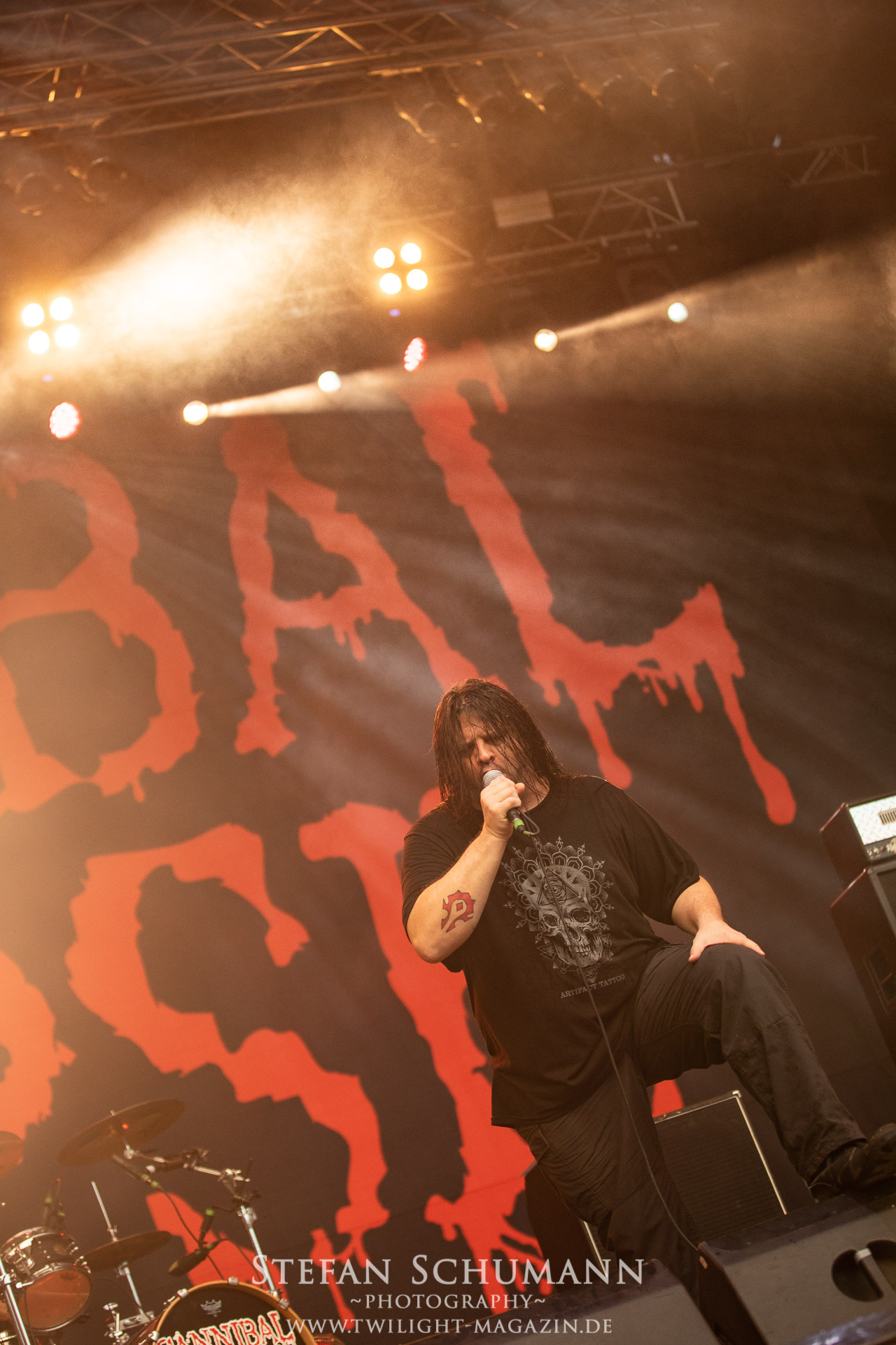 Noch eine Nummer härter wird es dann bei CANNIBAL CORPSE, die den zwischenzeitlichen Regenbogen über der Hauptbühne wohl nicht bestellt haben. Öfter schon mit dem deutschen Jugendschutz angeeckt, können sie auf den Metal Days unbeschränkt aus allen Rohren ballern. Stiernacken Corpsegrinder Fisher grunzt seine Horror-Geschichten in den Nachthimmel oder lässt seine Matte kreisen, während die eingespielte Instrumentenfraktion keine Fragen offen lässt. Okkulter geht es währenddessen nebenan bei ATTIC zu. Auf der gesamten Bühne sind Kerzen drapiert und mehr als einmal weckt die Band Erinnerungen an KING DIAMOND.