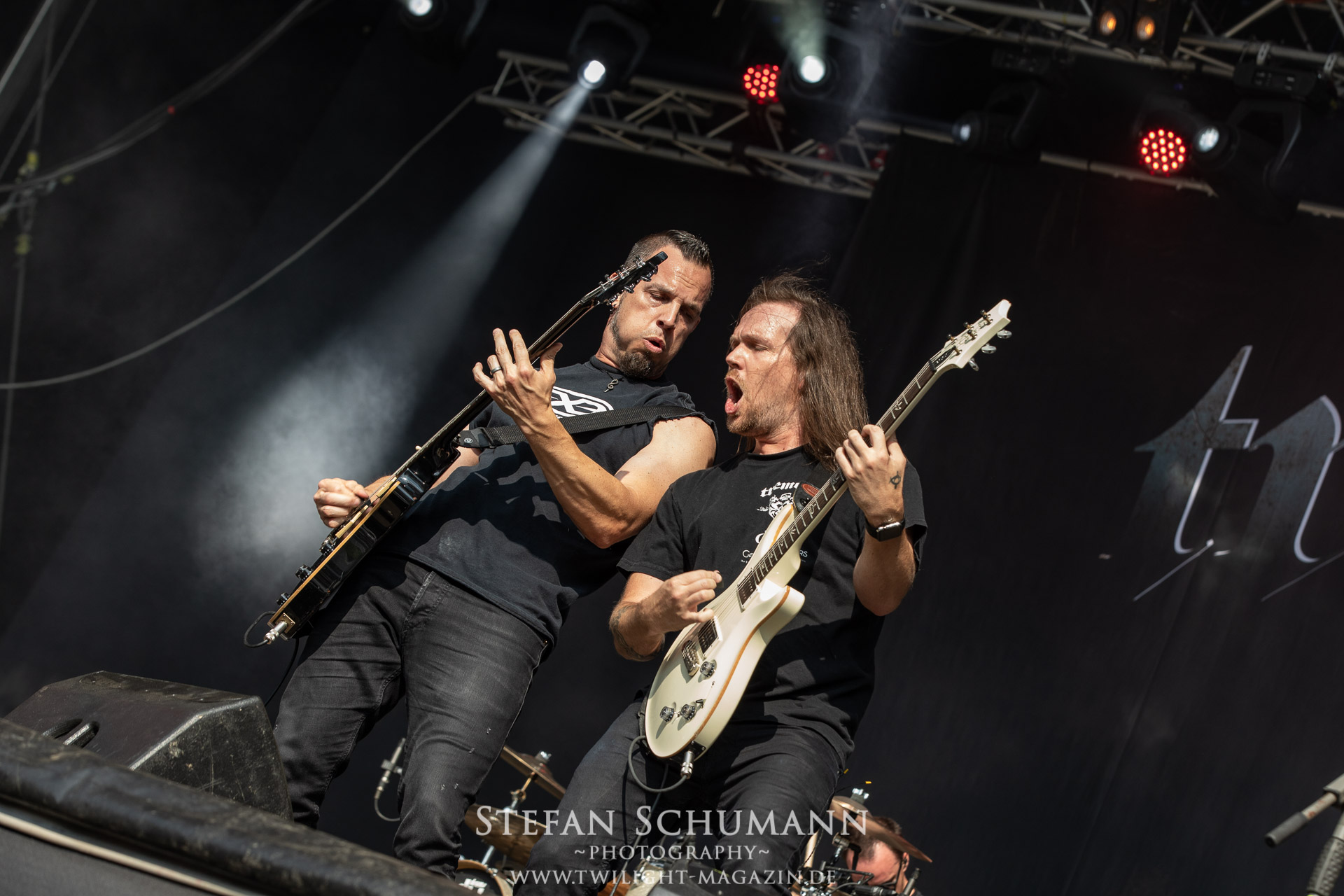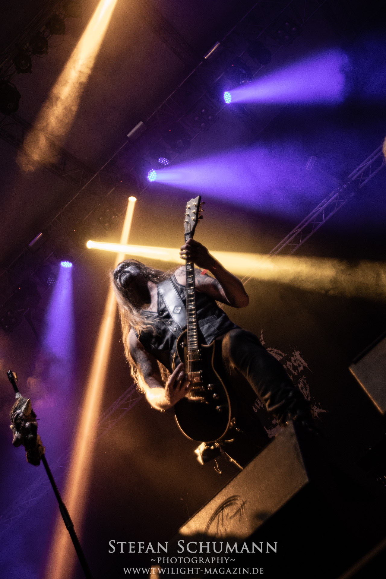 Der Dienstag nervt dann gleich mit einem Konzert-Clash: Während auf der Hauptbühne TESSERACT ihren djentigen progressive Metal dem geneigten Bass-Frickler um die Ohren haut, sind nebenan im Wald die Old-School-Doomster PALLBEARER dabei, die Langsamkeit des Riffs auszuloten. Die Menschenmassen werden dann wieder von ENSIFERUM vor der Hauptbühne eingesammelt. Der fröhliche Vikingmetal mit ordentlich reitenden Gitarren gefällt und Sänger Petri Lindroos performt die neuen Songs genauso, wie die noch ohne ihn eingespielten Lieder der ersten beiden wegweisenden Alben. Höhepunkt der Publikumsinteraktion bilden dabei natürlich „Lai Lai Hei“ und der Rausschmeißer „Iron“, bevor die Bühne für die deutschen Heavy Metal-Urgesteine ACCEPT geräumt wird. Die Solinger fahren voll auf und verlassen sich auch ohne Udo Dirkschneider auf ihre All-Time-Classics wie „Fast as a Shark“, „Metal Heart“ und „Balls to the Wall“, die wirklich jeder mitsingen kann. Ausufernde Gitarrensoli („Für Elise“ im Fleischwolf) und exzessives Posen vor den Bühnenaufbauten sind dabei natürlich auch unentbehrlich.
