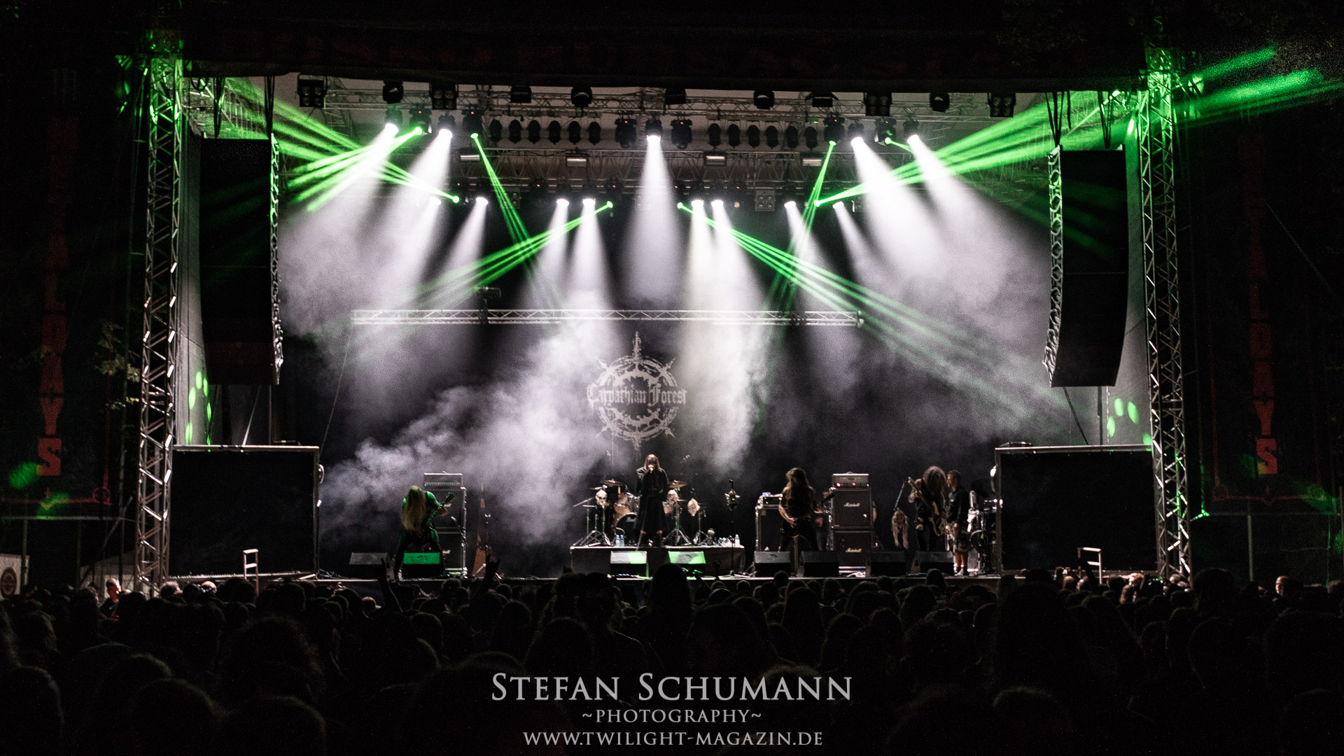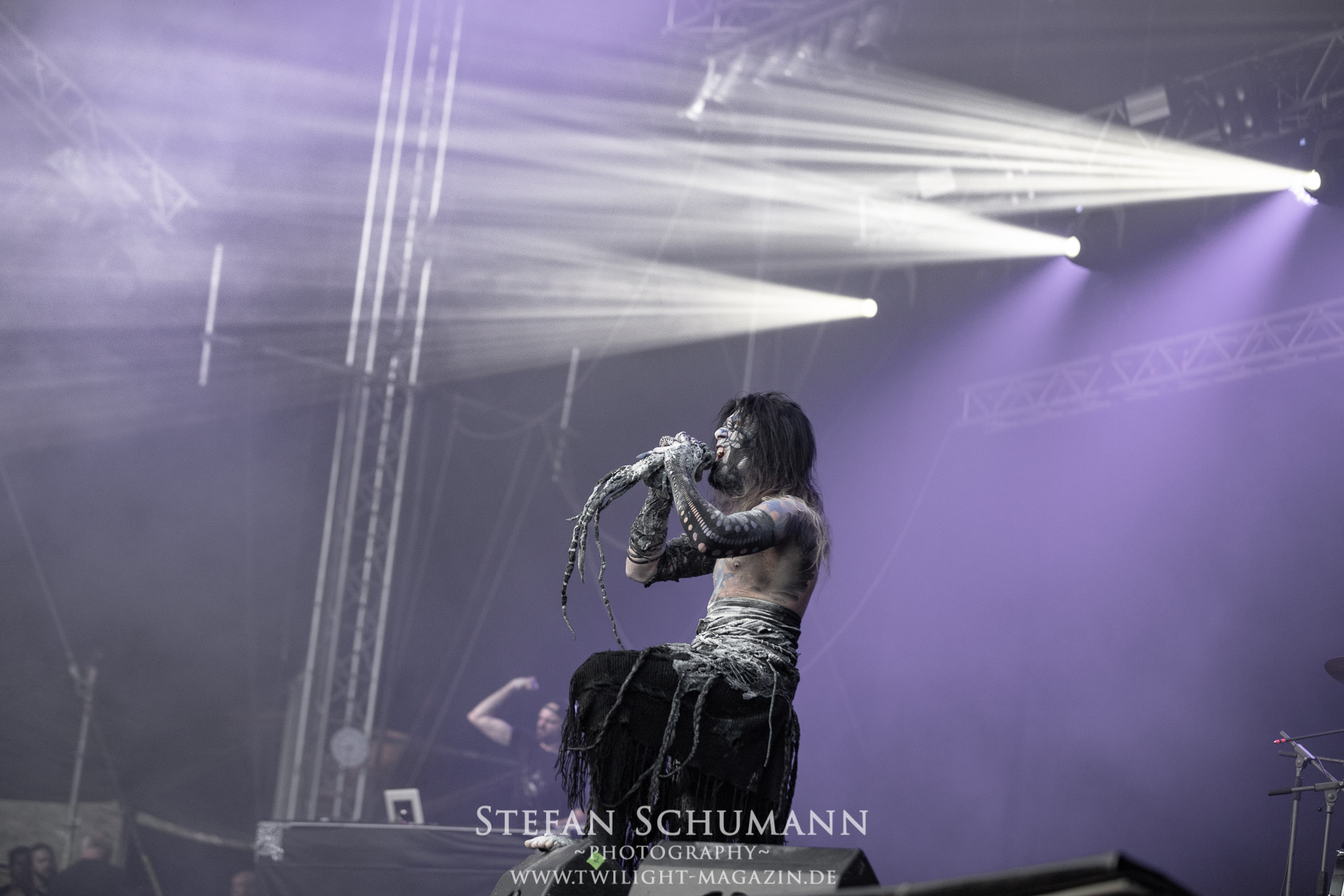 Nicht weniger melodiös geht es bei ELUVEITIE zu, bei der man sich erst an die vielen neuen Gesichter auf der Bühne gewöhnen muss, da Frontmann Chriegel vor einiger Zeit quasi die komplette Backing-Band ausgetauscht hat. Aber auch die „Neuen“ haben die Songs natürlich drauf und sorgen mit Flöte und Geige für ordentlich Betrieb auf den Brettern. Als Kontrastpunkt speien parallel dazu CARPATHIAN FOREST ihren Hass auf der zweiten Bühne in die Welt. Obwohl die Norweger seit über zehn Jahren kein reguläres Album mehr heraus gebracht haben, ziehen sie mit ihren Klassikern das Publikum in ihren Bann. Auflockerung vom Black-Metal-Geballer gibt es mit zwei Cover-Versionen von THE CURE und TURBONEGRO – natürlich im ganz eigenen CF-Gewand.