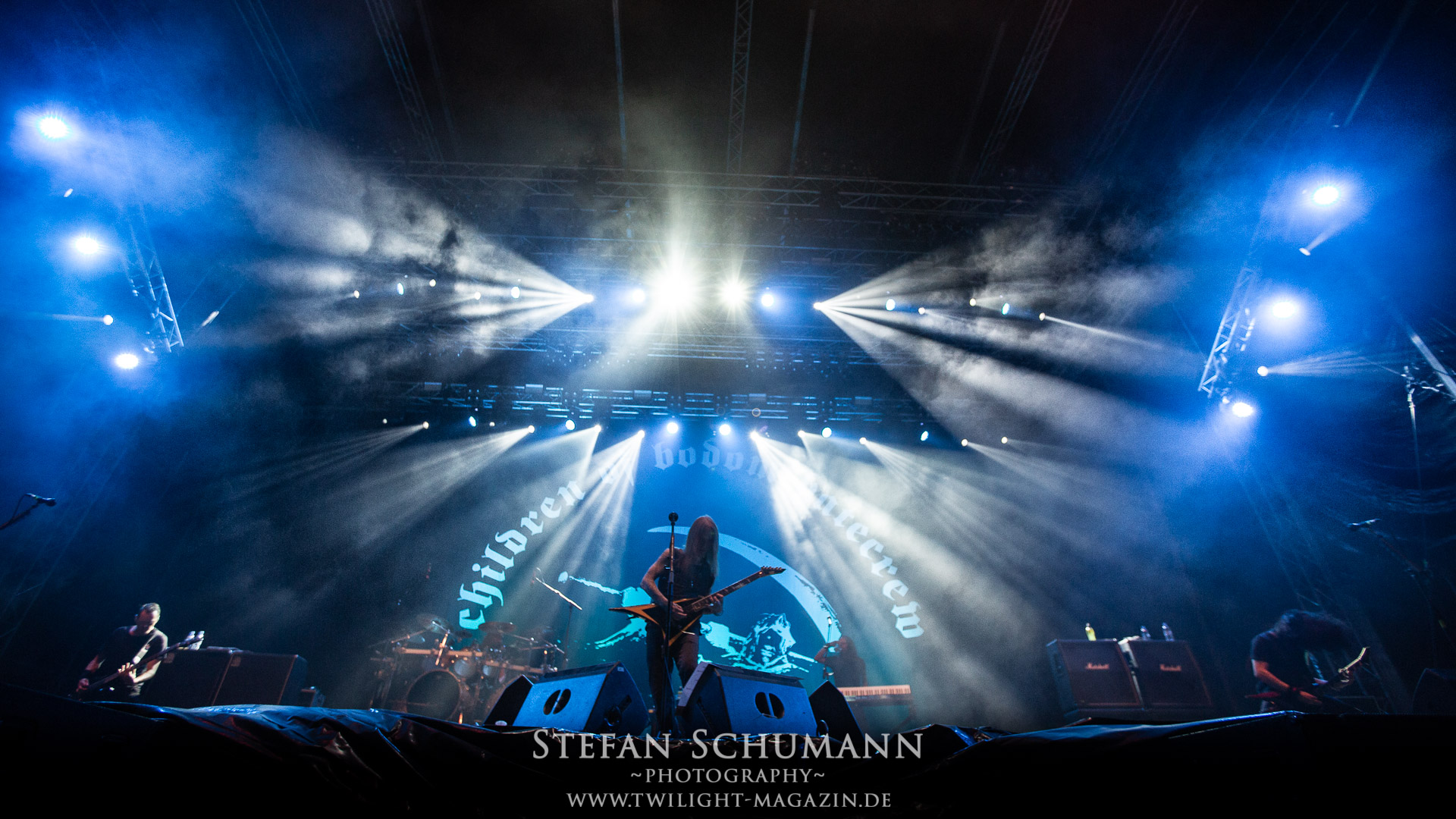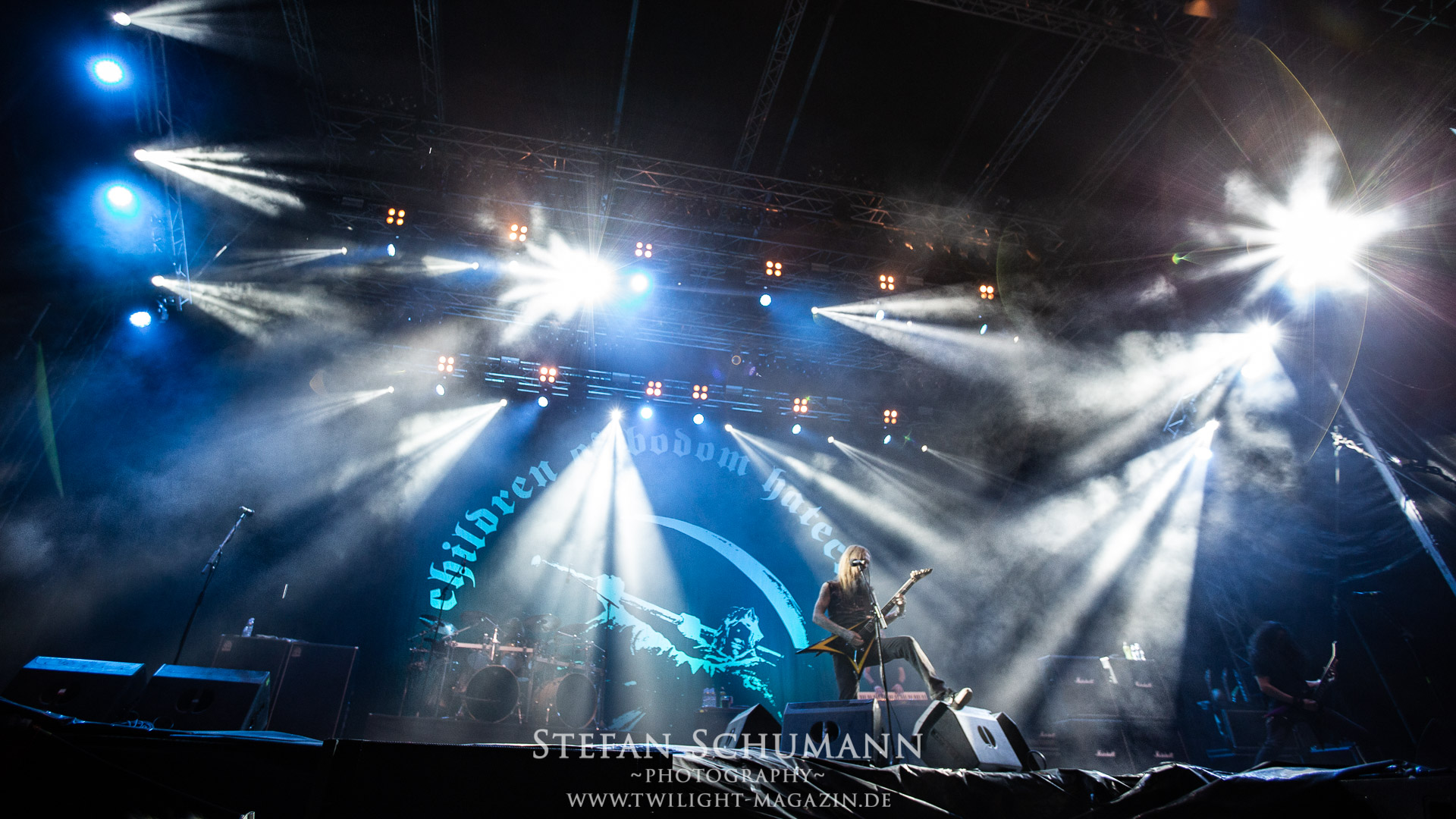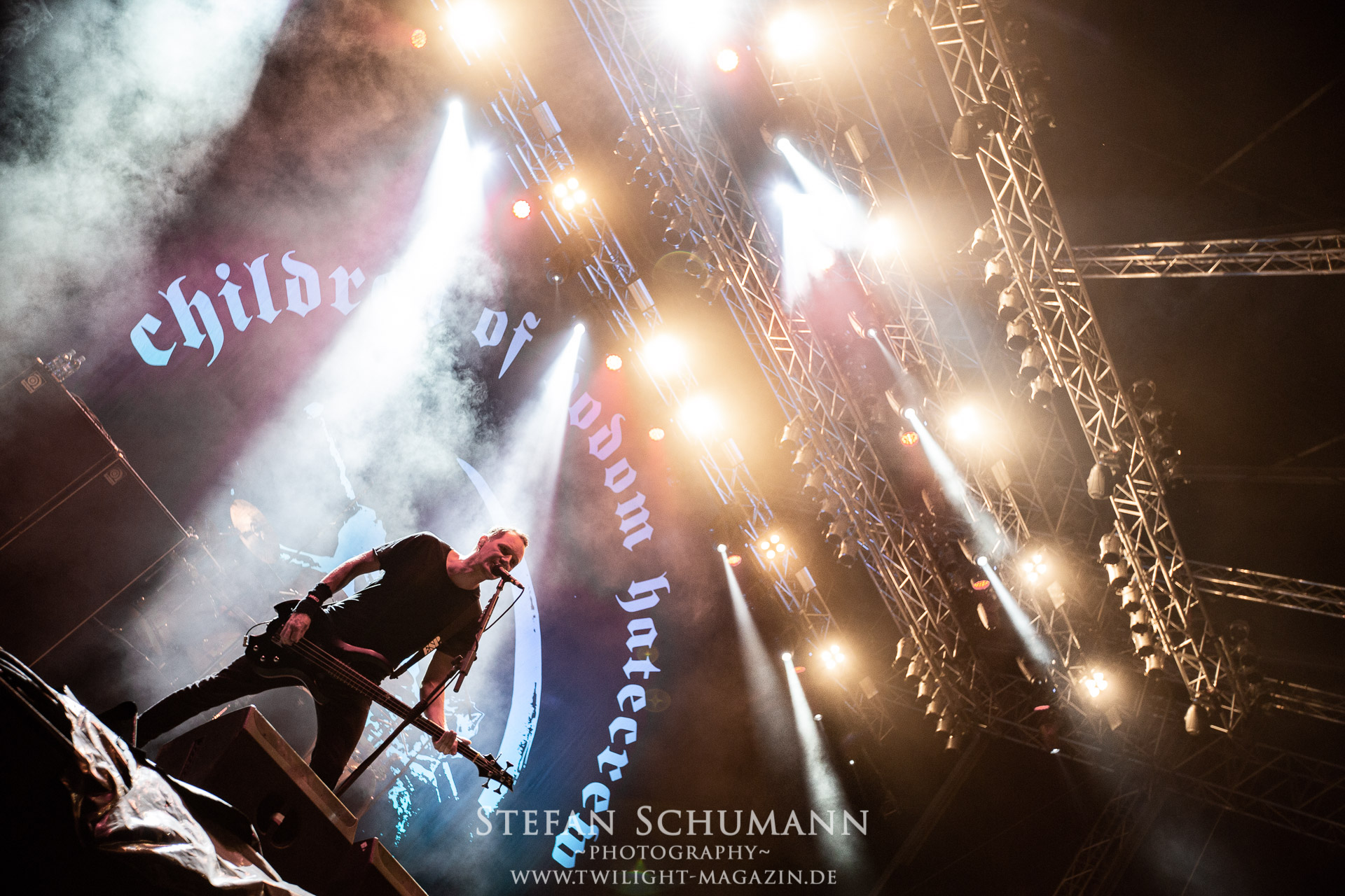 CHILDREN OF BODOM sollen das Festival würdig beschließen und legen mit „Are you dead, yet?“ auch sofort ordentlich los. Die Gitarrenriffs duellieren sich mit den Keyboards, und auch für die älteren Fans hat die Setlist einiges zu bieten. Doch scheint jemand hinter der Bühne den Song „I worship Chaos“ etwas zu wörtlich genommen zu haben, da die Band mit einigen Soundproblemen zu kämpfen hat. Als die fiesen Rückkopplungen auf den In-Ear-Monitoren zu stark werden, brechen Alexi Laiho und Co. sogar kurzfristig ab und verlassen die Bühne. Nach ein paar deftigen Flüchen setzen CoB das Konzert jedoch professionell fort, und dass dann auch noch einmal ein falsches Intro eingespielt wird, fällt auch nicht mehr ins Gewicht. Das Publikum gibt auf jeden Fall auch am letzten Tag noch einmal alles und lässt die ein oder andere Staubwolke aufsteigen, bevor die Lichter auf der Hauptbühne nach „Towards Dead End“ endgültig ausgehen. Ein Schmankerl haben sich die Veranstalter dann aber doch noch aufgehoben: PRIMORDIAL dürfen die 2018er Edition als allerletzte Band auf der zweiten Bühne zu Grabe tragen. Und dass es dabei ernst zur Sache geht, macht Frontmann Nemtheanga auch sofort klar: „No beachballs! We are not Alestorm! Behave like men!“ Dann werden die Gitarrenwände ausgepackt und „Nail their tongues“ in den Tolminer Nachthimmel gefeuert. Bei „As Rome Burns“ dirigiert der Sänger den tausendköpfigen Chor und auch nach 90 Minuten harren die Unentwegten noch aus, um „Empire Falls“ zu zelebrieren. Und gerade, als sich einige schon auf den Heimweg machen, erscheint die Band noch einmal um mit „Heathen Tribes“ das großartige Festival endgültig zu beenden.