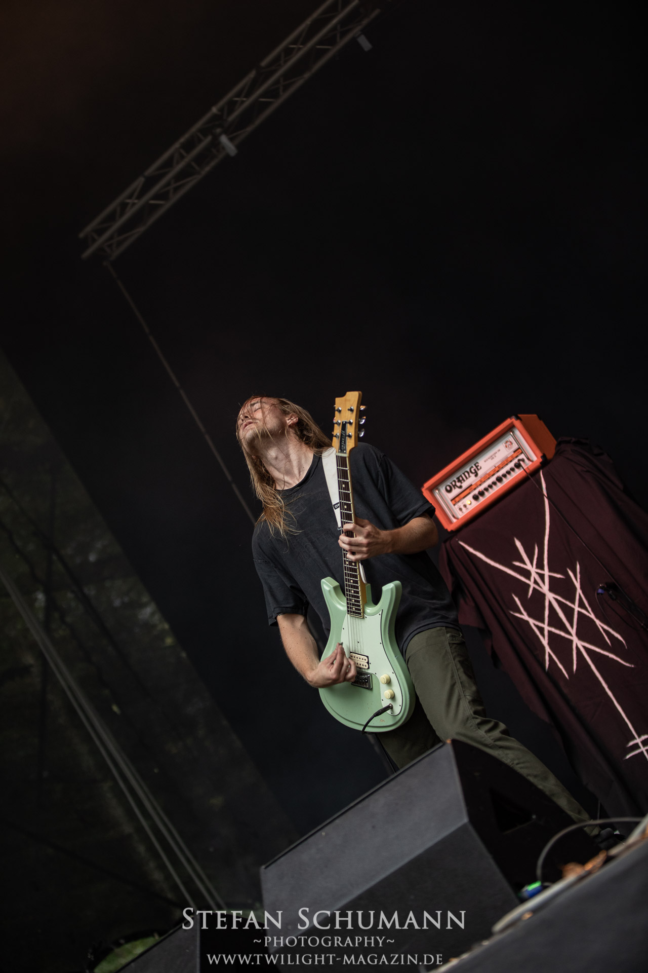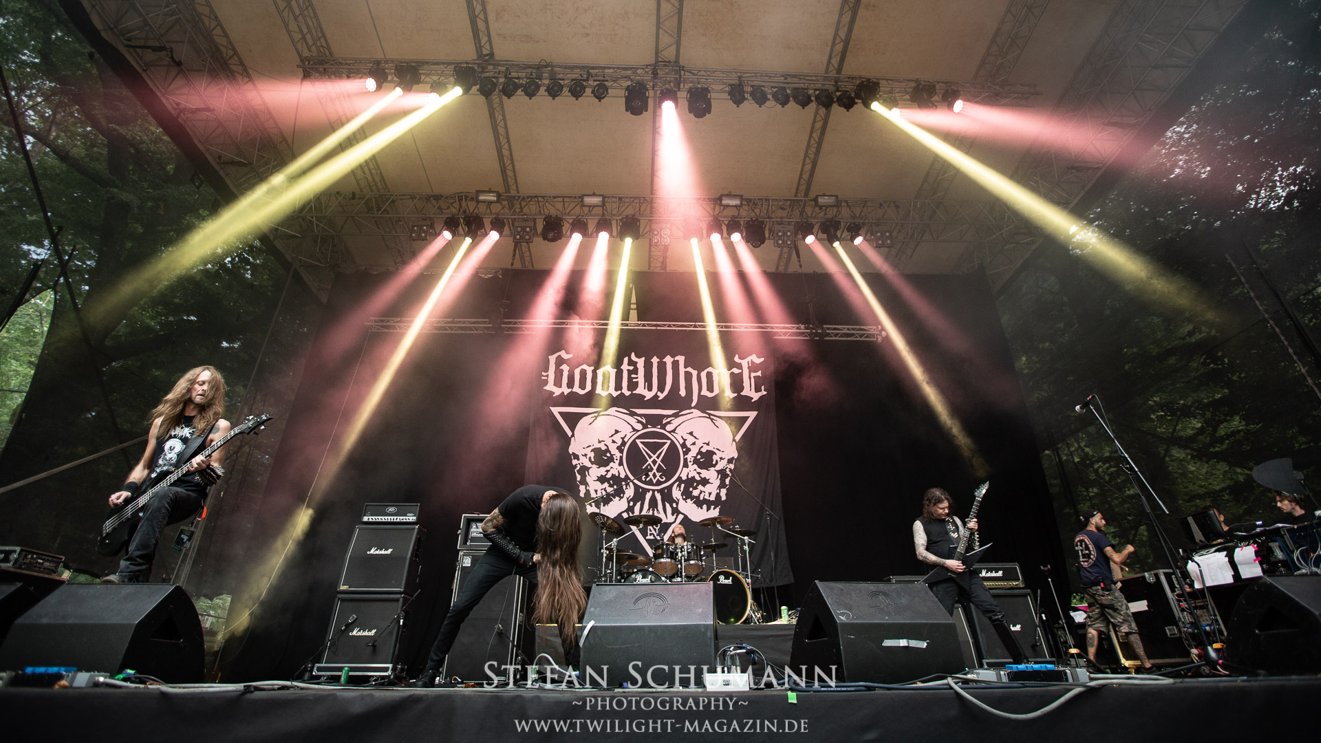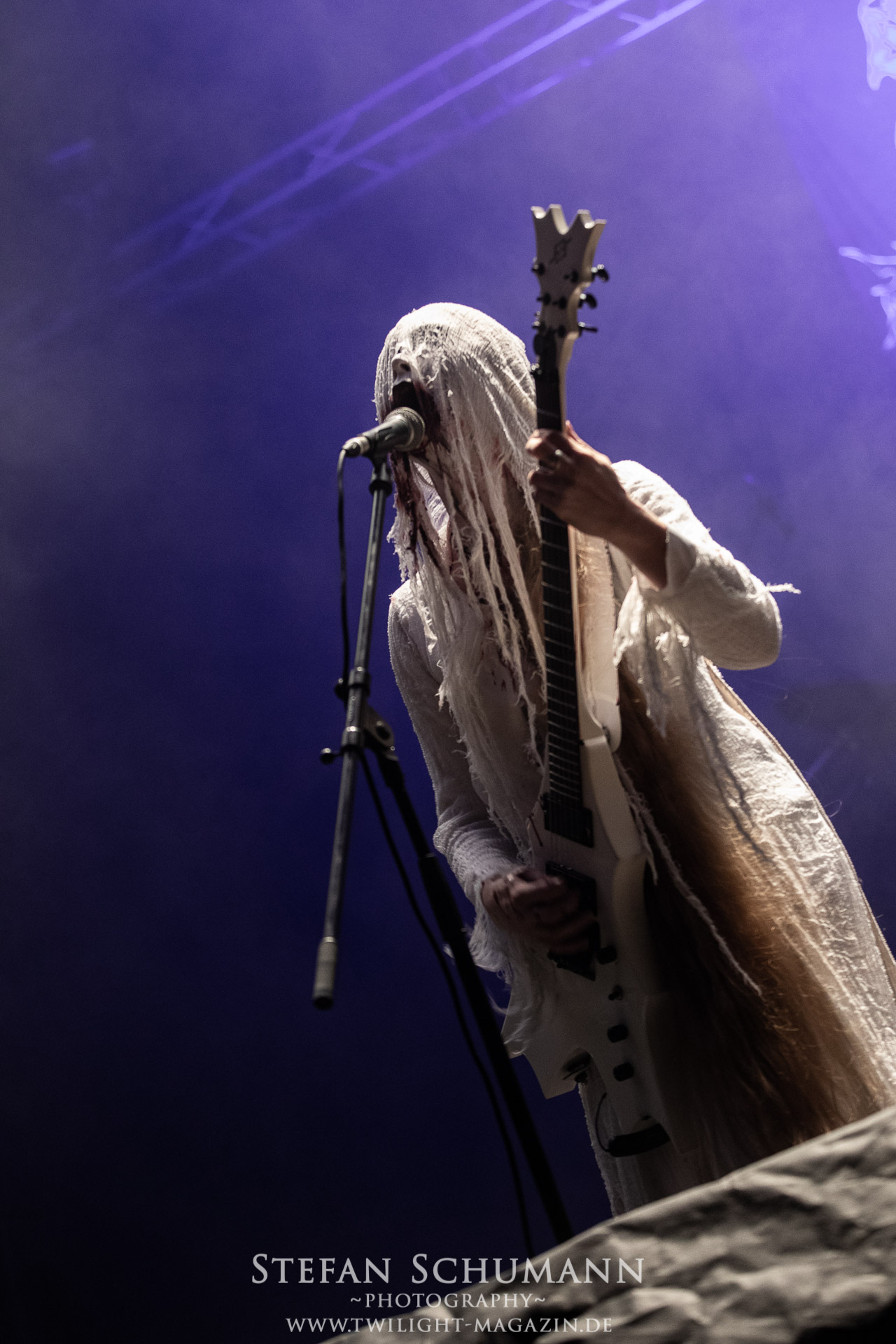 YRKUR, das „Black Metal“-Projekt des dänischen Models Amalie Bruun. Diese steht auch im Mittelpunkt des Auftritts und schreit, wimmert und windet sich durch das einstündige Set, das dann aber doch etwas abrupt früher als gedacht endet.Der letzte Tag beginnt mit einem weiteren, inzwischen fast traditionellen, Überraschungsausflug zur Zweitbühne: Dort unterhalten gerade die jungen Schweizer TYRMFAR die circa 50 anwesenden Gestalten mit ihrer doch sehr bekömmlichen Black/Death-Metal-Mischung, die man sich bei den Großen der Szene abgeschaut hat. Die erste größere Menge findet sich dann vor dem mit Recht immer populärer werdenden Hamburger Duo MANTAR ein, die nur mit Gitarre, Schlagzeug und Gesang eine breitere Doom-Wand erzeugen als andere Bands zu fünft. Nach ihrem letzten Song „Era Borealis“ machen sie dann Platz für die Thrasher MUNICIPAL WASTE, die mit ihrem Anti-Trump-Backdrop politisch eindeutig Stellung beziehen. Auch wenn musikalisch nicht ganz so abwechslungsreich, hat das Publikum deinen Spaß und zerrt zahlreiche Aufblas-Gummitiere in die Circle-Pit.