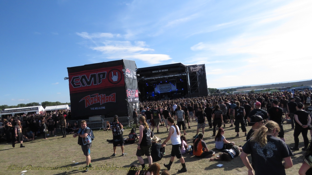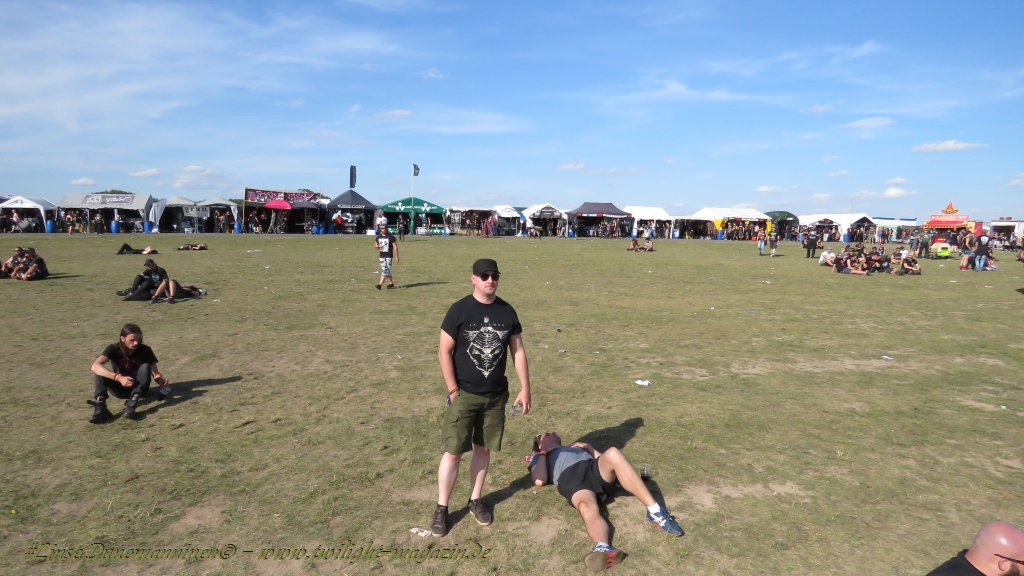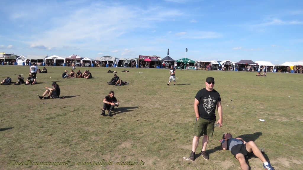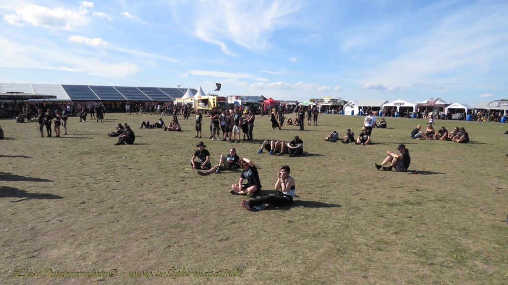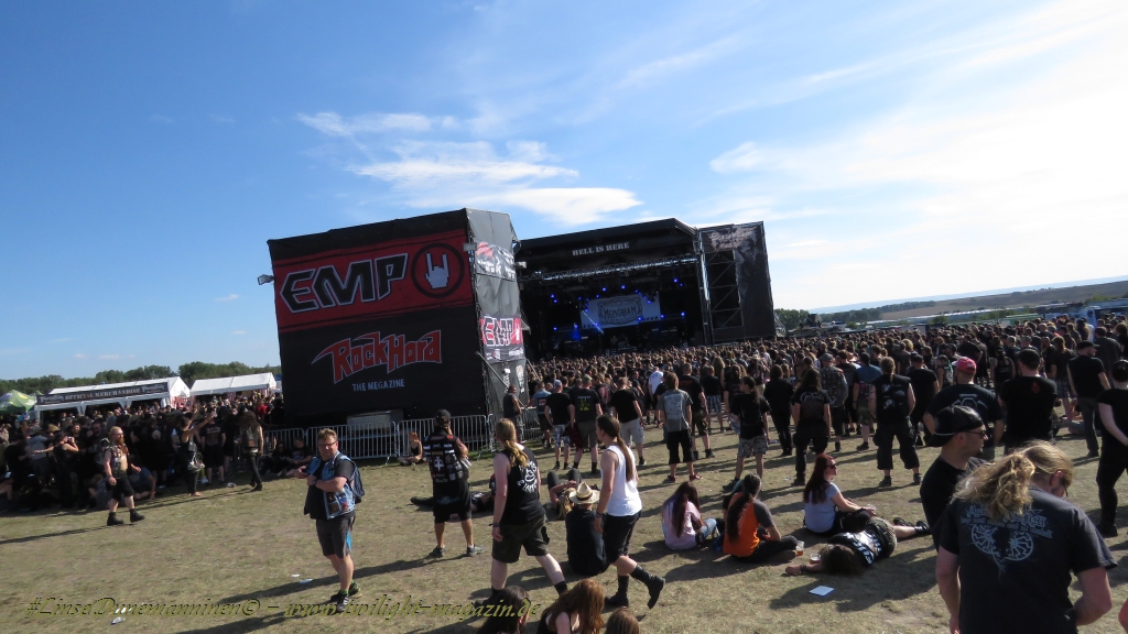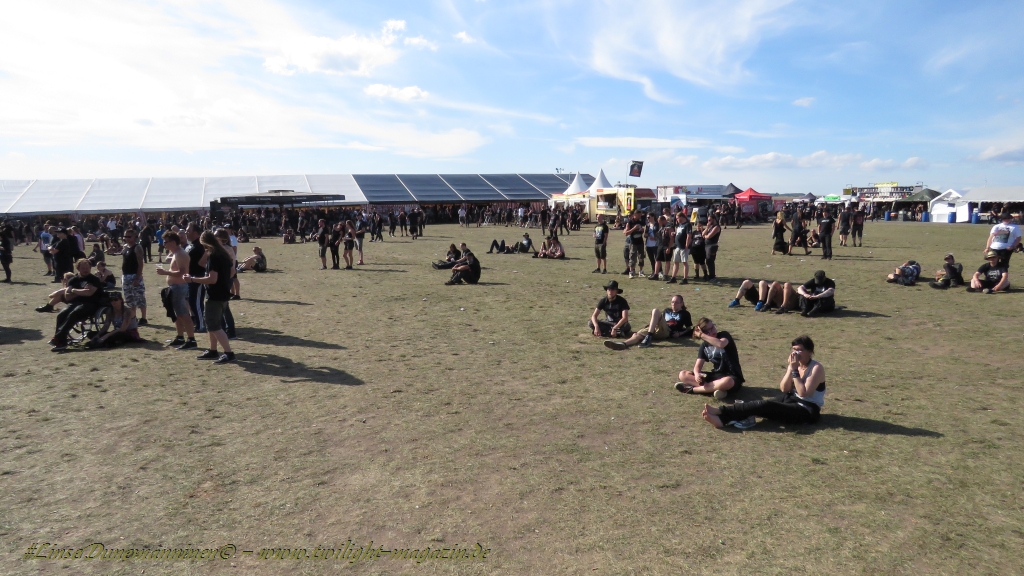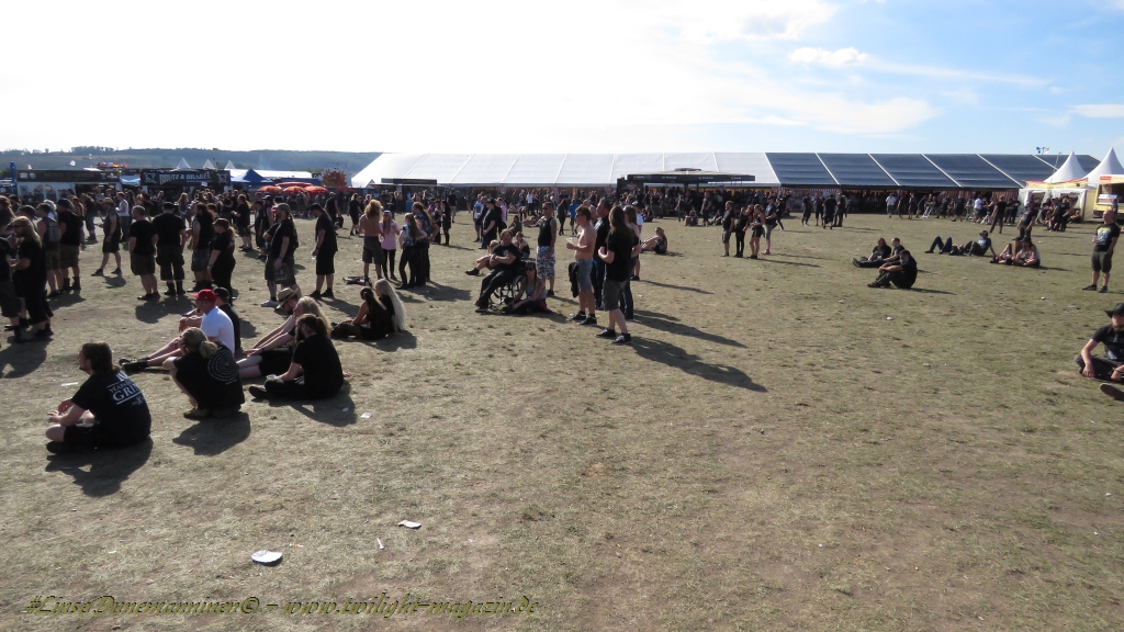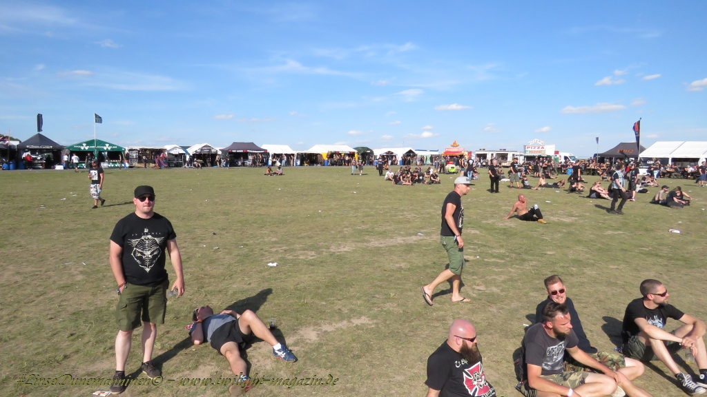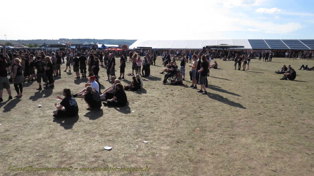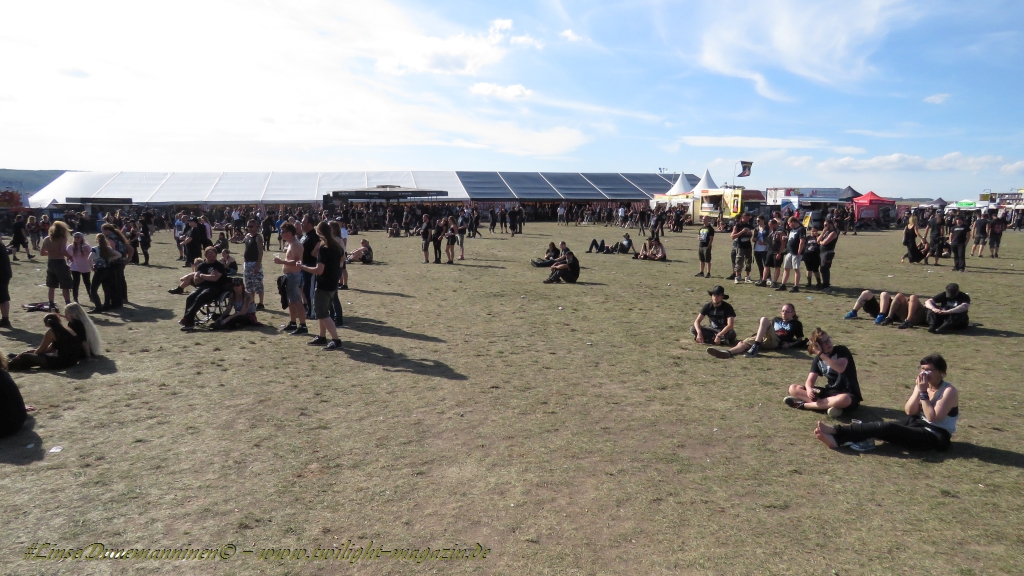 Nachdem man den Besuchern mit dem Whiskey-Pub eine äußerst gediegene Neuerung angekündigt hatte, darf man den massiven Ausbau der (gegen Entgelt) vorreservierbaren Campingflächen und dem damit verbundenen Verlust an freien Flächen durchaus diskutieren. Denn die Reservation garantiert keinesfalls kurze Wege, allerdings kann sie zeitversetzt anreisenden Gruppen jedoch einiges an Stress ersparen. Es gilt das Windhund-Prinzip und damit die alte Tatsache "Wer zuerst kommt...", sowohl bei der Reservierung, wie auch bei der klassischen Anreise ohne Vorreservierung. Eine Vielzahl von im Vorfeld abgesteckter Claims sollte eigentlich auch der Security bzw. den Einweisern die Arbeit erleichtern, doch bei unserer zeitigen Anreise am Mittwoch-Vormittag müssen wir leider erstmalig im Bereich der freien Camping-Flächen eine komplett überforderte Crew dabei erleben, die auf den Platz strömenden Massen mit angemessenen Campingflächen zu versorgen und dabei sicherheitsrelevante Aspekte zu beachten. Letztendlich ist das Problem dann aber relativ schnell behoben und nachdem unser massiver Pavillon ausgerechnet zu jenem Zeitpunkt aufgebaut wird, als sich der einzige relevant aber sturmumtoste, unwetterartige Regenguss des gesamten Wochenendes über die noch jungfreuliche Spielwiese ergießt, kehrt nicht nur Ruhe sondern feierliche Vorfreude ins alljährliche Lagerleben ein. Und diese positive Erwartungshaltung will gepflegt werden, wofür einmal mehr beim traditionellen Metal-Disko - Auftakt im Zelt mit Speis und Trank der Boden bereitet ist, wobei dem Stammkunden recht schnell auffällt, dass sowohl die Bierpreise wie auch der Preis der superben Weimarer Bratwurst leicht angezogen haben. Neben der feuchten Husche von oben haben die Meteorologen auch zielsicher den damit einhergehenden massiven Temperatursturz vorher gesagt, was des Nächtens nicht nur für ungewöhnliche Temperaturen nahe des Gefrierpunktes, sondern am Donnerstag Vormittag auch zum Wolldecken-Engpass bei einem Textil-Discounter in der Schlotheimer City sorgt. Selbst in den schattigen Nächten zu Bad Berka habe ich es in all den Jahren nie so frostig empfunden, wie in diesem Jahr zum Festival-Auftakt. Weitere Kapriolen bleiben jedoch erfreulicher Weise aus und insgesamt meinen es die Wetterfrösche mit den Veranstaltern und dem Publikum auch 2016 mehr als gut. Zwar bleibt es mitunter durchwachsen, doch mit mit voranschreitender Dauer darf sich im Verlauf der nächsten Tage mehr und mehr die Sonne durchsetzen.