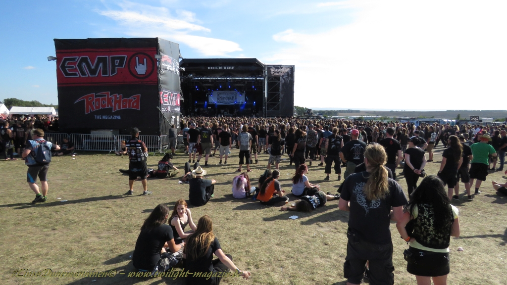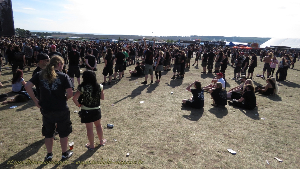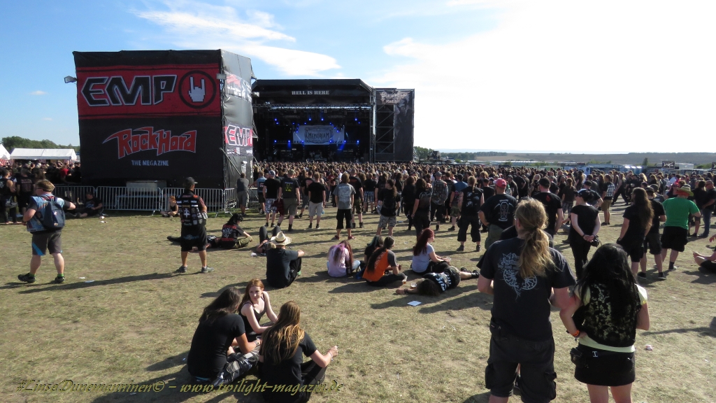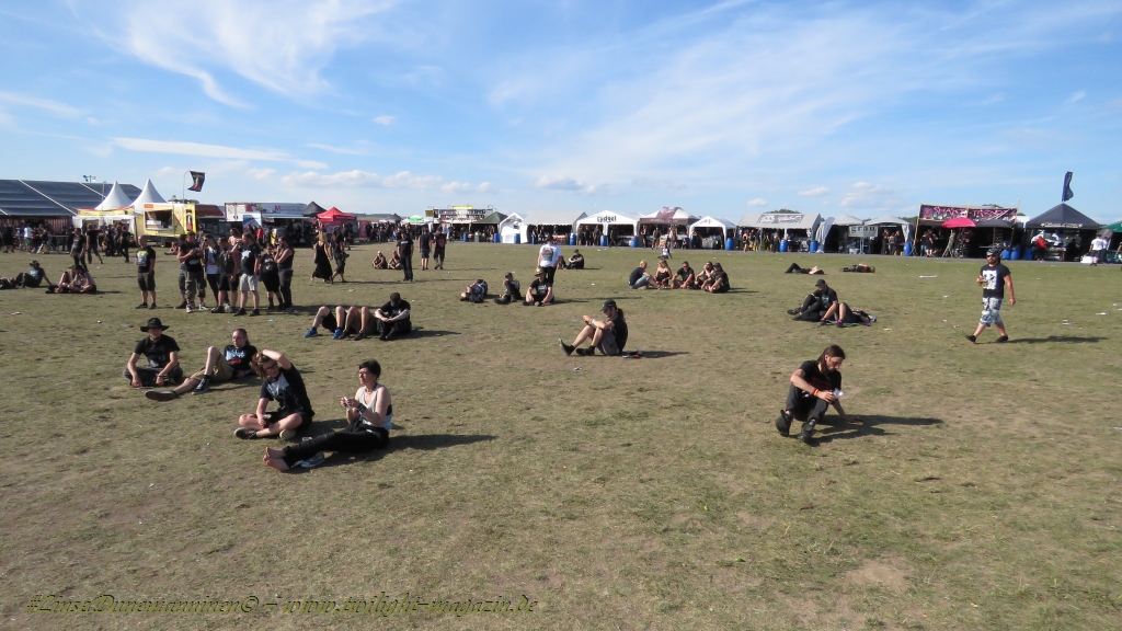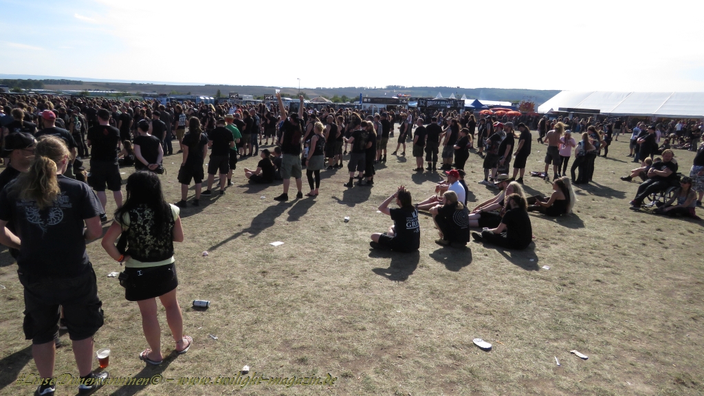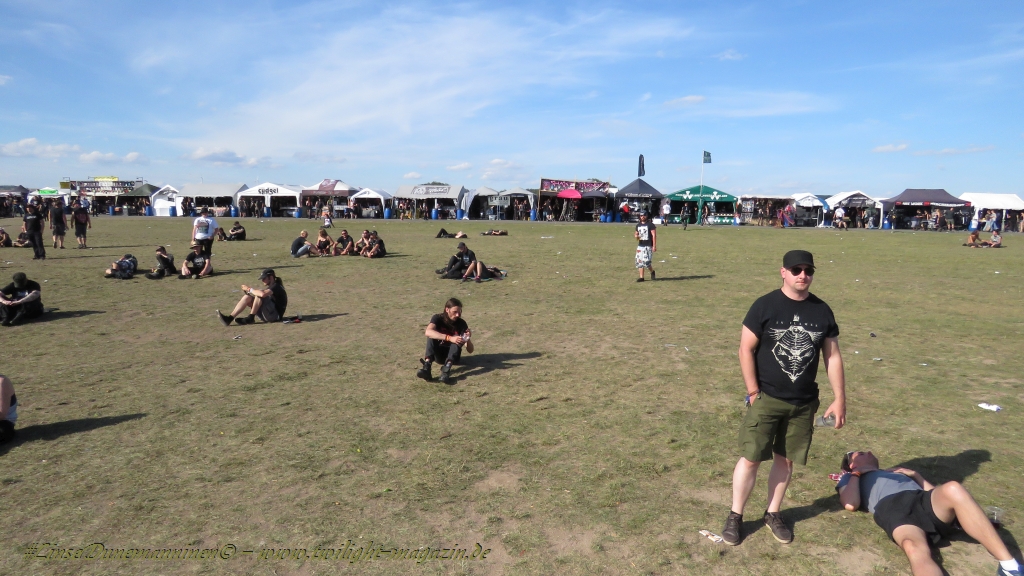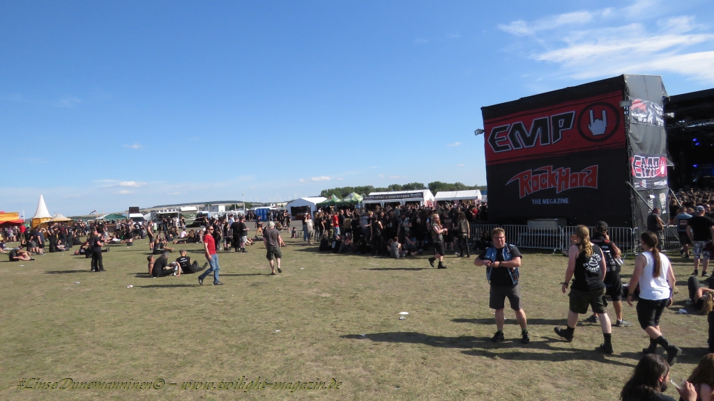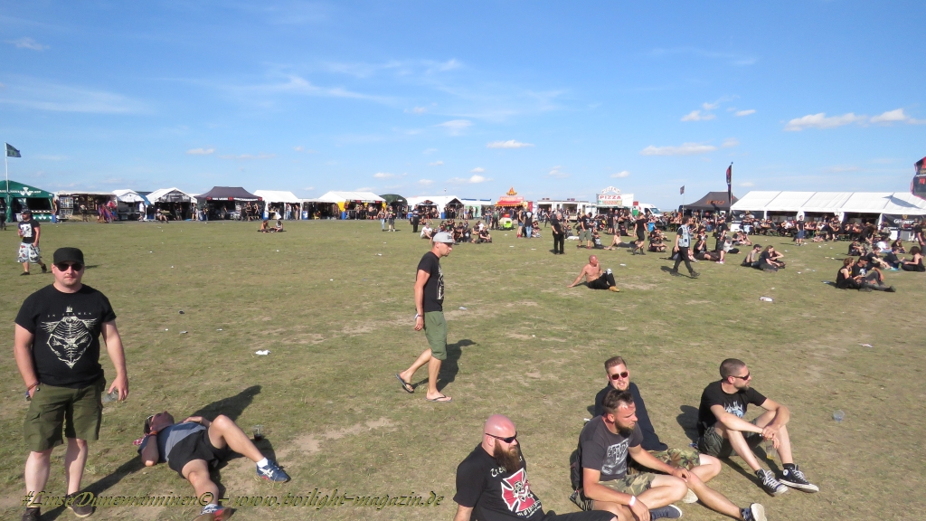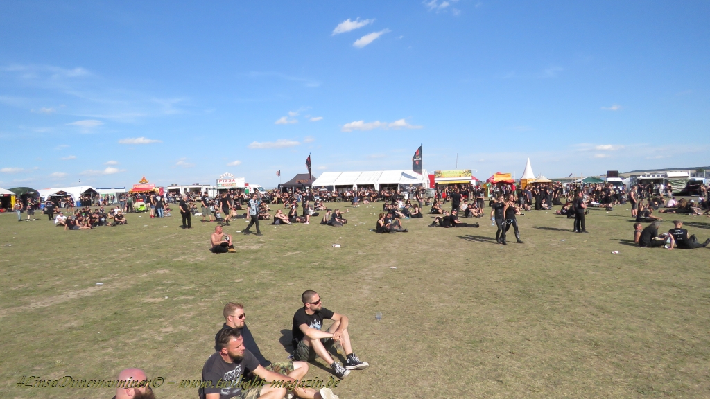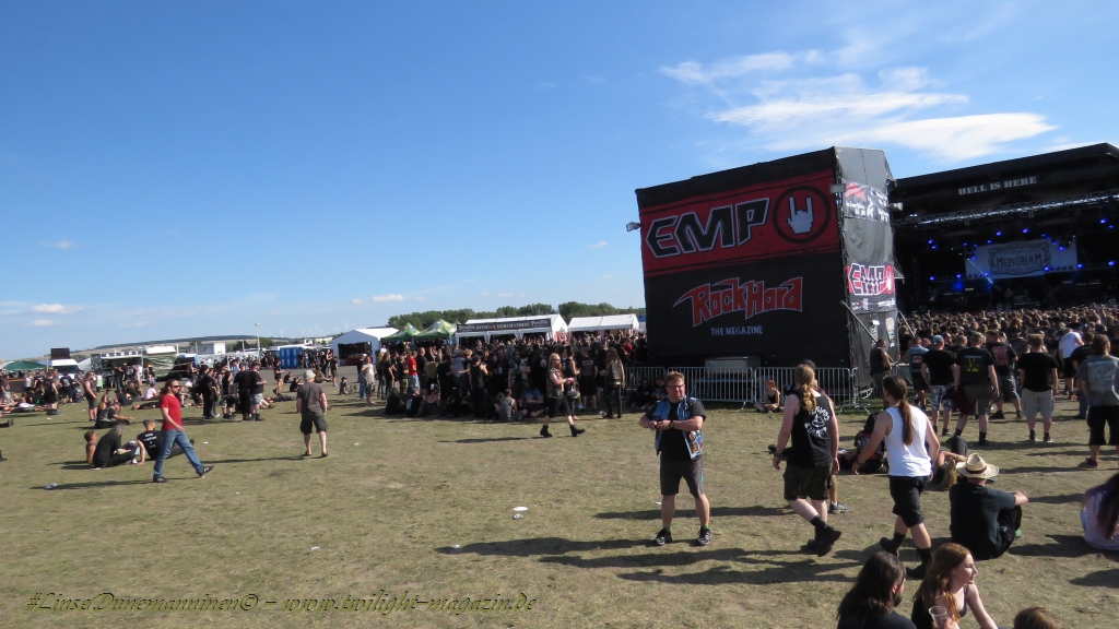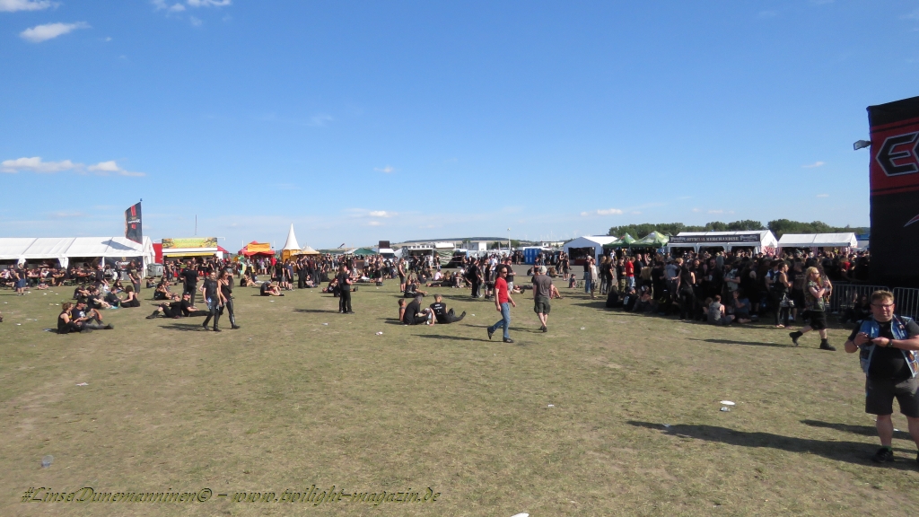 Nachdem man den Besuchern mit dem Whiskey-Pub eine äußerst gediegene Neuerung angekündigt hatte, darf man den massiven Ausbau der (gegen Entgelt) vorreservierbaren Campingflächen und dem damit verbundenen Verlust an freien Flächen durchaus diskutieren. Denn die Reservation garantiert keinesfalls kurze Wege, allerdings kann sie zeitversetzt anreisenden Gruppen jedoch einiges an Stress ersparen. Es gilt das Windhund-Prinzip und damit die alte Tatsache "Wer zuerst kommt...", sowohl bei der Reservierung, wie auch bei der klassischen Anreise ohne Vorreservierung. Eine Vielzahl von im Vorfeld abgesteckter Claims sollte eigentlich auch der Security bzw. den Einweisern die Arbeit erleichtern, doch bei unserer zeitigen Anreise am Mittwoch-Vormittag müssen wir leider erstmalig im Bereich der freien Camping-Flächen eine komplett überforderte Crew dabei erleben, die auf den Platz strömenden Massen mit angemessenen Campingflächen zu versorgen und dabei sicherheitsrelevante Aspekte zu beachten. Letztendlich ist das Problem dann aber relativ schnell behoben und nachdem unser massiver Pavillon ausgerechnet zu jenem Zeitpunkt aufgebaut wird, als sich der einzige relevant aber sturmumtoste, unwetterartige Regenguss des gesamten Wochenendes über die noch jungfreuliche Spielwiese ergießt, kehrt nicht nur Ruhe sondern feierliche Vorfreude ins alljährliche Lagerleben ein. Und diese positive Erwartungshaltung will gepflegt werden, wofür einmal mehr beim traditionellen Metal-Disko - Auftakt im Zelt mit Speis und Trank der Boden bereitet ist, wobei dem Stammkunden recht schnell auffällt, dass sowohl die Bierpreise wie auch der Preis der superben Weimarer Bratwurst leicht angezogen haben. Neben der feuchten Husche von oben haben die Meteorologen auch zielsicher den damit einhergehenden massiven Temperatursturz vorher gesagt, was des Nächtens nicht nur für ungewöhnliche Temperaturen nahe des Gefrierpunktes, sondern am Donnerstag Vormittag auch zum Wolldecken-Engpass bei einem Textil-Discounter in der Schlotheimer City sorgt. Selbst in den schattigen Nächten zu Bad Berka habe ich es in all den Jahren nie so frostig empfunden, wie in diesem Jahr zum Festival-Auftakt. Weitere Kapriolen bleiben jedoch erfreulicher Weise aus und insgesamt meinen es die Wetterfrösche mit den Veranstaltern und dem Publikum auch 2016 mehr als gut. Zwar bleibt es mitunter durchwachsen, doch mit mit voranschreitender Dauer darf sich im Verlauf der nächsten Tage mehr und mehr die Sonne durchsetzen.