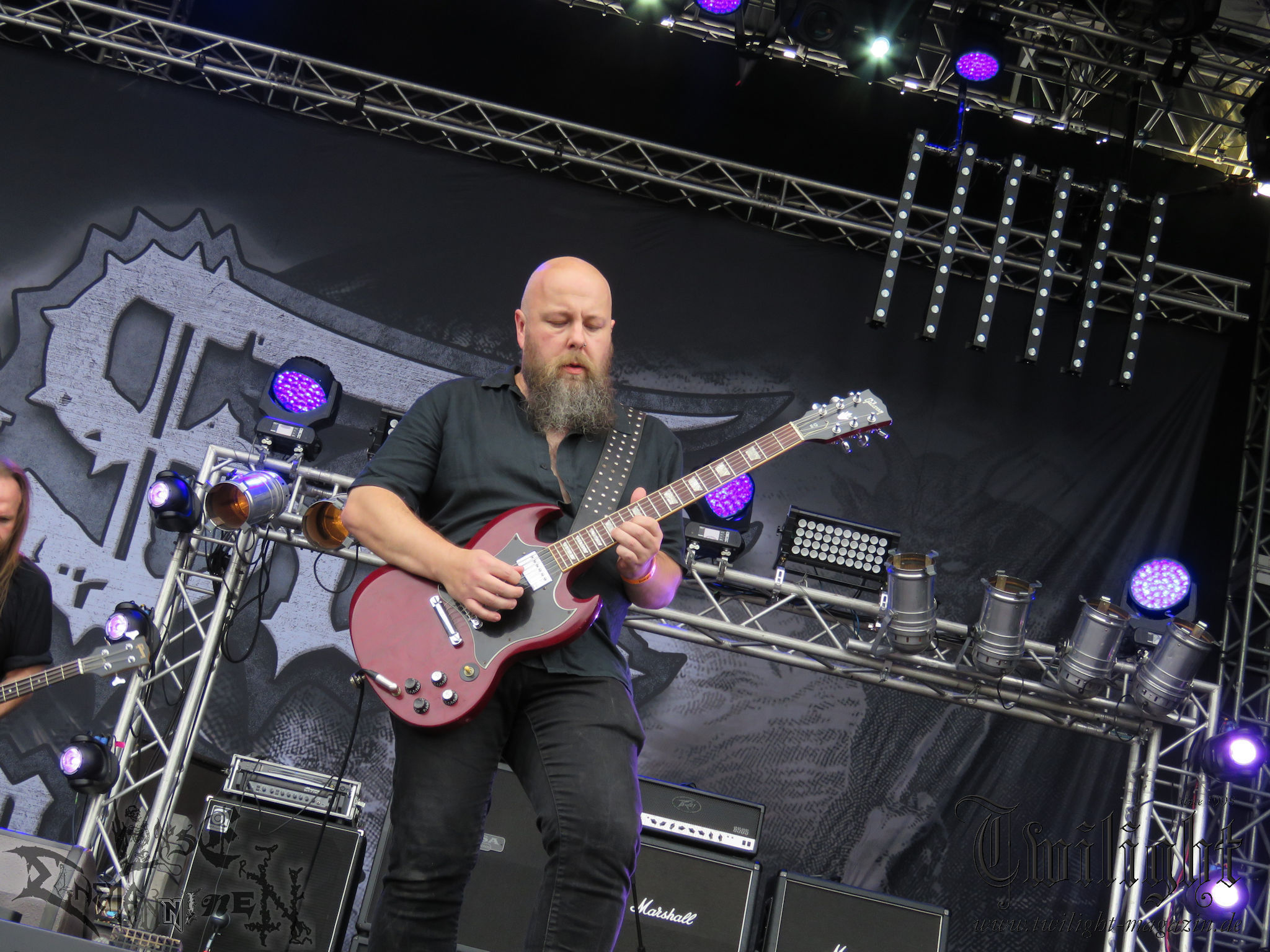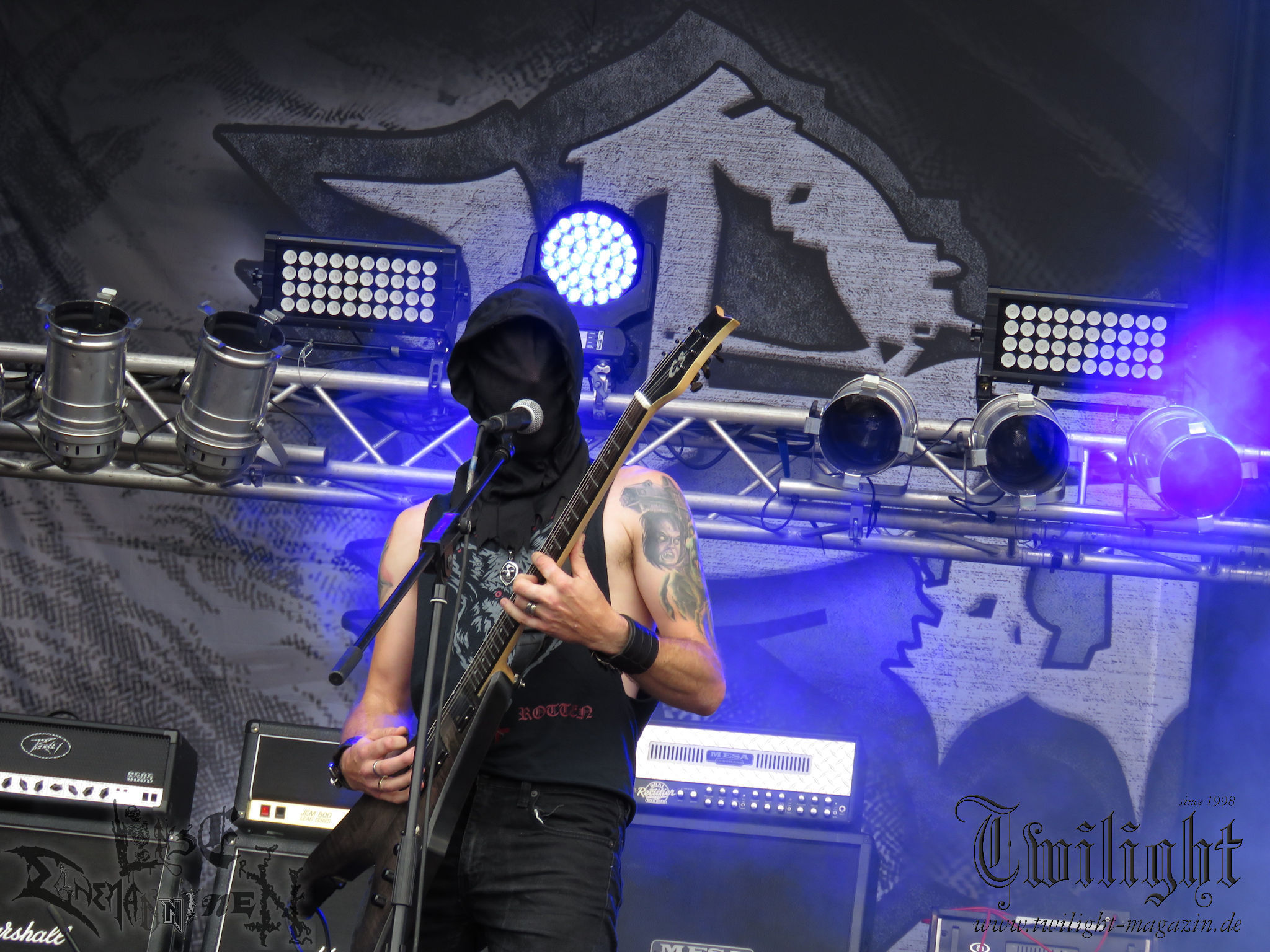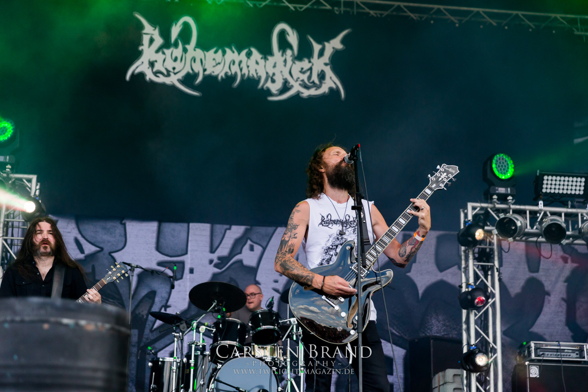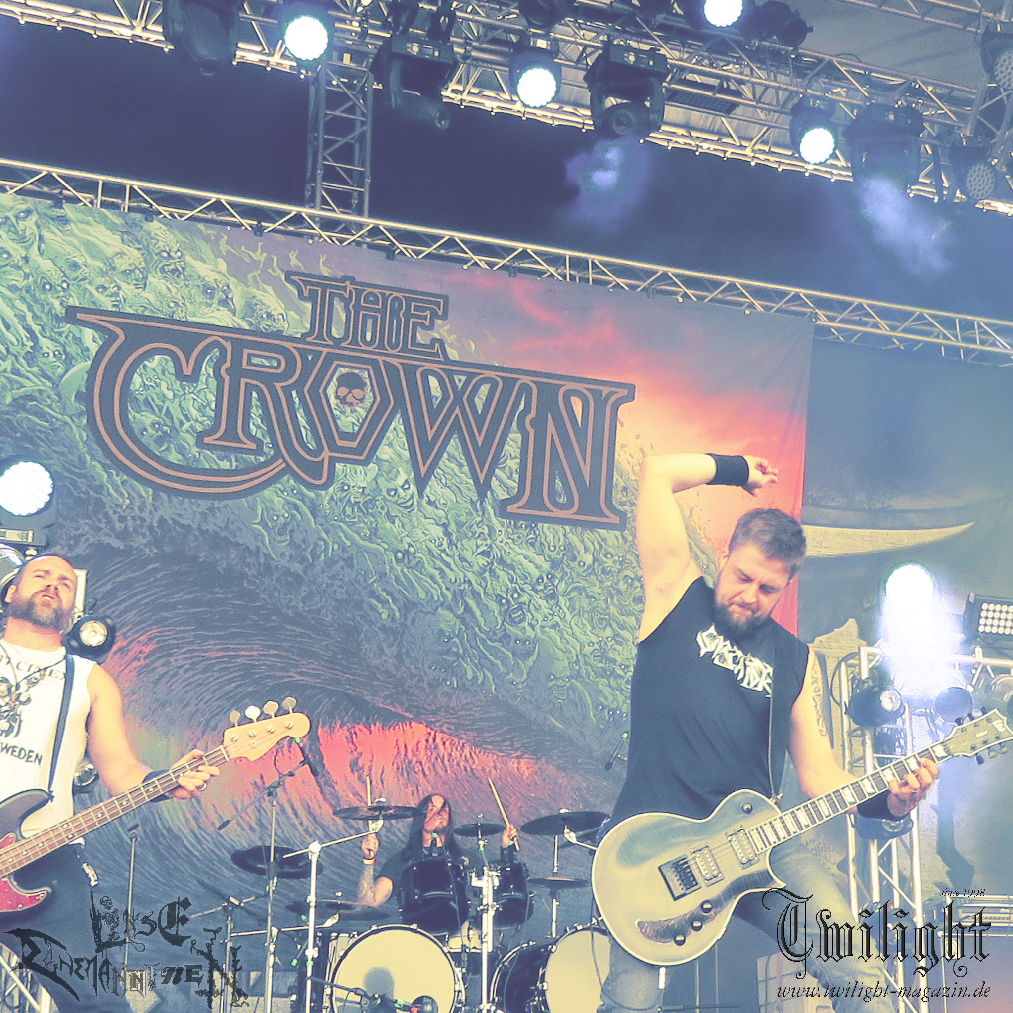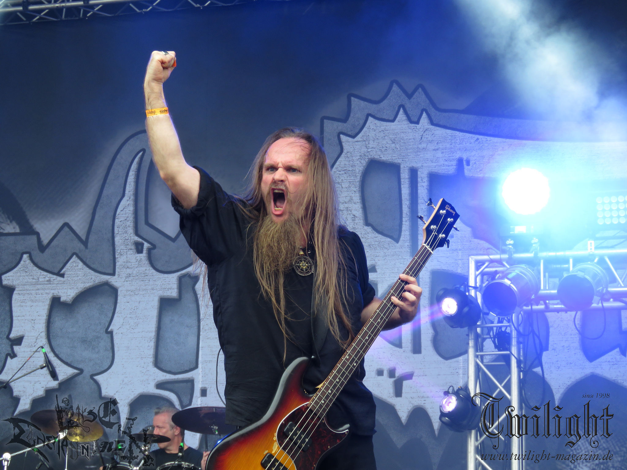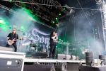 Weiter geht es mit den Schweden von RUNEMAGICK, die so gar nicht nach ihrer Heimatstadt Göteborg klingen. Niklas Rudolfsson hat seiner, einst als Sacramentum-Ableger gestarteten Formation, der erstmals in den späten Neunzigern von sich reden machte, vor zwei Jahren neues Leben eingehaucht. Das Quartett liefert ultra-brutalen, rohen und scheppernden Death-Doom, der sich ohne Rücksicht auf Verluste durch die Nackenmuskulatur in den Schädel fräst. Ohne dass ich die Band jemals intensiv verfolgt hätte, mit einer solch´ auf simpler Effizienz ausgelegten abgrundtief hässlichen Soundwalze lässt sich schonmal die Sonne verdunkeln. Ein beeindruckender Verweis auf den angekündigten Triumpfzug des Todes am späten Abend. (JD)