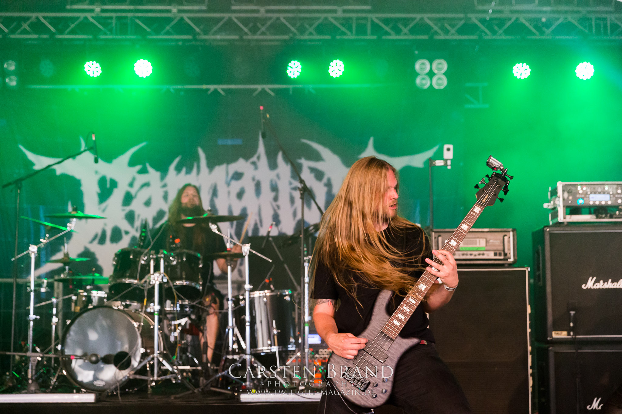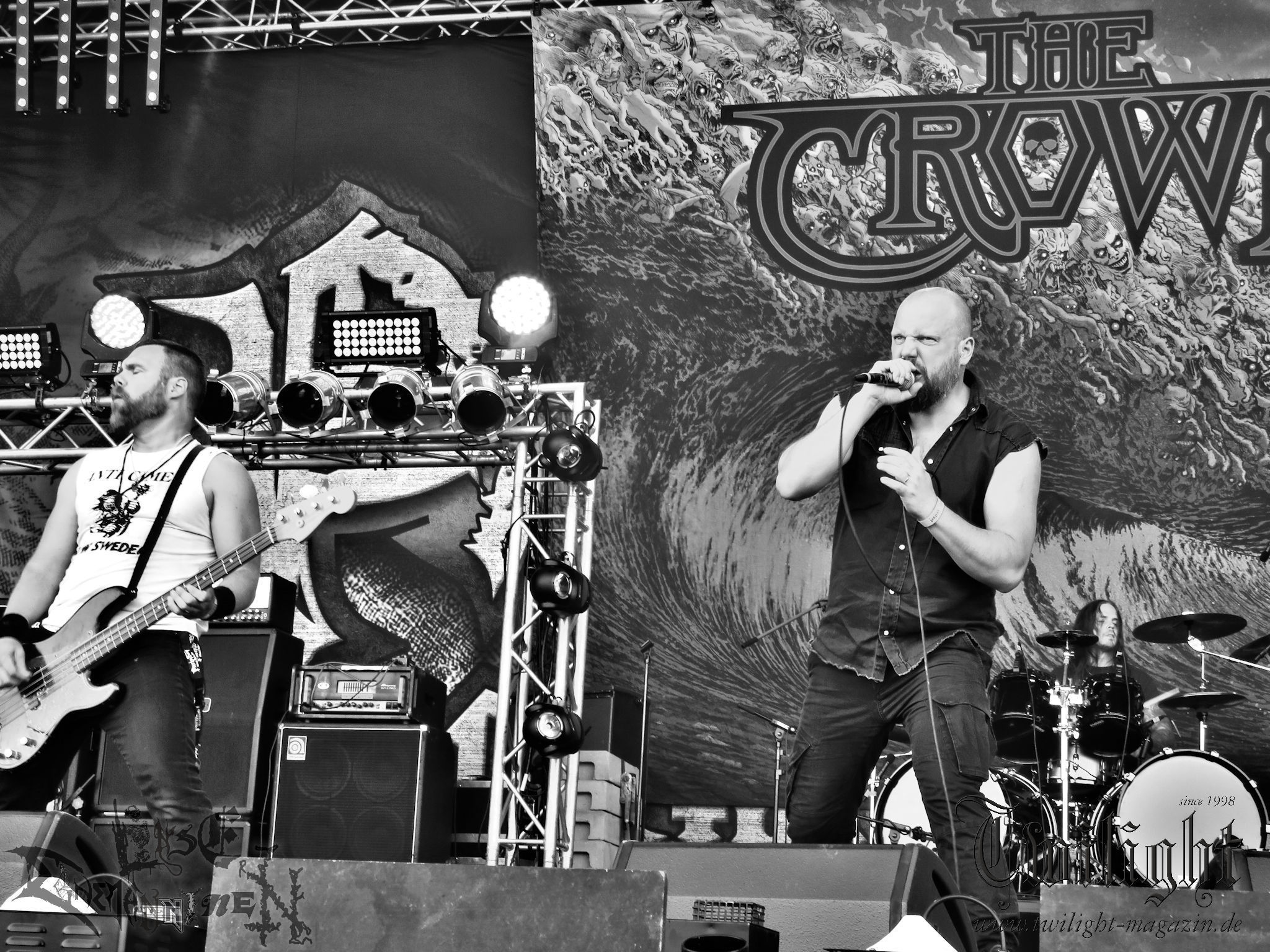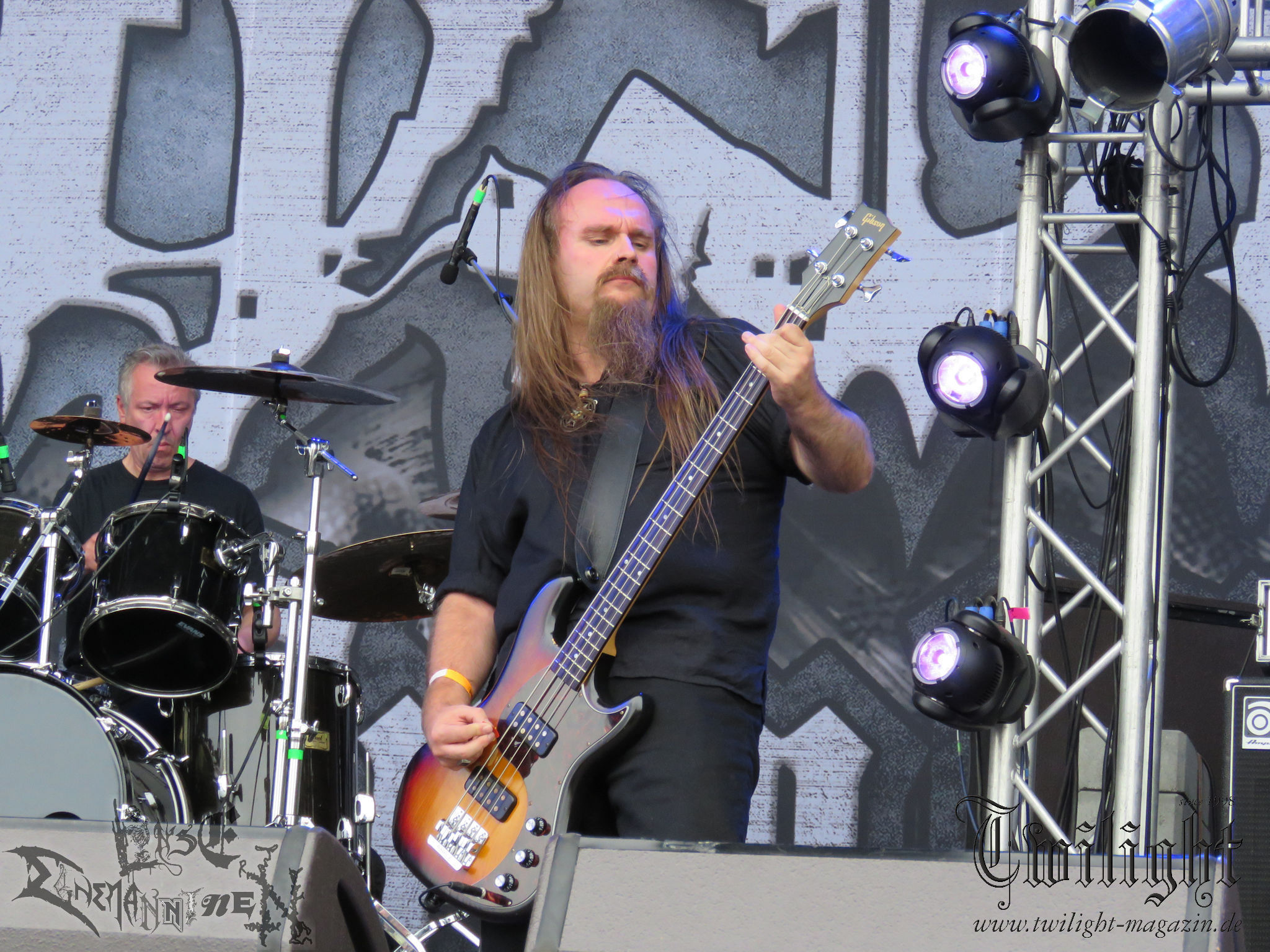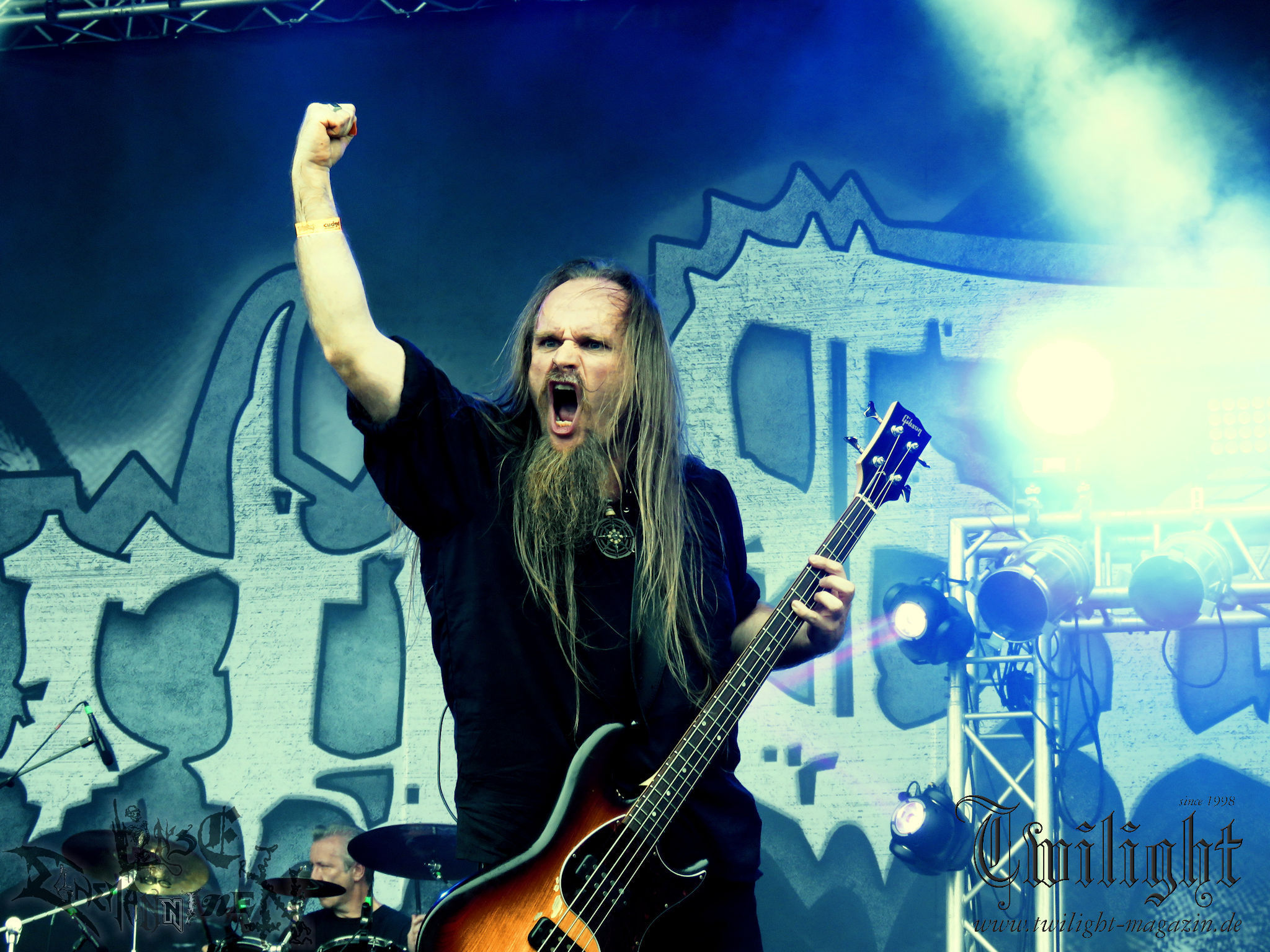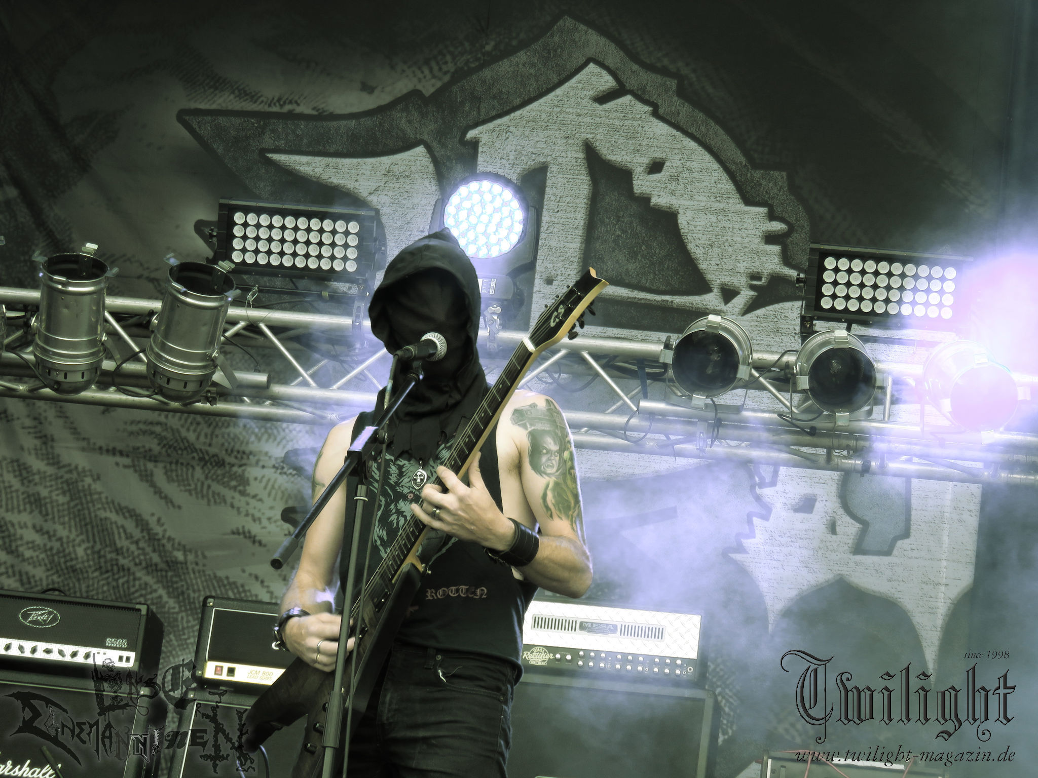 Weiter geht es mit den Schweden von RUNEMAGICK, die so gar nicht nach ihrer Heimatstadt Göteborg klingen. Niklas Rudolfsson hat seiner, einst als Sacramentum-Ableger gestarteten Formation, der erstmals in den späten Neunzigern von sich reden machte, vor zwei Jahren neues Leben eingehaucht. Das Quartett liefert ultra-brutalen, rohen und scheppernden Death-Doom, der sich ohne Rücksicht auf Verluste durch die Nackenmuskulatur in den Schädel fräst. Ohne dass ich die Band jemals intensiv verfolgt hätte, mit einer solch´ auf simpler Effizienz ausgelegten abgrundtief hässlichen Soundwalze lässt sich schonmal die Sonne verdunkeln. Ein beeindruckender Verweis auf den angekündigten Triumpfzug des Todes am späten Abend. (JD)