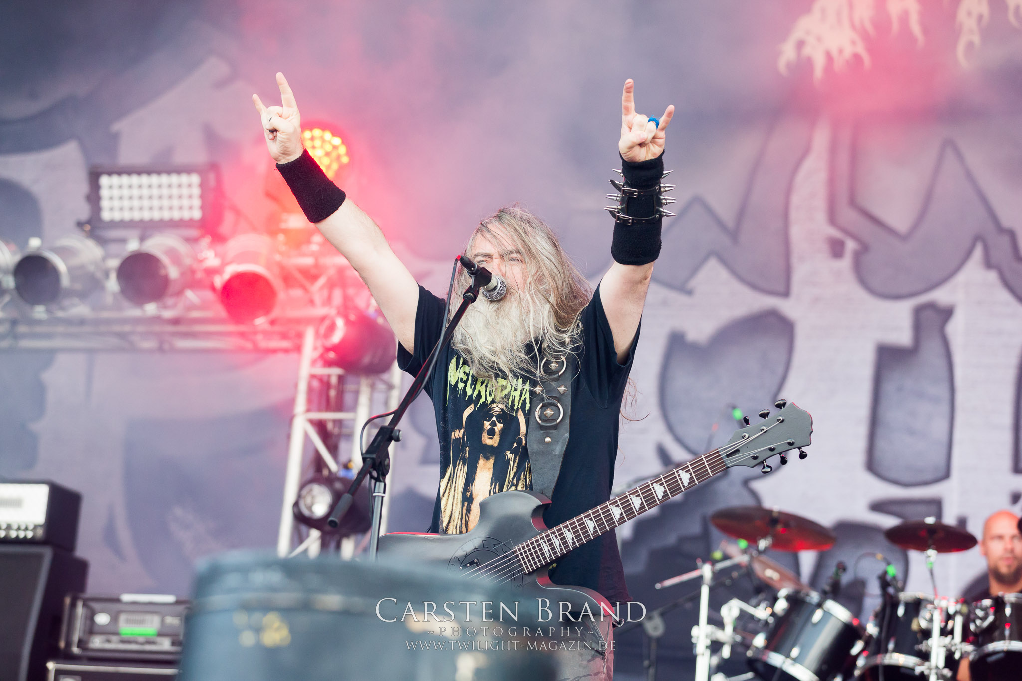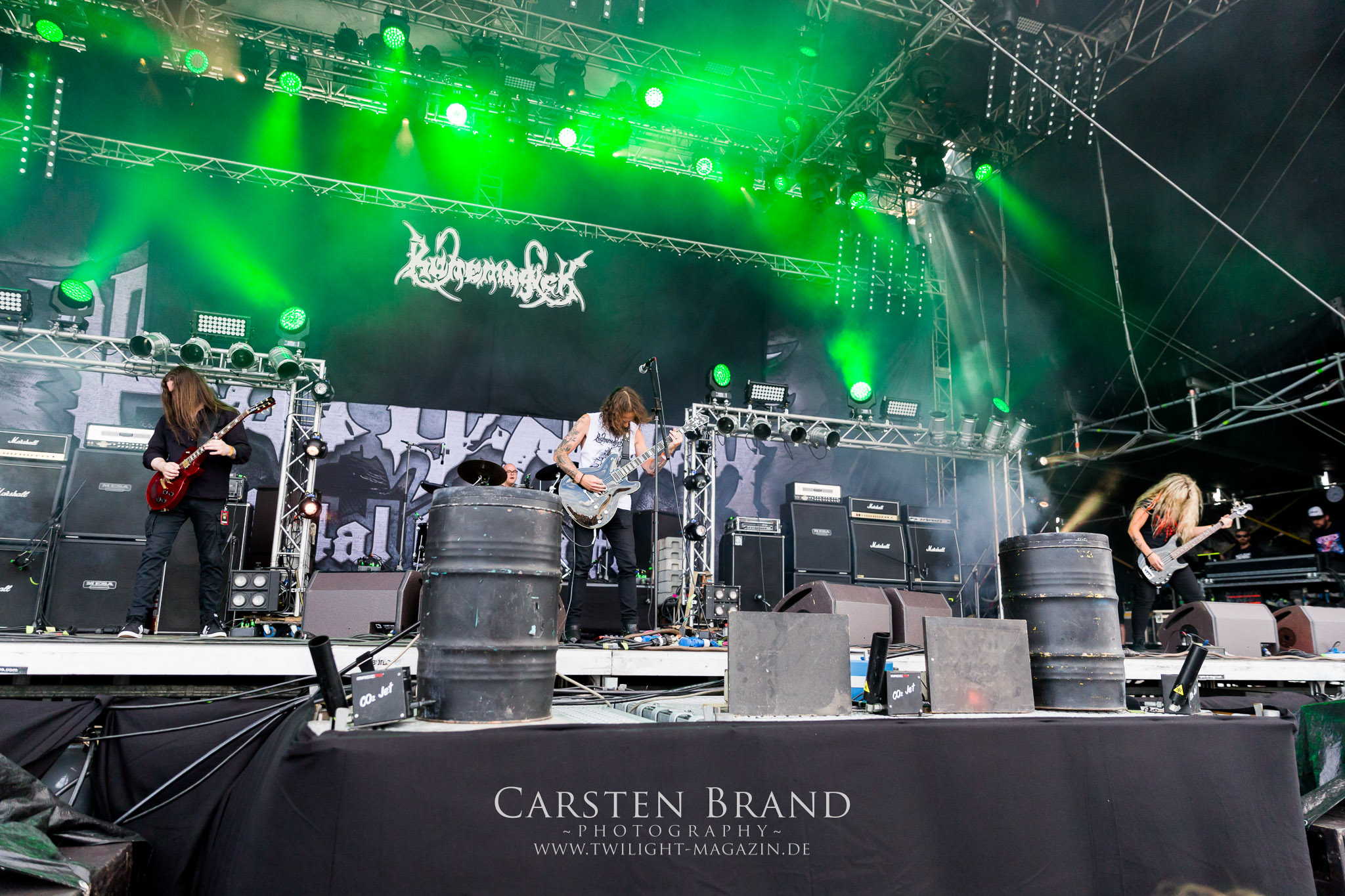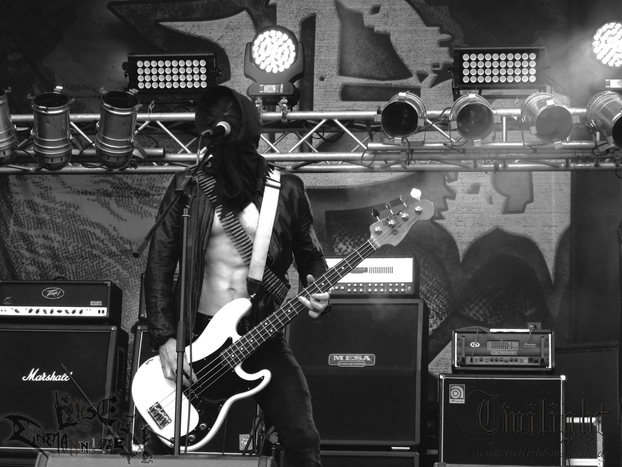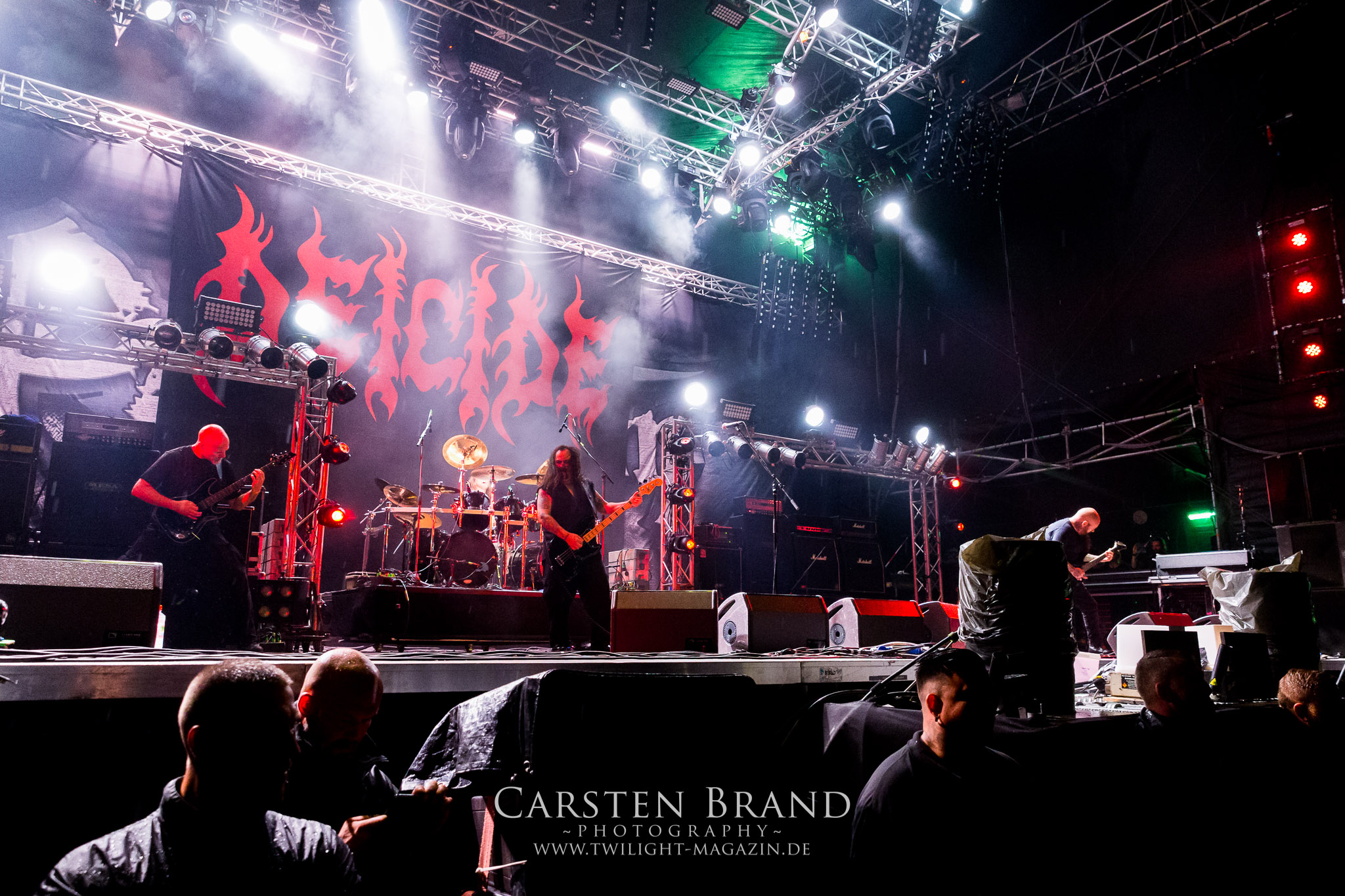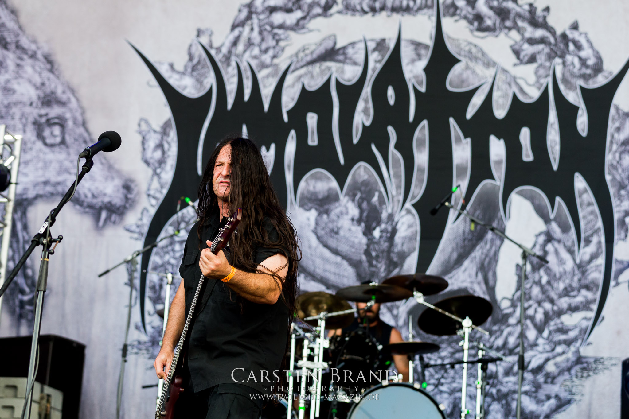 Weiter geht es mit den Schweden von RUNEMAGICK, die so gar nicht nach ihrer Heimatstadt Göteborg klingen. Niklas Rudolfsson hat seiner, einst als Sacramentum-Ableger gestarteten Formation, der erstmals in den späten Neunzigern von sich reden machte, vor zwei Jahren neues Leben eingehaucht. Das Quartett liefert ultra-brutalen, rohen und scheppernden Death-Doom, der sich ohne Rücksicht auf Verluste durch die Nackenmuskulatur in den Schädel fräst. Ohne dass ich die Band jemals intensiv verfolgt hätte, mit einer solch´ auf simpler Effizienz ausgelegten abgrundtief hässlichen Soundwalze lässt sich schonmal die Sonne verdunkeln. Ein beeindruckender Verweis auf den angekündigten Triumpfzug des Todes am späten Abend. (JD)