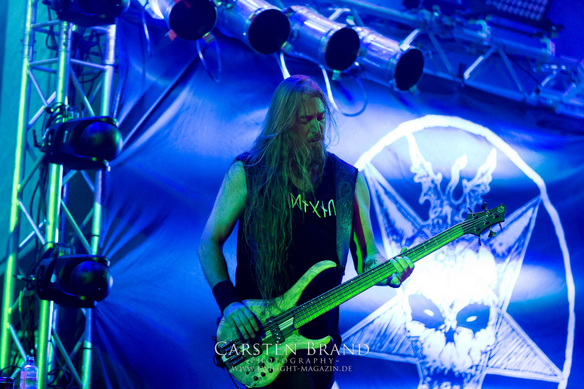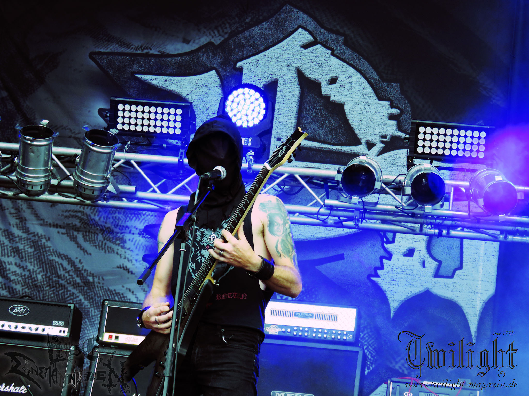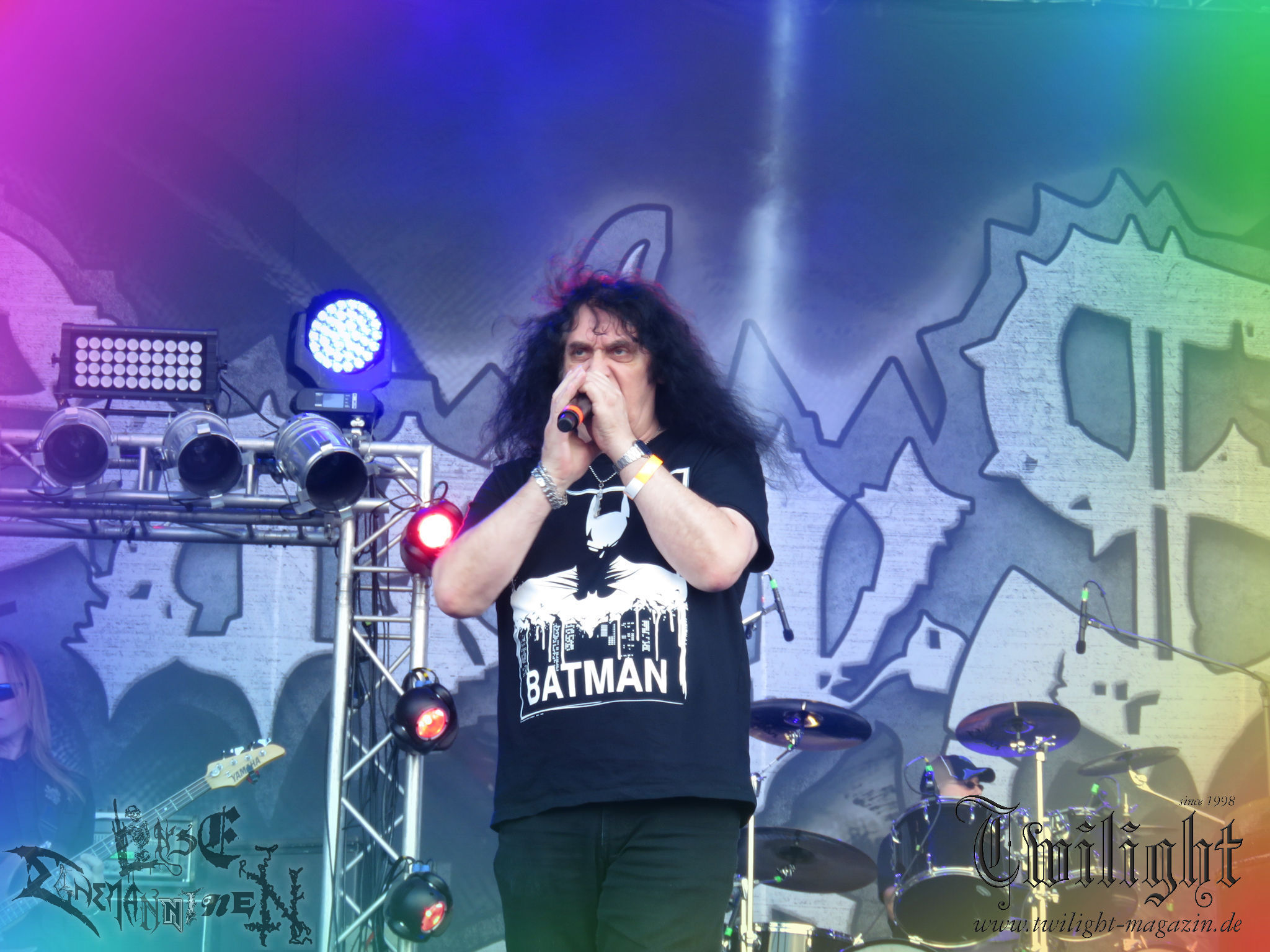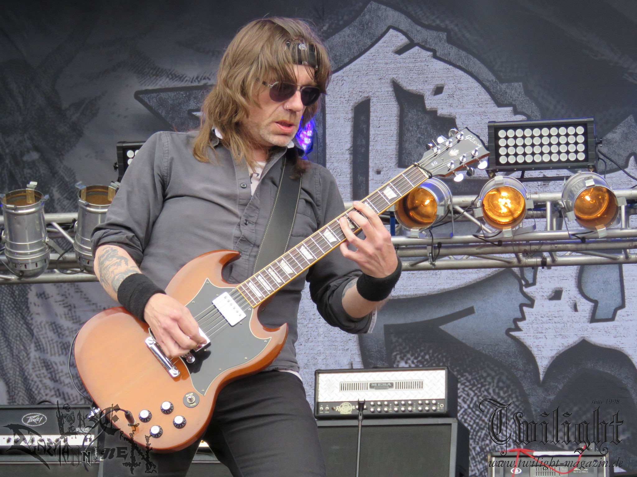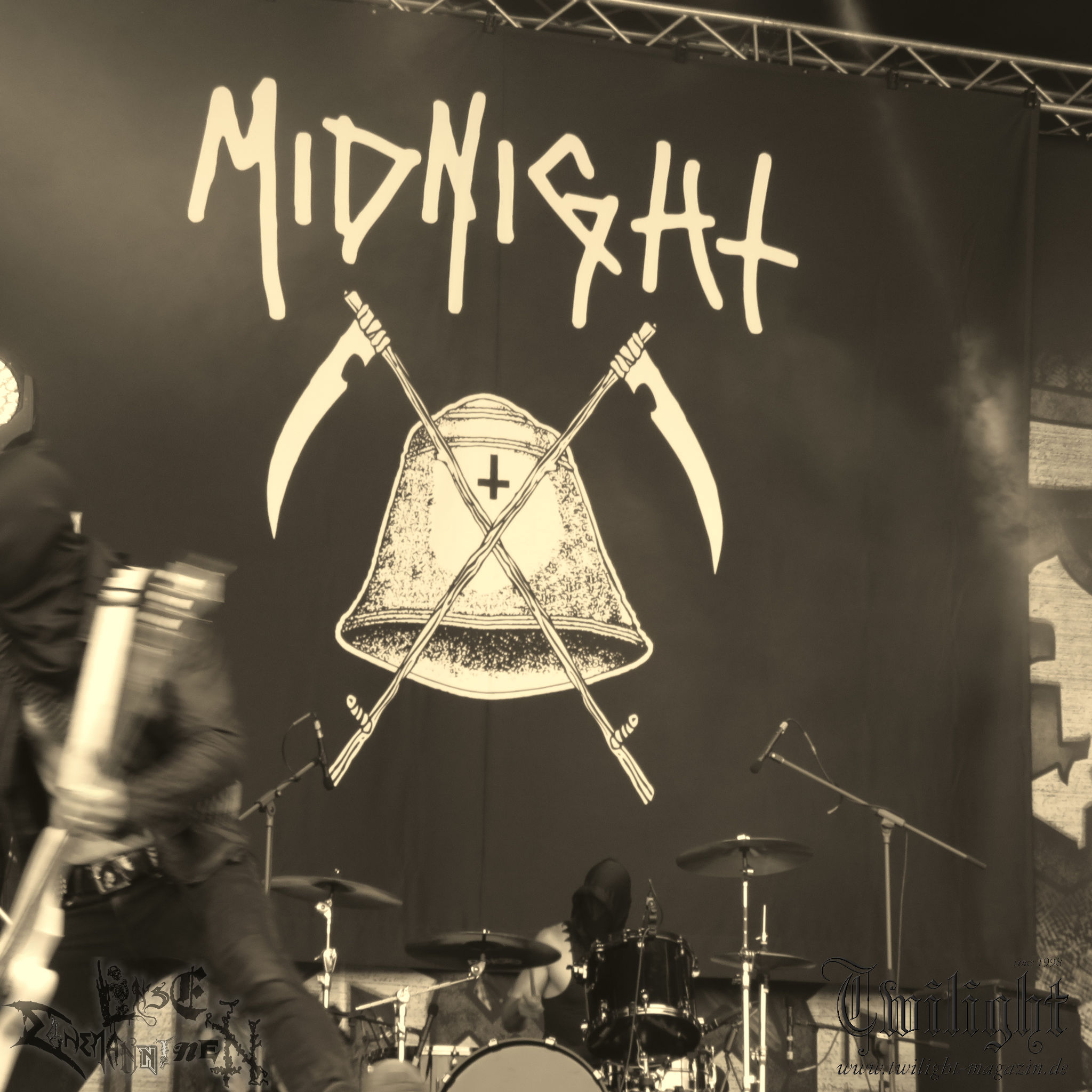 Weiter geht es mit den Schweden von RUNEMAGICK, die so gar nicht nach ihrer Heimatstadt Göteborg klingen. Niklas Rudolfsson hat seiner, einst als Sacramentum-Ableger gestarteten Formation, der erstmals in den späten Neunzigern von sich reden machte, vor zwei Jahren neues Leben eingehaucht. Das Quartett liefert ultra-brutalen, rohen und scheppernden Death-Doom, der sich ohne Rücksicht auf Verluste durch die Nackenmuskulatur in den Schädel fräst. Ohne dass ich die Band jemals intensiv verfolgt hätte, mit einer solch´ auf simpler Effizienz ausgelegten abgrundtief hässlichen Soundwalze lässt sich schonmal die Sonne verdunkeln. Ein beeindruckender Verweis auf den angekündigten Triumpfzug des Todes am späten Abend. (JD)