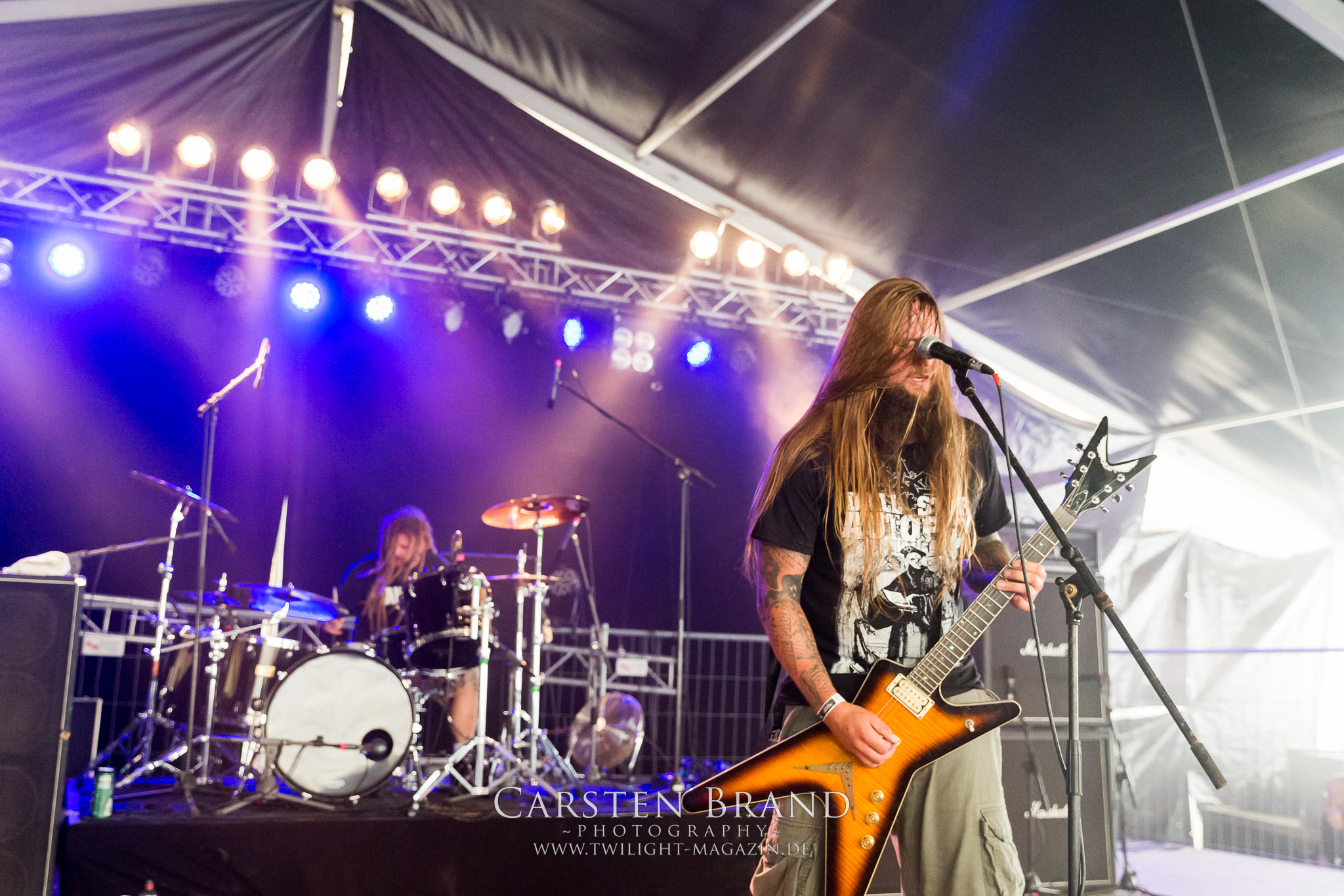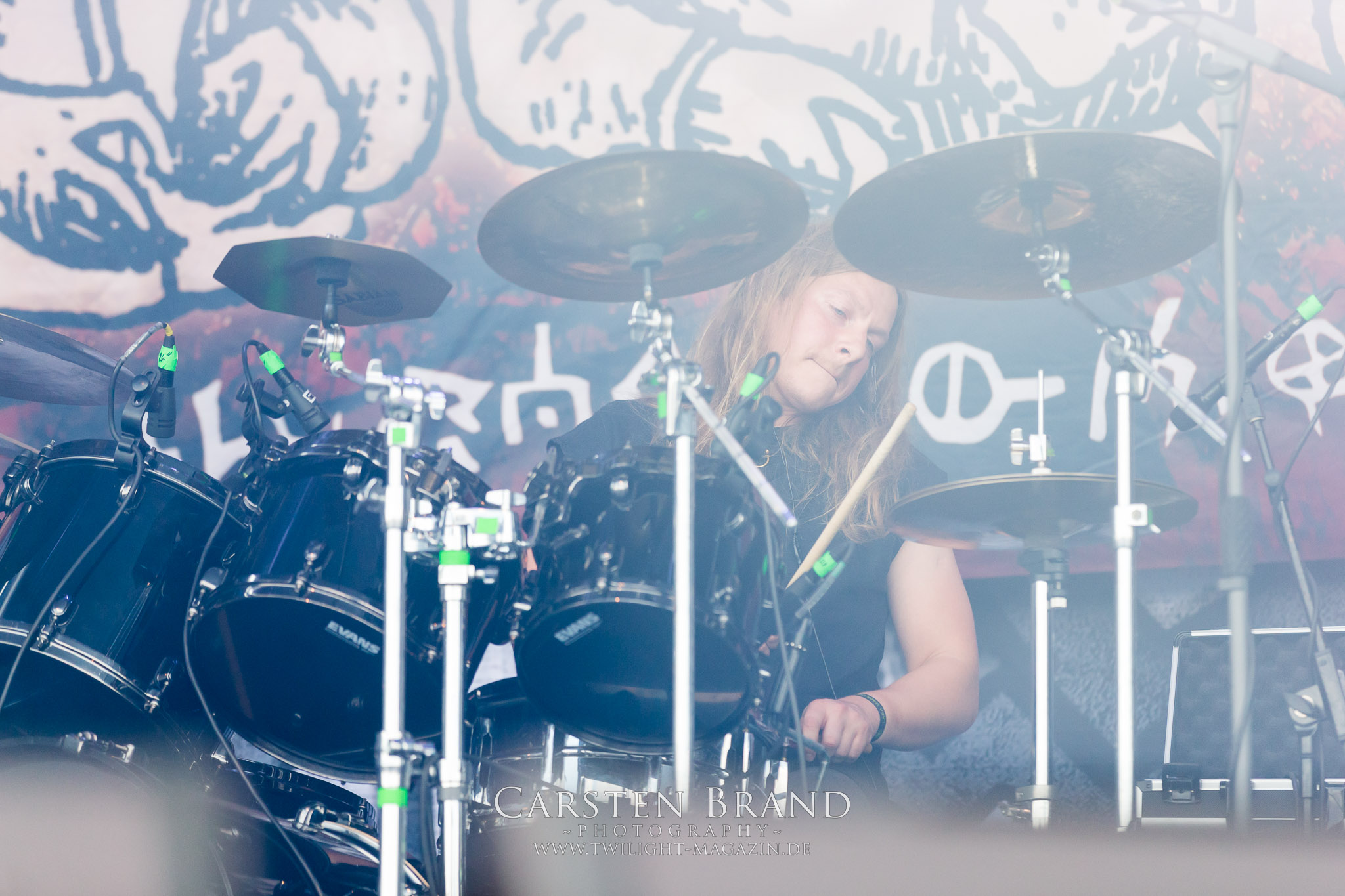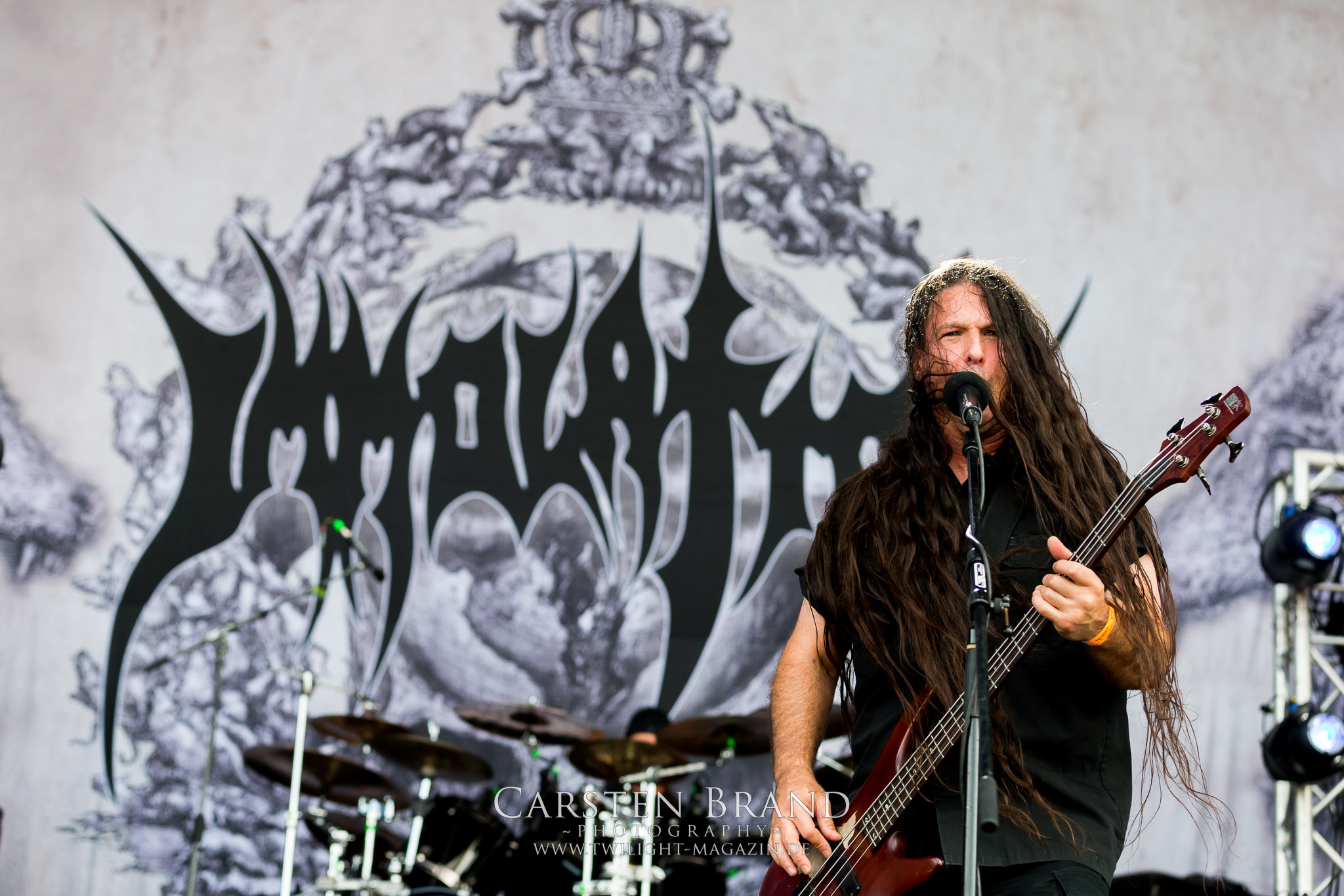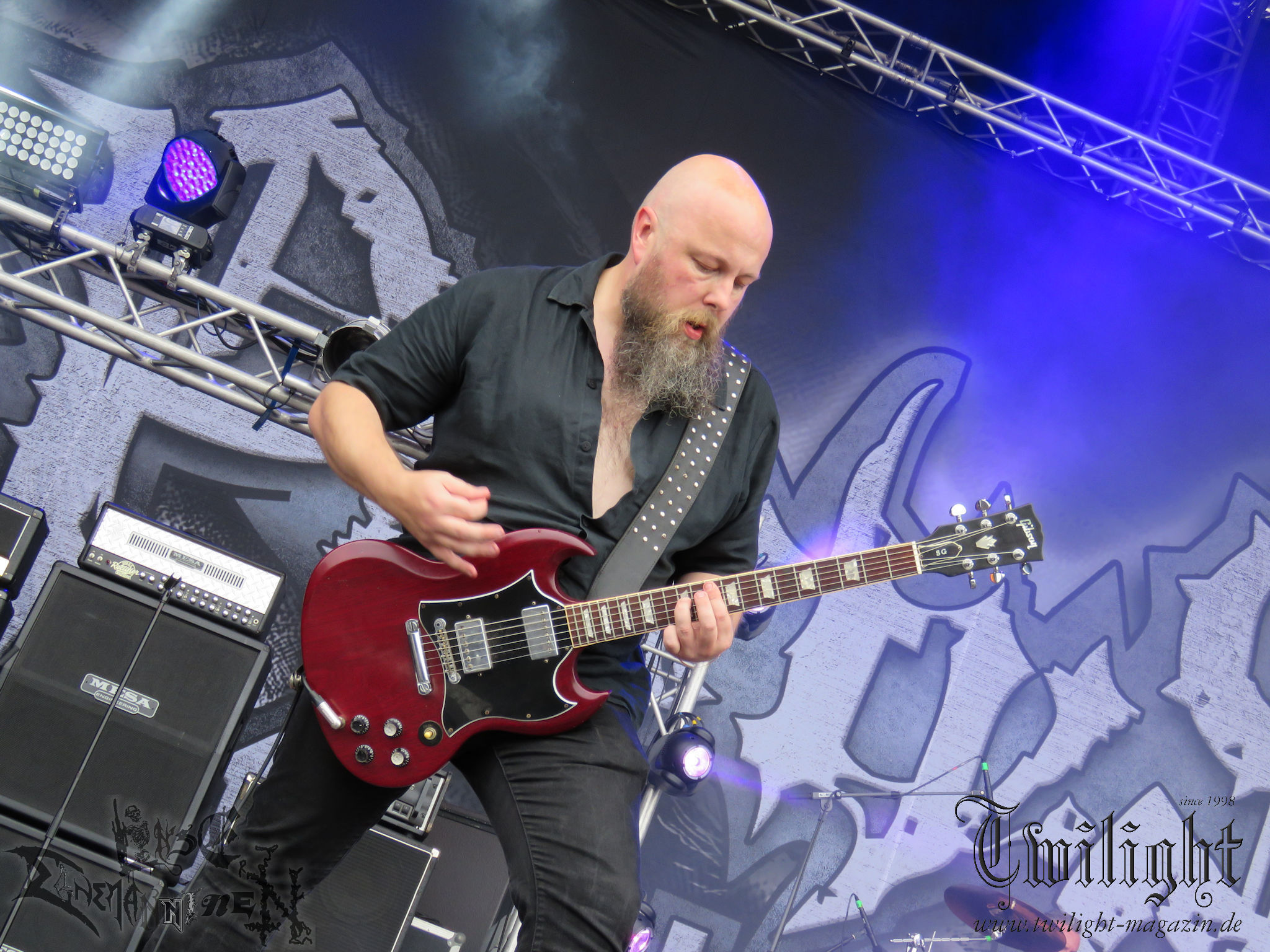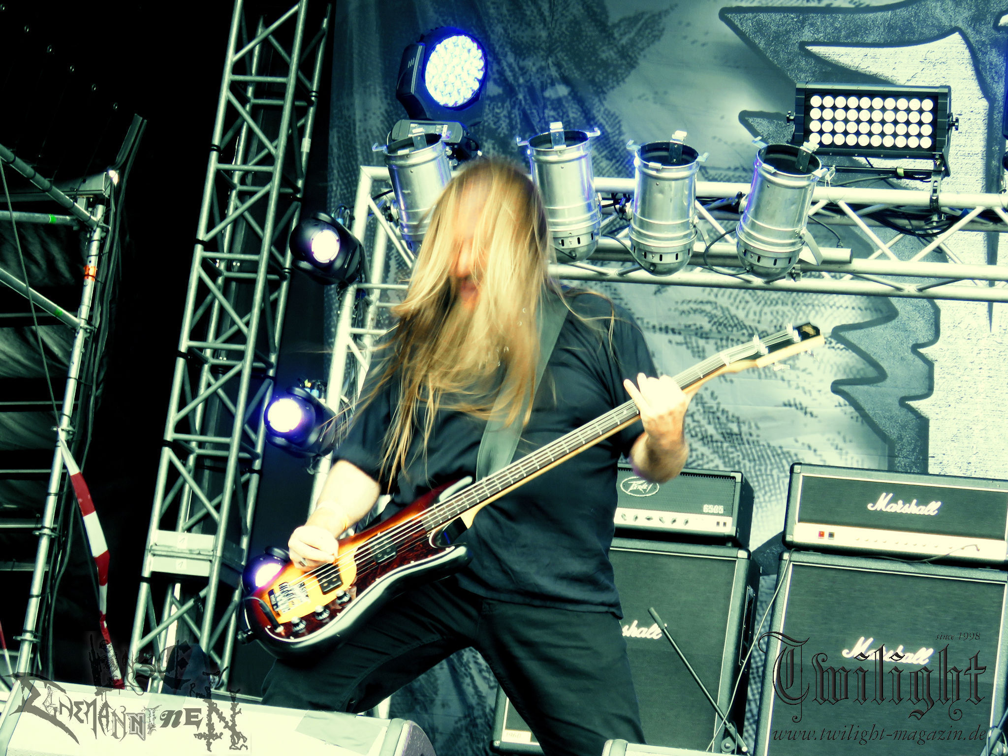 Weiter geht es mit den Schweden von RUNEMAGICK, die so gar nicht nach ihrer Heimatstadt Göteborg klingen. Niklas Rudolfsson hat seiner, einst als Sacramentum-Ableger gestarteten Formation, der erstmals in den späten Neunzigern von sich reden machte, vor zwei Jahren neues Leben eingehaucht. Das Quartett liefert ultra-brutalen, rohen und scheppernden Death-Doom, der sich ohne Rücksicht auf Verluste durch die Nackenmuskulatur in den Schädel fräst. Ohne dass ich die Band jemals intensiv verfolgt hätte, mit einer solch´ auf simpler Effizienz ausgelegten abgrundtief hässlichen Soundwalze lässt sich schonmal die Sonne verdunkeln. Ein beeindruckender Verweis auf den angekündigten Triumpfzug des Todes am späten Abend. (JD)