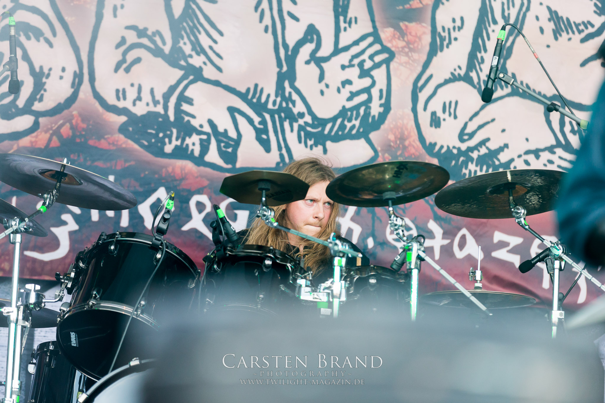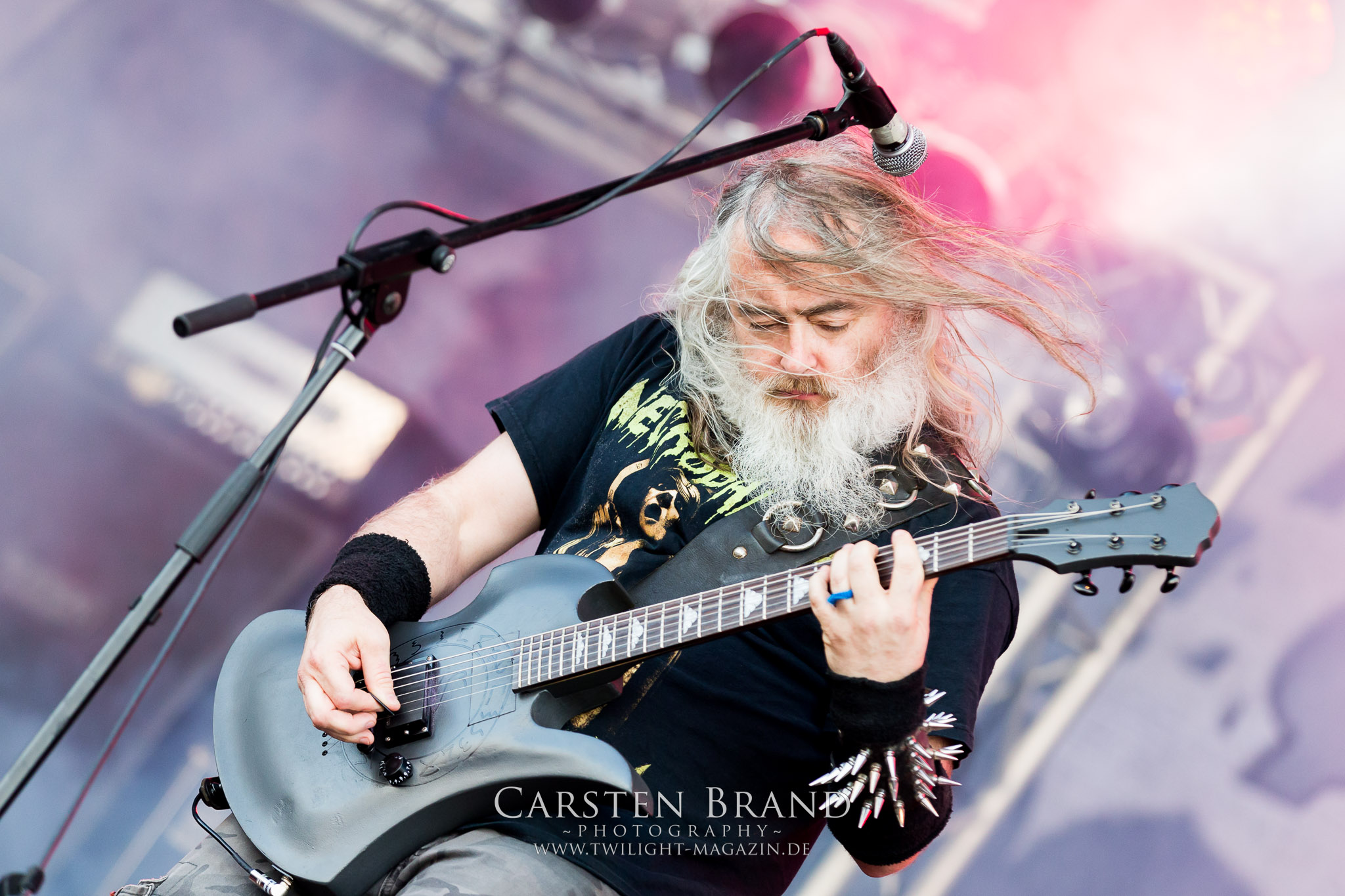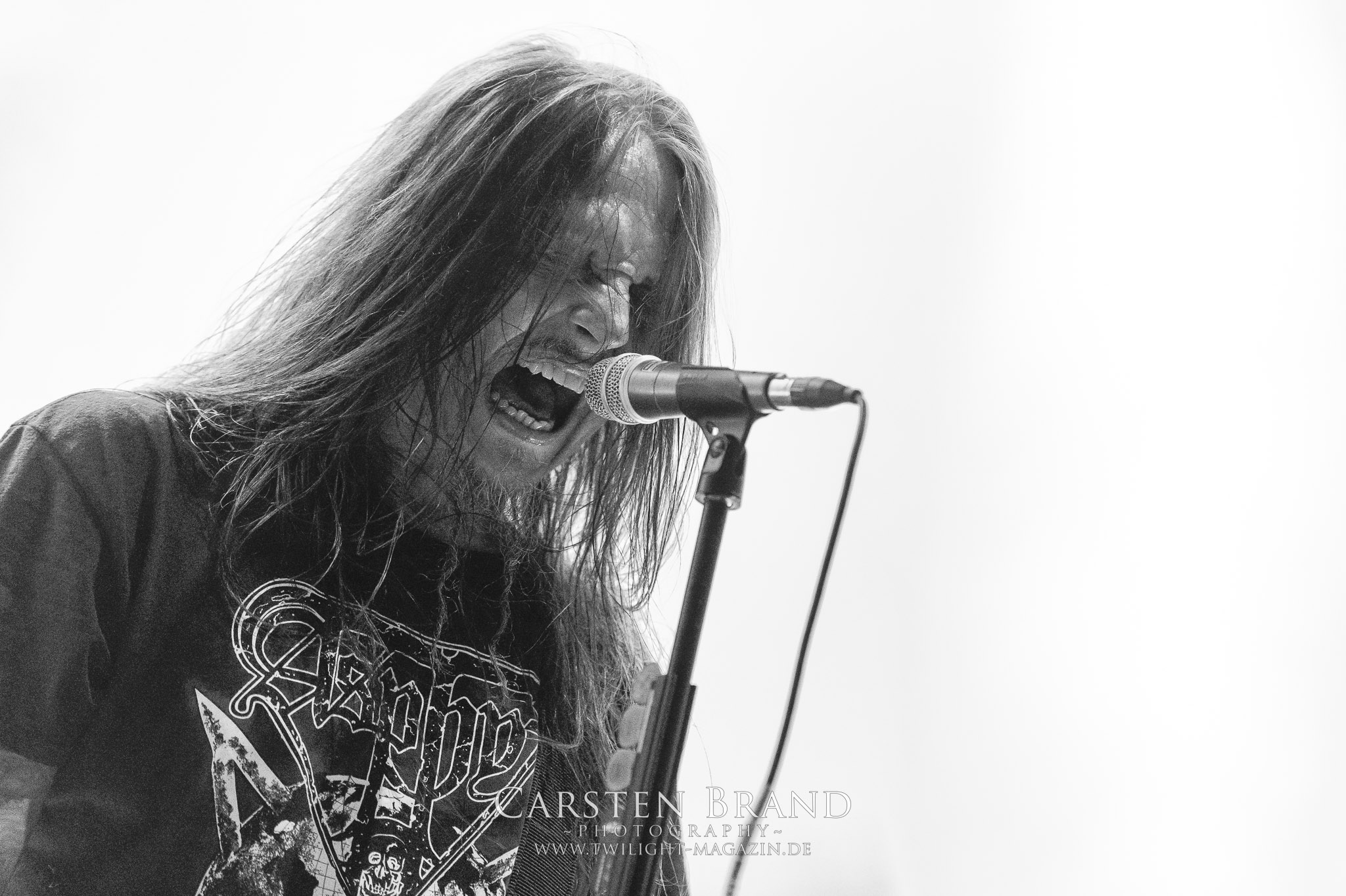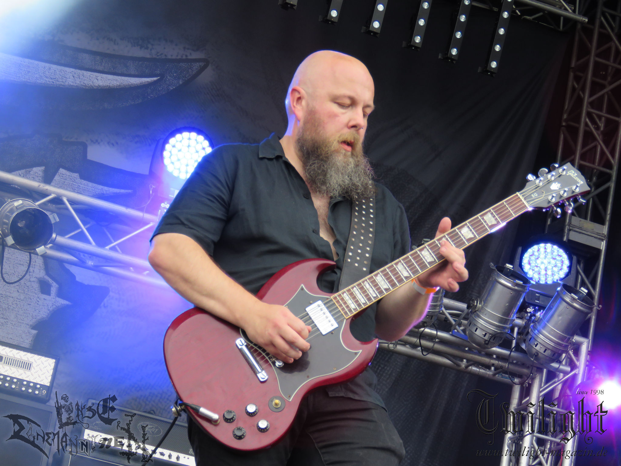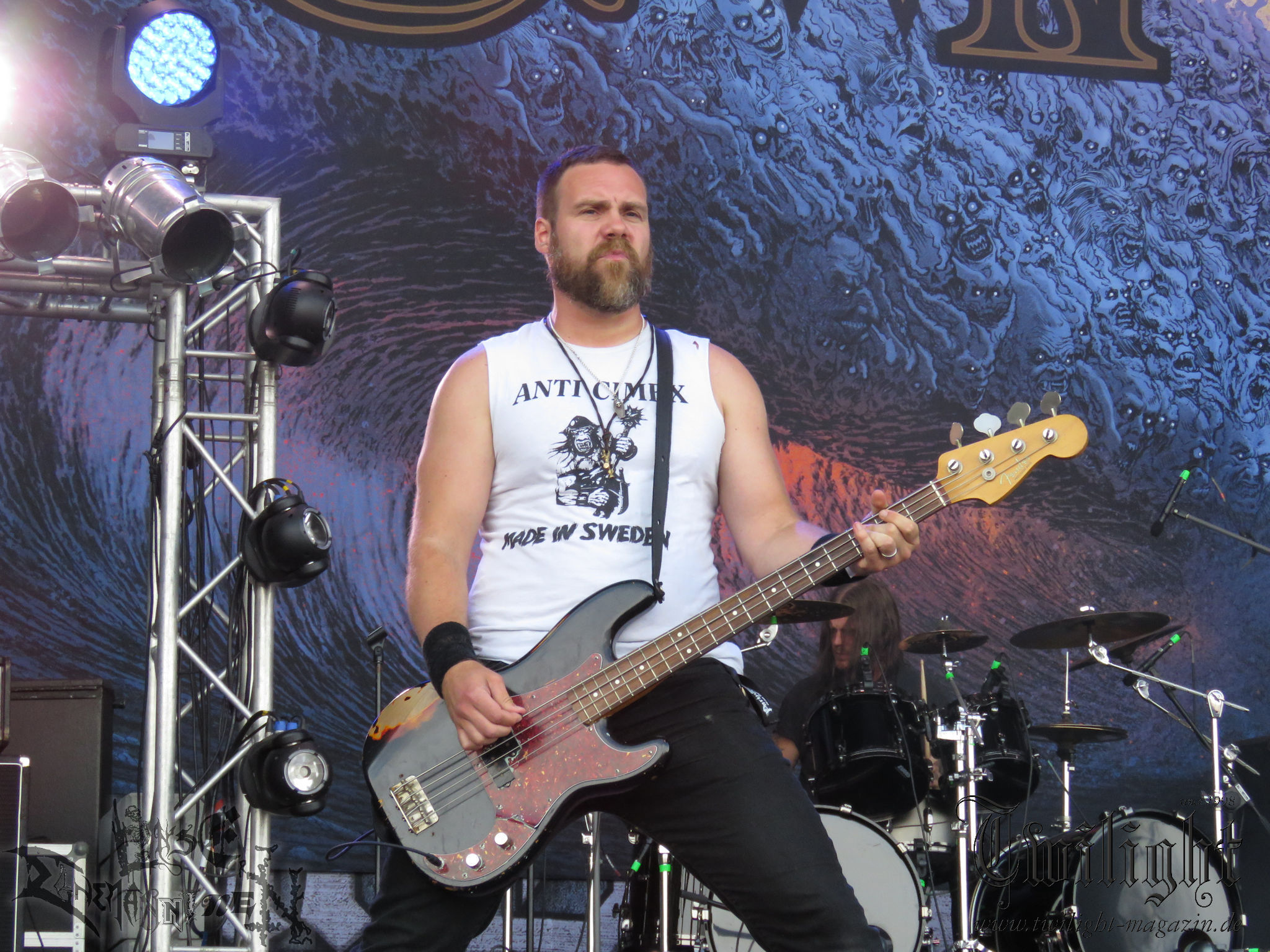 Weiter geht es mit den Schweden von RUNEMAGICK, die so gar nicht nach ihrer Heimatstadt Göteborg klingen. Niklas Rudolfsson hat seiner, einst als Sacramentum-Ableger gestarteten Formation, der erstmals in den späten Neunzigern von sich reden machte, vor zwei Jahren neues Leben eingehaucht. Das Quartett liefert ultra-brutalen, rohen und scheppernden Death-Doom, der sich ohne Rücksicht auf Verluste durch die Nackenmuskulatur in den Schädel fräst. Ohne dass ich die Band jemals intensiv verfolgt hätte, mit einer solch´ auf simpler Effizienz ausgelegten abgrundtief hässlichen Soundwalze lässt sich schonmal die Sonne verdunkeln. Ein beeindruckender Verweis auf den angekündigten Triumpfzug des Todes am späten Abend. (JD)