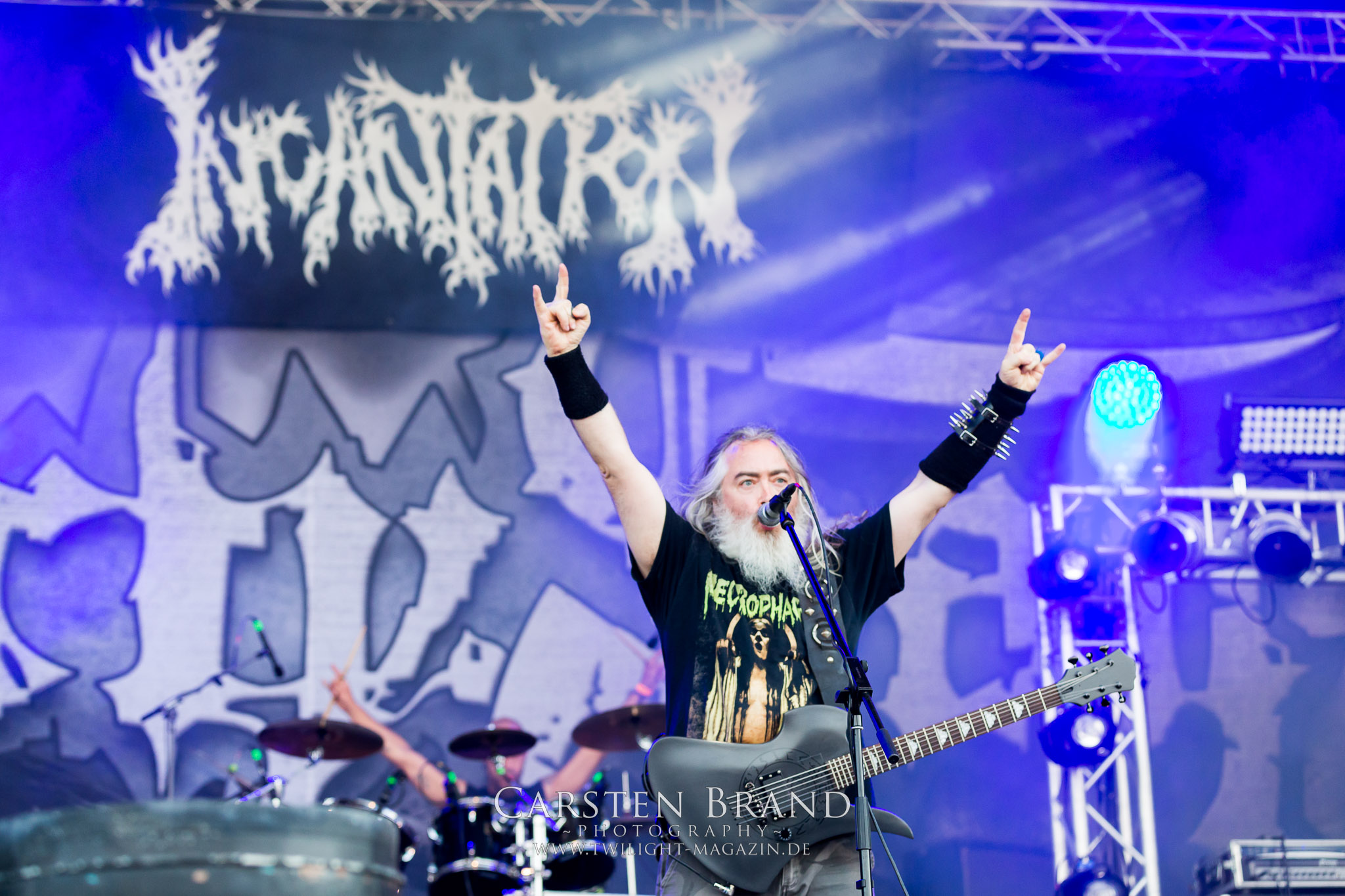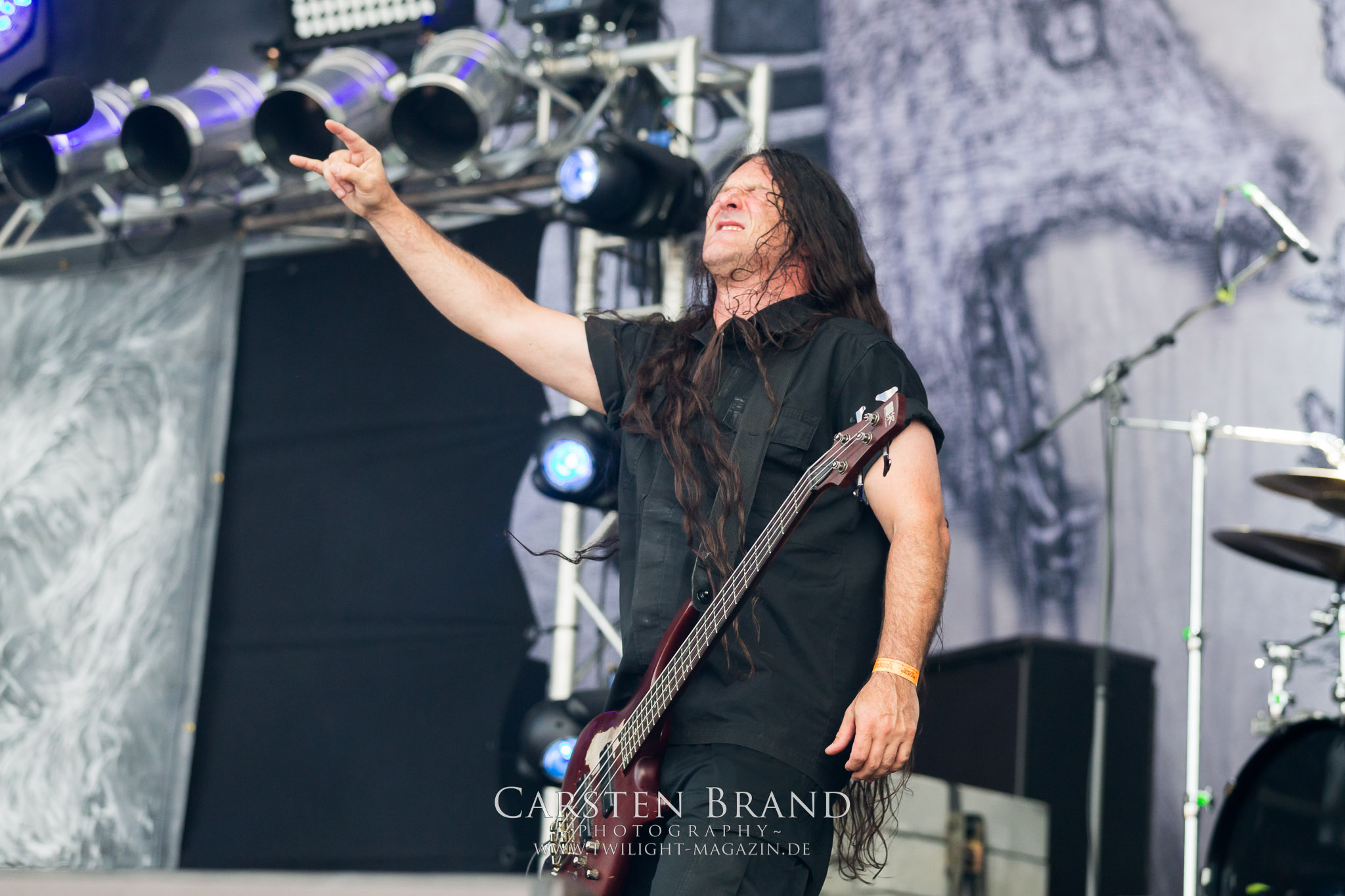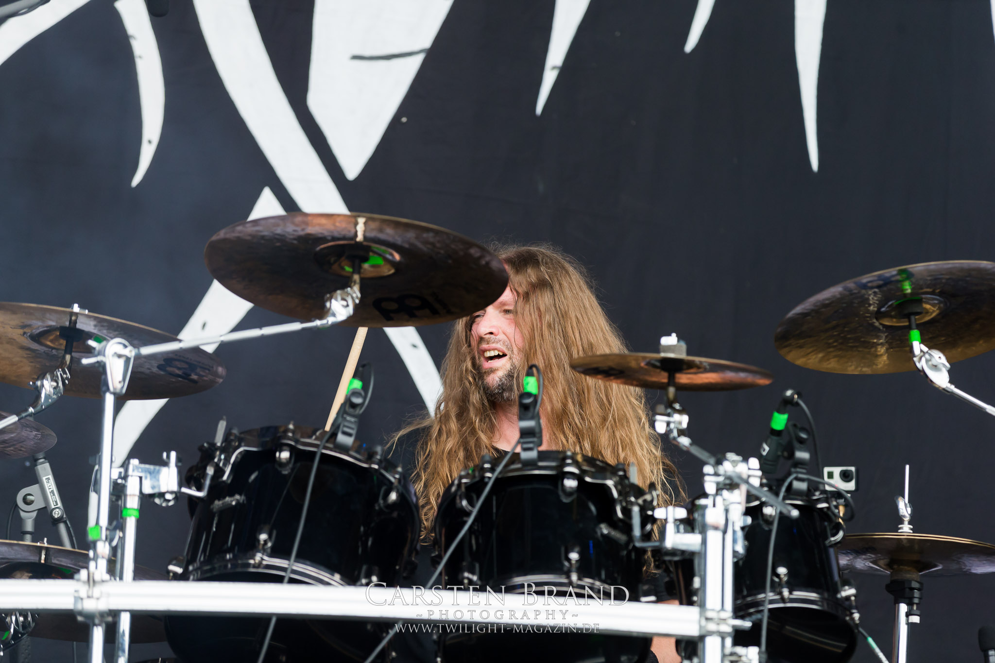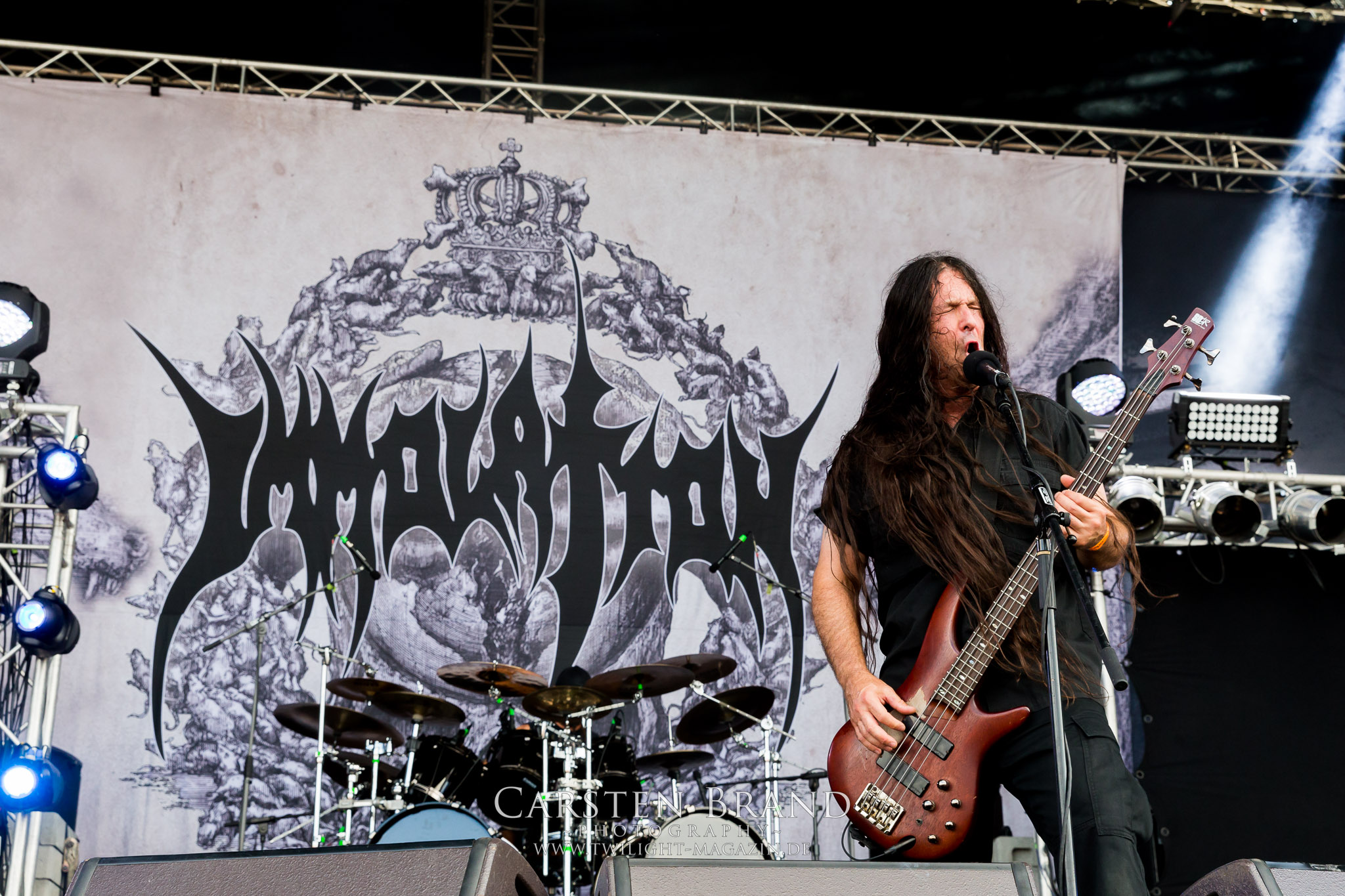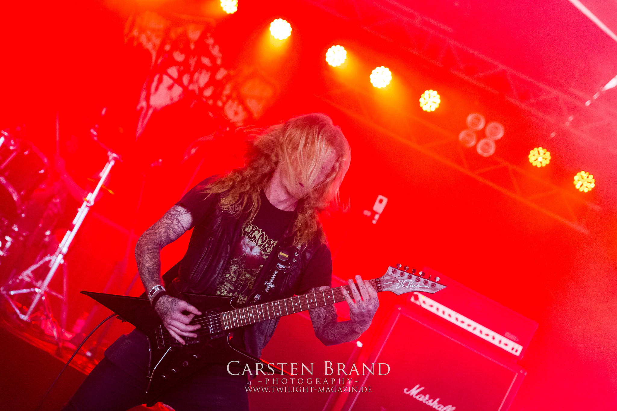 Weiter geht es mit den Schweden von RUNEMAGICK, die so gar nicht nach ihrer Heimatstadt Göteborg klingen. Niklas Rudolfsson hat seiner, einst als Sacramentum-Ableger gestarteten Formation, der erstmals in den späten Neunzigern von sich reden machte, vor zwei Jahren neues Leben eingehaucht. Das Quartett liefert ultra-brutalen, rohen und scheppernden Death-Doom, der sich ohne Rücksicht auf Verluste durch die Nackenmuskulatur in den Schädel fräst. Ohne dass ich die Band jemals intensiv verfolgt hätte, mit einer solch´ auf simpler Effizienz ausgelegten abgrundtief hässlichen Soundwalze lässt sich schonmal die Sonne verdunkeln. Ein beeindruckender Verweis auf den angekündigten Triumpfzug des Todes am späten Abend. (JD)