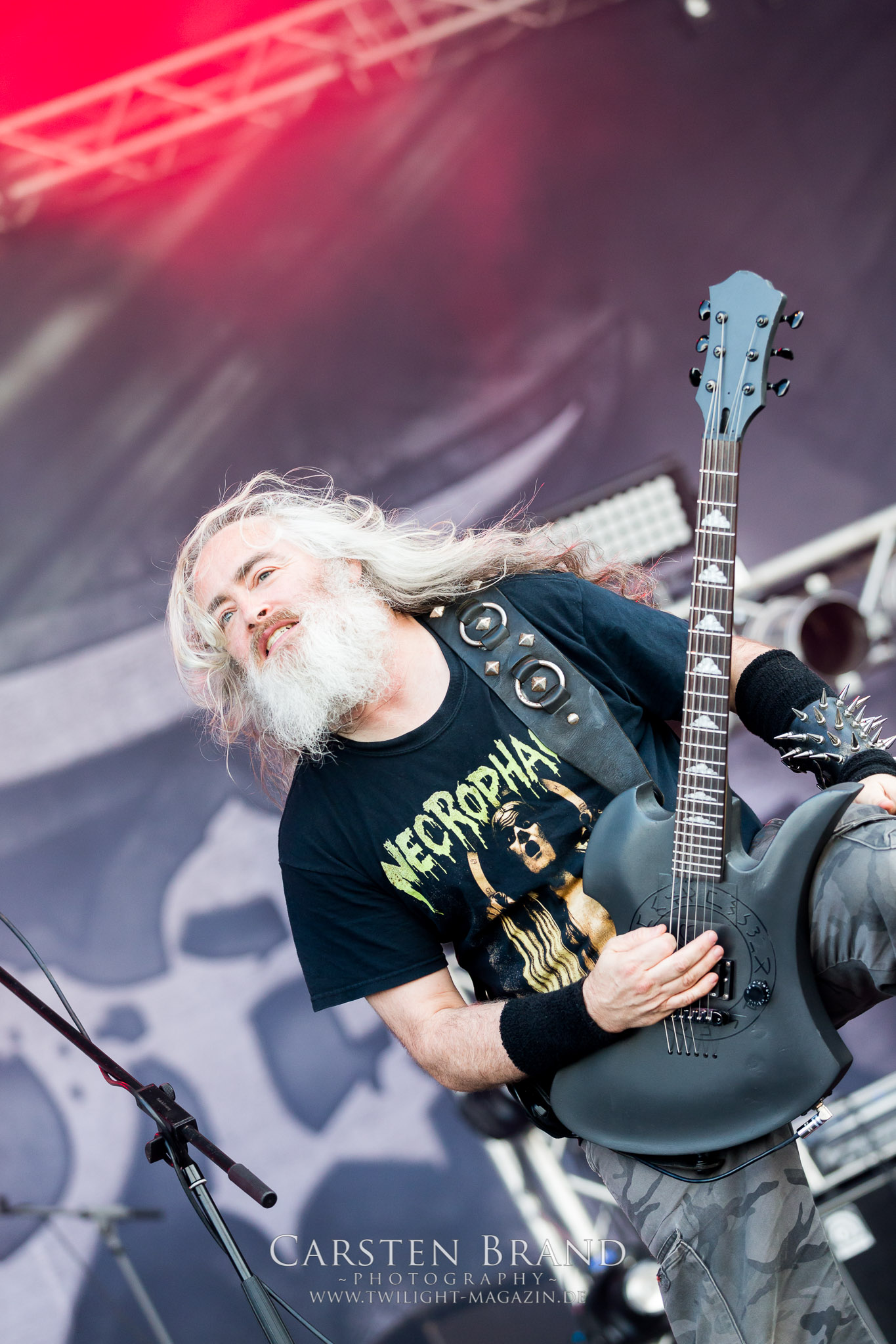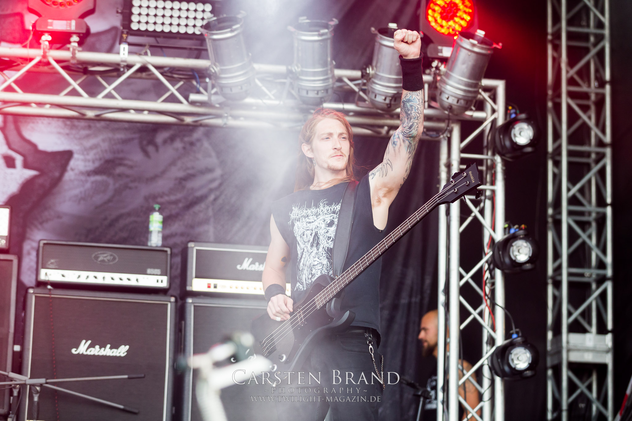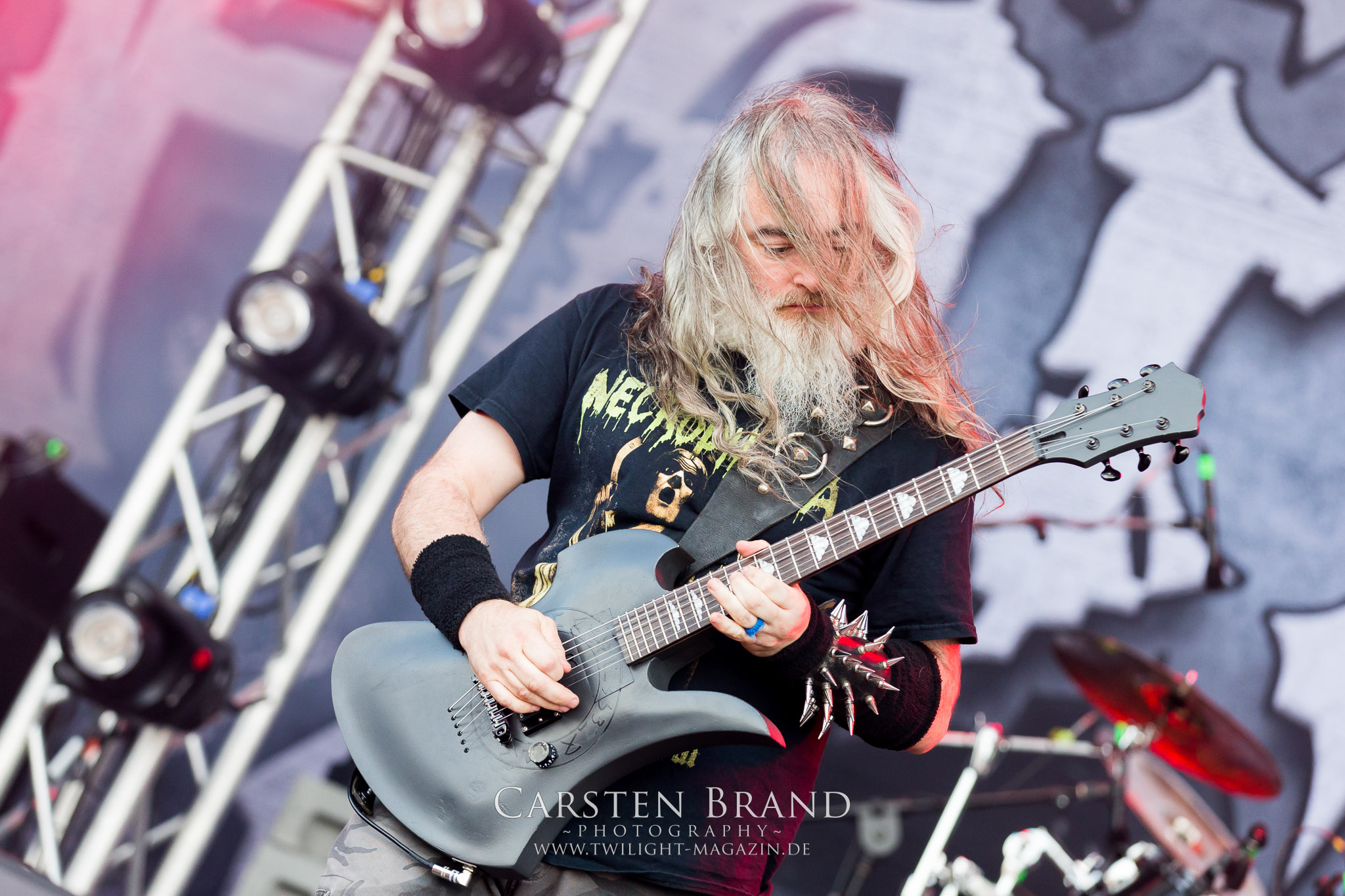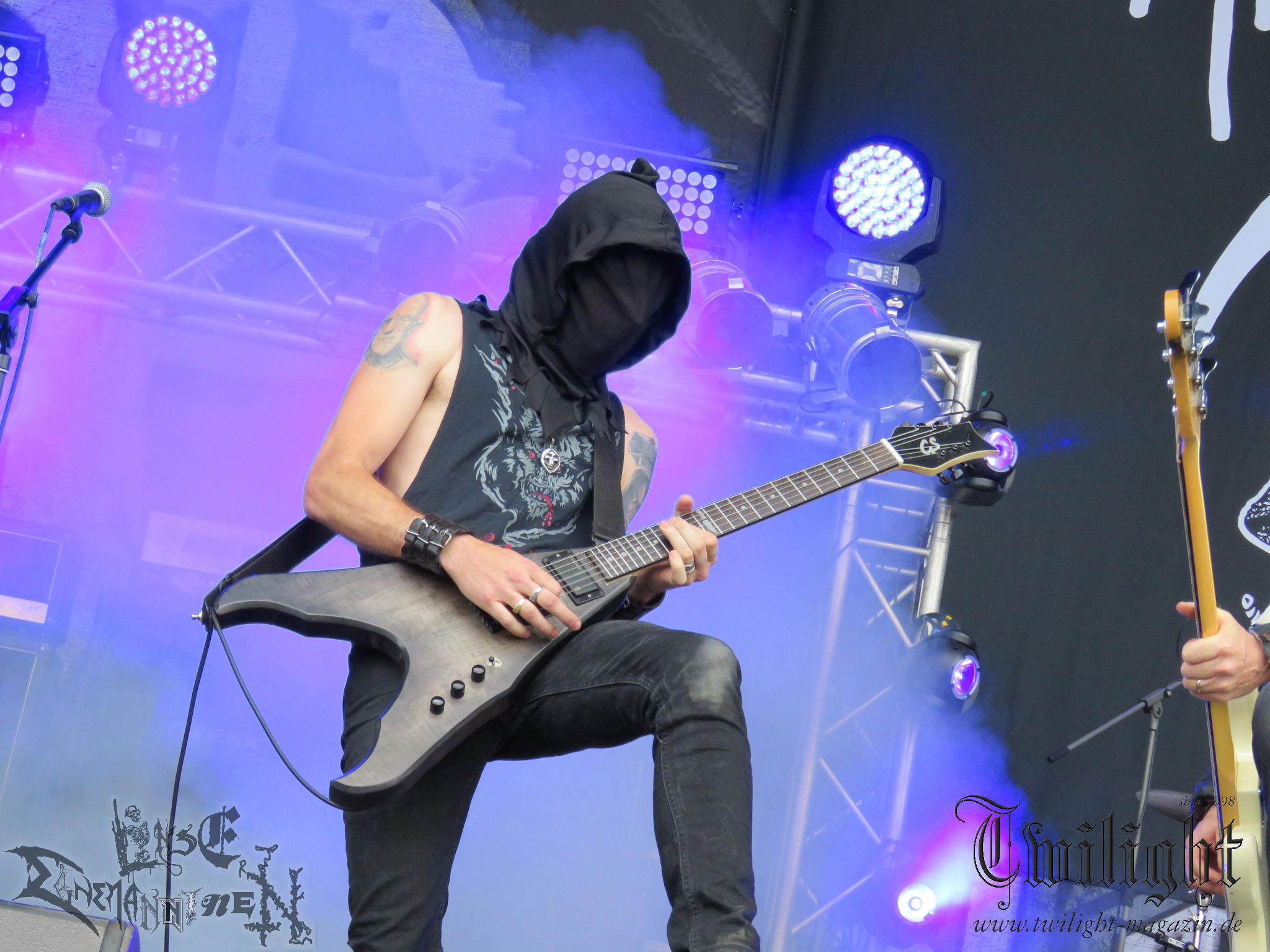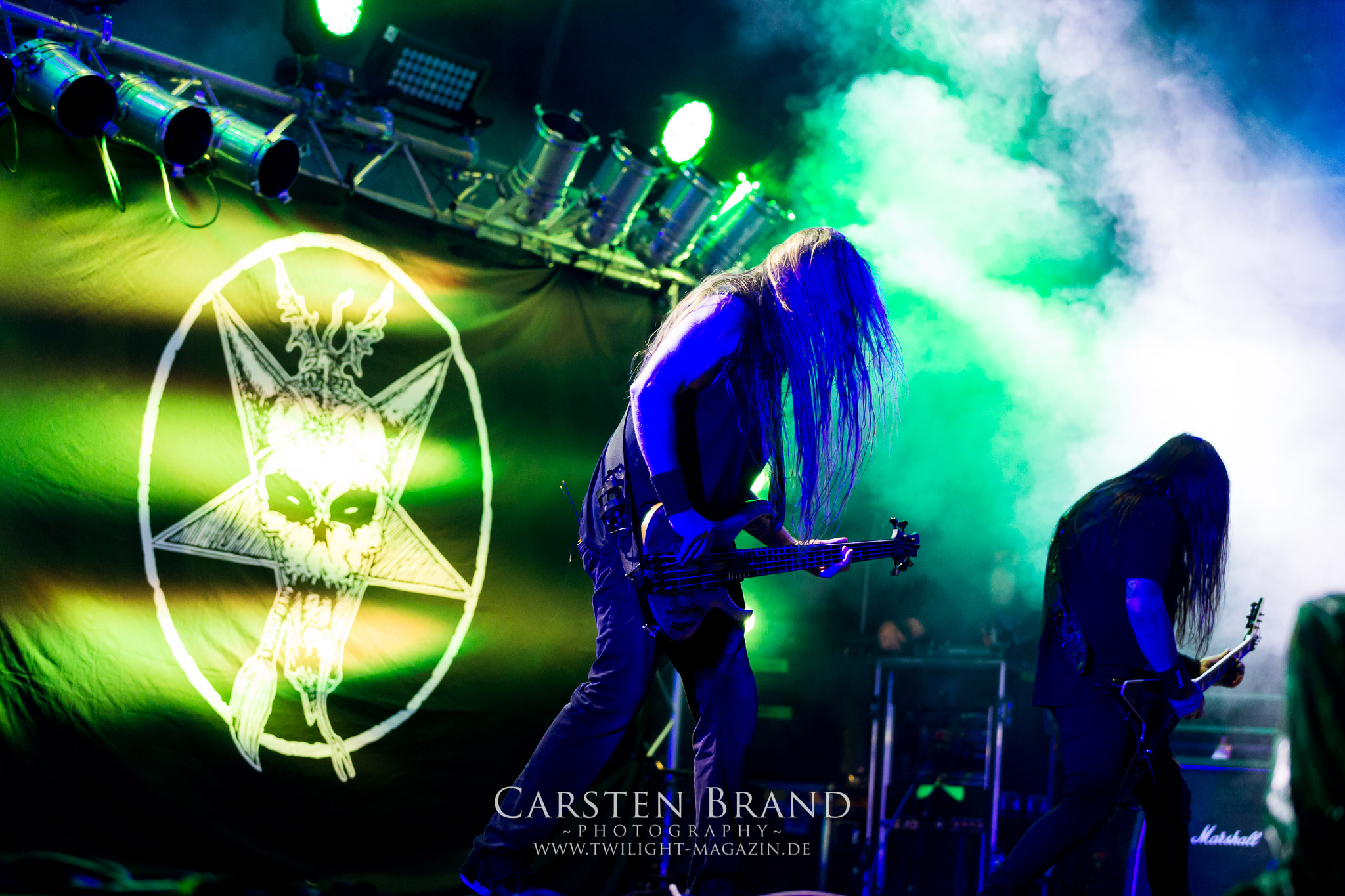 Weiter geht es mit den Schweden von RUNEMAGICK, die so gar nicht nach ihrer Heimatstadt Göteborg klingen. Niklas Rudolfsson hat seiner, einst als Sacramentum-Ableger gestarteten Formation, der erstmals in den späten Neunzigern von sich reden machte, vor zwei Jahren neues Leben eingehaucht. Das Quartett liefert ultra-brutalen, rohen und scheppernden Death-Doom, der sich ohne Rücksicht auf Verluste durch die Nackenmuskulatur in den Schädel fräst. Ohne dass ich die Band jemals intensiv verfolgt hätte, mit einer solch´ auf simpler Effizienz ausgelegten abgrundtief hässlichen Soundwalze lässt sich schonmal die Sonne verdunkeln. Ein beeindruckender Verweis auf den angekündigten Triumpfzug des Todes am späten Abend. (JD)