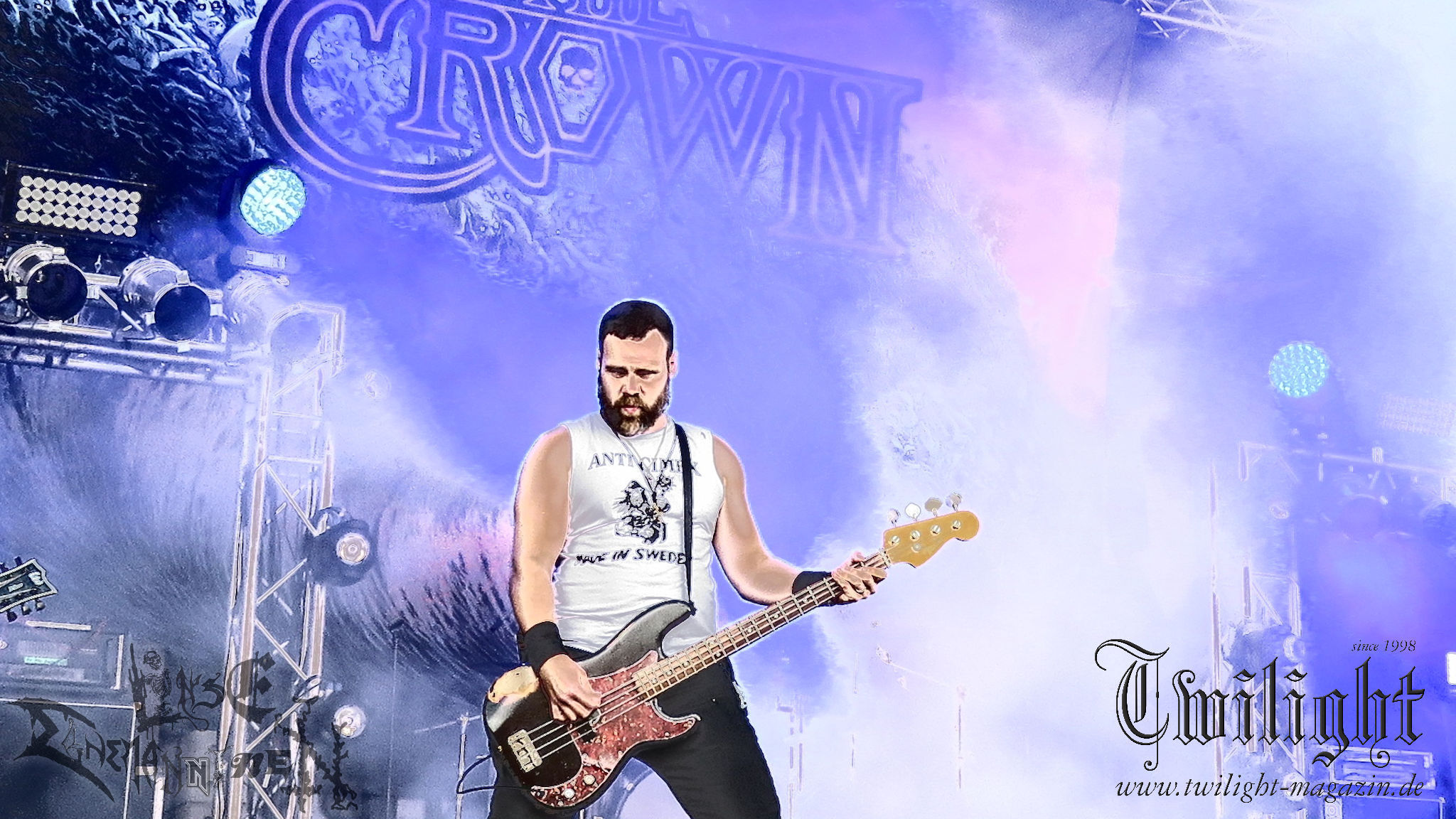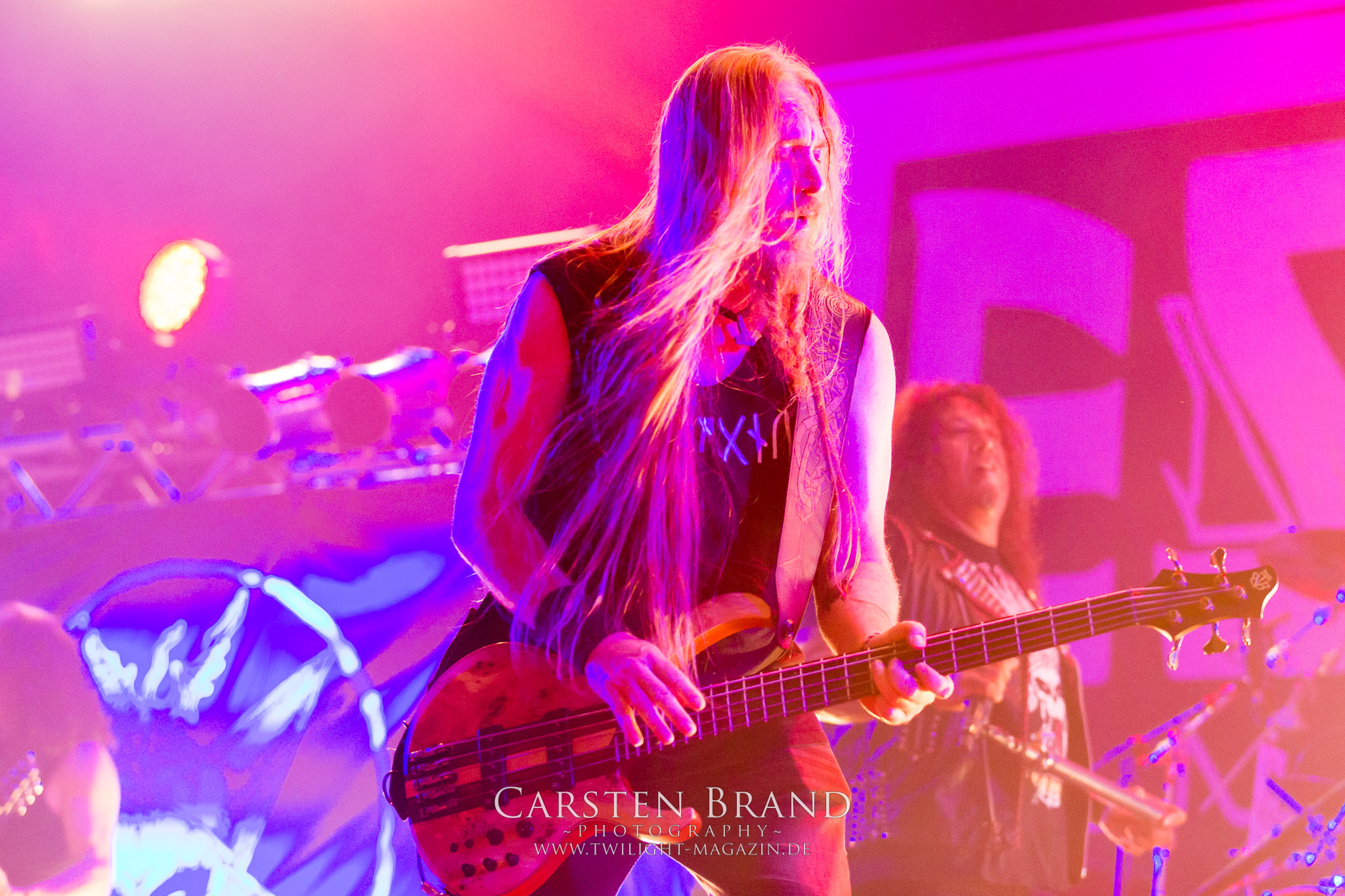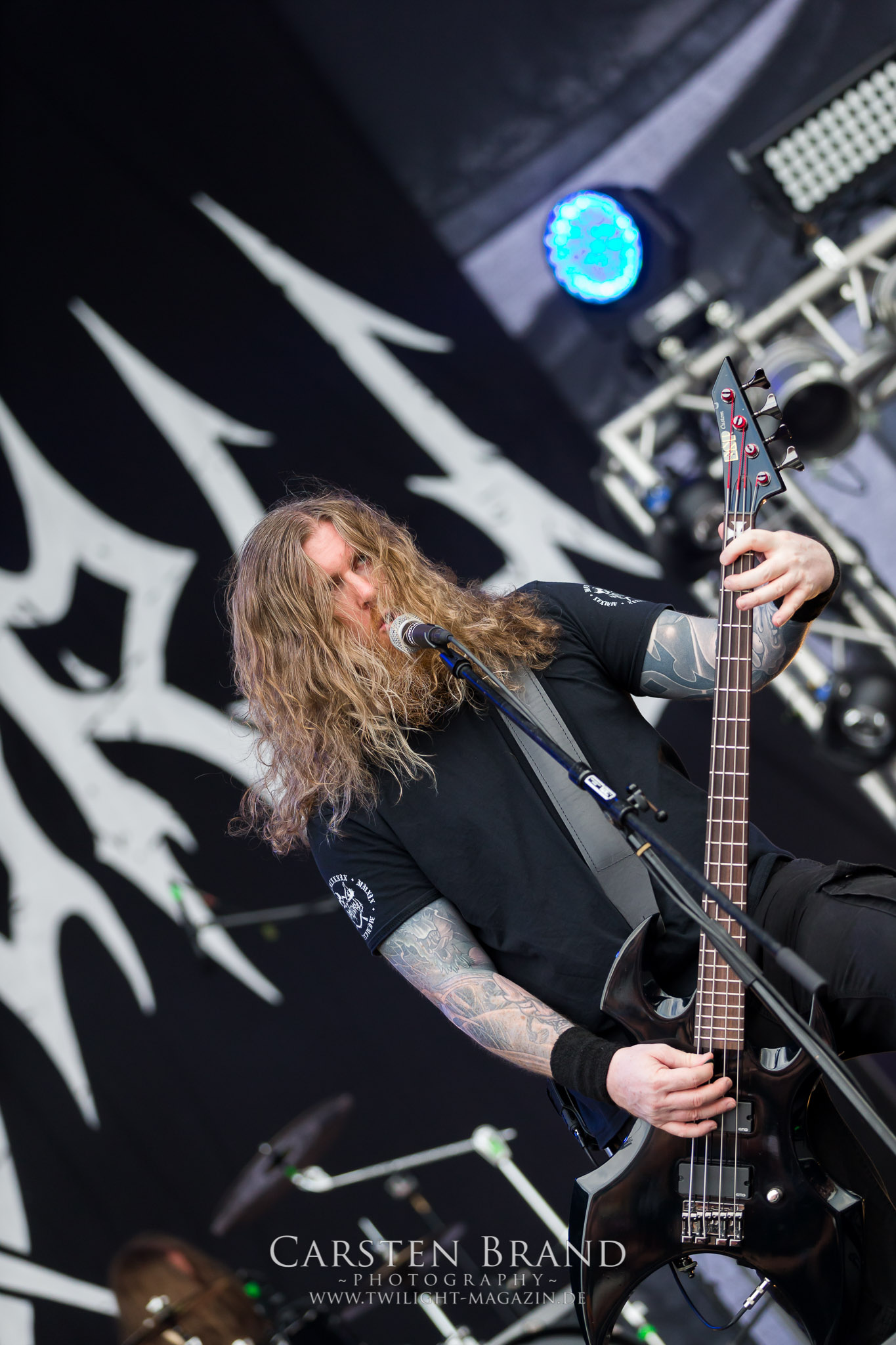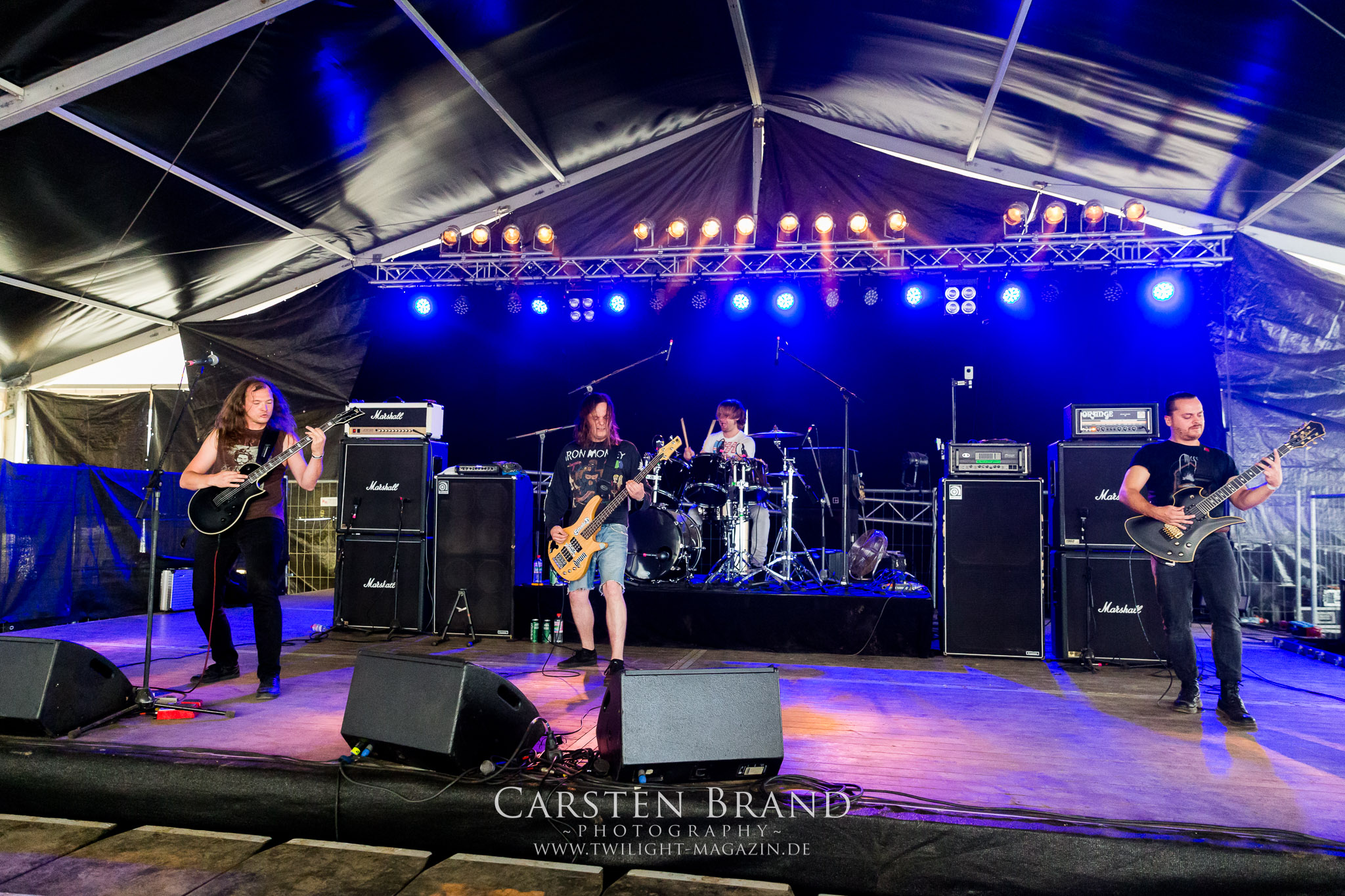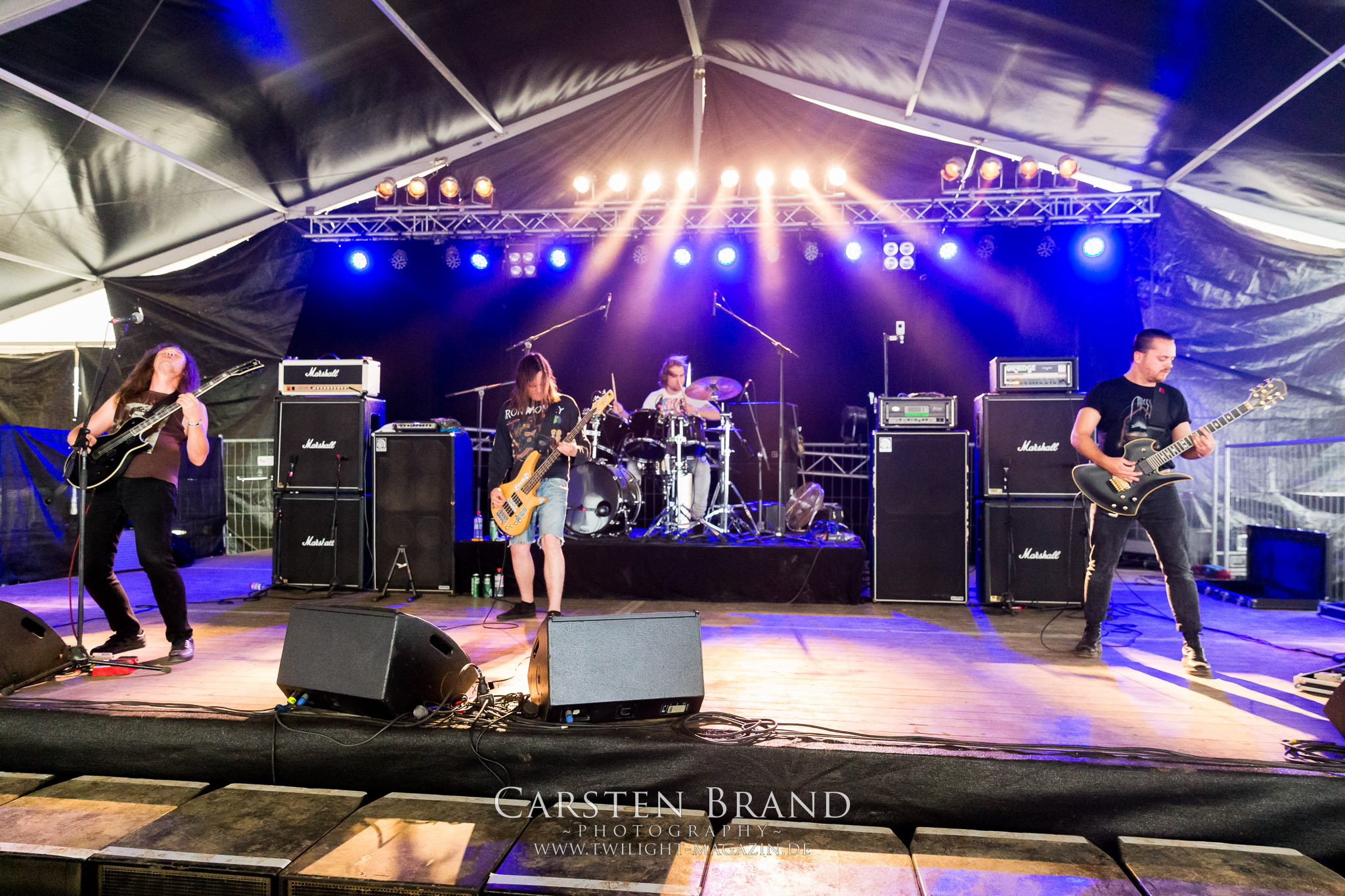 Weiter geht es mit den Schweden von RUNEMAGICK, die so gar nicht nach ihrer Heimatstadt Göteborg klingen. Niklas Rudolfsson hat seiner, einst als Sacramentum-Ableger gestarteten Formation, der erstmals in den späten Neunzigern von sich reden machte, vor zwei Jahren neues Leben eingehaucht. Das Quartett liefert ultra-brutalen, rohen und scheppernden Death-Doom, der sich ohne Rücksicht auf Verluste durch die Nackenmuskulatur in den Schädel fräst. Ohne dass ich die Band jemals intensiv verfolgt hätte, mit einer solch´ auf simpler Effizienz ausgelegten abgrundtief hässlichen Soundwalze lässt sich schonmal die Sonne verdunkeln. Ein beeindruckender Verweis auf den angekündigten Triumpfzug des Todes am späten Abend. (JD)