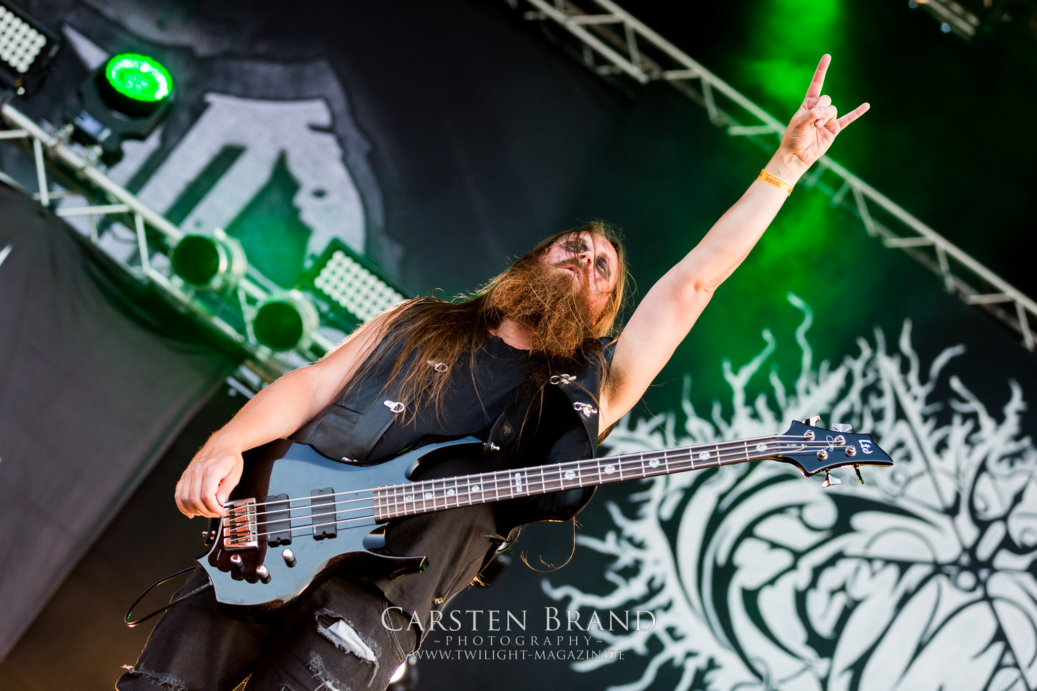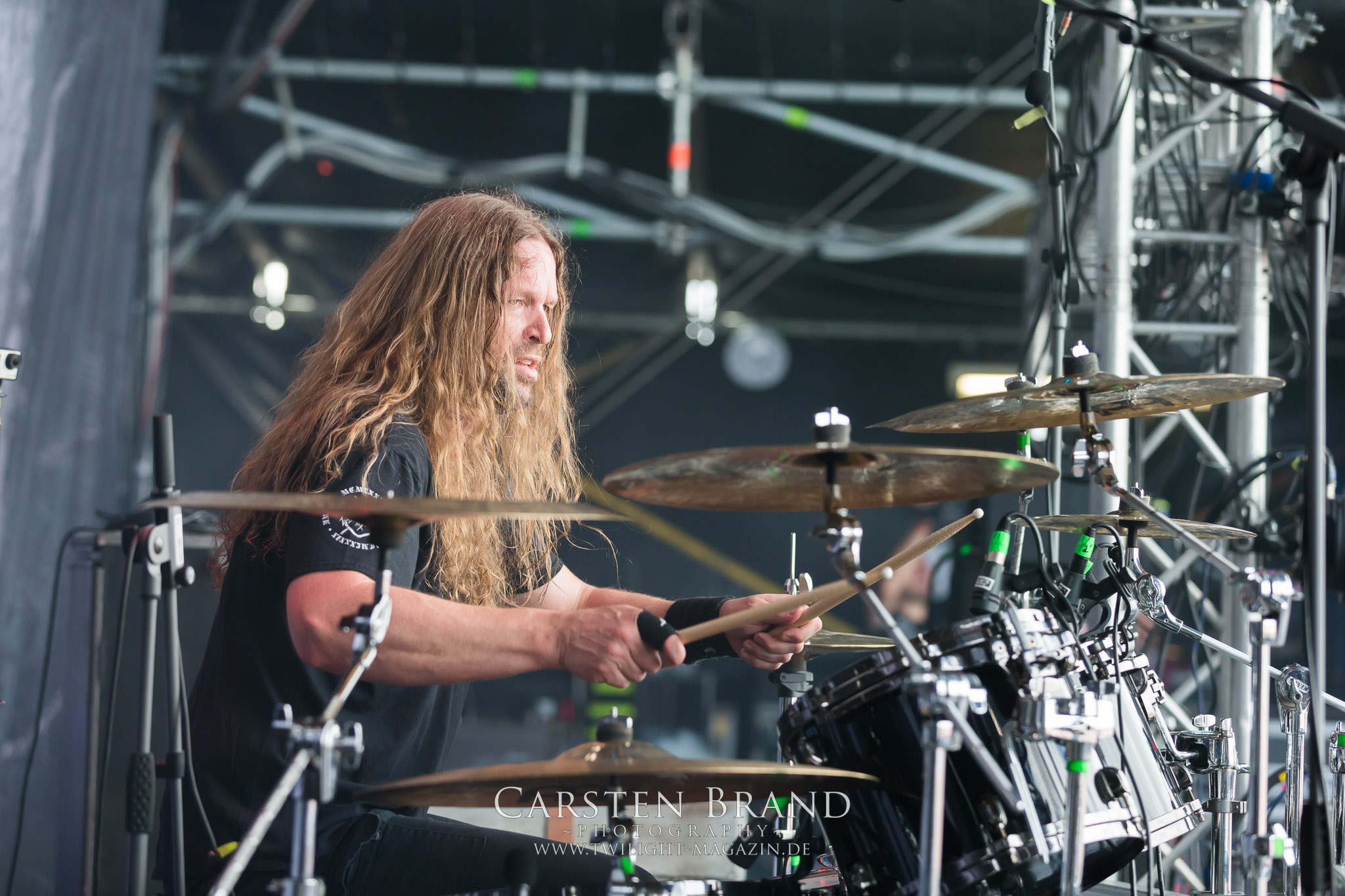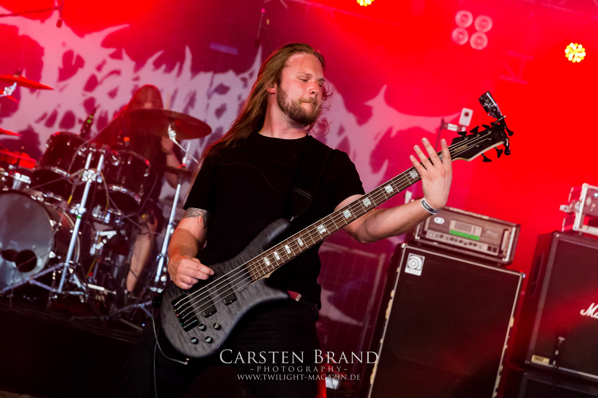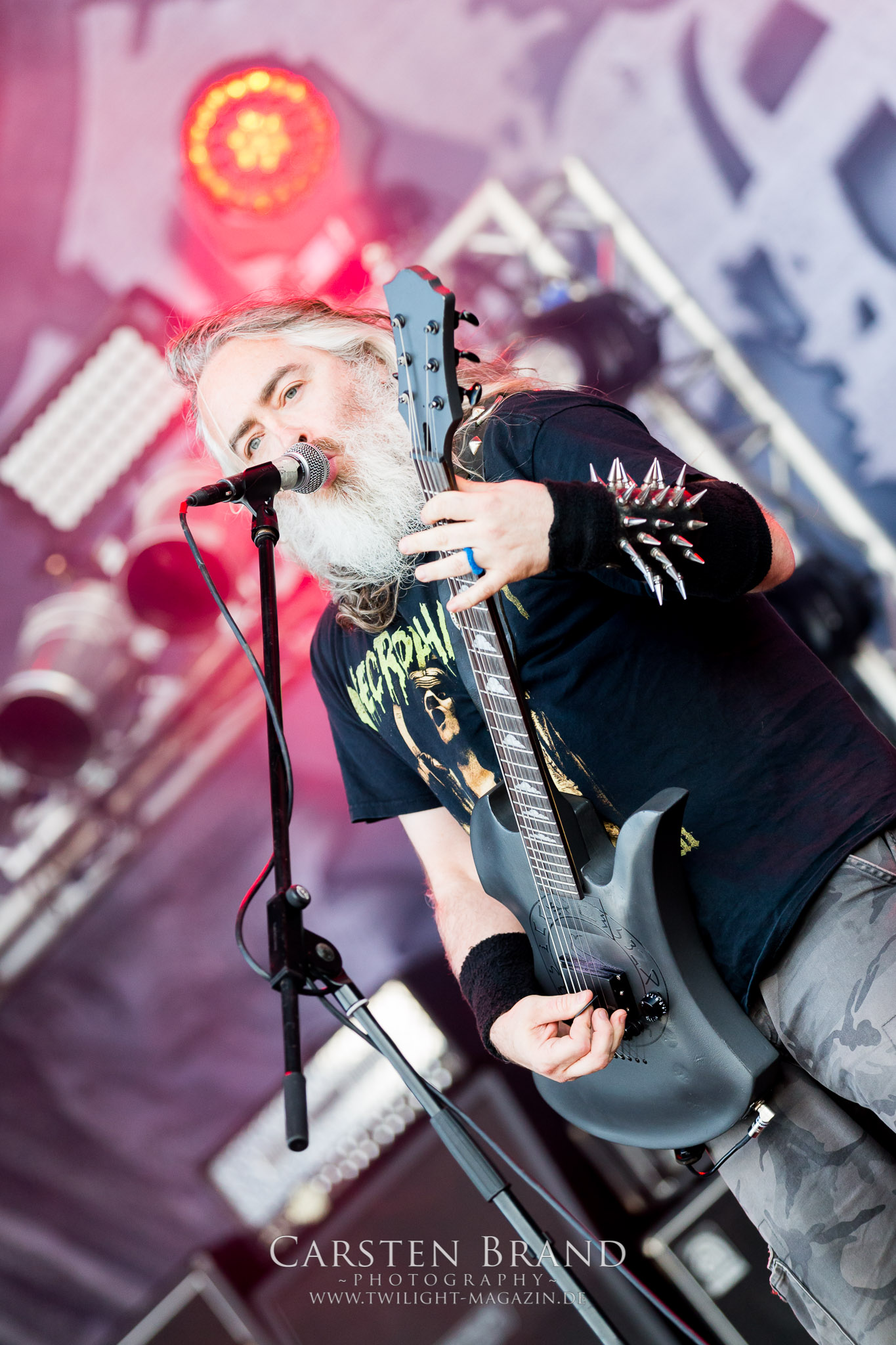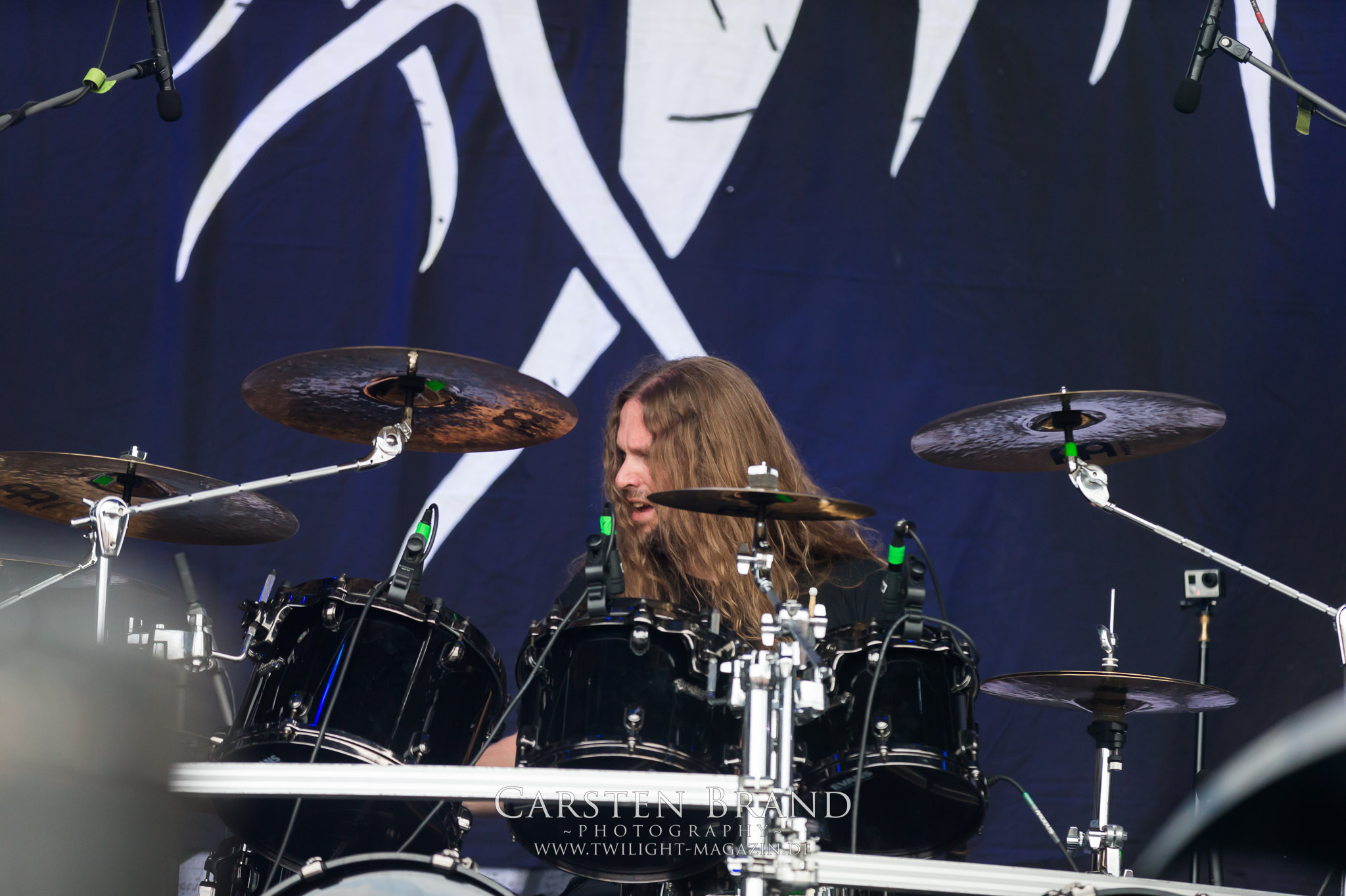 Weiter geht es mit den Schweden von RUNEMAGICK, die so gar nicht nach ihrer Heimatstadt Göteborg klingen. Niklas Rudolfsson hat seiner, einst als Sacramentum-Ableger gestarteten Formation, der erstmals in den späten Neunzigern von sich reden machte, vor zwei Jahren neues Leben eingehaucht. Das Quartett liefert ultra-brutalen, rohen und scheppernden Death-Doom, der sich ohne Rücksicht auf Verluste durch die Nackenmuskulatur in den Schädel fräst. Ohne dass ich die Band jemals intensiv verfolgt hätte, mit einer solch´ auf simpler Effizienz ausgelegten abgrundtief hässlichen Soundwalze lässt sich schonmal die Sonne verdunkeln. Ein beeindruckender Verweis auf den angekündigten Triumpfzug des Todes am späten Abend. (JD)