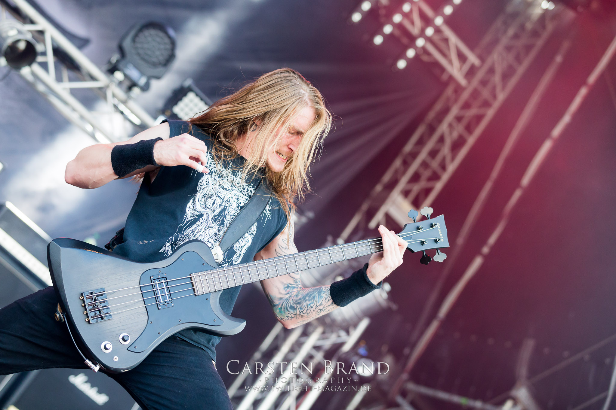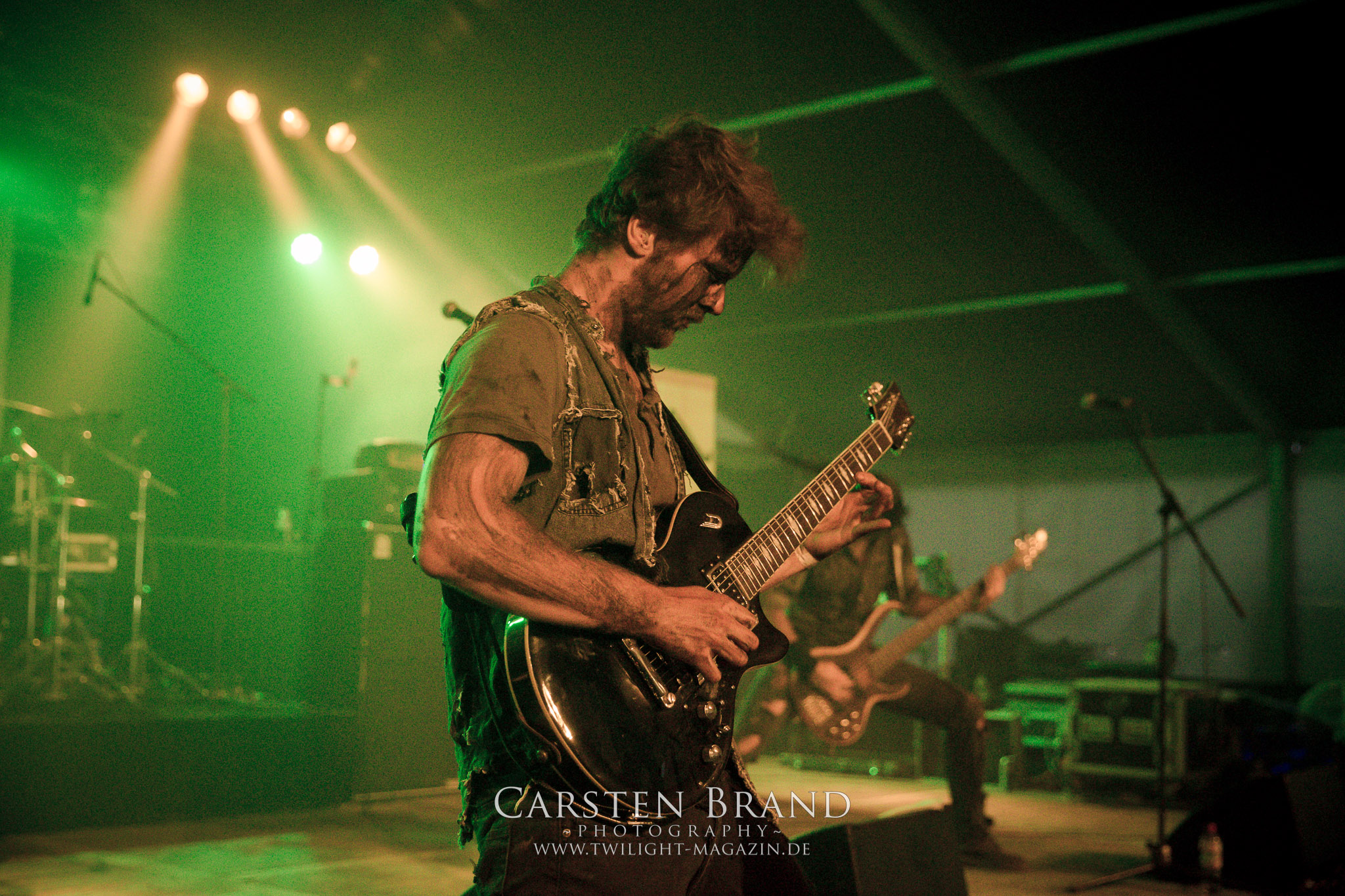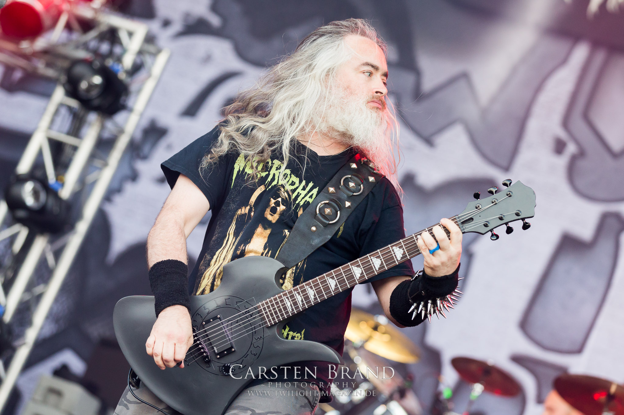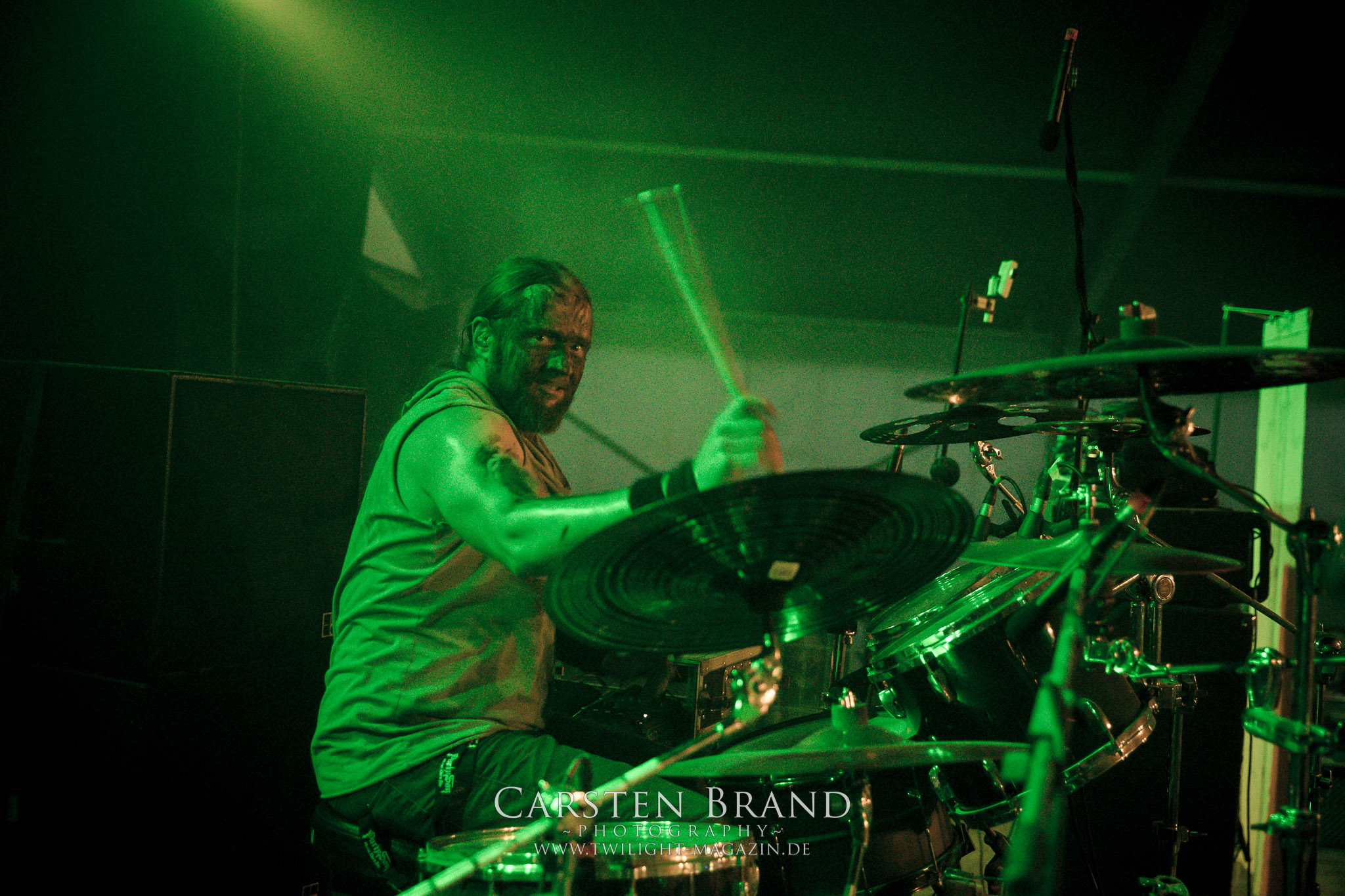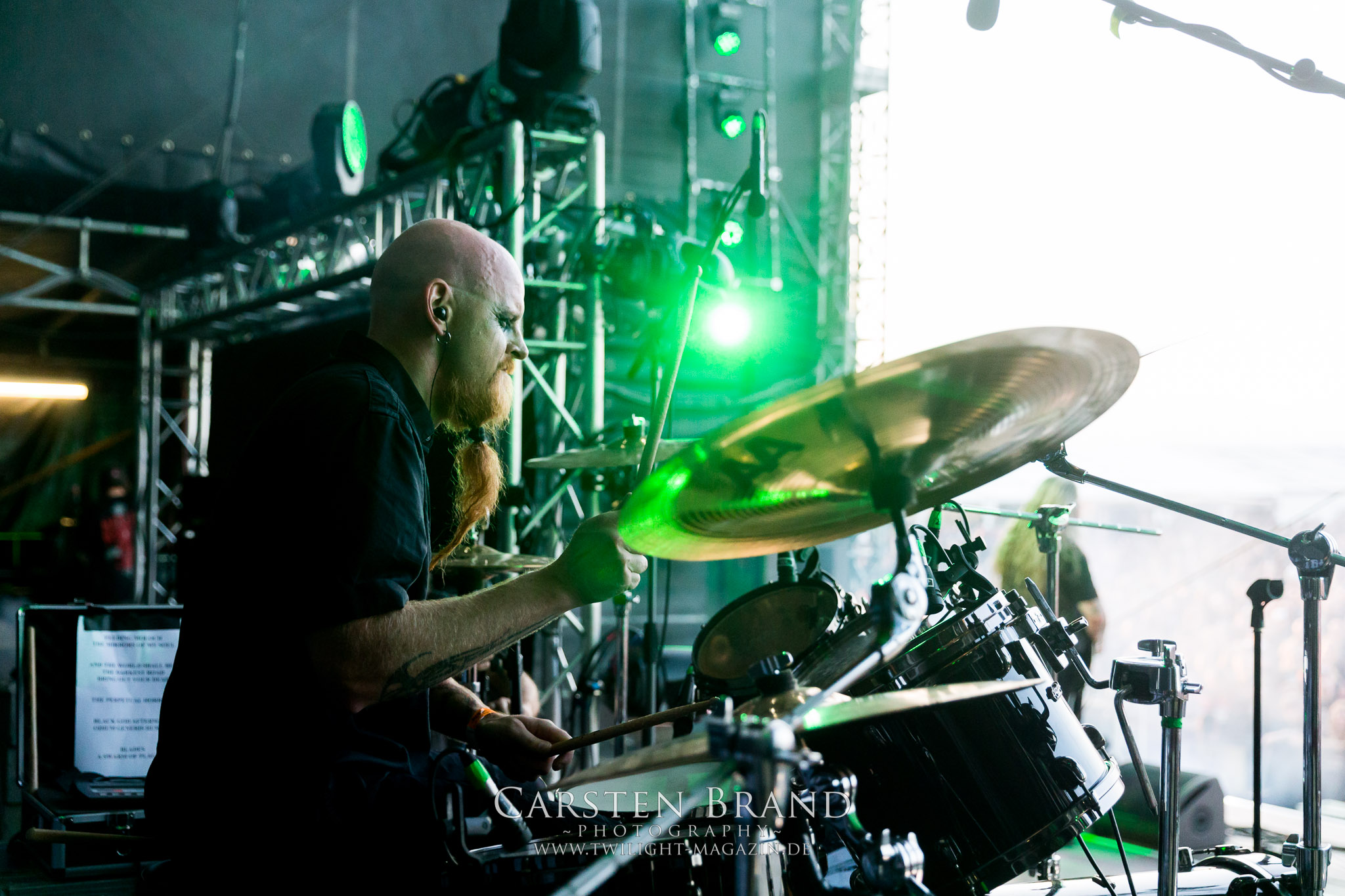 Weiter geht es mit den Schweden von RUNEMAGICK, die so gar nicht nach ihrer Heimatstadt Göteborg klingen. Niklas Rudolfsson hat seiner, einst als Sacramentum-Ableger gestarteten Formation, der erstmals in den späten Neunzigern von sich reden machte, vor zwei Jahren neues Leben eingehaucht. Das Quartett liefert ultra-brutalen, rohen und scheppernden Death-Doom, der sich ohne Rücksicht auf Verluste durch die Nackenmuskulatur in den Schädel fräst. Ohne dass ich die Band jemals intensiv verfolgt hätte, mit einer solch´ auf simpler Effizienz ausgelegten abgrundtief hässlichen Soundwalze lässt sich schonmal die Sonne verdunkeln. Ein beeindruckender Verweis auf den angekündigten Triumpfzug des Todes am späten Abend. (JD)