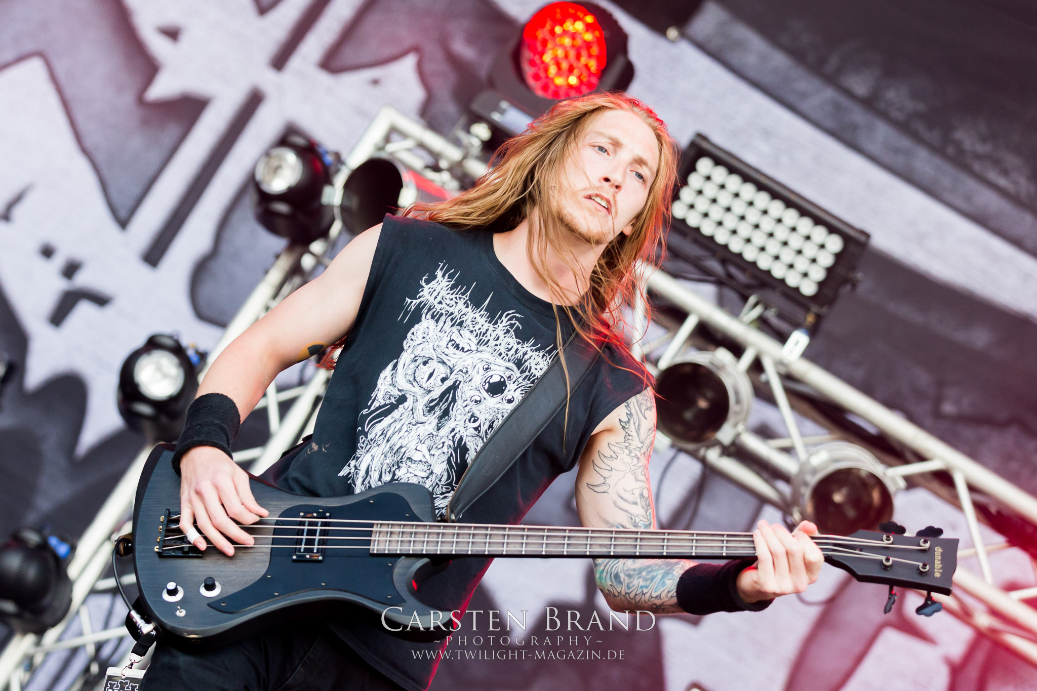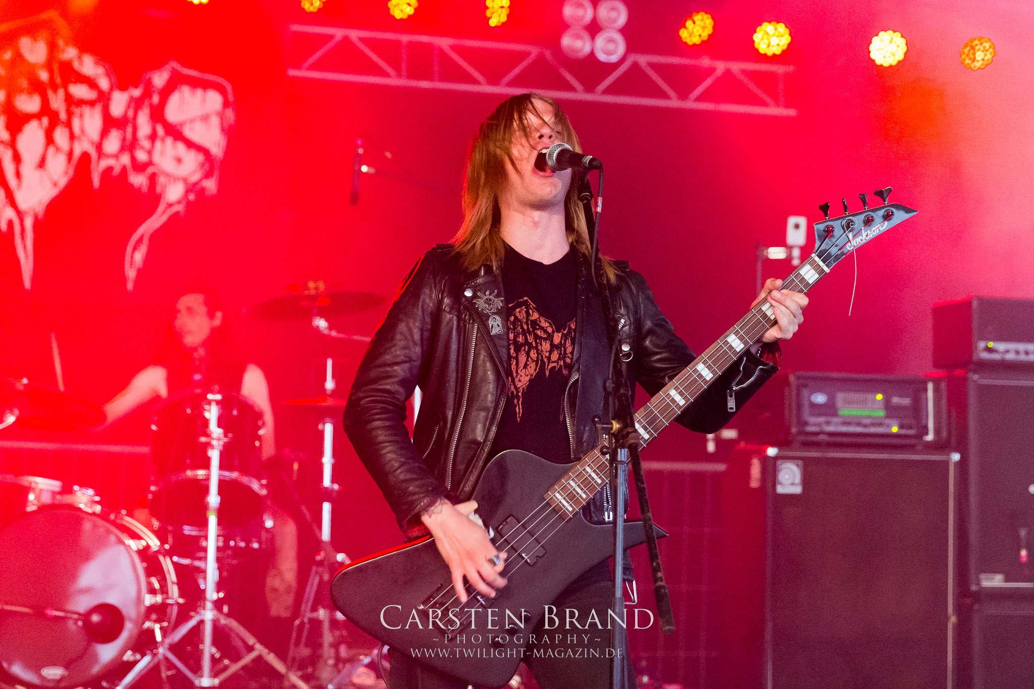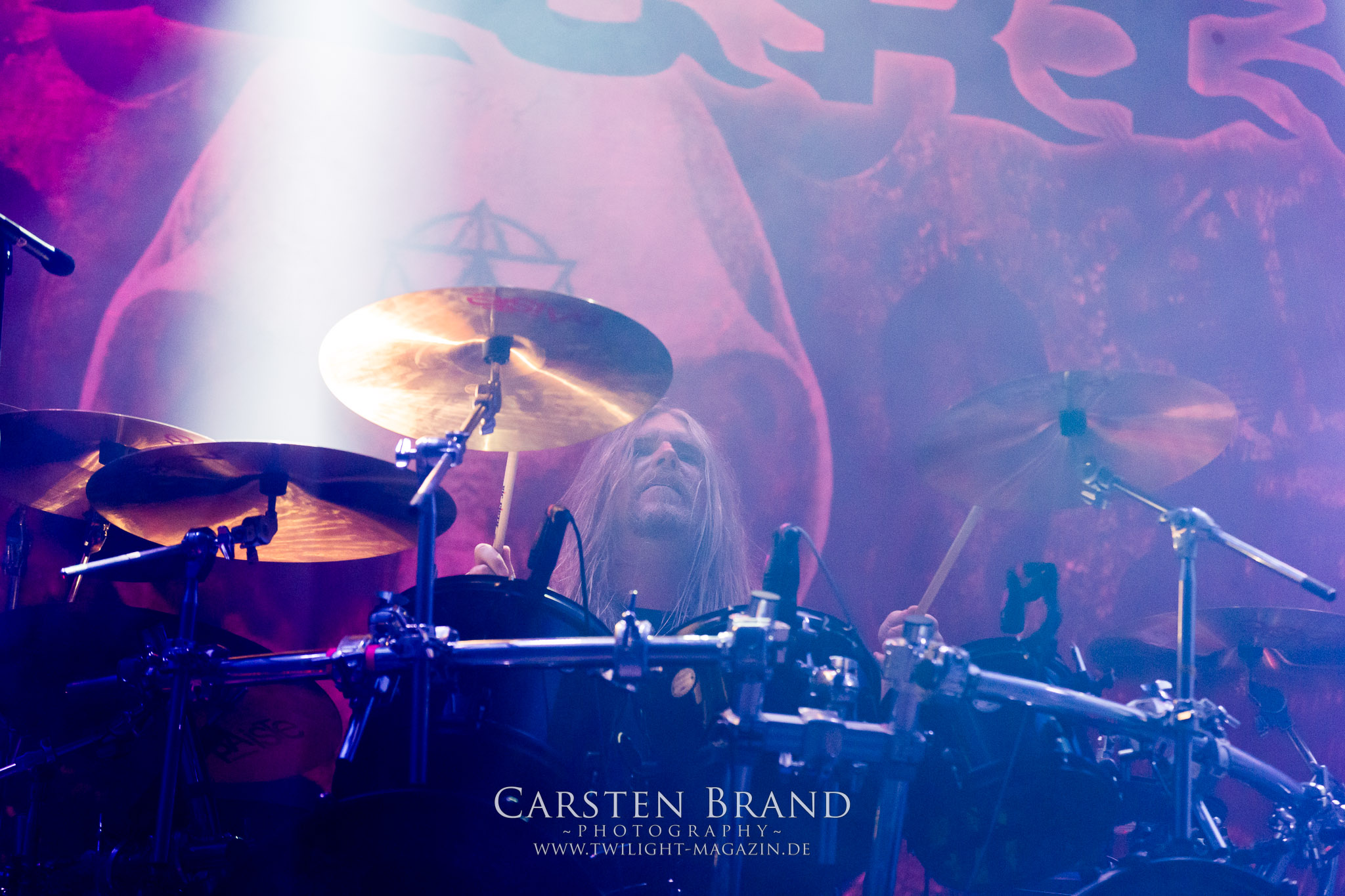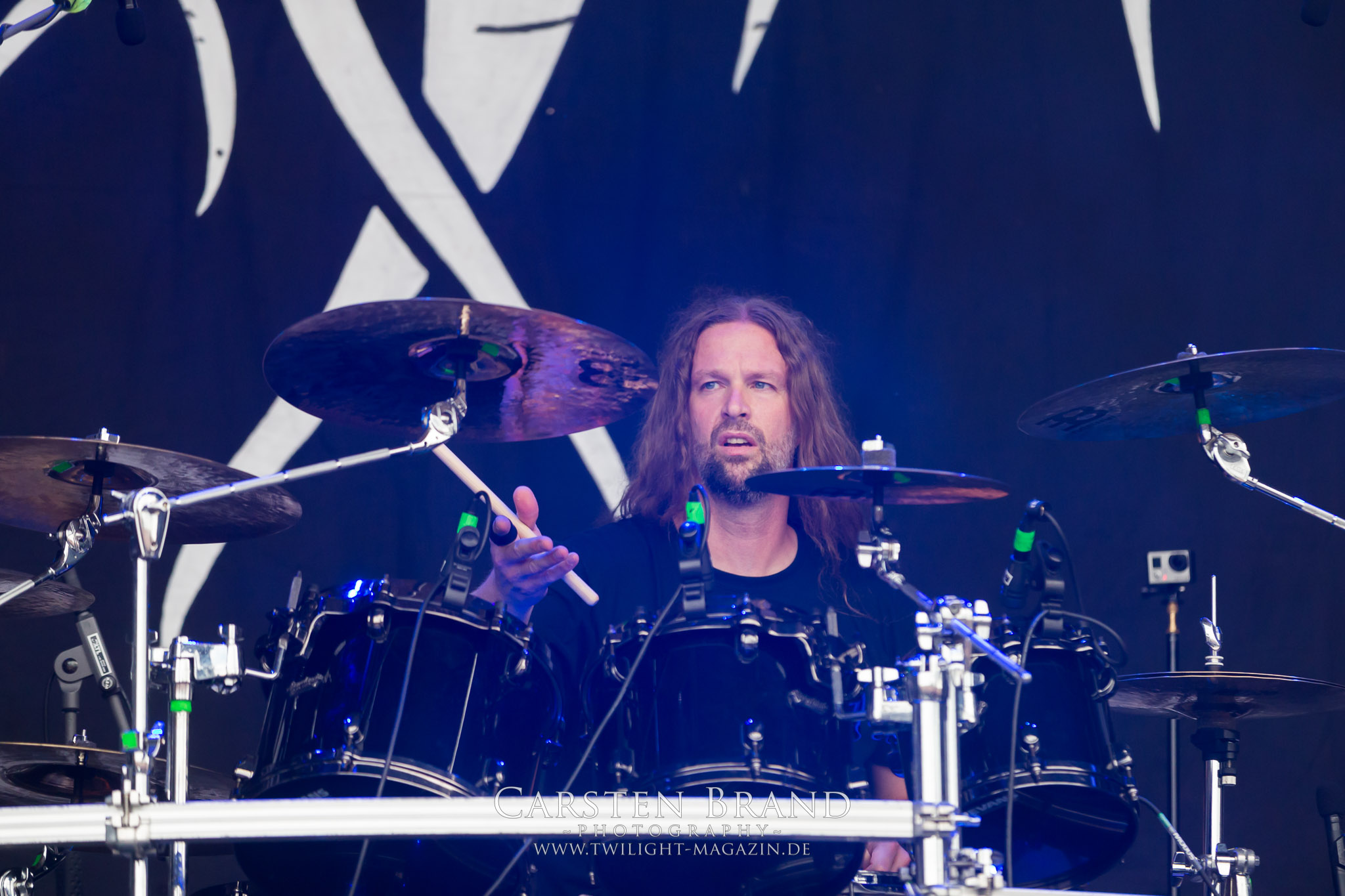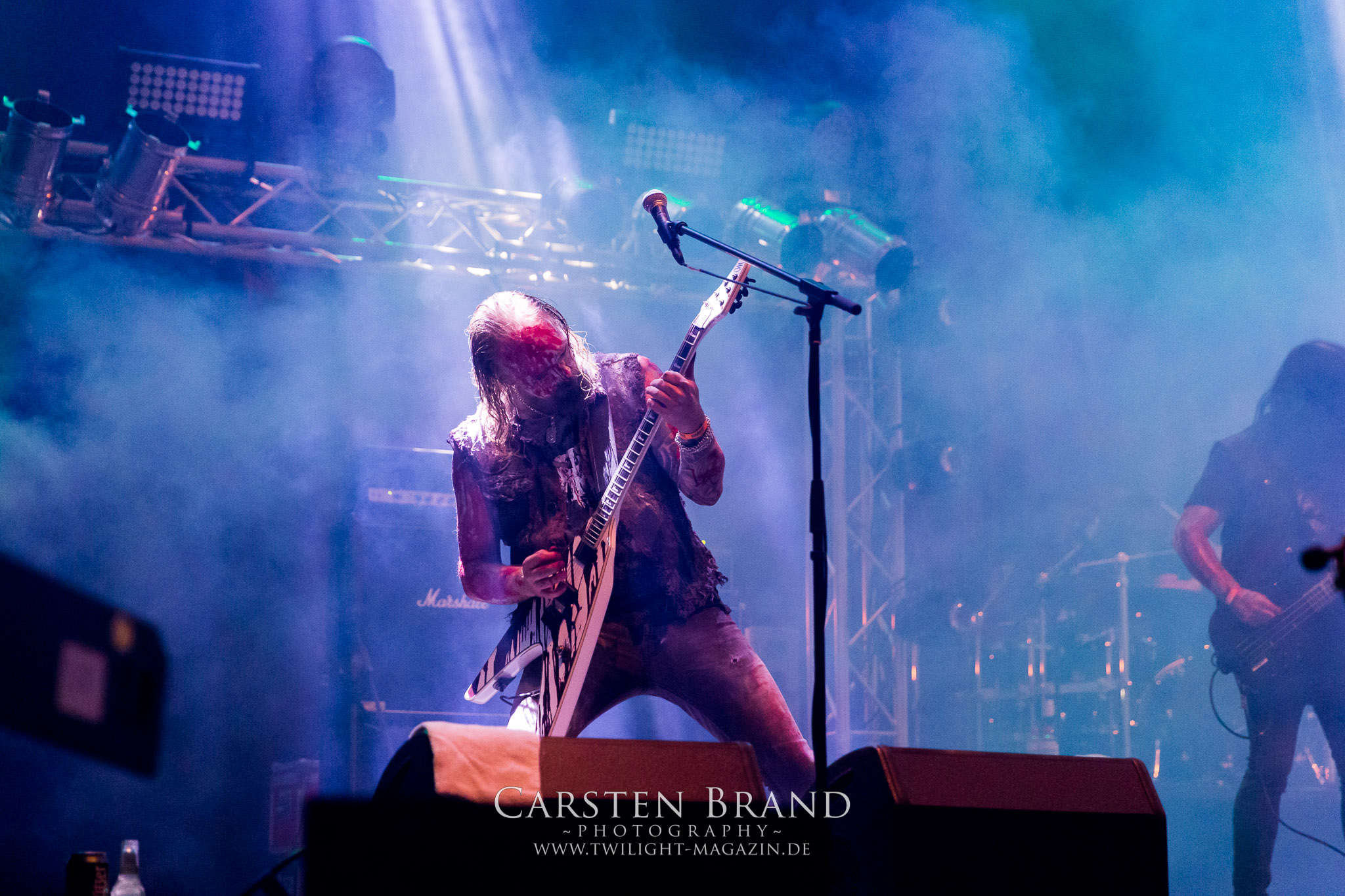 Weiter geht es mit den Schweden von RUNEMAGICK, die so gar nicht nach ihrer Heimatstadt Göteborg klingen. Niklas Rudolfsson hat seiner, einst als Sacramentum-Ableger gestarteten Formation, der erstmals in den späten Neunzigern von sich reden machte, vor zwei Jahren neues Leben eingehaucht. Das Quartett liefert ultra-brutalen, rohen und scheppernden Death-Doom, der sich ohne Rücksicht auf Verluste durch die Nackenmuskulatur in den Schädel fräst. Ohne dass ich die Band jemals intensiv verfolgt hätte, mit einer solch´ auf simpler Effizienz ausgelegten abgrundtief hässlichen Soundwalze lässt sich schonmal die Sonne verdunkeln. Ein beeindruckender Verweis auf den angekündigten Triumpfzug des Todes am späten Abend. (JD)