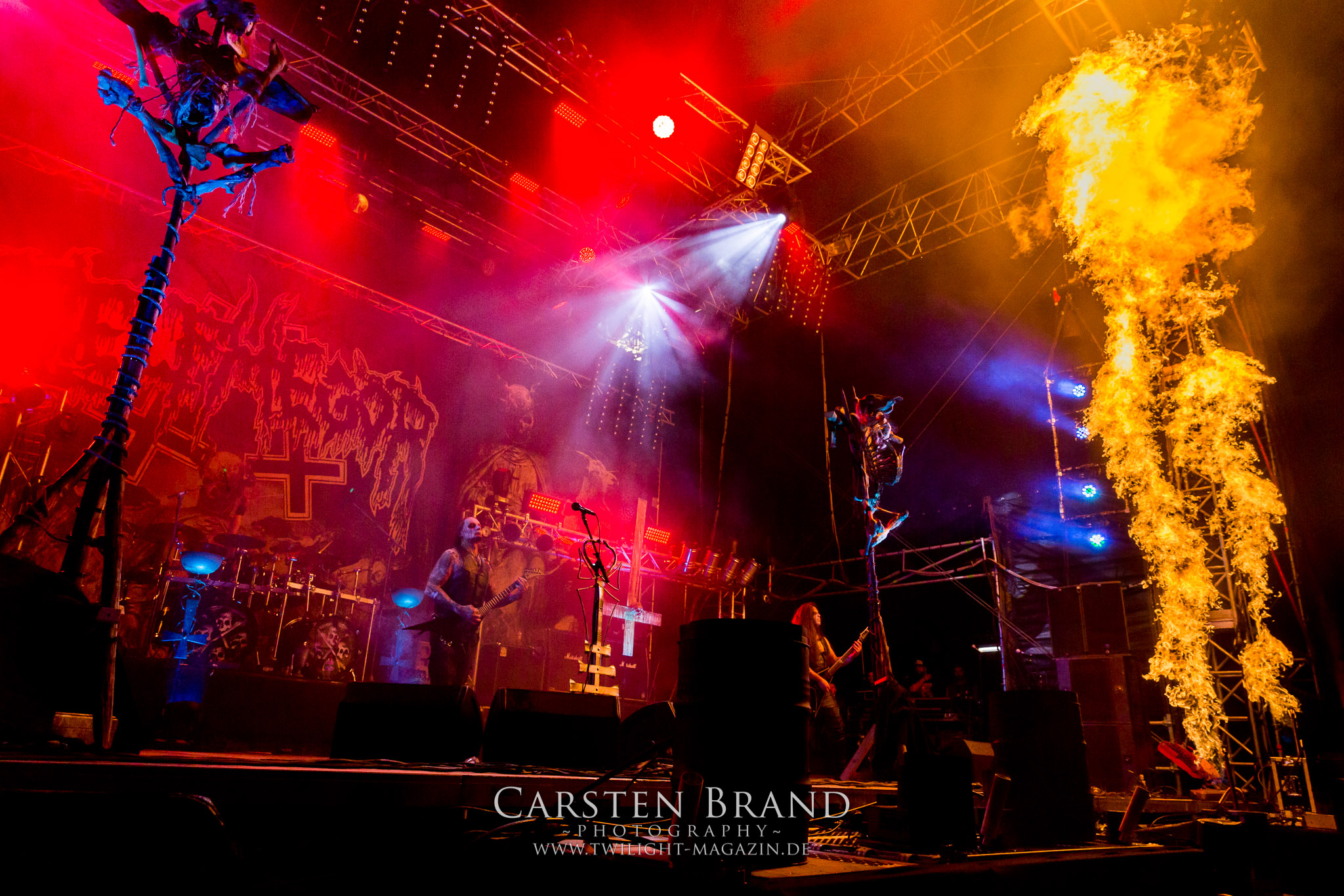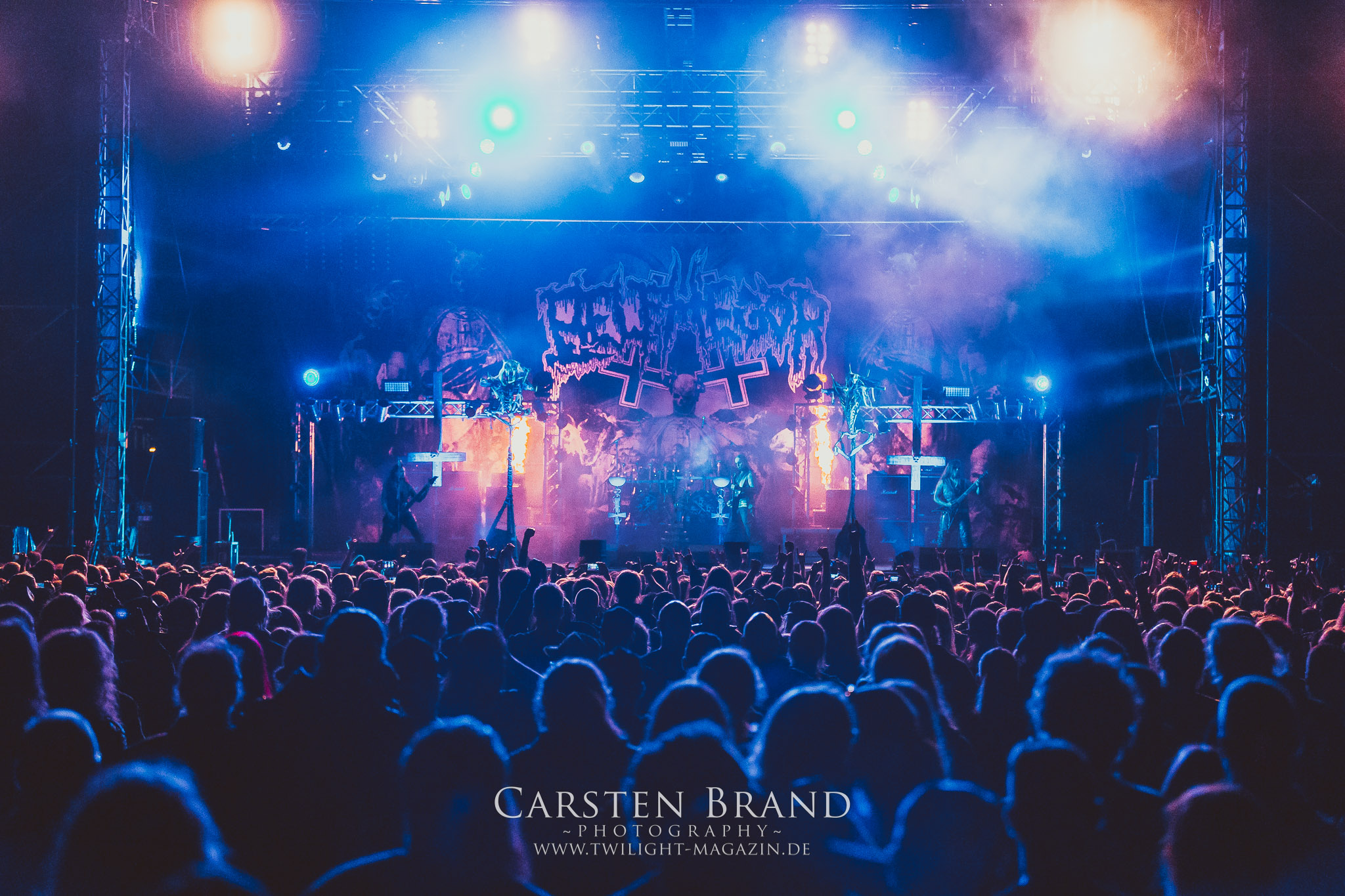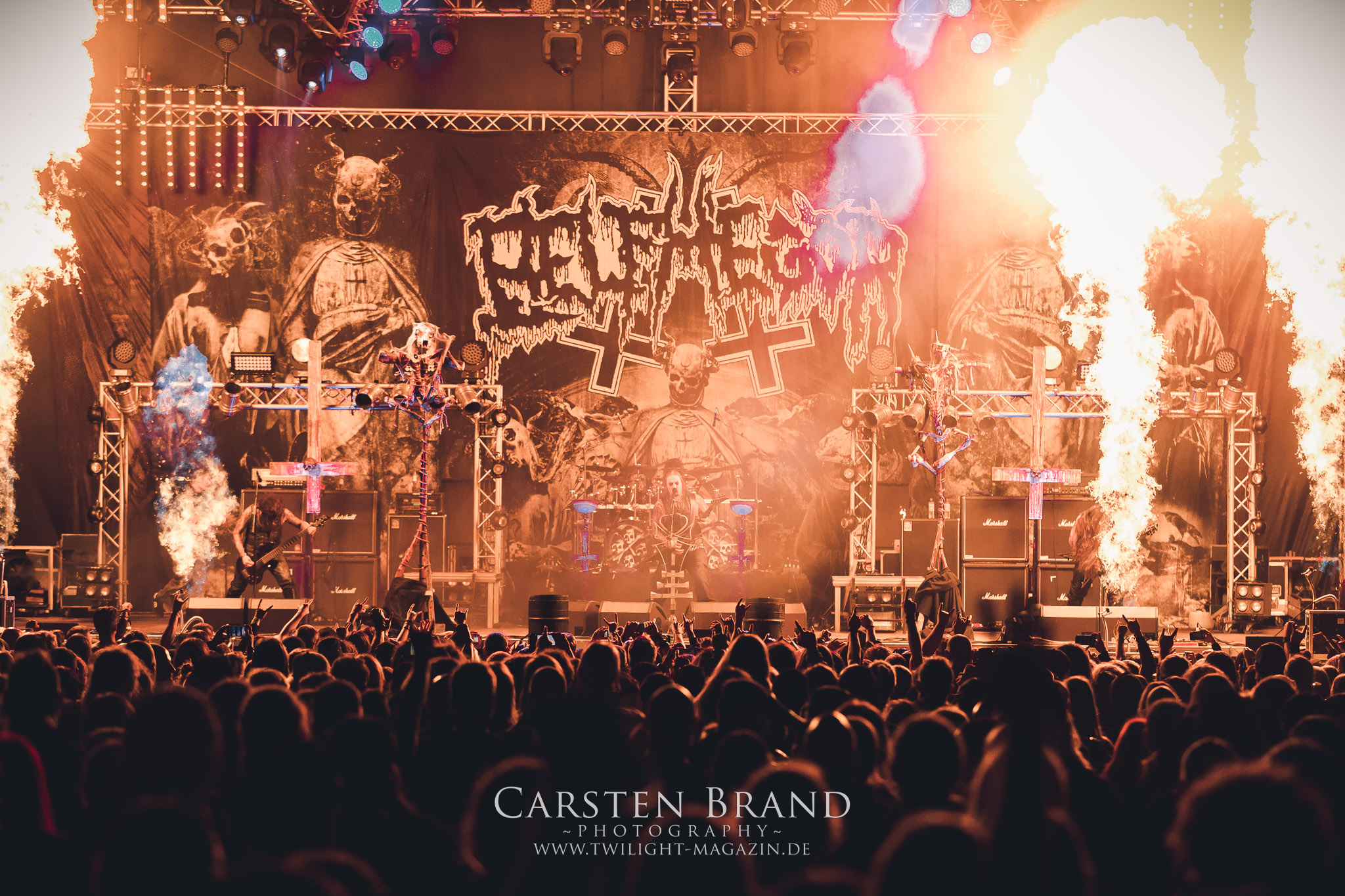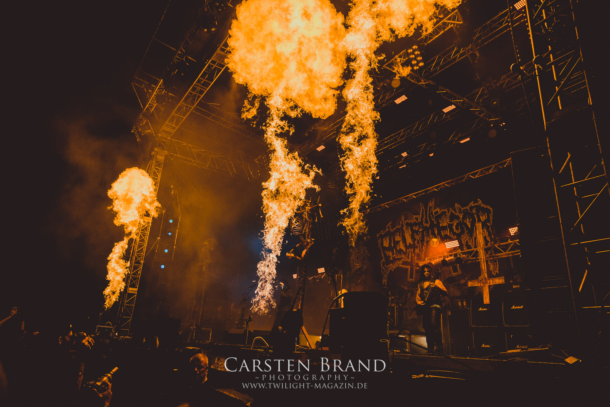 BELPHEGOR schwimmen seit ihrem letzten Album „Totenritual“ gerade auf einer Black Metal-Erfolgswelle und sind damit zu Recht der Donnerstags-Headliner. Diesem Status werden sie auch gerecht und haben eine ordentliche Feuershow aufgefahren. Leider wirkt diese etwas asynchron und nicht unbedingt auf die Songs abgestimmt. So gehen bei ruhigen Passagen mehrmals recht plötzlich mehrere Feuerfontänen los, die man eher in den Blastbeat-Passagen erwartet hätte. Insgesamt ist die Show etwas basslastig, macht aber mit dem Fokus auf die neueren Werke trotzdem keine Gefangenen. Allerdings verschwindet die Band dann recht frühzeitig von der Bühne, obwohl noch Zeit für einen weiteren Klassiker gewesen wäre. (MS) Ich muss mich an dieser Stelle einmal mehr outen, dass neben Celtic Frost auch deren Vorläufer Hellhammer während und auch nach meiner intensiven Metal-Sozialisation an mir vorbei gegangen sind und die Musik von Tom G. Warrior und seinen Mannen nicht einmal ansatzweise die Bedeutung für mich hat, wie für die meisten Die-Hards, die die Hellhammer-Darbietung vermutlich seit Jahrzehnten erfleht haben. Doch wo, wenn nicht auf´s PARTY.SAN METAL OPEN AIR gehört dieser Gig, haben die Eidgenossen doch locker drei Generationen von Extrem-Metalbands, die sich seit 25 Jahren auf dem Festival die Klinke in die Hand geben, mehr oder weniger stark beeinflusst. Auch wenn ich die historische Tragweite emotional nicht in Gänze nachfühlen kann, so komme ich objektiv mit dem Material und der Darbietung wesentlich besser klar, als mit Celtic Frost bzw. Tryptikon. Ein Anbeter von Hellhammer, Celtic Frost & Co. werde ich in diesem Leben aber dennoch nicht mehr. Da gehen bei HYPOCRISY die Gäule zu noch späterer Stunde wesentlich mehr mit mir durch. (JD) Die alten Recken HYPOCRISY rund um Mastermind Peter Tägtgren legen keinen Wert auf komplexe Showelemente und kommen ohne Feuereffekte aus. Während „Fractured Millennium“ noch etwas holprig aus den Boxen kommt, ist bei der zu erwarteten Zugabe „Roswell 47“ die Hütte auch ohne Flammenunterstützung ordentlich am Brennen. (MS)