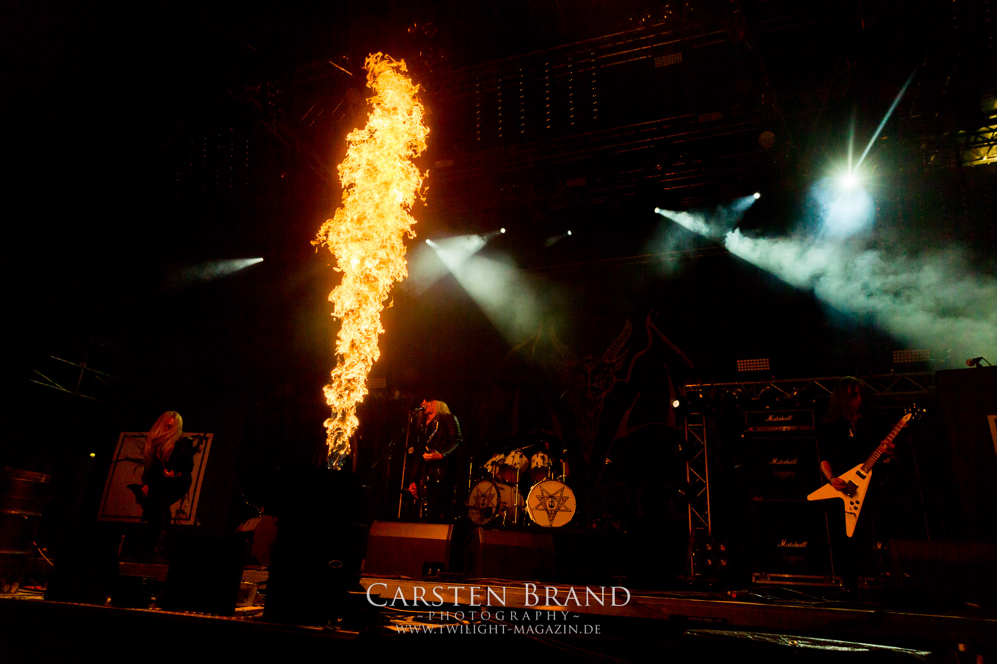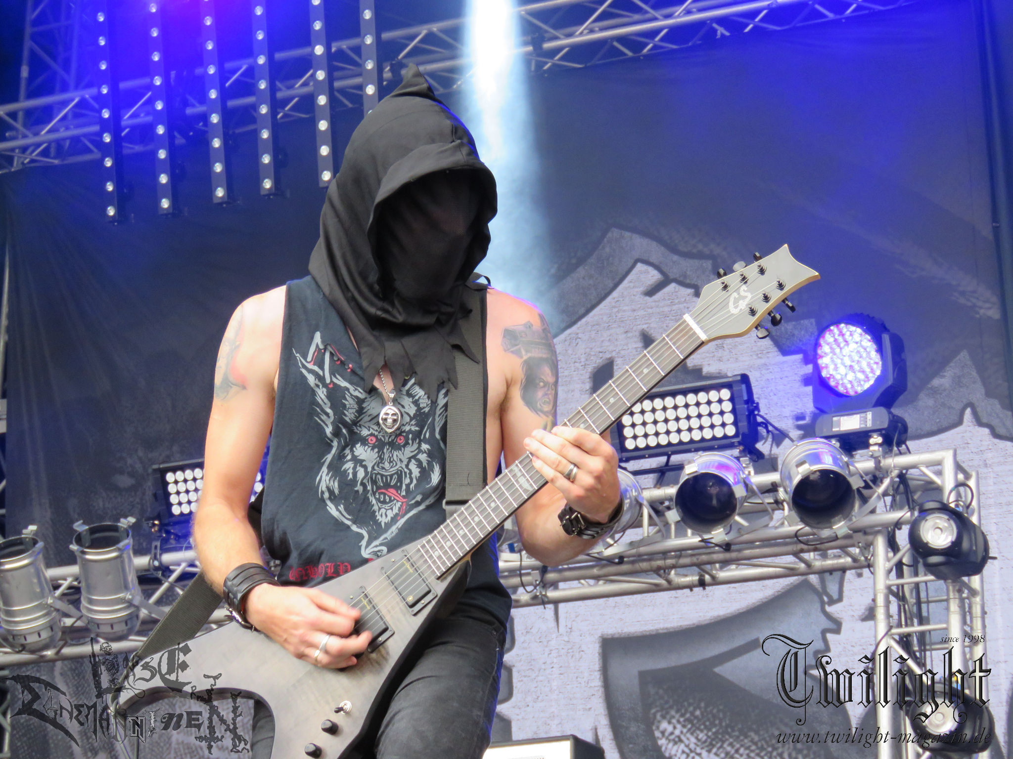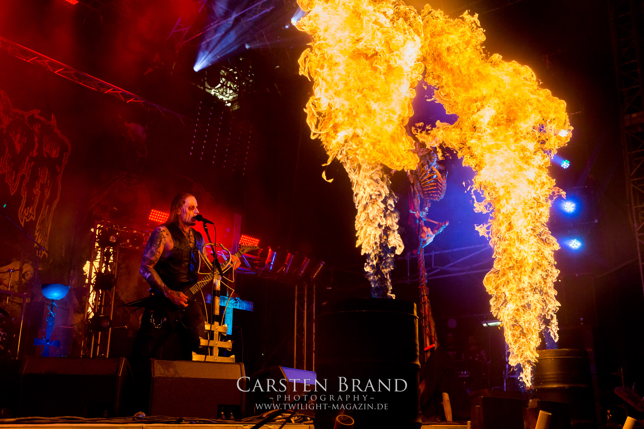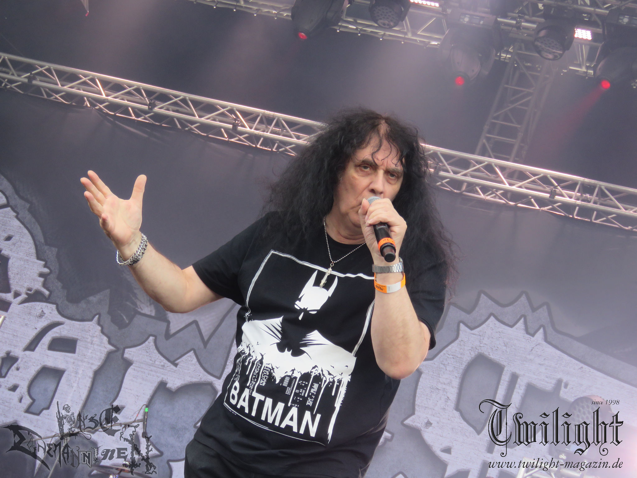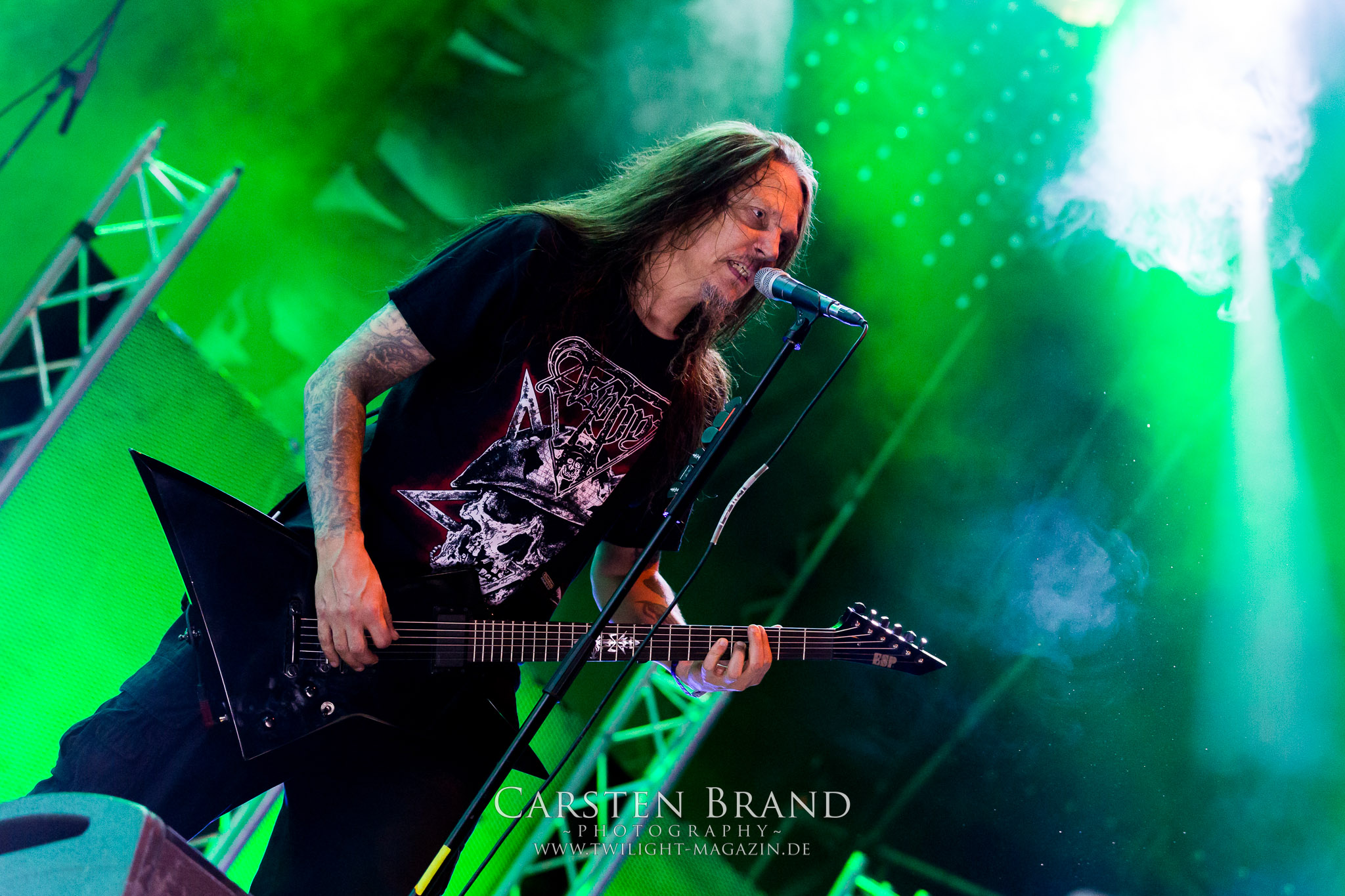 BELPHEGOR schwimmen seit ihrem letzten Album „Totenritual“ gerade auf einer Black Metal-Erfolgswelle und sind damit zu Recht der Donnerstags-Headliner. Diesem Status werden sie auch gerecht und haben eine ordentliche Feuershow aufgefahren. Leider wirkt diese etwas asynchron und nicht unbedingt auf die Songs abgestimmt. So gehen bei ruhigen Passagen mehrmals recht plötzlich mehrere Feuerfontänen los, die man eher in den Blastbeat-Passagen erwartet hätte. Insgesamt ist die Show etwas basslastig, macht aber mit dem Fokus auf die neueren Werke trotzdem keine Gefangenen. Allerdings verschwindet die Band dann recht frühzeitig von der Bühne, obwohl noch Zeit für einen weiteren Klassiker gewesen wäre. (MS) Ich muss mich an dieser Stelle einmal mehr outen, dass neben Celtic Frost auch deren Vorläufer Hellhammer während und auch nach meiner intensiven Metal-Sozialisation an mir vorbei gegangen sind und die Musik von Tom G. Warrior und seinen Mannen nicht einmal ansatzweise die Bedeutung für mich hat, wie für die meisten Die-Hards, die die Hellhammer-Darbietung vermutlich seit Jahrzehnten erfleht haben. Doch wo, wenn nicht auf´s PARTY.SAN METAL OPEN AIR gehört dieser Gig, haben die Eidgenossen doch locker drei Generationen von Extrem-Metalbands, die sich seit 25 Jahren auf dem Festival die Klinke in die Hand geben, mehr oder weniger stark beeinflusst. Auch wenn ich die historische Tragweite emotional nicht in Gänze nachfühlen kann, so komme ich objektiv mit dem Material und der Darbietung wesentlich besser klar, als mit Celtic Frost bzw. Tryptikon. Ein Anbeter von Hellhammer, Celtic Frost & Co. werde ich in diesem Leben aber dennoch nicht mehr. Da gehen bei HYPOCRISY die Gäule zu noch späterer Stunde wesentlich mehr mit mir durch. (JD) Die alten Recken HYPOCRISY rund um Mastermind Peter Tägtgren legen keinen Wert auf komplexe Showelemente und kommen ohne Feuereffekte aus. Während „Fractured Millennium“ noch etwas holprig aus den Boxen kommt, ist bei der zu erwarteten Zugabe „Roswell 47“ die Hütte auch ohne Flammenunterstützung ordentlich am Brennen. (MS)