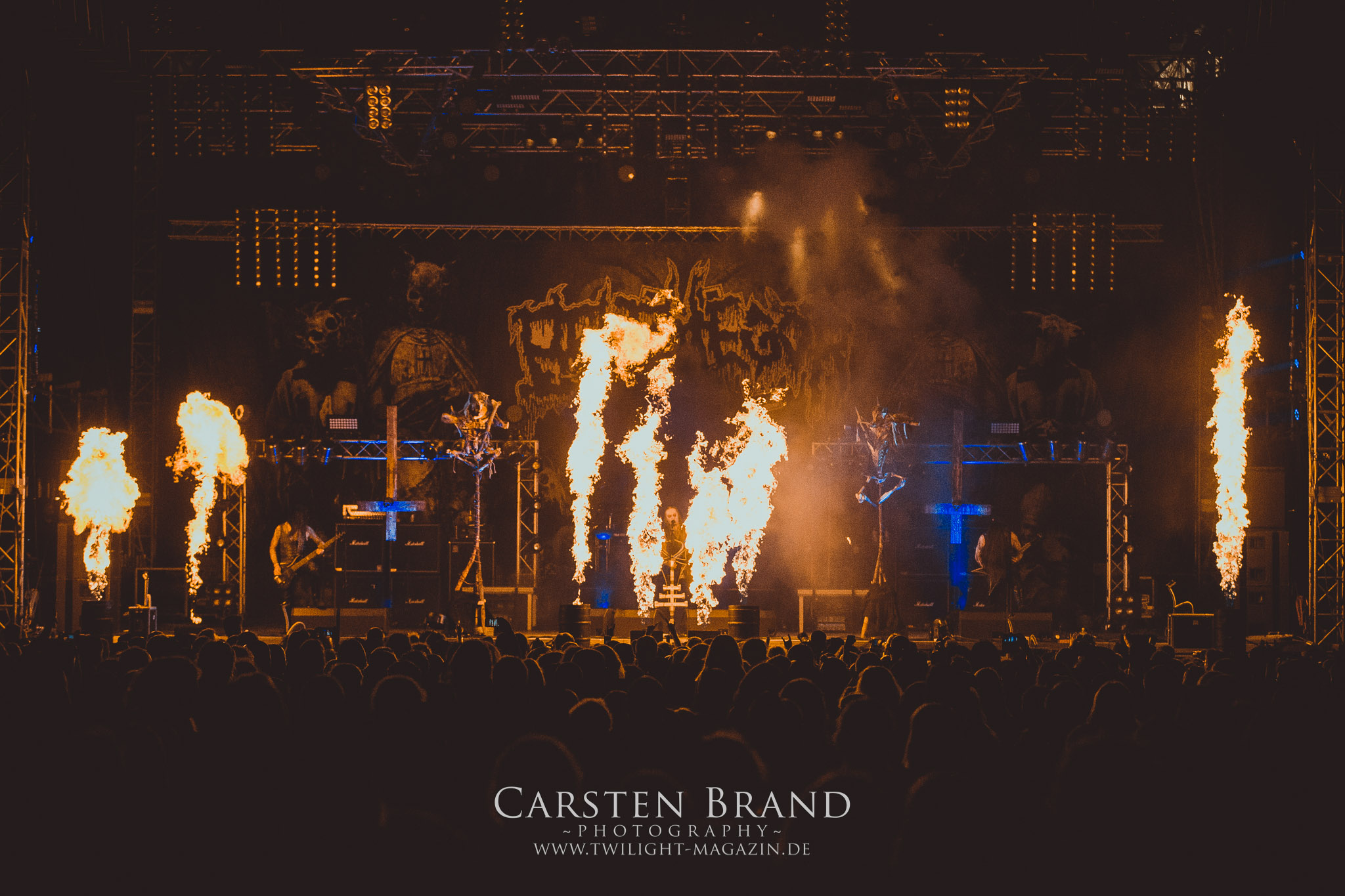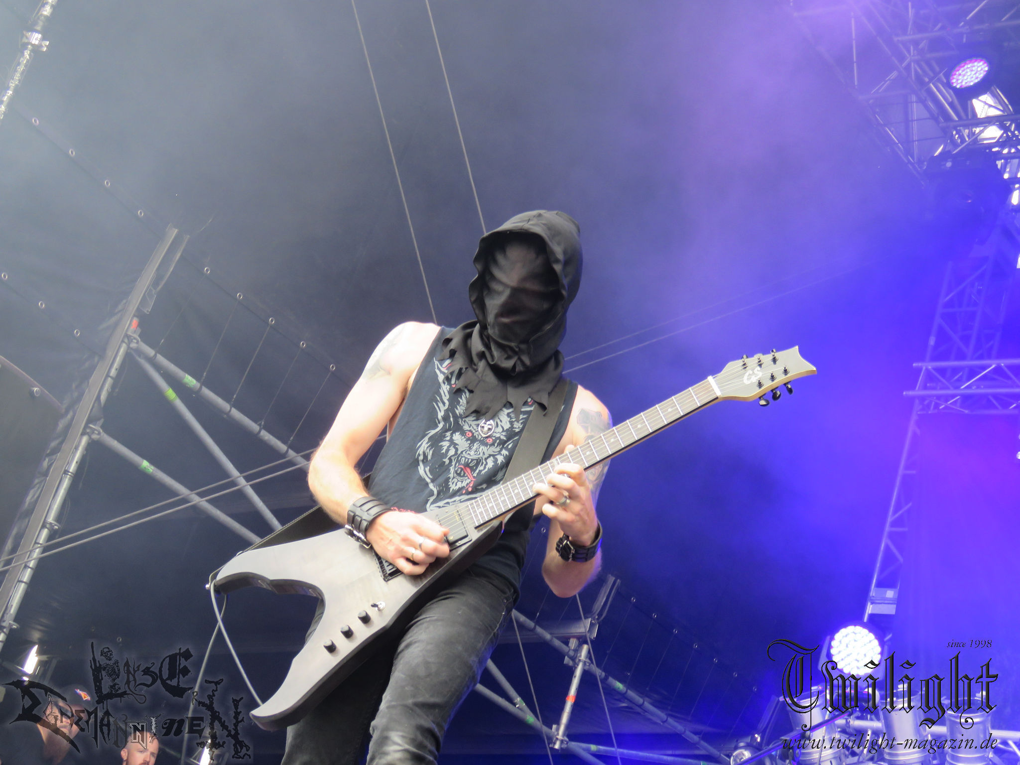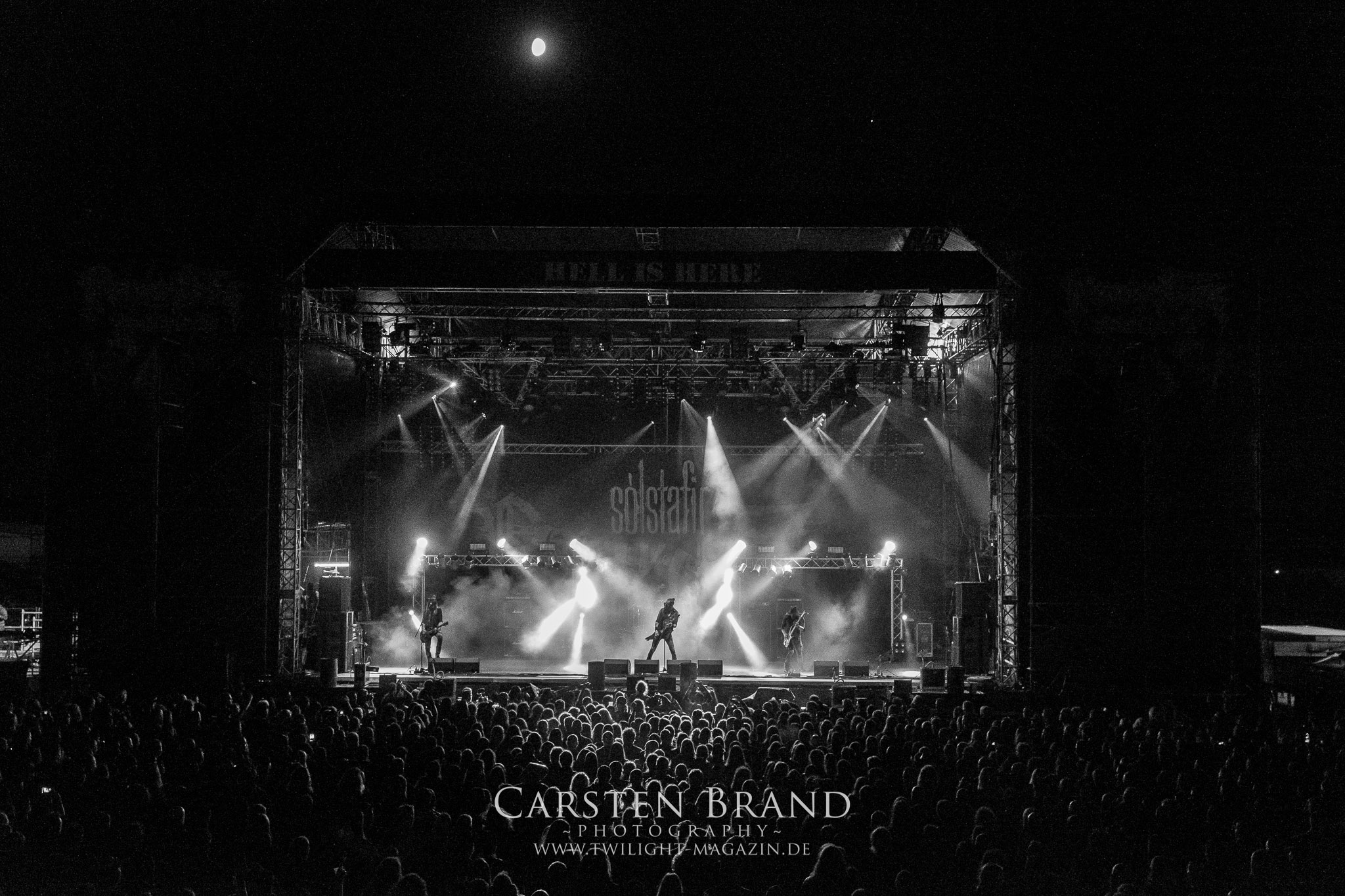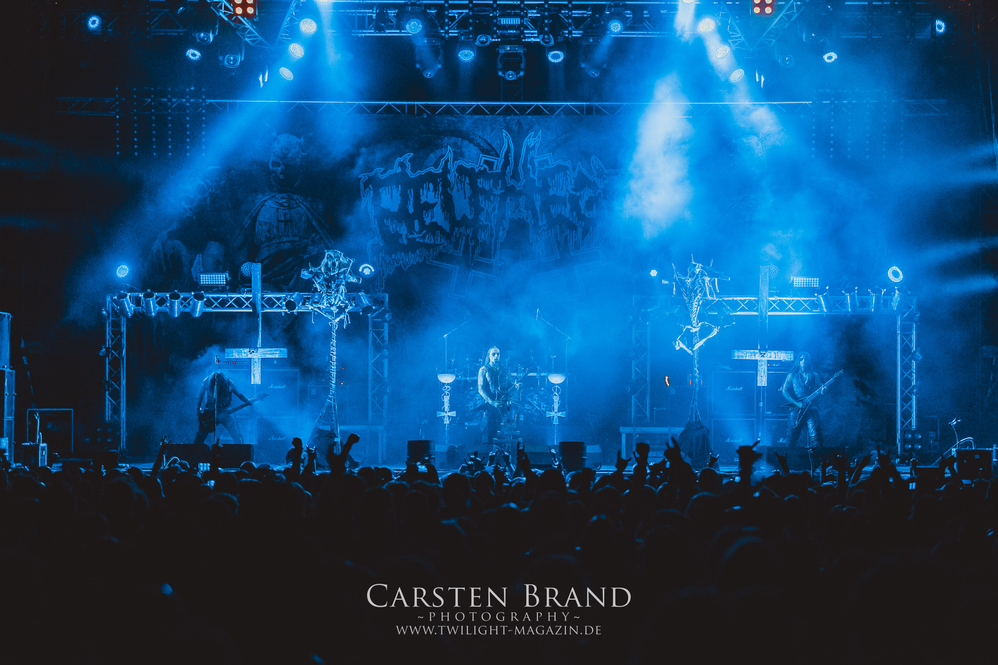 BELPHEGOR schwimmen seit ihrem letzten Album „Totenritual“ gerade auf einer Black Metal-Erfolgswelle und sind damit zu Recht der Donnerstags-Headliner. Diesem Status werden sie auch gerecht und haben eine ordentliche Feuershow aufgefahren. Leider wirkt diese etwas asynchron und nicht unbedingt auf die Songs abgestimmt. So gehen bei ruhigen Passagen mehrmals recht plötzlich mehrere Feuerfontänen los, die man eher in den Blastbeat-Passagen erwartet hätte. Insgesamt ist die Show etwas basslastig, macht aber mit dem Fokus auf die neueren Werke trotzdem keine Gefangenen. Allerdings verschwindet die Band dann recht frühzeitig von der Bühne, obwohl noch Zeit für einen weiteren Klassiker gewesen wäre. (MS) Ich muss mich an dieser Stelle einmal mehr outen, dass neben Celtic Frost auch deren Vorläufer Hellhammer während und auch nach meiner intensiven Metal-Sozialisation an mir vorbei gegangen sind und die Musik von Tom G. Warrior und seinen Mannen nicht einmal ansatzweise die Bedeutung für mich hat, wie für die meisten Die-Hards, die die Hellhammer-Darbietung vermutlich seit Jahrzehnten erfleht haben. Doch wo, wenn nicht auf´s PARTY.SAN METAL OPEN AIR gehört dieser Gig, haben die Eidgenossen doch locker drei Generationen von Extrem-Metalbands, die sich seit 25 Jahren auf dem Festival die Klinke in die Hand geben, mehr oder weniger stark beeinflusst. Auch wenn ich die historische Tragweite emotional nicht in Gänze nachfühlen kann, so komme ich objektiv mit dem Material und der Darbietung wesentlich besser klar, als mit Celtic Frost bzw. Tryptikon. Ein Anbeter von Hellhammer, Celtic Frost & Co. werde ich in diesem Leben aber dennoch nicht mehr. Da gehen bei HYPOCRISY die Gäule zu noch späterer Stunde wesentlich mehr mit mir durch. (JD) Die alten Recken HYPOCRISY rund um Mastermind Peter Tägtgren legen keinen Wert auf komplexe Showelemente und kommen ohne Feuereffekte aus. Während „Fractured Millennium“ noch etwas holprig aus den Boxen kommt, ist bei der zu erwarteten Zugabe „Roswell 47“ die Hütte auch ohne Flammenunterstützung ordentlich am Brennen. (MS)