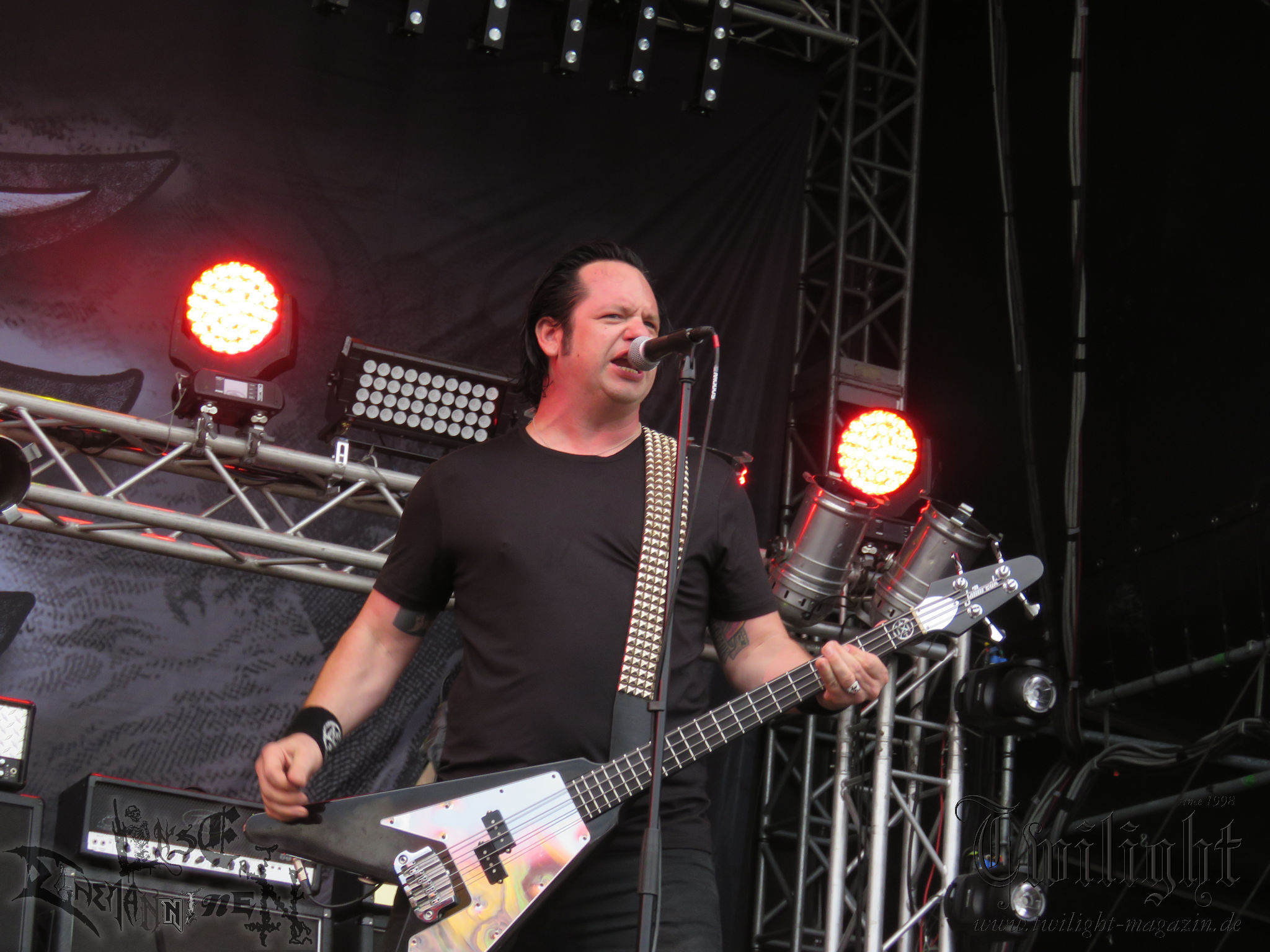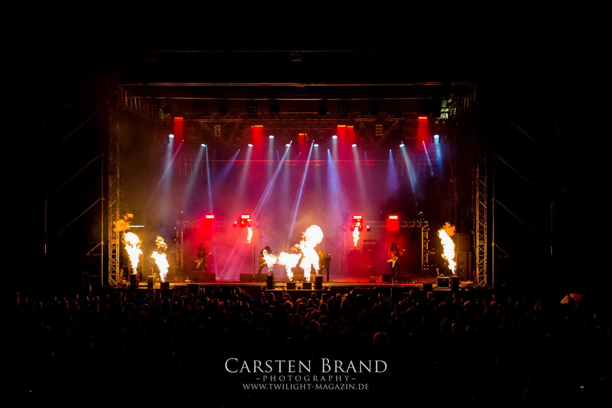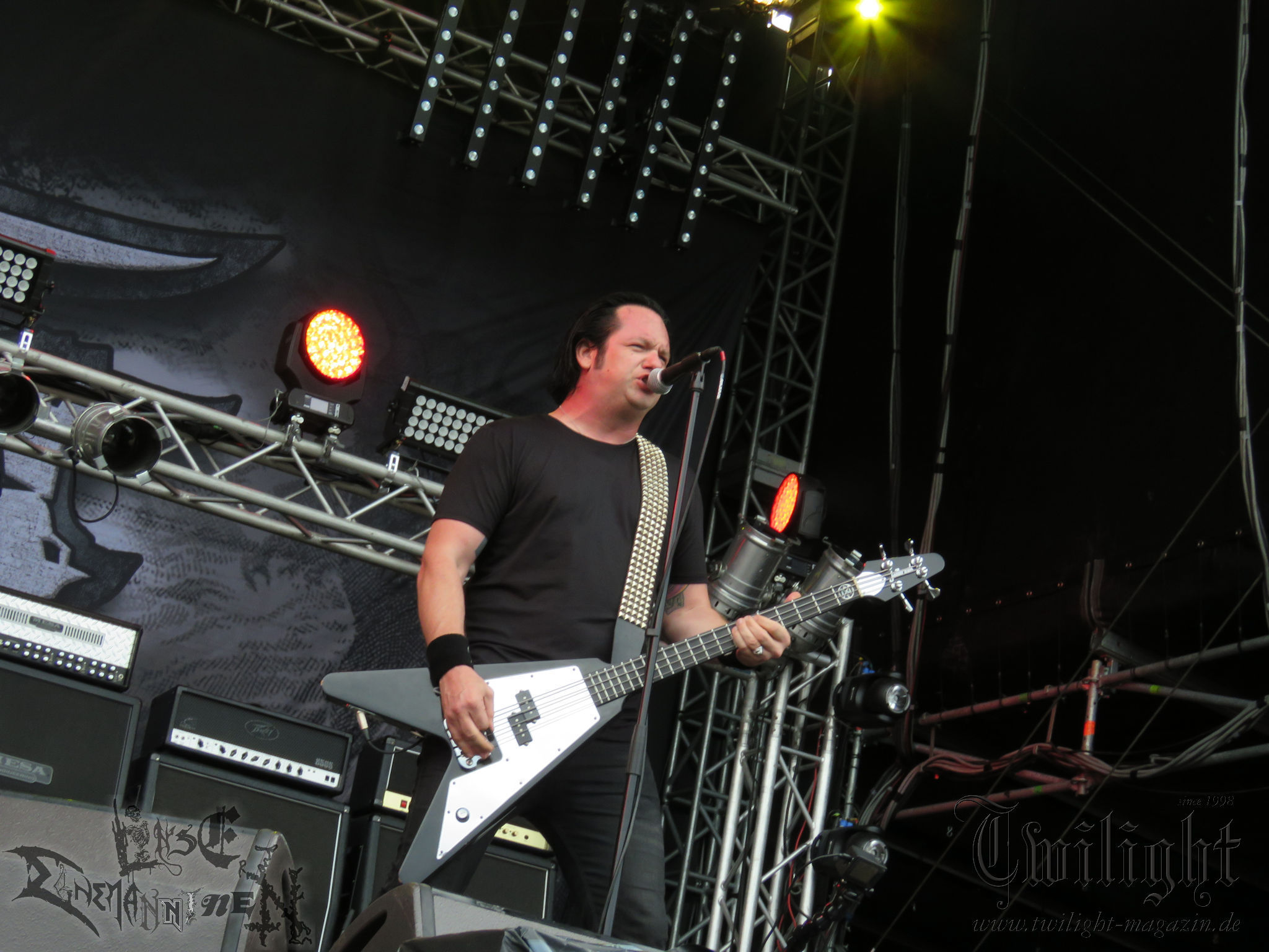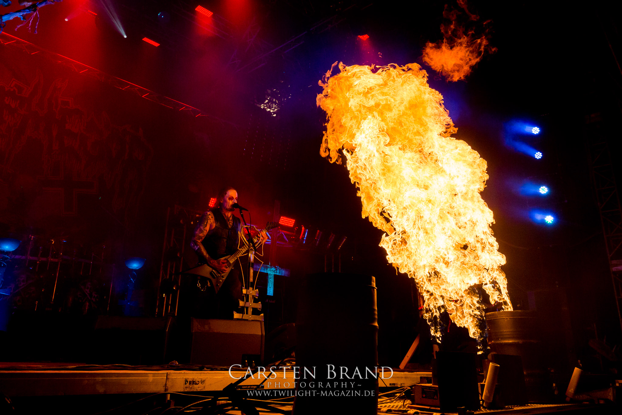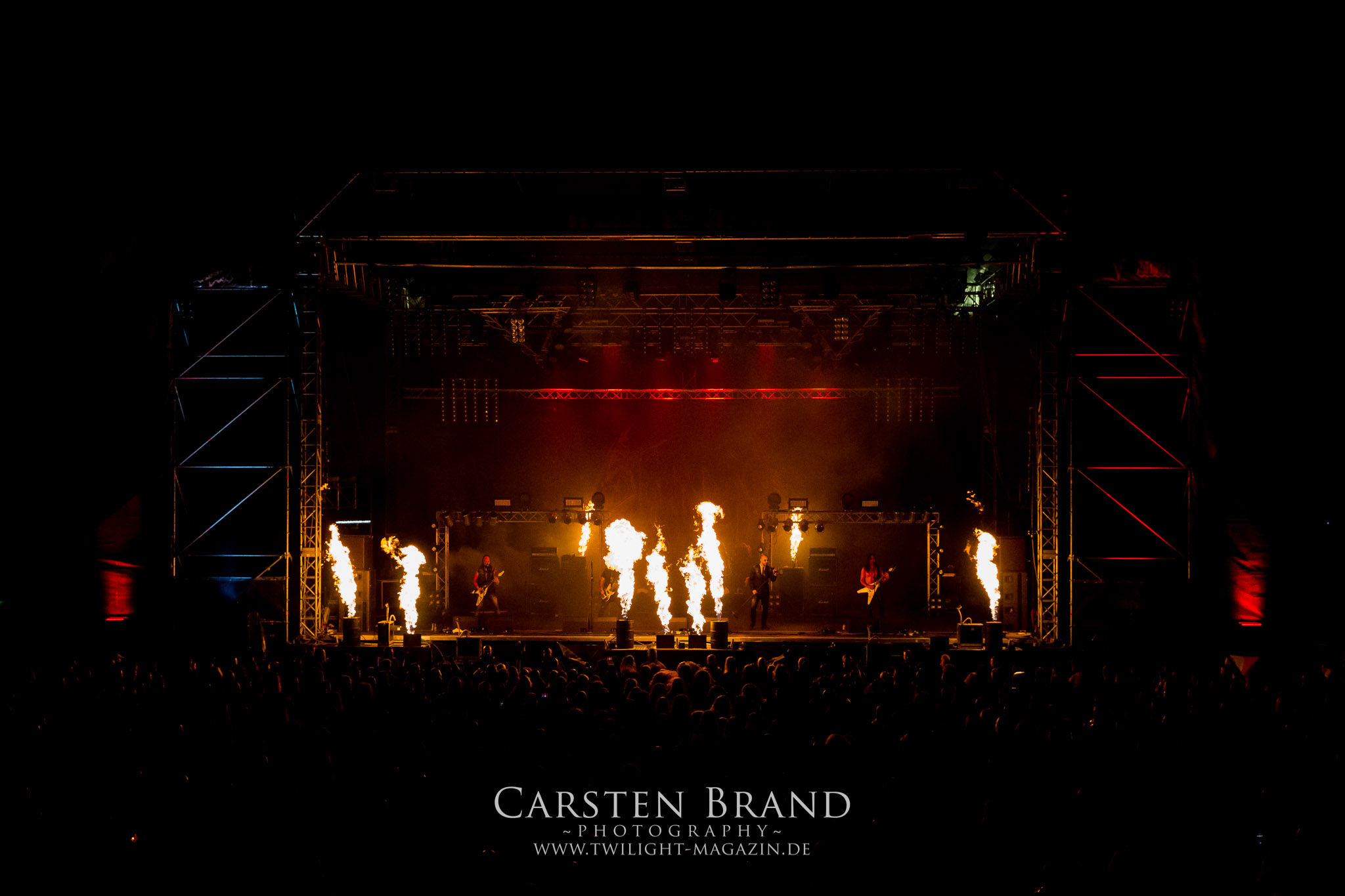 BELPHEGOR schwimmen seit ihrem letzten Album „Totenritual“ gerade auf einer Black Metal-Erfolgswelle und sind damit zu Recht der Donnerstags-Headliner. Diesem Status werden sie auch gerecht und haben eine ordentliche Feuershow aufgefahren. Leider wirkt diese etwas asynchron und nicht unbedingt auf die Songs abgestimmt. So gehen bei ruhigen Passagen mehrmals recht plötzlich mehrere Feuerfontänen los, die man eher in den Blastbeat-Passagen erwartet hätte. Insgesamt ist die Show etwas basslastig, macht aber mit dem Fokus auf die neueren Werke trotzdem keine Gefangenen. Allerdings verschwindet die Band dann recht frühzeitig von der Bühne, obwohl noch Zeit für einen weiteren Klassiker gewesen wäre. (MS) Ich muss mich an dieser Stelle einmal mehr outen, dass neben Celtic Frost auch deren Vorläufer Hellhammer während und auch nach meiner intensiven Metal-Sozialisation an mir vorbei gegangen sind und die Musik von Tom G. Warrior und seinen Mannen nicht einmal ansatzweise die Bedeutung für mich hat, wie für die meisten Die-Hards, die die Hellhammer-Darbietung vermutlich seit Jahrzehnten erfleht haben. Doch wo, wenn nicht auf´s PARTY.SAN METAL OPEN AIR gehört dieser Gig, haben die Eidgenossen doch locker drei Generationen von Extrem-Metalbands, die sich seit 25 Jahren auf dem Festival die Klinke in die Hand geben, mehr oder weniger stark beeinflusst. Auch wenn ich die historische Tragweite emotional nicht in Gänze nachfühlen kann, so komme ich objektiv mit dem Material und der Darbietung wesentlich besser klar, als mit Celtic Frost bzw. Tryptikon. Ein Anbeter von Hellhammer, Celtic Frost & Co. werde ich in diesem Leben aber dennoch nicht mehr. Da gehen bei HYPOCRISY die Gäule zu noch späterer Stunde wesentlich mehr mit mir durch. (JD) Die alten Recken HYPOCRISY rund um Mastermind Peter Tägtgren legen keinen Wert auf komplexe Showelemente und kommen ohne Feuereffekte aus. Während „Fractured Millennium“ noch etwas holprig aus den Boxen kommt, ist bei der zu erwarteten Zugabe „Roswell 47“ die Hütte auch ohne Flammenunterstützung ordentlich am Brennen. (MS)