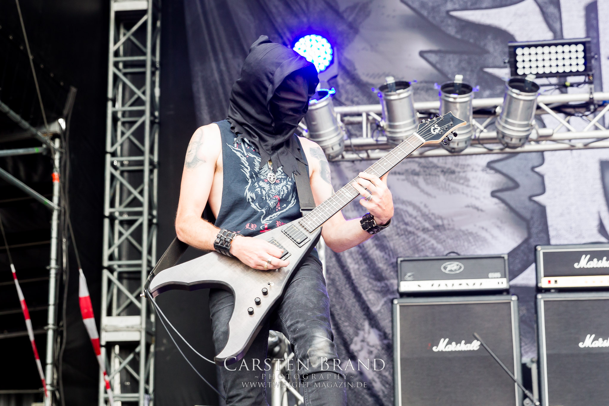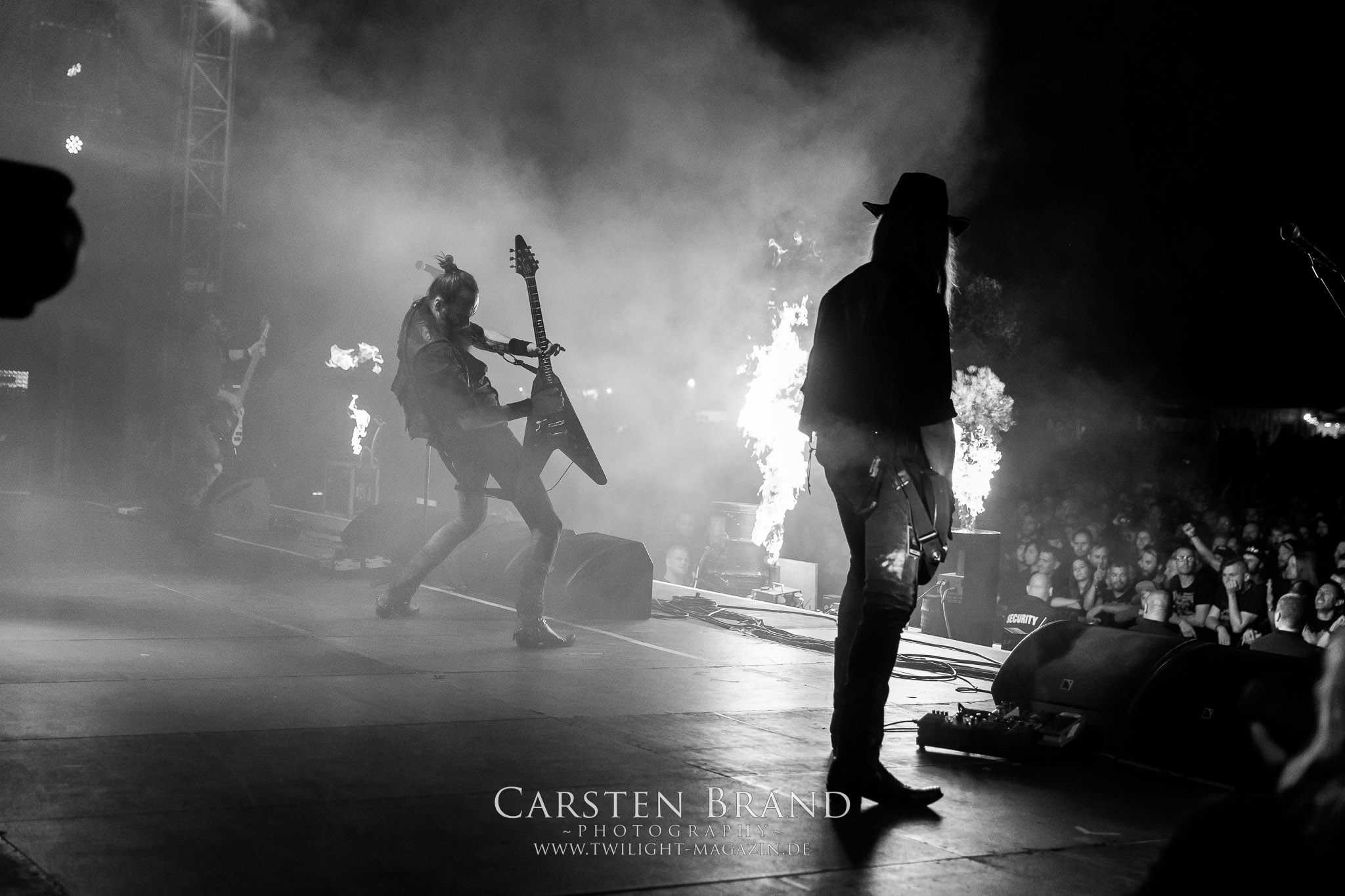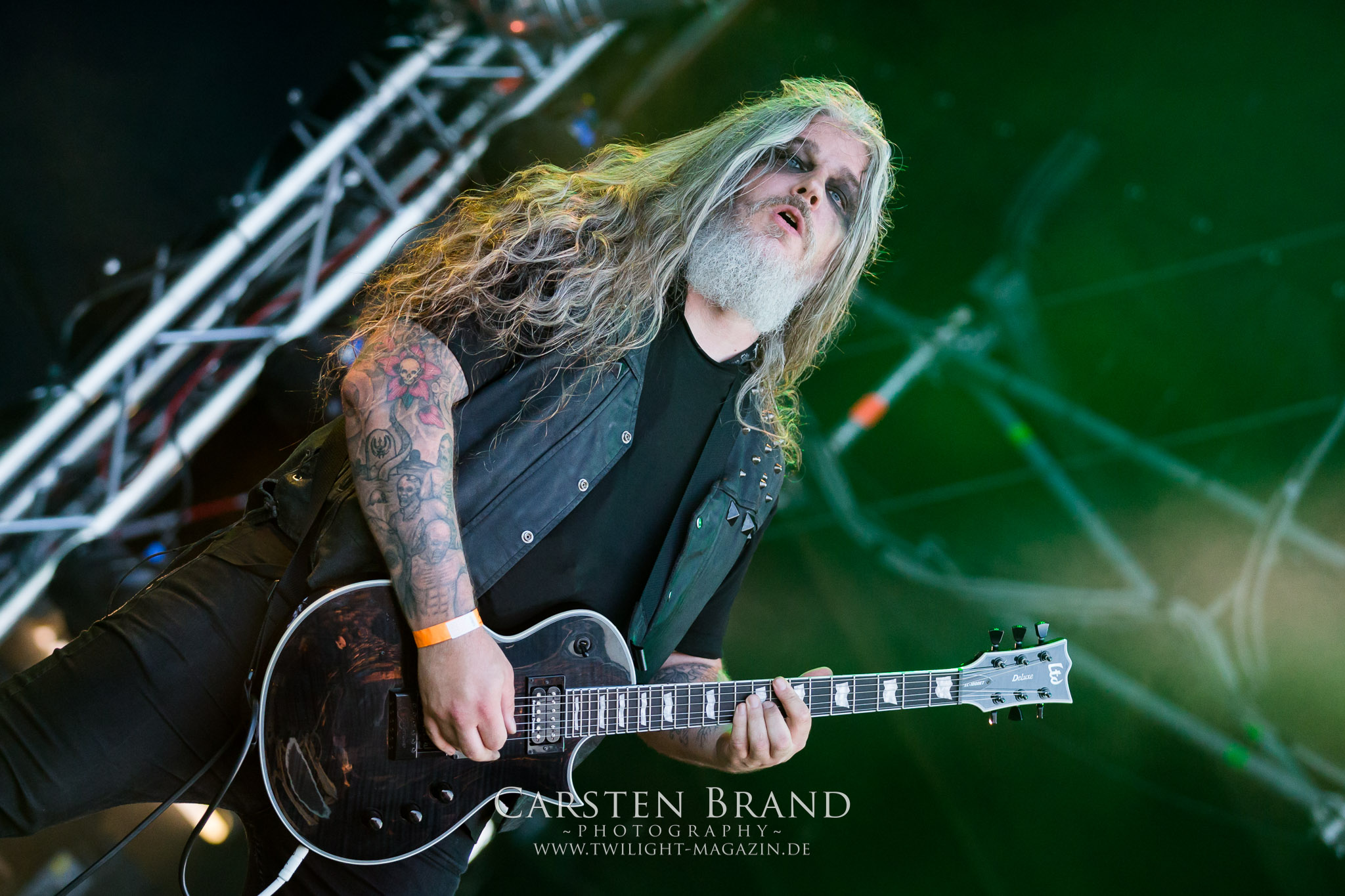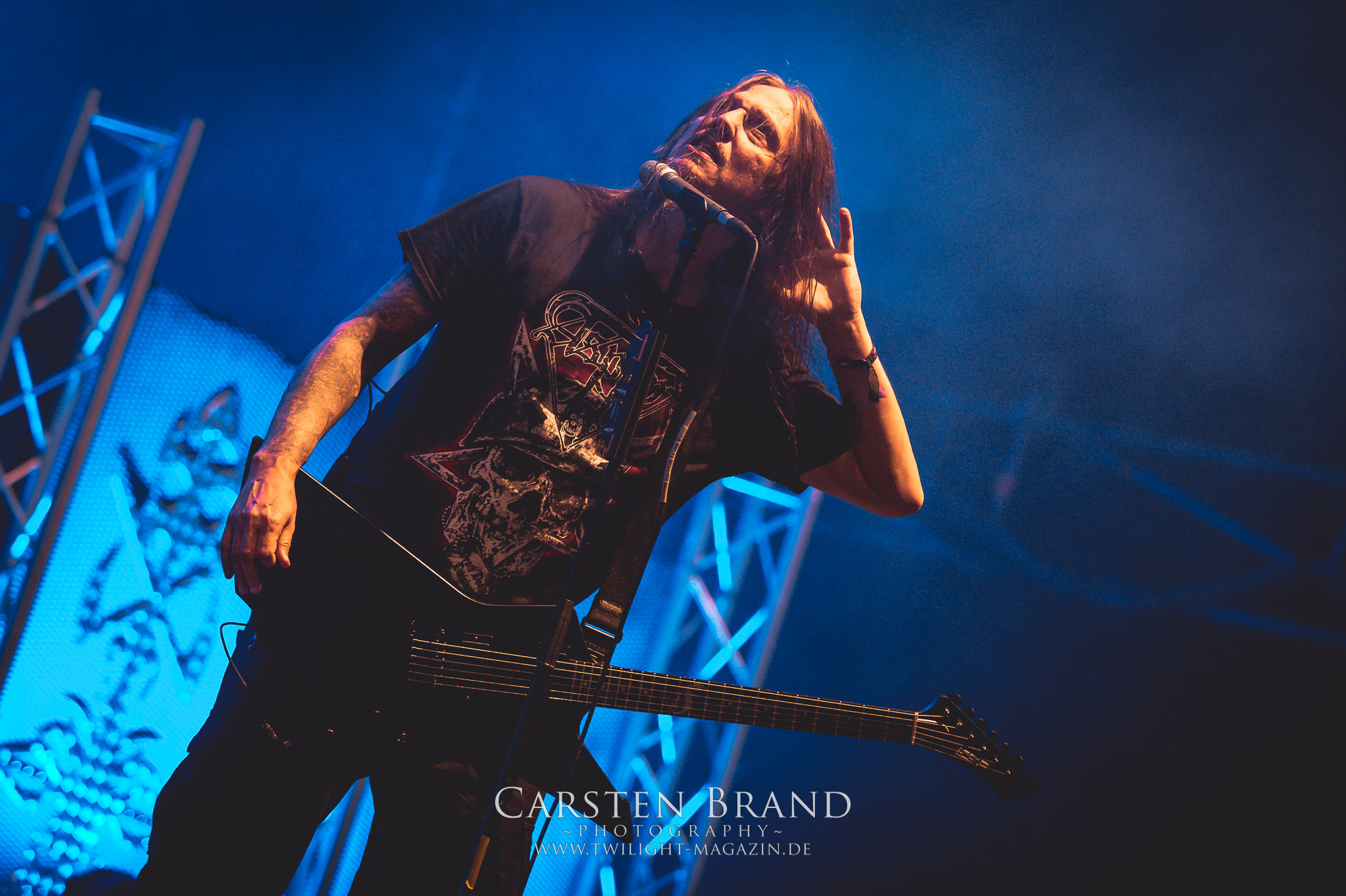 BELPHEGOR schwimmen seit ihrem letzten Album „Totenritual“ gerade auf einer Black Metal-Erfolgswelle und sind damit zu Recht der Donnerstags-Headliner. Diesem Status werden sie auch gerecht und haben eine ordentliche Feuershow aufgefahren. Leider wirkt diese etwas asynchron und nicht unbedingt auf die Songs abgestimmt. So gehen bei ruhigen Passagen mehrmals recht plötzlich mehrere Feuerfontänen los, die man eher in den Blastbeat-Passagen erwartet hätte. Insgesamt ist die Show etwas basslastig, macht aber mit dem Fokus auf die neueren Werke trotzdem keine Gefangenen. Allerdings verschwindet die Band dann recht frühzeitig von der Bühne, obwohl noch Zeit für einen weiteren Klassiker gewesen wäre. (MS) Ich muss mich an dieser Stelle einmal mehr outen, dass neben Celtic Frost auch deren Vorläufer Hellhammer während und auch nach meiner intensiven Metal-Sozialisation an mir vorbei gegangen sind und die Musik von Tom G. Warrior und seinen Mannen nicht einmal ansatzweise die Bedeutung für mich hat, wie für die meisten Die-Hards, die die Hellhammer-Darbietung vermutlich seit Jahrzehnten erfleht haben. Doch wo, wenn nicht auf´s PARTY.SAN METAL OPEN AIR gehört dieser Gig, haben die Eidgenossen doch locker drei Generationen von Extrem-Metalbands, die sich seit 25 Jahren auf dem Festival die Klinke in die Hand geben, mehr oder weniger stark beeinflusst. Auch wenn ich die historische Tragweite emotional nicht in Gänze nachfühlen kann, so komme ich objektiv mit dem Material und der Darbietung wesentlich besser klar, als mit Celtic Frost bzw. Tryptikon. Ein Anbeter von Hellhammer, Celtic Frost & Co. werde ich in diesem Leben aber dennoch nicht mehr. Da gehen bei HYPOCRISY die Gäule zu noch späterer Stunde wesentlich mehr mit mir durch. (JD) Die alten Recken HYPOCRISY rund um Mastermind Peter Tägtgren legen keinen Wert auf komplexe Showelemente und kommen ohne Feuereffekte aus. Während „Fractured Millennium“ noch etwas holprig aus den Boxen kommt, ist bei der zu erwarteten Zugabe „Roswell 47“ die Hütte auch ohne Flammenunterstützung ordentlich am Brennen. (MS)