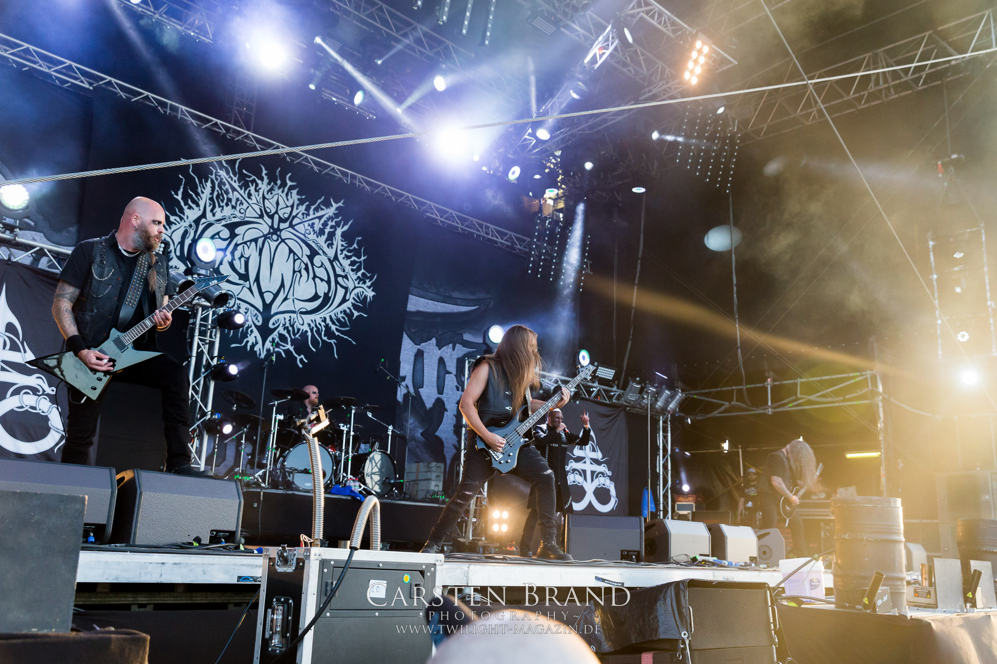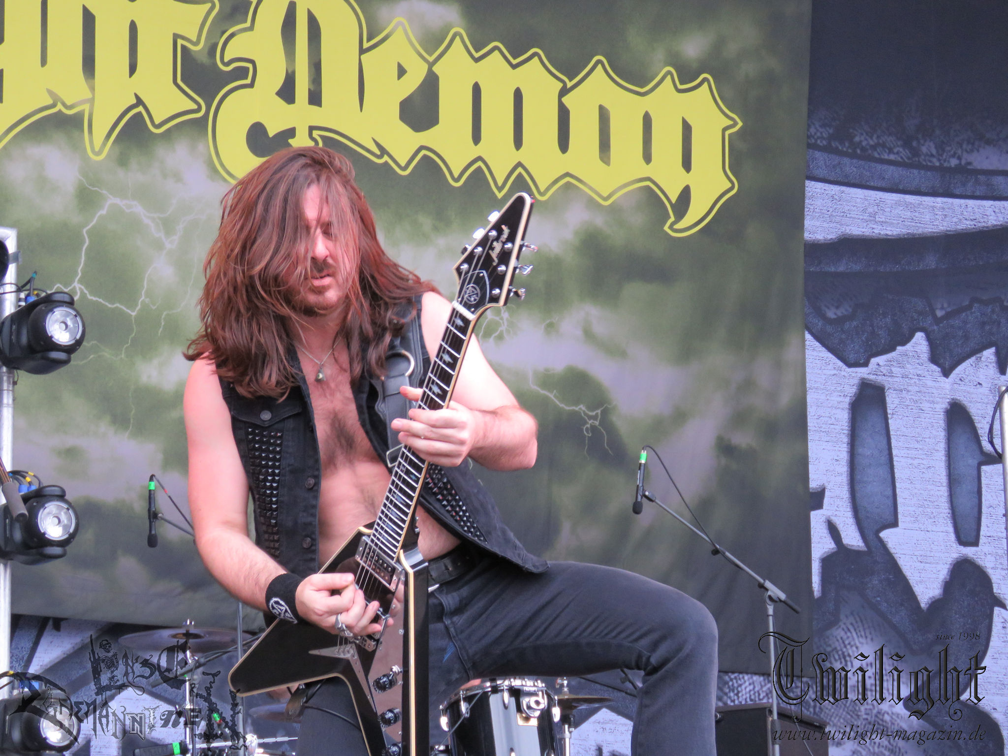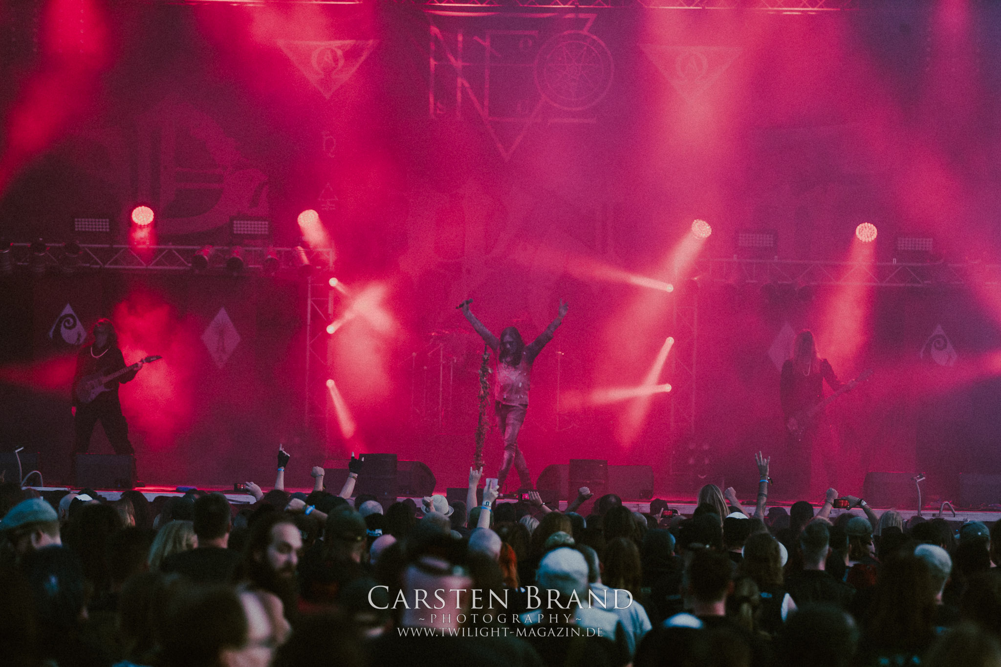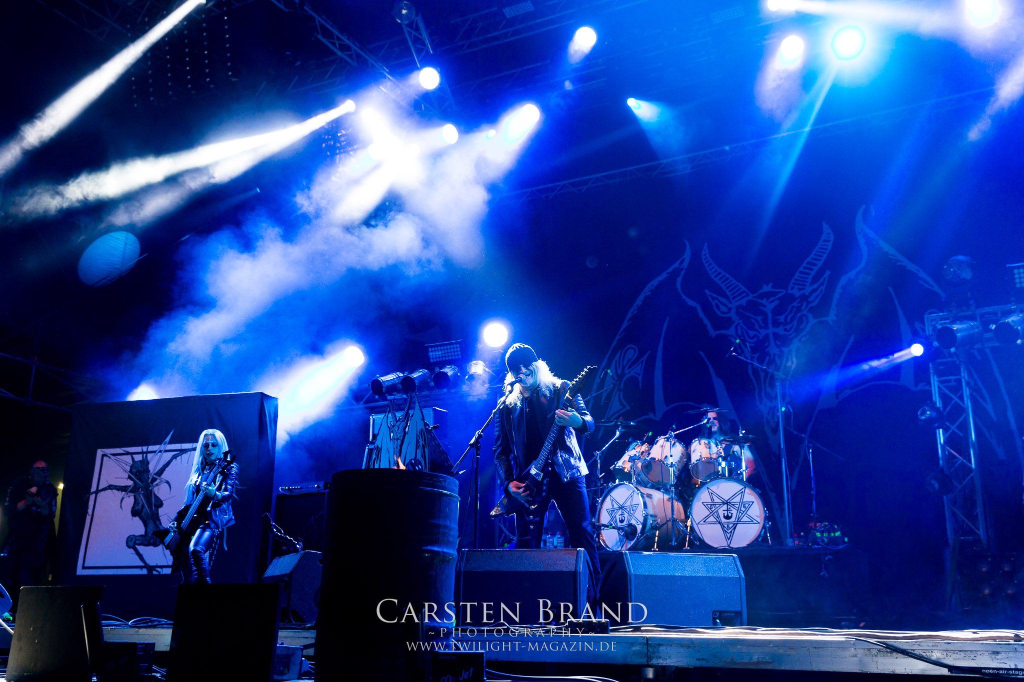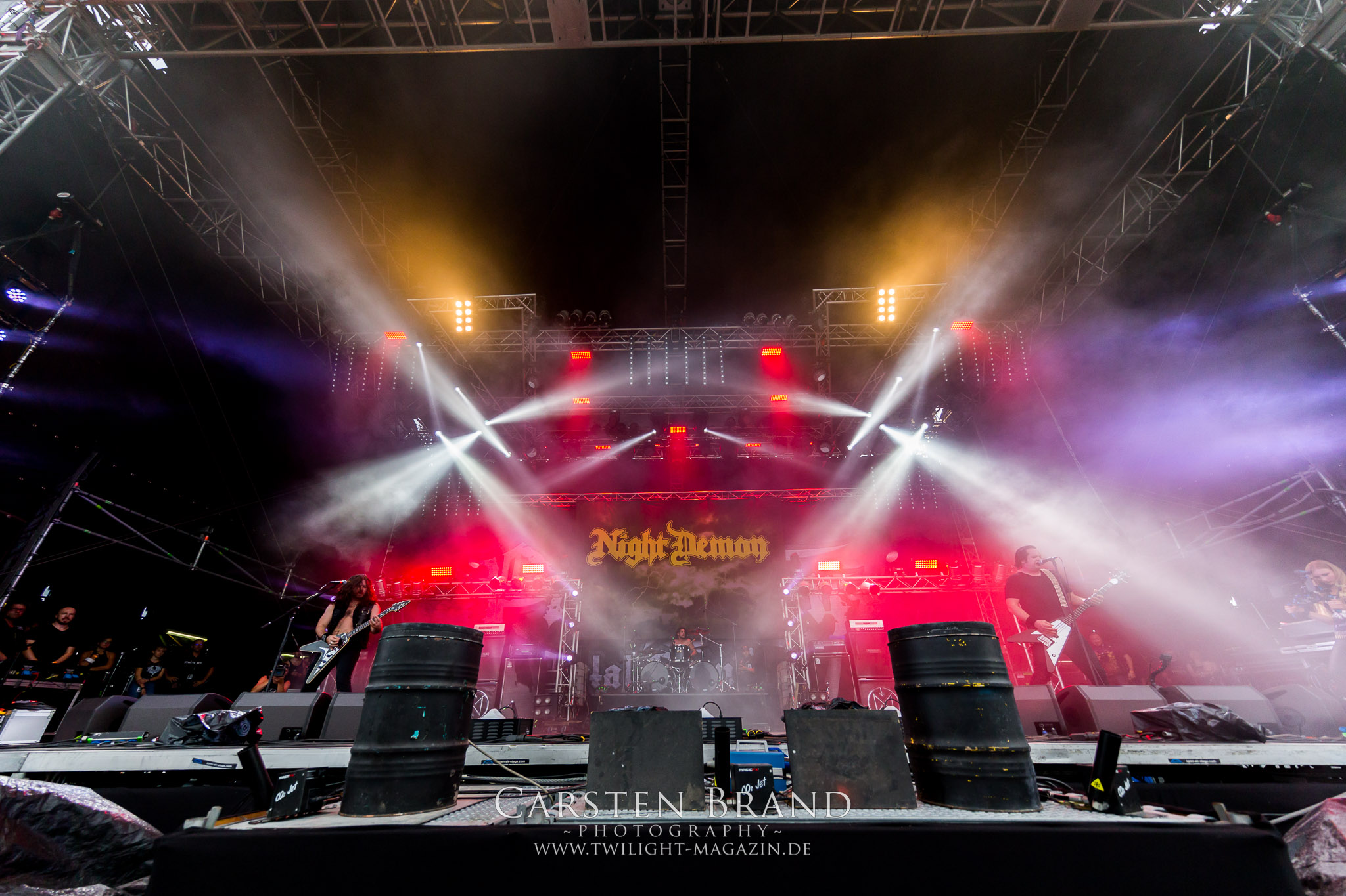 ARKONA aus dem tiefsten Osten sieht man inzwischen gefühlt auf jedem europäischen Festival der härteren Gangart. Vielleicht liegt es an der aufwendigen Bühnenshow mit altertümlichen Instrumenten, Tierfell und Knochenresteverwertung, vielleicht aber auch an der energetischen Sängerin Masha. Auf jeden Fall ist der Bühnenvorplatz immer gut gefüllt und es wird ordentlich mitgesungen, selbst wenn man des Russischen nicht mächtig ist. (MS) NIGHT DEMON machen wie schon vor zwei Jahren eindrucksvoll klar, dass sie als klassische Heavy Metal – Band alles andere als bloßes Beiwerk auf dem Billing sind. Wie schon 2017 funktionieren Night Demon nicht nur musikalisch. Die Band profitiert von ihrer überragenden Live-Qualität und dem starken Song-Material von "Cursed Of The Damned" und "Darkness Remains". Der Maiden-Fan in mir vermisst zwar die "Wasted Years", dafür reißt man mit "Overkill" als Einstieg zu "Dawn Rider" einen Motörhead-Klassiker an. Das muss man auch erstmal so hinbekommen. Night Demon sind motiviert bis in die Haarspitzen und sprudeln über vor metallischer Energie. Selbst am späten Abend ist Frontmann Jarvis Leatherby noch wie ein Duracell-Hase auf dem Gelände anzutreffen.