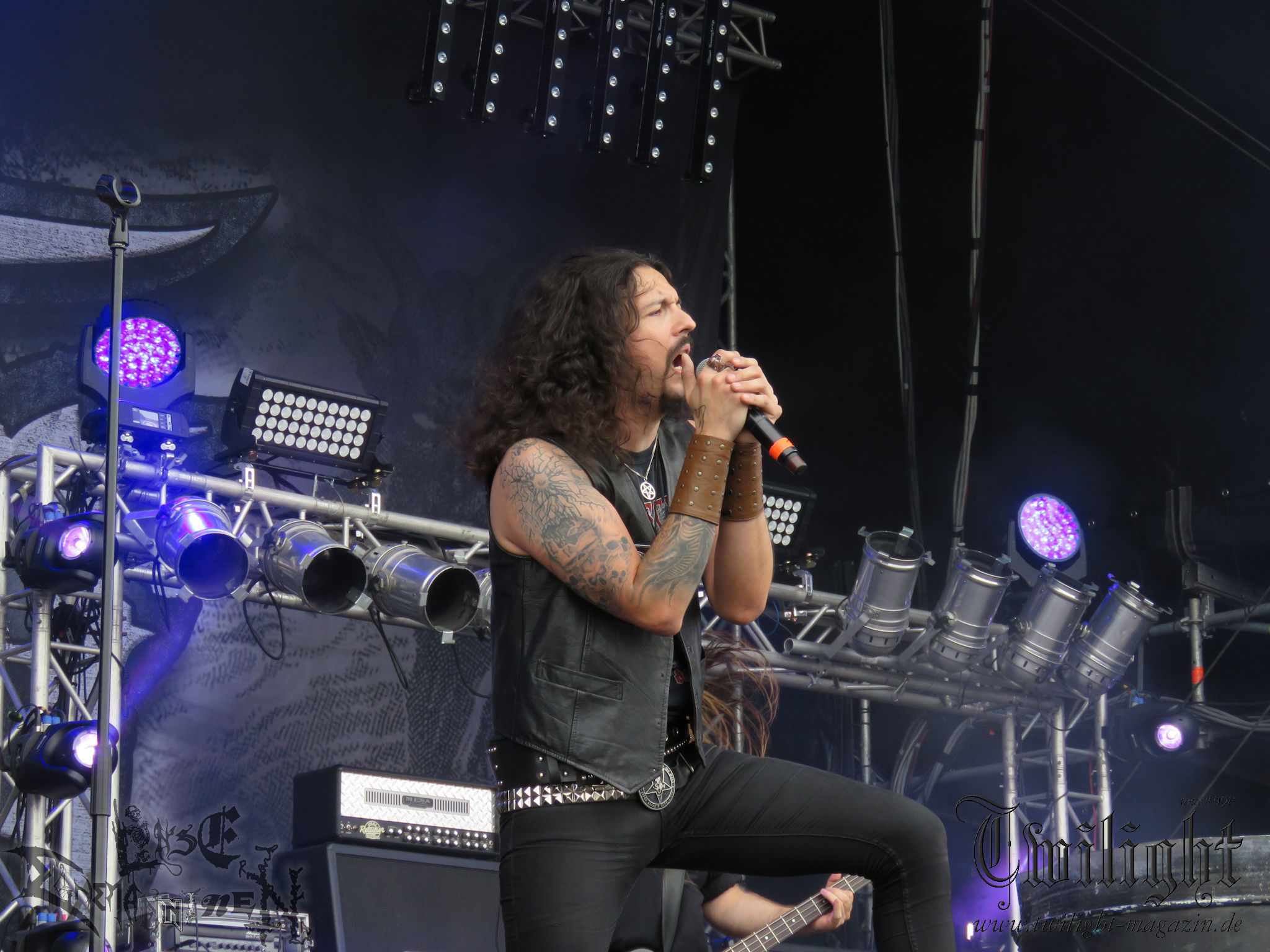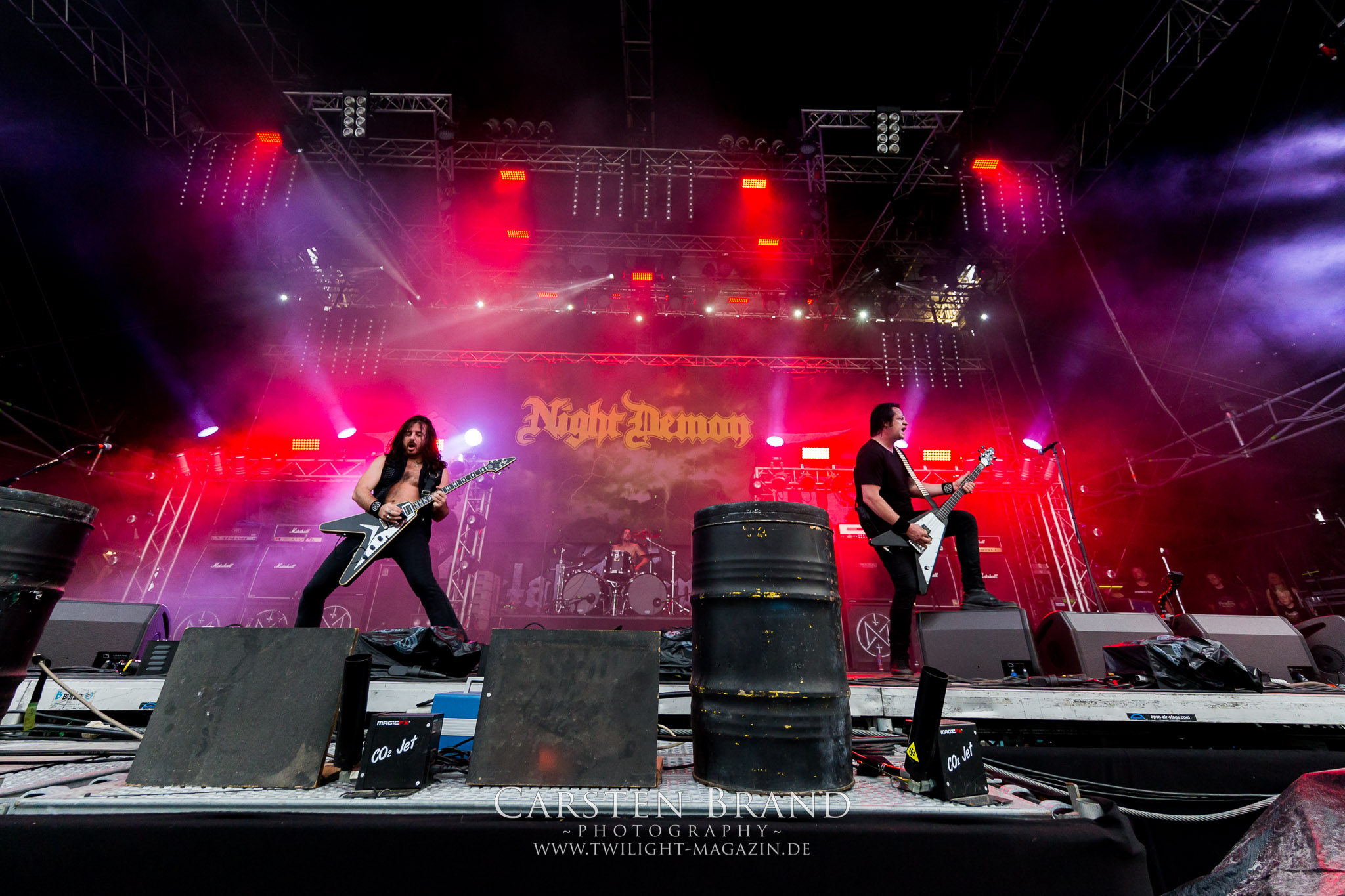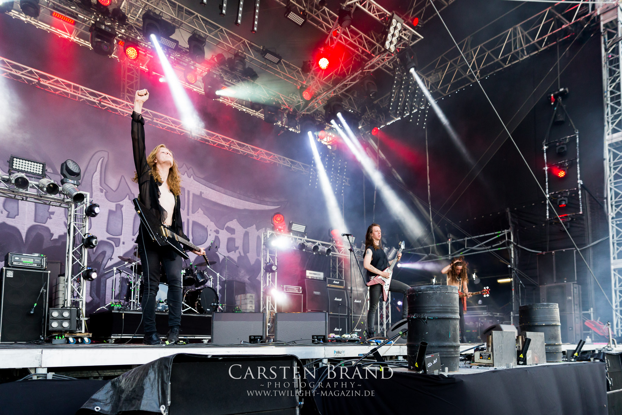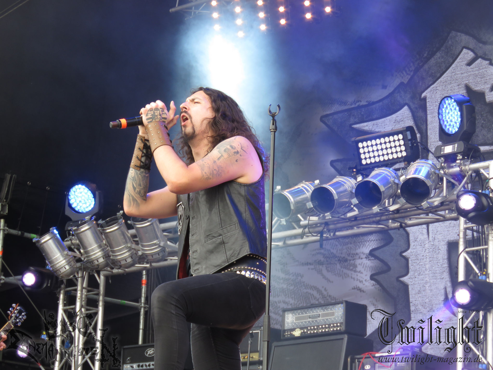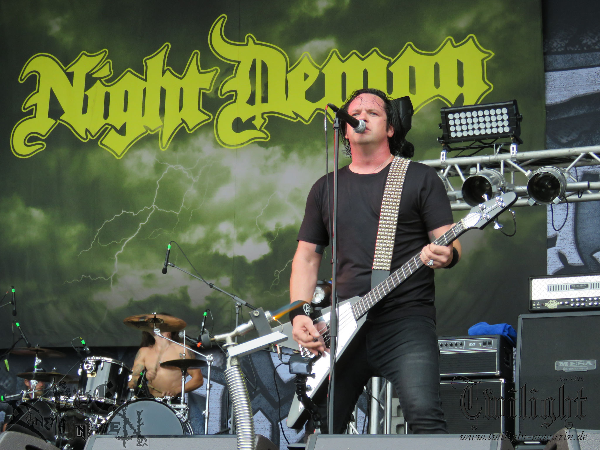 ARKONA aus dem tiefsten Osten sieht man inzwischen gefühlt auf jedem europäischen Festival der härteren Gangart. Vielleicht liegt es an der aufwendigen Bühnenshow mit altertümlichen Instrumenten, Tierfell und Knochenresteverwertung, vielleicht aber auch an der energetischen Sängerin Masha. Auf jeden Fall ist der Bühnenvorplatz immer gut gefüllt und es wird ordentlich mitgesungen, selbst wenn man des Russischen nicht mächtig ist. (MS) NIGHT DEMON machen wie schon vor zwei Jahren eindrucksvoll klar, dass sie als klassische Heavy Metal – Band alles andere als bloßes Beiwerk auf dem Billing sind. Wie schon 2017 funktionieren Night Demon nicht nur musikalisch. Die Band profitiert von ihrer überragenden Live-Qualität und dem starken Song-Material von "Cursed Of The Damned" und "Darkness Remains". Der Maiden-Fan in mir vermisst zwar die "Wasted Years", dafür reißt man mit "Overkill" als Einstieg zu "Dawn Rider" einen Motörhead-Klassiker an. Das muss man auch erstmal so hinbekommen. Night Demon sind motiviert bis in die Haarspitzen und sprudeln über vor metallischer Energie. Selbst am späten Abend ist Frontmann Jarvis Leatherby noch wie ein Duracell-Hase auf dem Gelände anzutreffen.