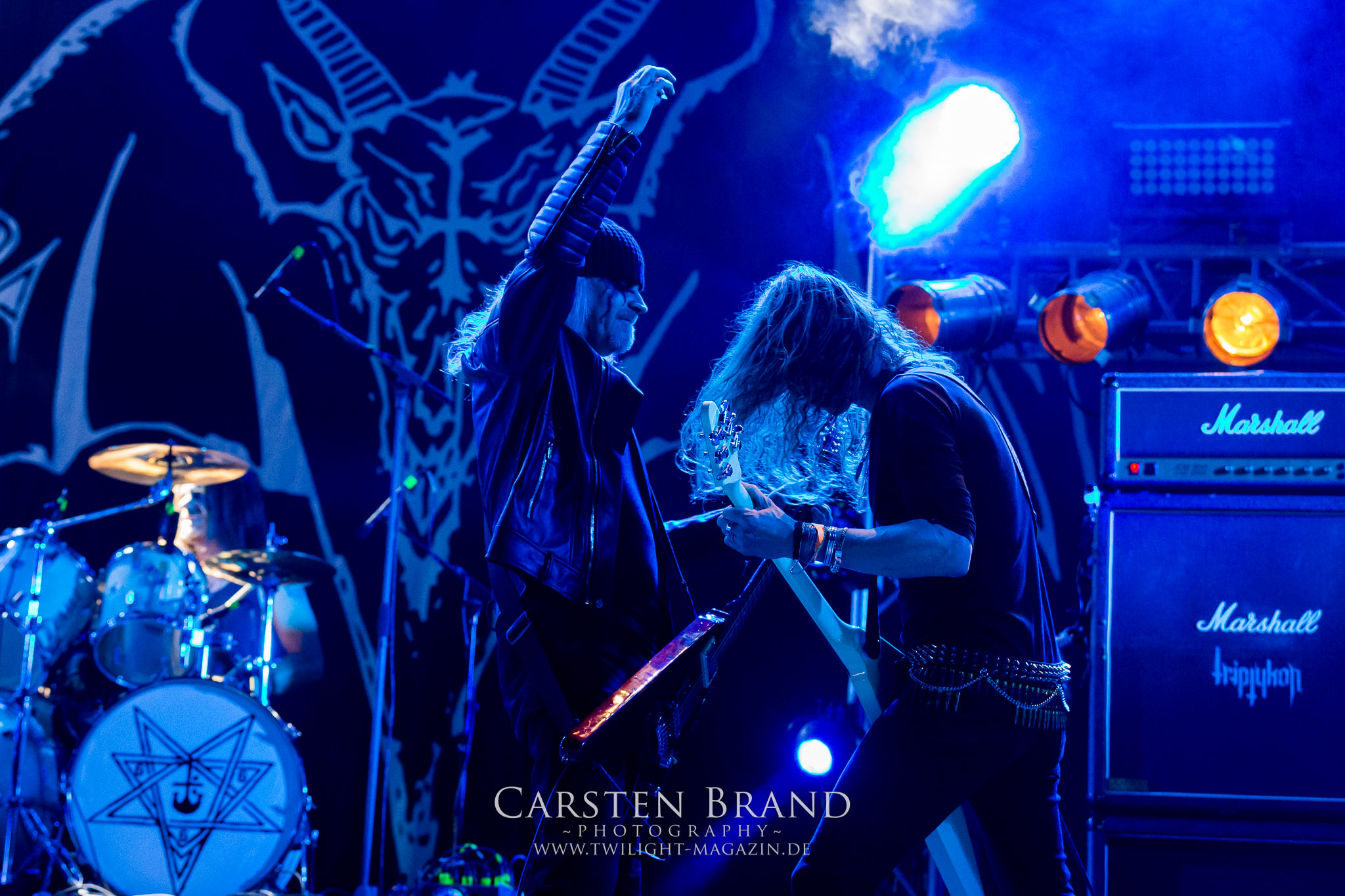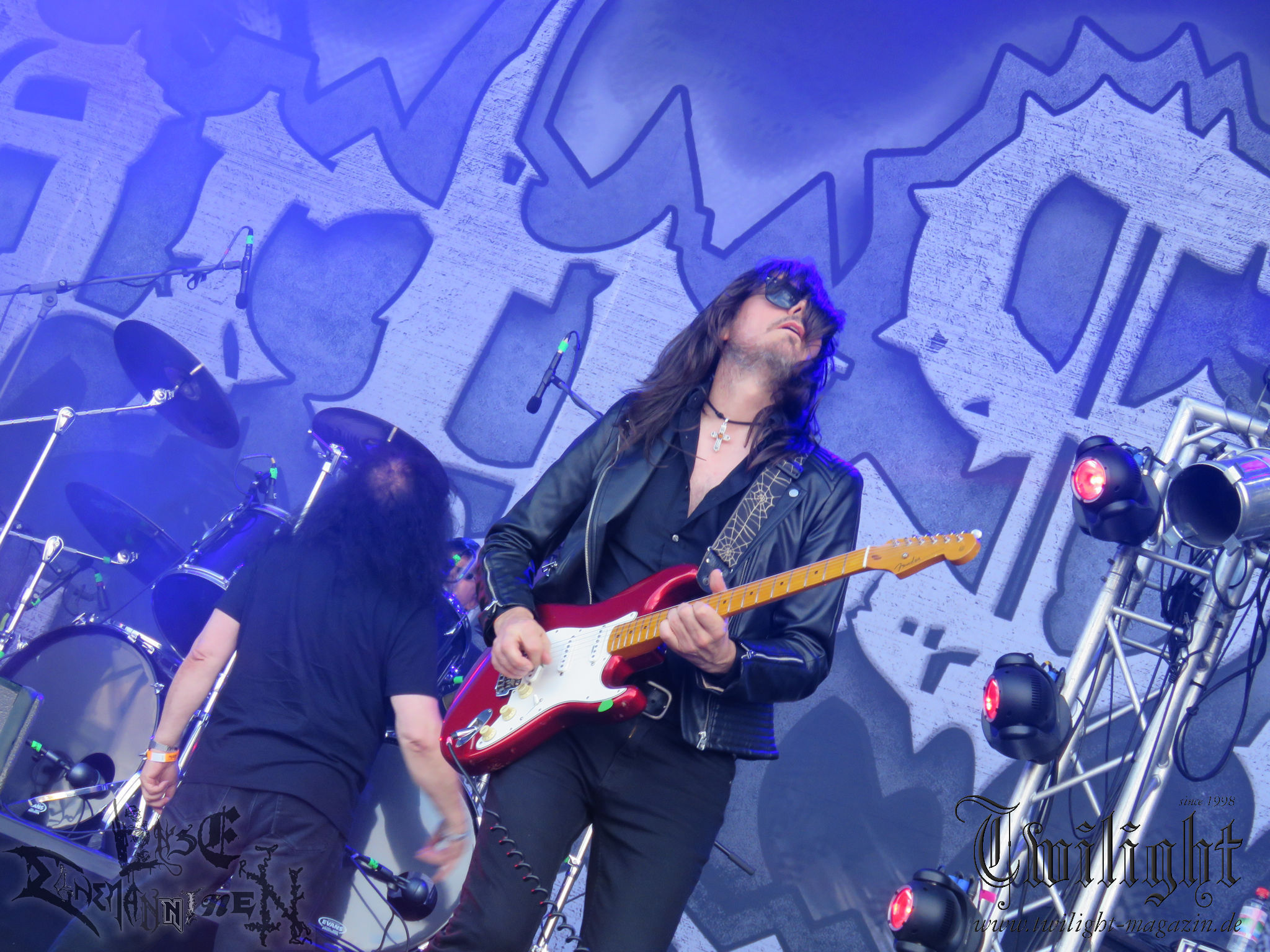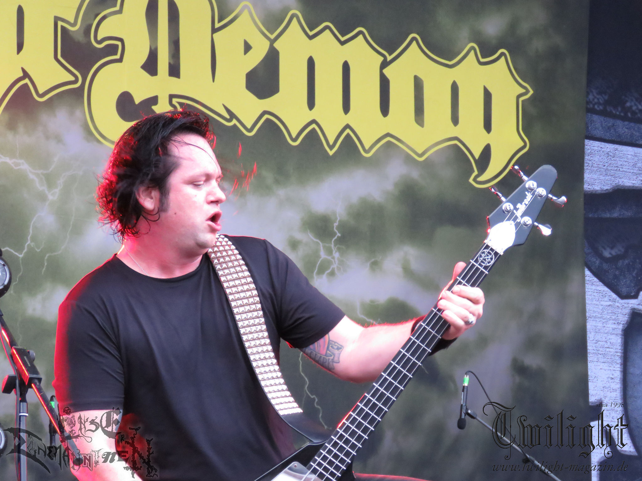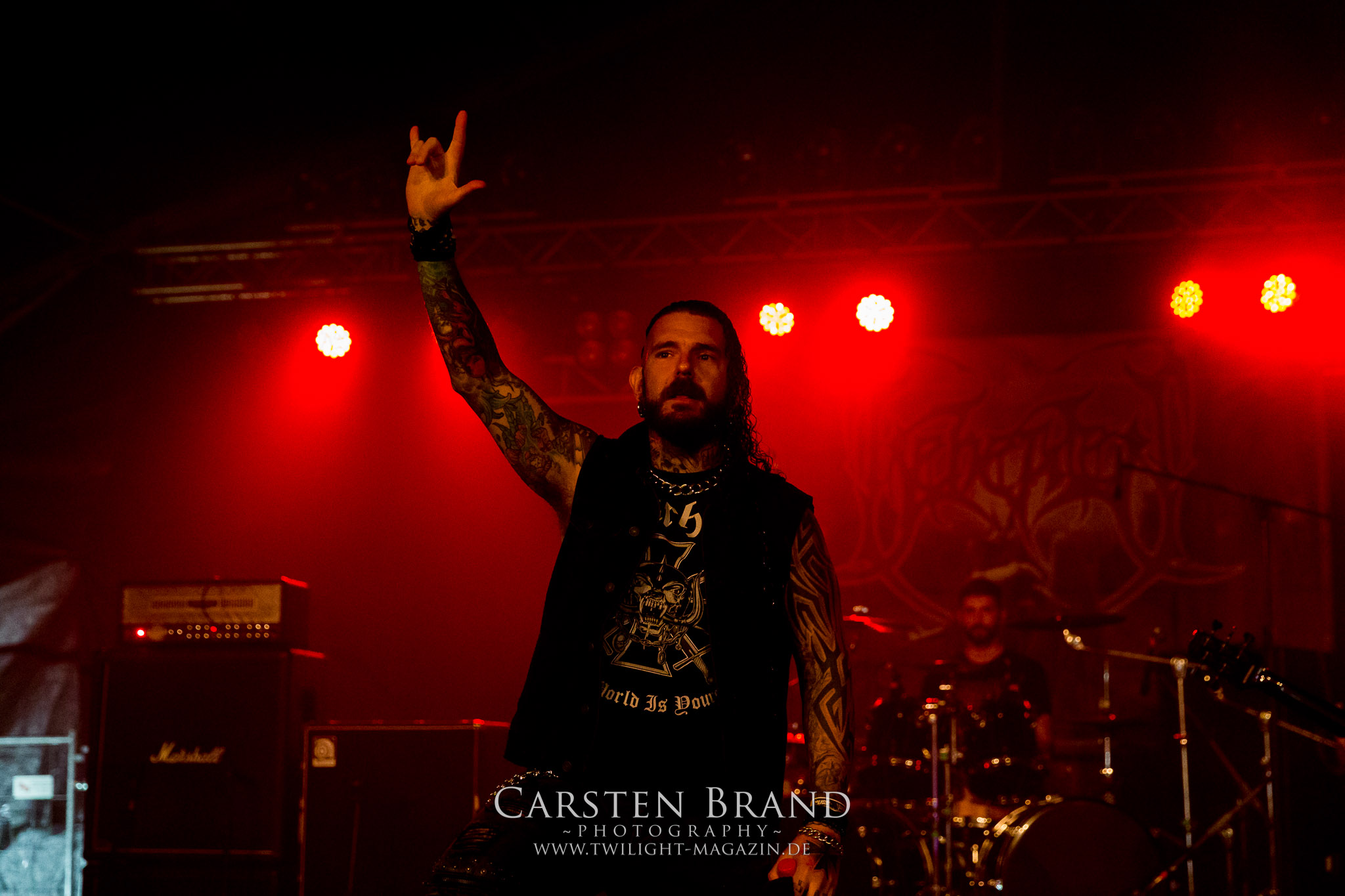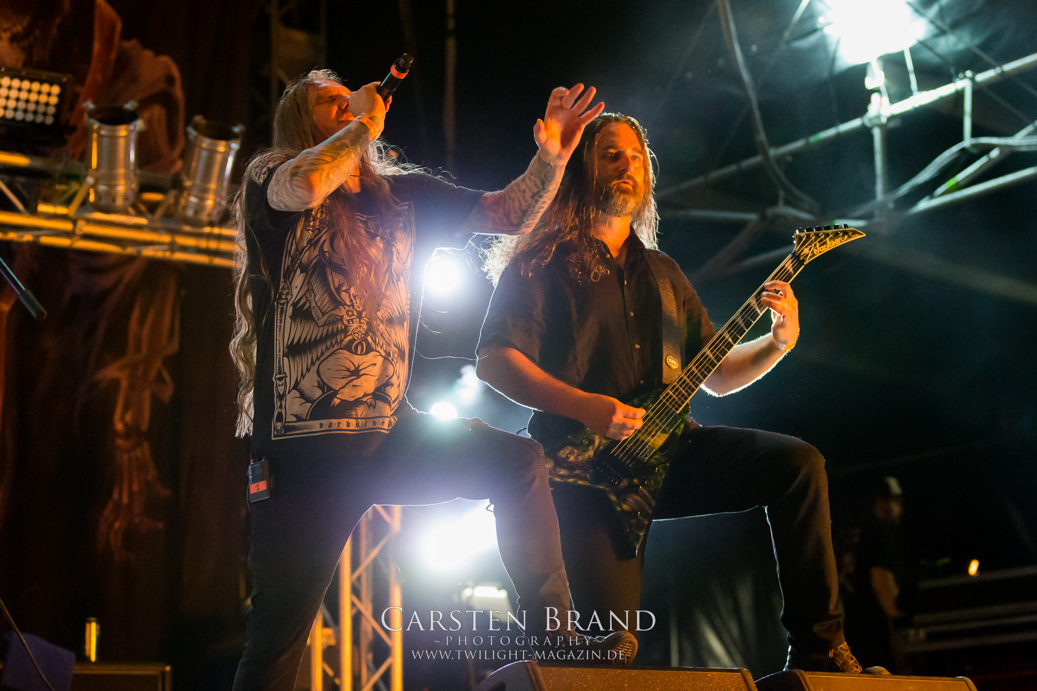 ARKONA aus dem tiefsten Osten sieht man inzwischen gefühlt auf jedem europäischen Festival der härteren Gangart. Vielleicht liegt es an der aufwendigen Bühnenshow mit altertümlichen Instrumenten, Tierfell und Knochenresteverwertung, vielleicht aber auch an der energetischen Sängerin Masha. Auf jeden Fall ist der Bühnenvorplatz immer gut gefüllt und es wird ordentlich mitgesungen, selbst wenn man des Russischen nicht mächtig ist. (MS) NIGHT DEMON machen wie schon vor zwei Jahren eindrucksvoll klar, dass sie als klassische Heavy Metal – Band alles andere als bloßes Beiwerk auf dem Billing sind. Wie schon 2017 funktionieren Night Demon nicht nur musikalisch. Die Band profitiert von ihrer überragenden Live-Qualität und dem starken Song-Material von "Cursed Of The Damned" und "Darkness Remains". Der Maiden-Fan in mir vermisst zwar die "Wasted Years", dafür reißt man mit "Overkill" als Einstieg zu "Dawn Rider" einen Motörhead-Klassiker an. Das muss man auch erstmal so hinbekommen. Night Demon sind motiviert bis in die Haarspitzen und sprudeln über vor metallischer Energie. Selbst am späten Abend ist Frontmann Jarvis Leatherby noch wie ein Duracell-Hase auf dem Gelände anzutreffen.