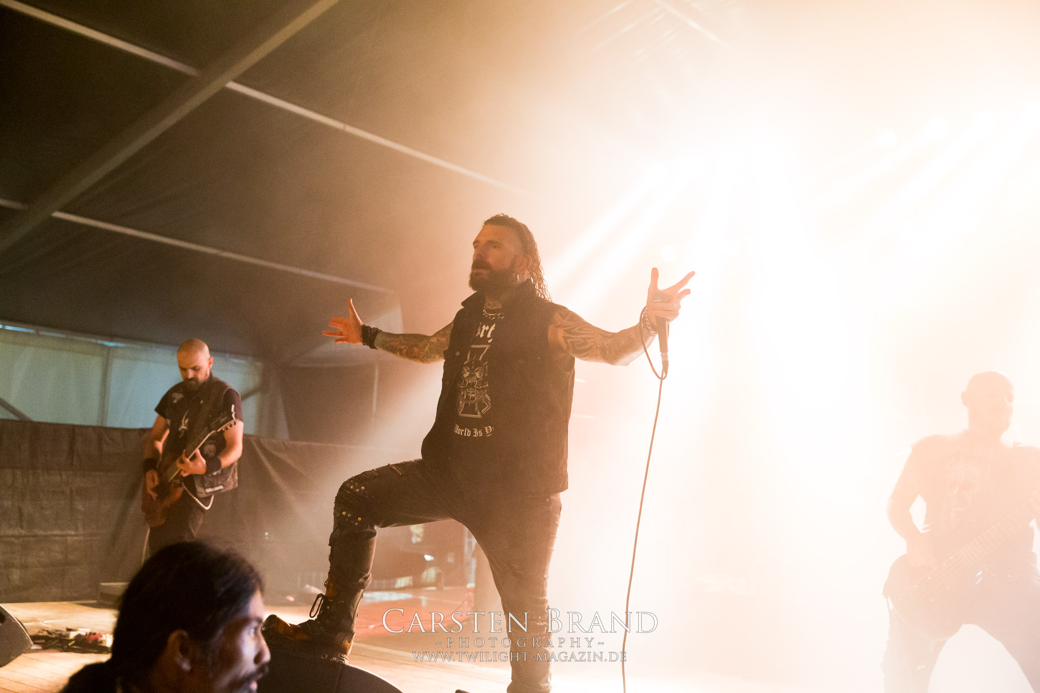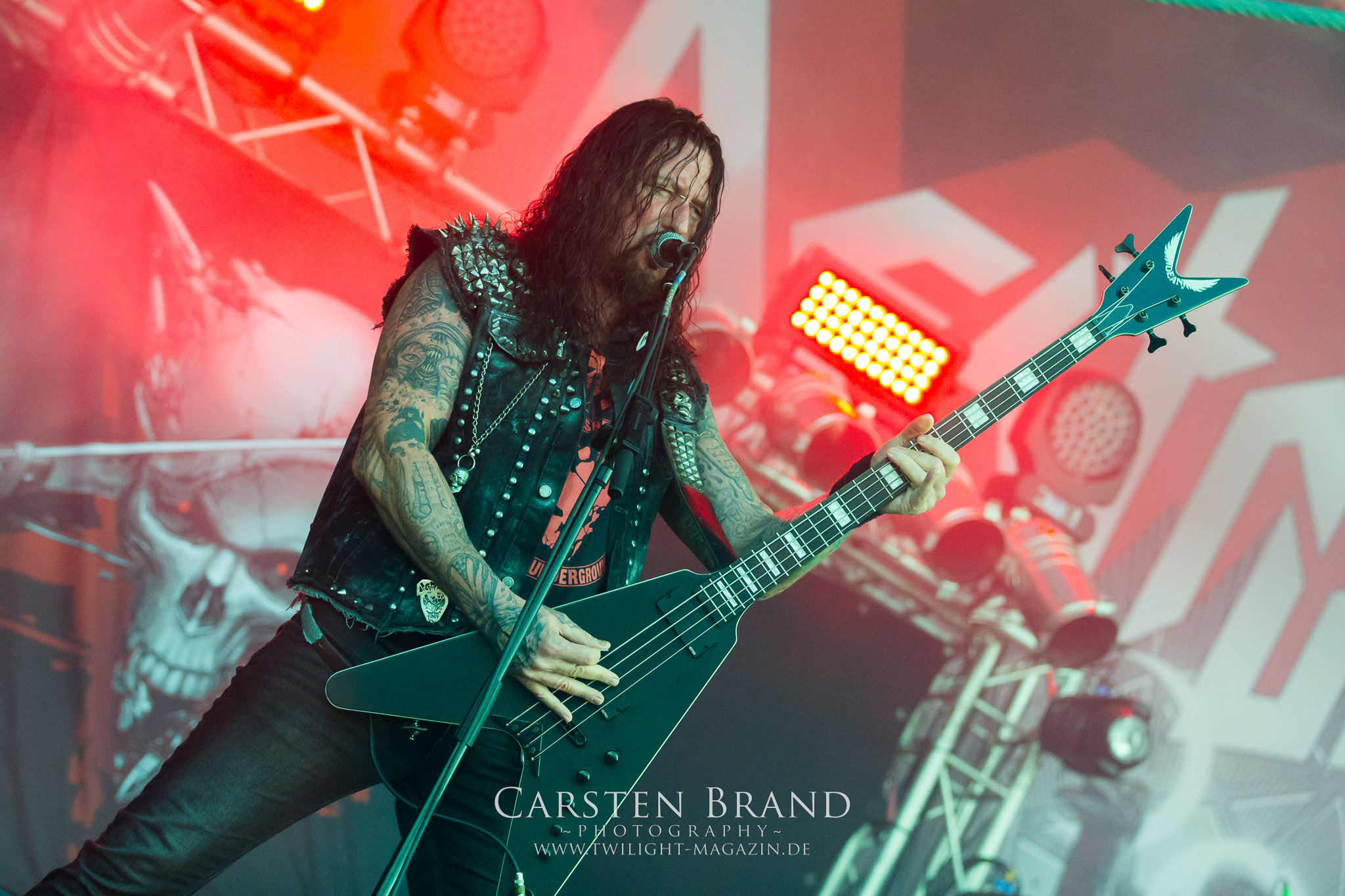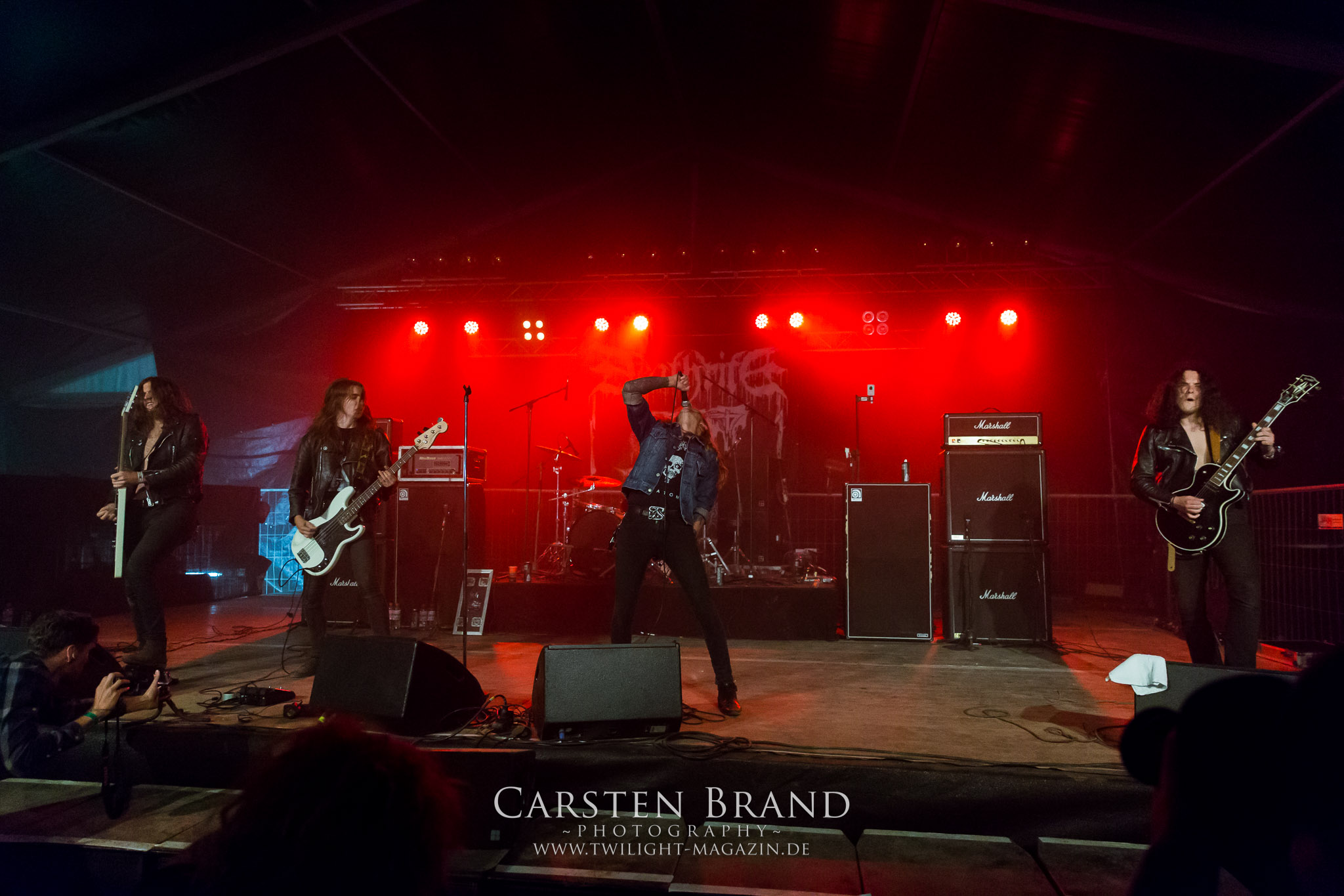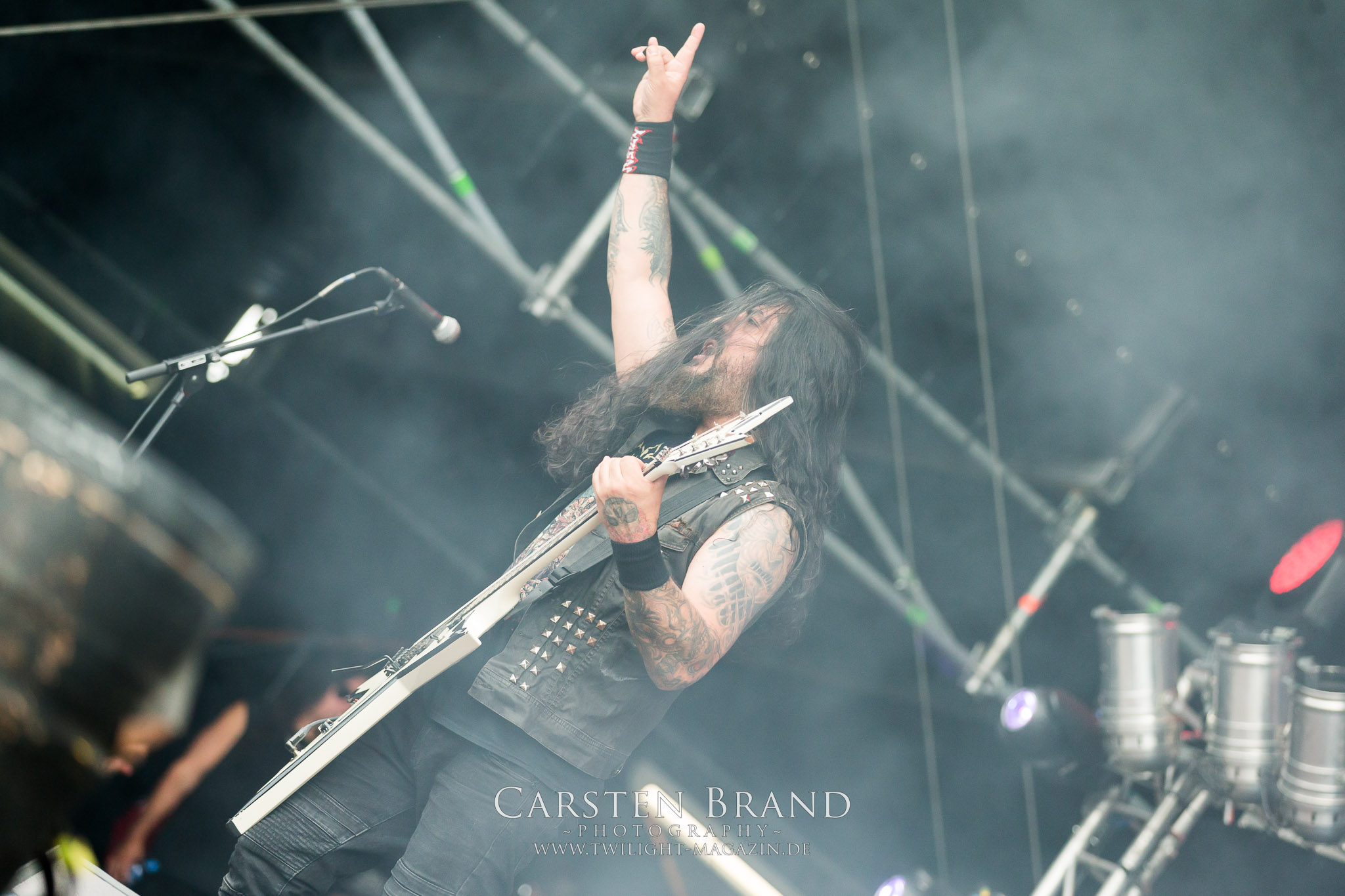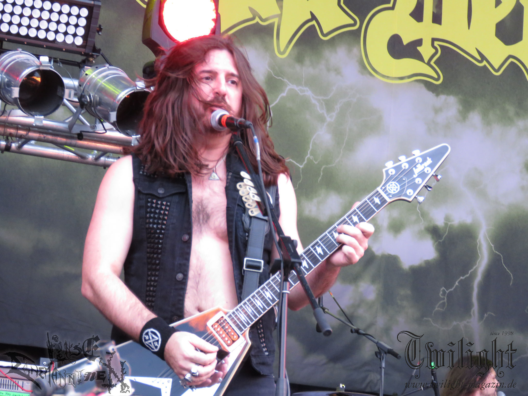 ARKONA aus dem tiefsten Osten sieht man inzwischen gefühlt auf jedem europäischen Festival der härteren Gangart. Vielleicht liegt es an der aufwendigen Bühnenshow mit altertümlichen Instrumenten, Tierfell und Knochenresteverwertung, vielleicht aber auch an der energetischen Sängerin Masha. Auf jeden Fall ist der Bühnenvorplatz immer gut gefüllt und es wird ordentlich mitgesungen, selbst wenn man des Russischen nicht mächtig ist. (MS) NIGHT DEMON machen wie schon vor zwei Jahren eindrucksvoll klar, dass sie als klassische Heavy Metal – Band alles andere als bloßes Beiwerk auf dem Billing sind. Wie schon 2017 funktionieren Night Demon nicht nur musikalisch. Die Band profitiert von ihrer überragenden Live-Qualität und dem starken Song-Material von "Cursed Of The Damned" und "Darkness Remains". Der Maiden-Fan in mir vermisst zwar die "Wasted Years", dafür reißt man mit "Overkill" als Einstieg zu "Dawn Rider" einen Motörhead-Klassiker an. Das muss man auch erstmal so hinbekommen. Night Demon sind motiviert bis in die Haarspitzen und sprudeln über vor metallischer Energie. Selbst am späten Abend ist Frontmann Jarvis Leatherby noch wie ein Duracell-Hase auf dem Gelände anzutreffen.