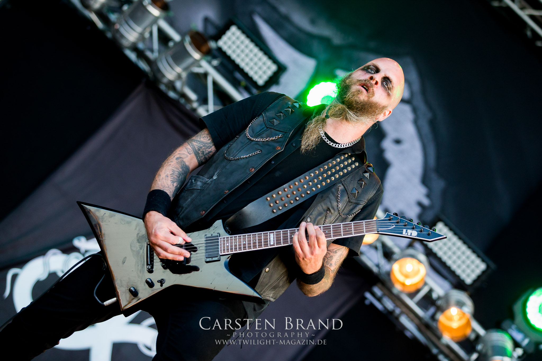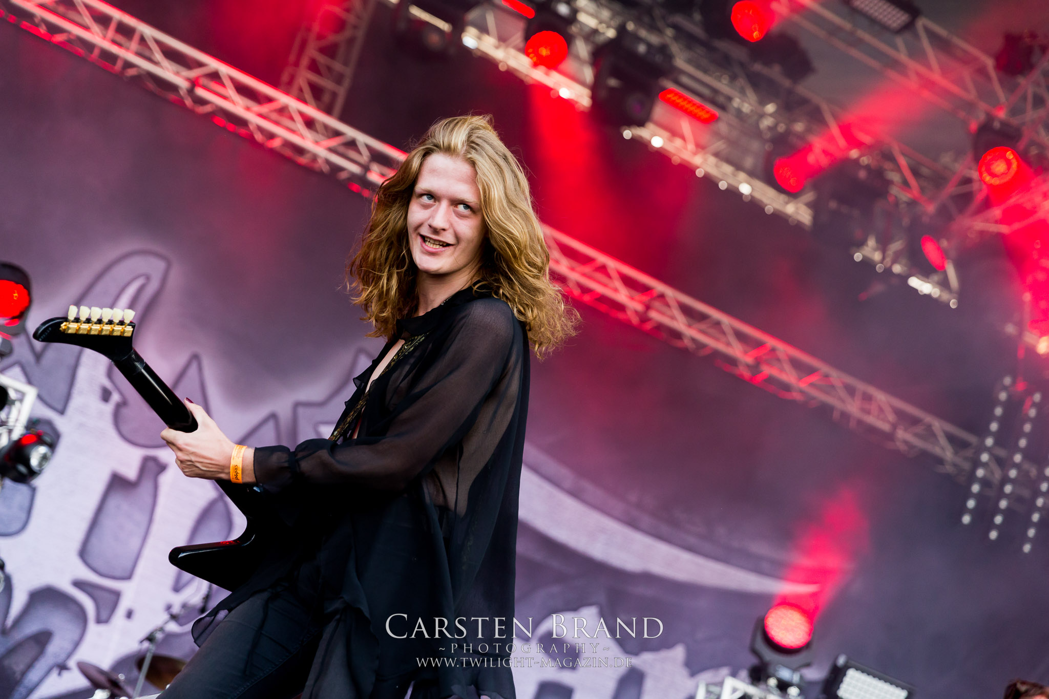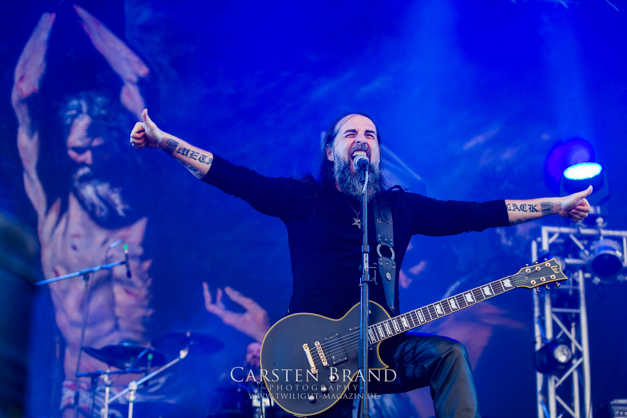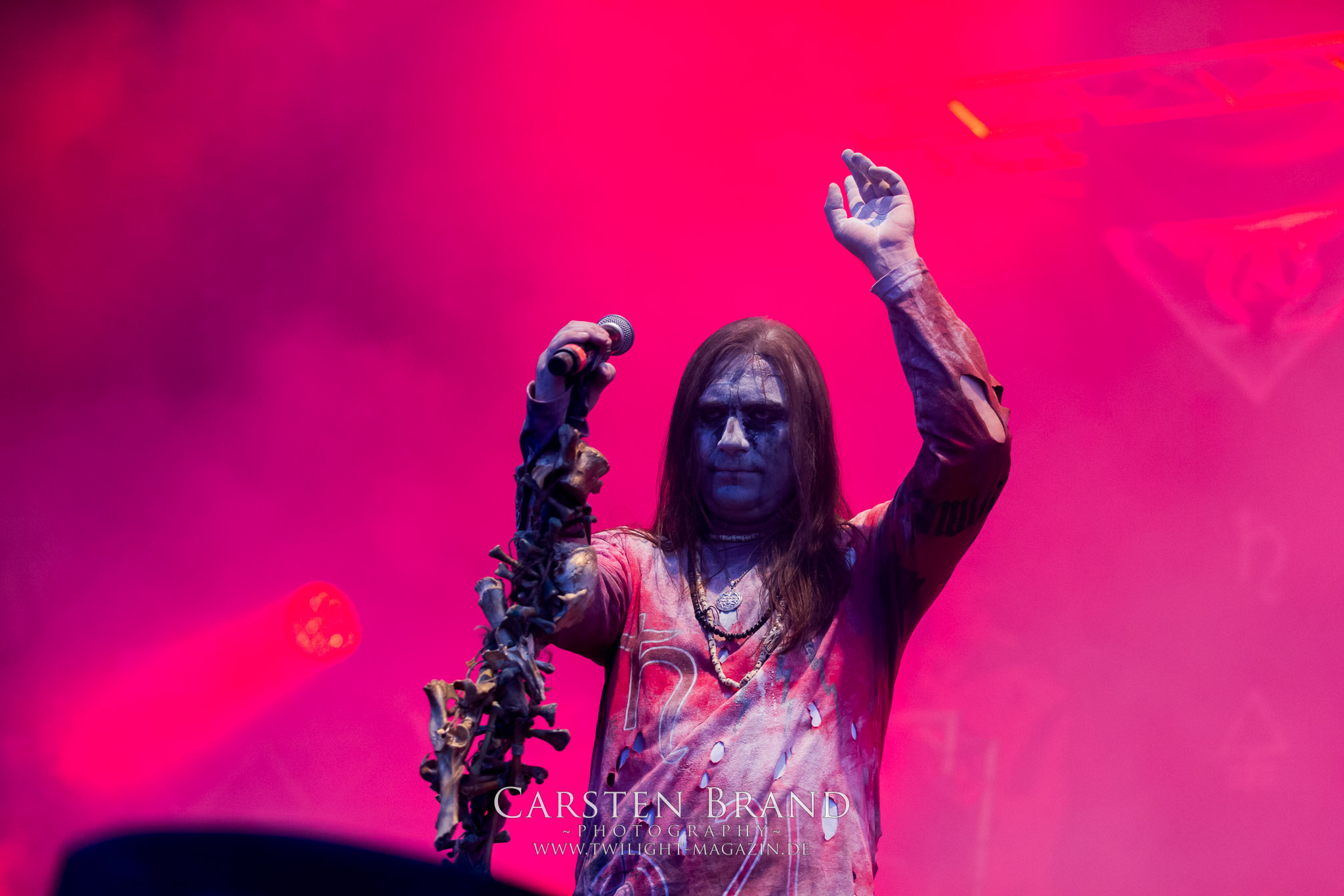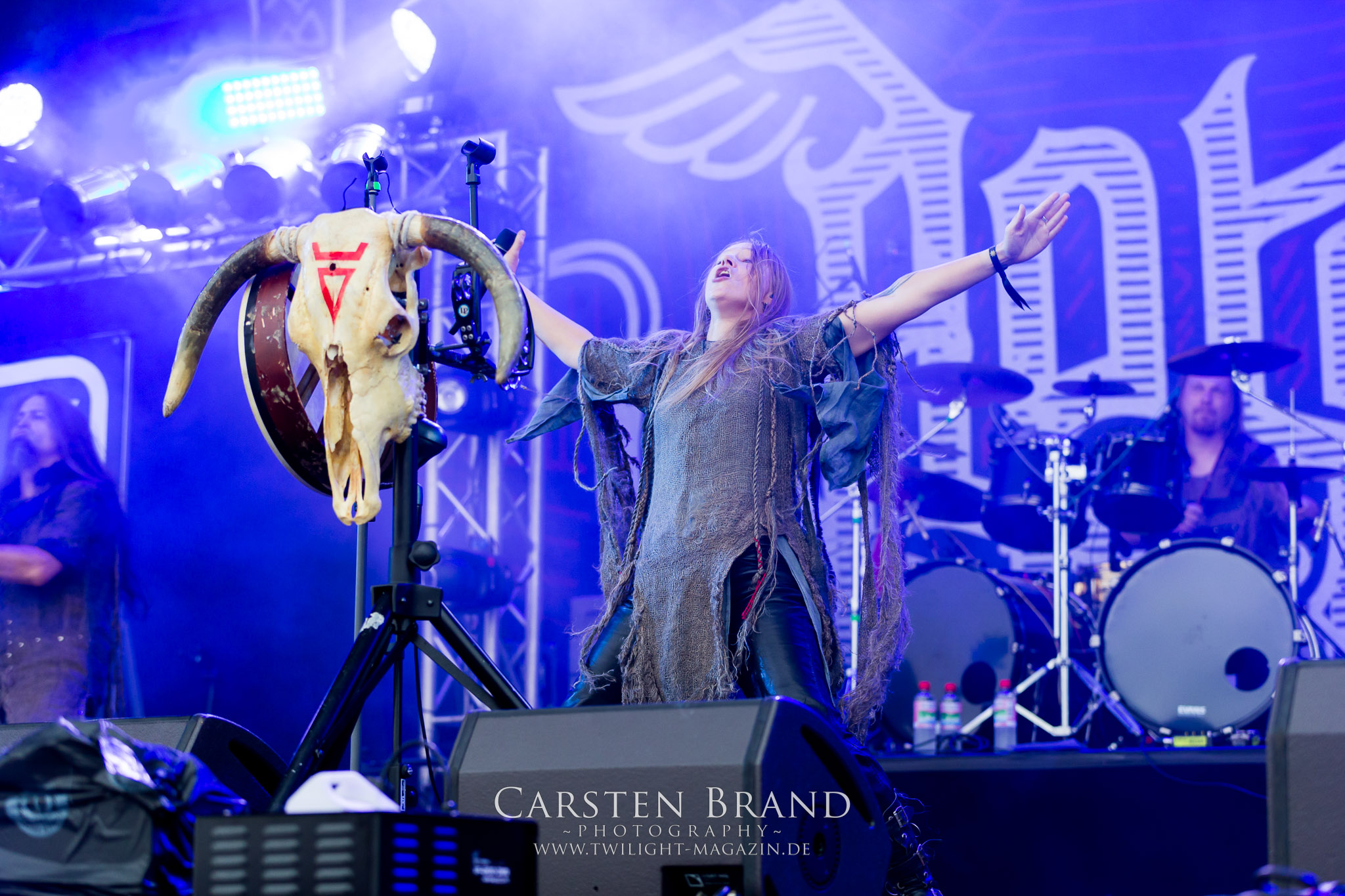 ARKONA aus dem tiefsten Osten sieht man inzwischen gefühlt auf jedem europäischen Festival der härteren Gangart. Vielleicht liegt es an der aufwendigen Bühnenshow mit altertümlichen Instrumenten, Tierfell und Knochenresteverwertung, vielleicht aber auch an der energetischen Sängerin Masha. Auf jeden Fall ist der Bühnenvorplatz immer gut gefüllt und es wird ordentlich mitgesungen, selbst wenn man des Russischen nicht mächtig ist. (MS) NIGHT DEMON machen wie schon vor zwei Jahren eindrucksvoll klar, dass sie als klassische Heavy Metal – Band alles andere als bloßes Beiwerk auf dem Billing sind. Wie schon 2017 funktionieren Night Demon nicht nur musikalisch. Die Band profitiert von ihrer überragenden Live-Qualität und dem starken Song-Material von "Cursed Of The Damned" und "Darkness Remains". Der Maiden-Fan in mir vermisst zwar die "Wasted Years", dafür reißt man mit "Overkill" als Einstieg zu "Dawn Rider" einen Motörhead-Klassiker an. Das muss man auch erstmal so hinbekommen. Night Demon sind motiviert bis in die Haarspitzen und sprudeln über vor metallischer Energie. Selbst am späten Abend ist Frontmann Jarvis Leatherby noch wie ein Duracell-Hase auf dem Gelände anzutreffen.