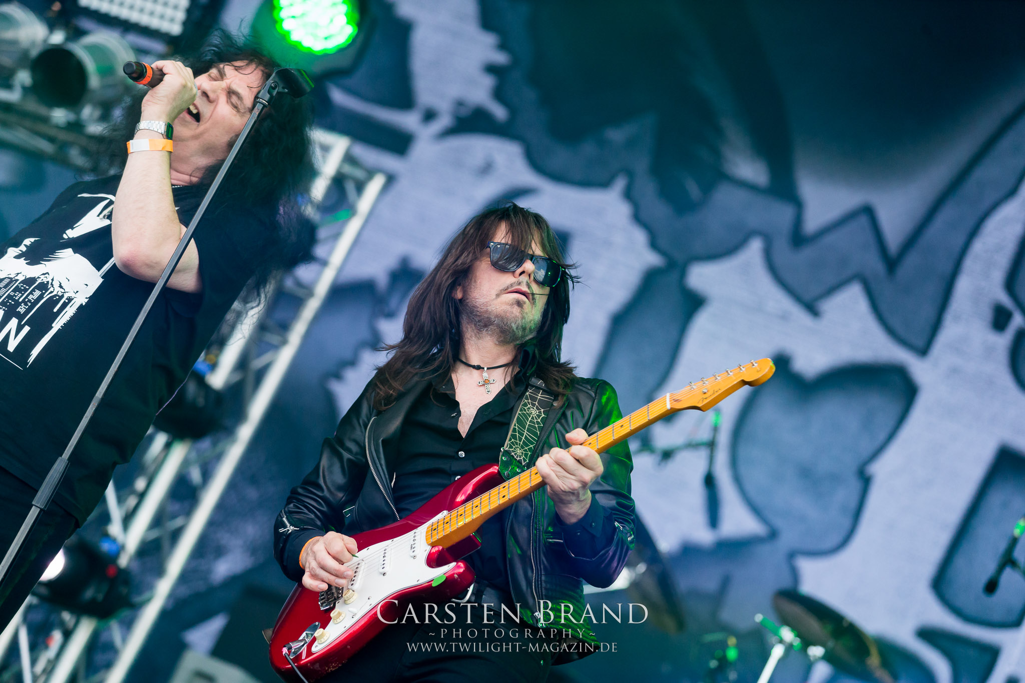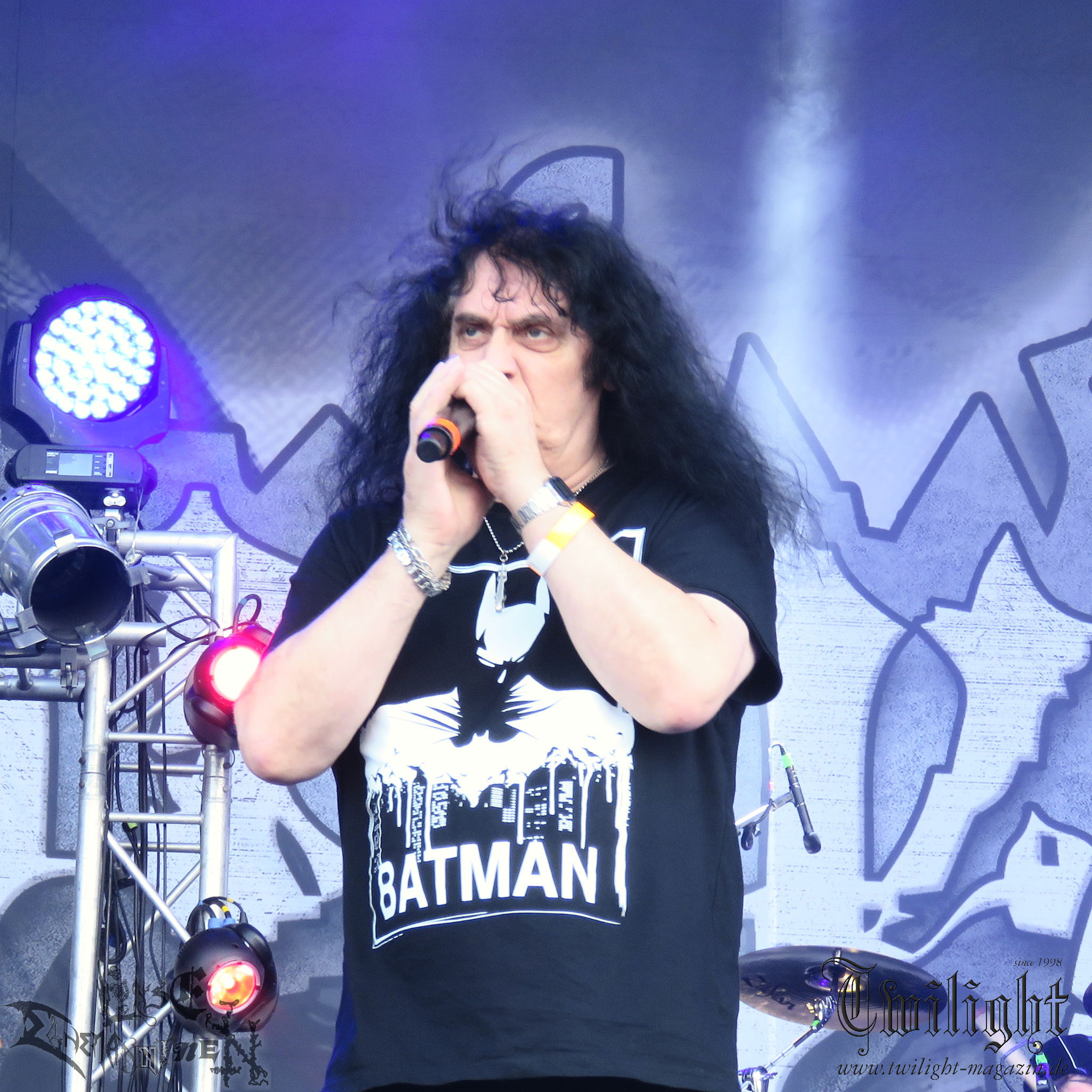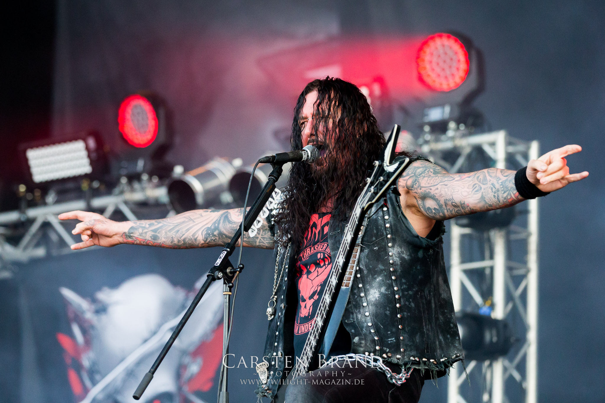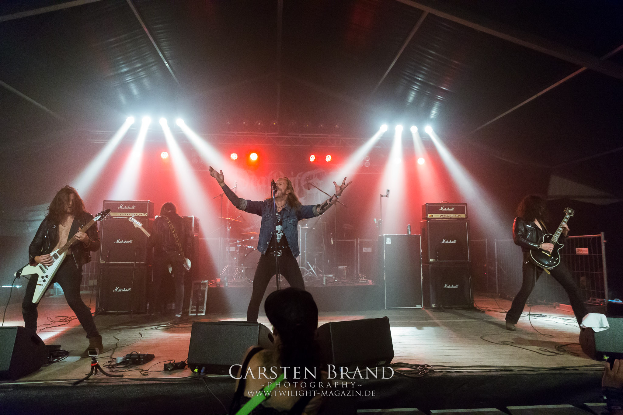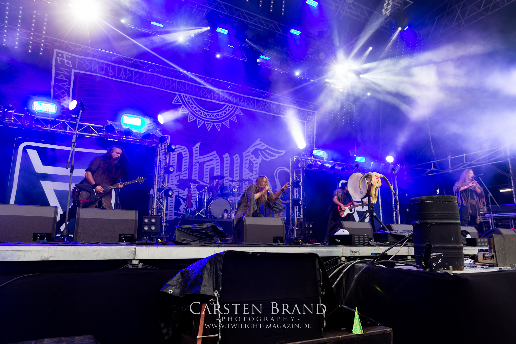 ARKONA aus dem tiefsten Osten sieht man inzwischen gefühlt auf jedem europäischen Festival der härteren Gangart. Vielleicht liegt es an der aufwendigen Bühnenshow mit altertümlichen Instrumenten, Tierfell und Knochenresteverwertung, vielleicht aber auch an der energetischen Sängerin Masha. Auf jeden Fall ist der Bühnenvorplatz immer gut gefüllt und es wird ordentlich mitgesungen, selbst wenn man des Russischen nicht mächtig ist. (MS) NIGHT DEMON machen wie schon vor zwei Jahren eindrucksvoll klar, dass sie als klassische Heavy Metal – Band alles andere als bloßes Beiwerk auf dem Billing sind. Wie schon 2017 funktionieren Night Demon nicht nur musikalisch. Die Band profitiert von ihrer überragenden Live-Qualität und dem starken Song-Material von "Cursed Of The Damned" und "Darkness Remains". Der Maiden-Fan in mir vermisst zwar die "Wasted Years", dafür reißt man mit "Overkill" als Einstieg zu "Dawn Rider" einen Motörhead-Klassiker an. Das muss man auch erstmal so hinbekommen. Night Demon sind motiviert bis in die Haarspitzen und sprudeln über vor metallischer Energie. Selbst am späten Abend ist Frontmann Jarvis Leatherby noch wie ein Duracell-Hase auf dem Gelände anzutreffen.