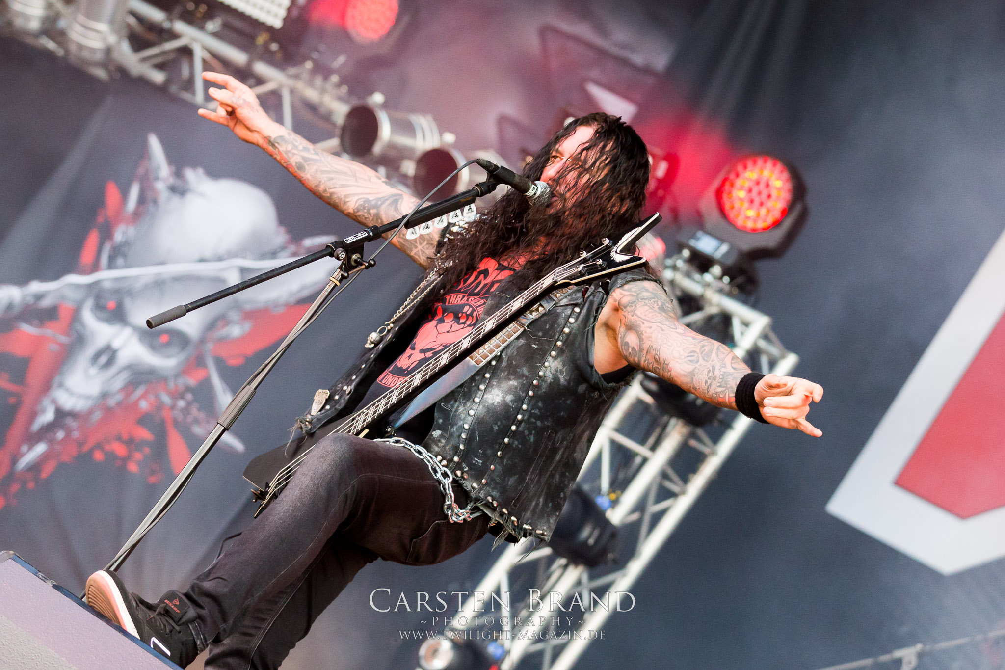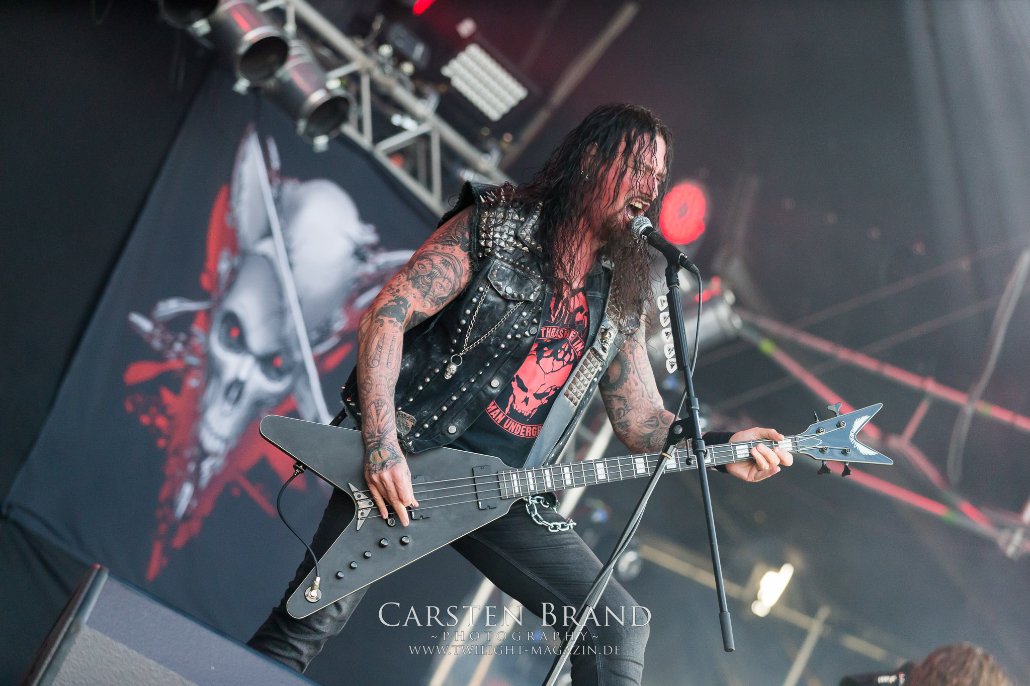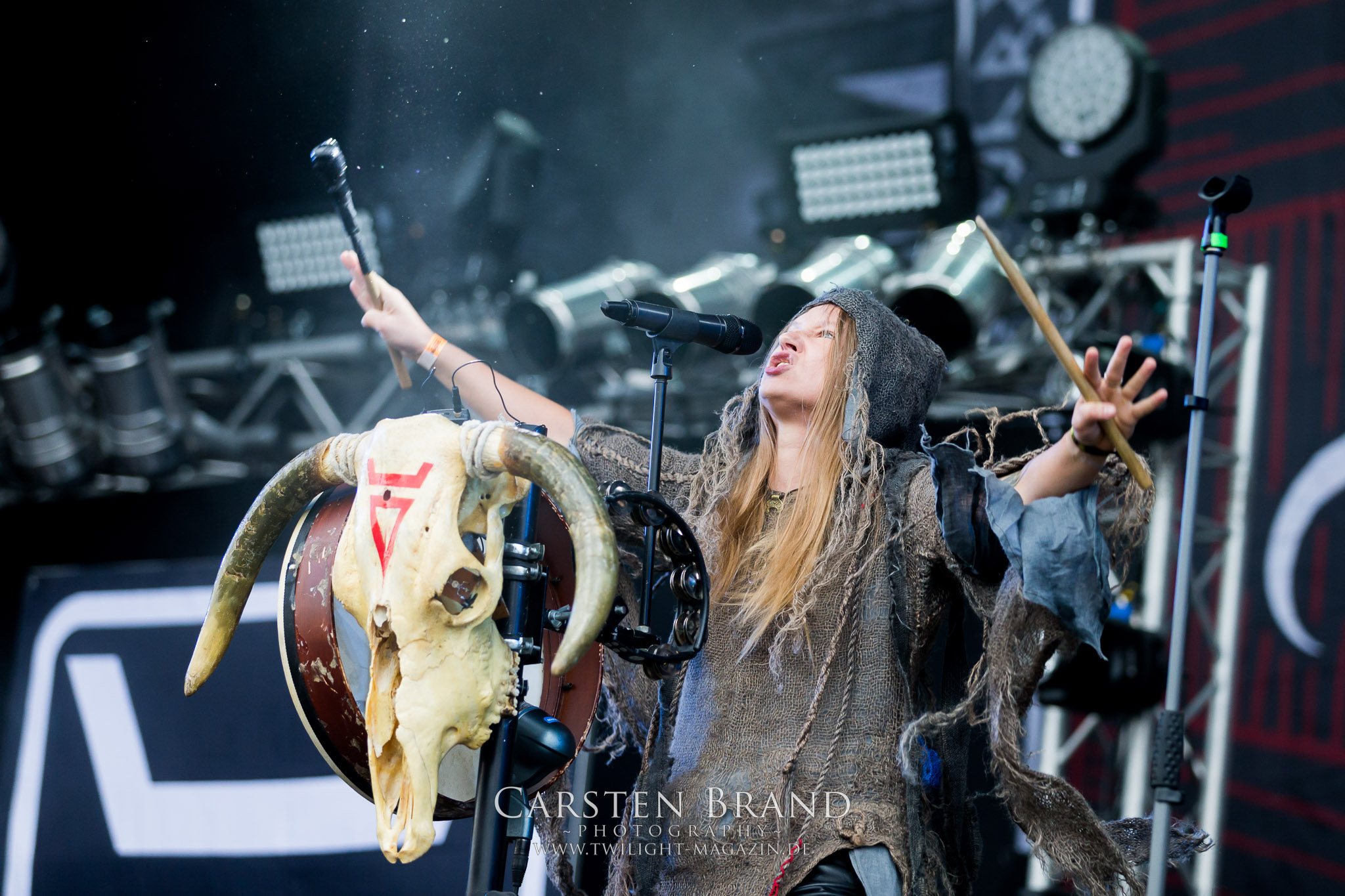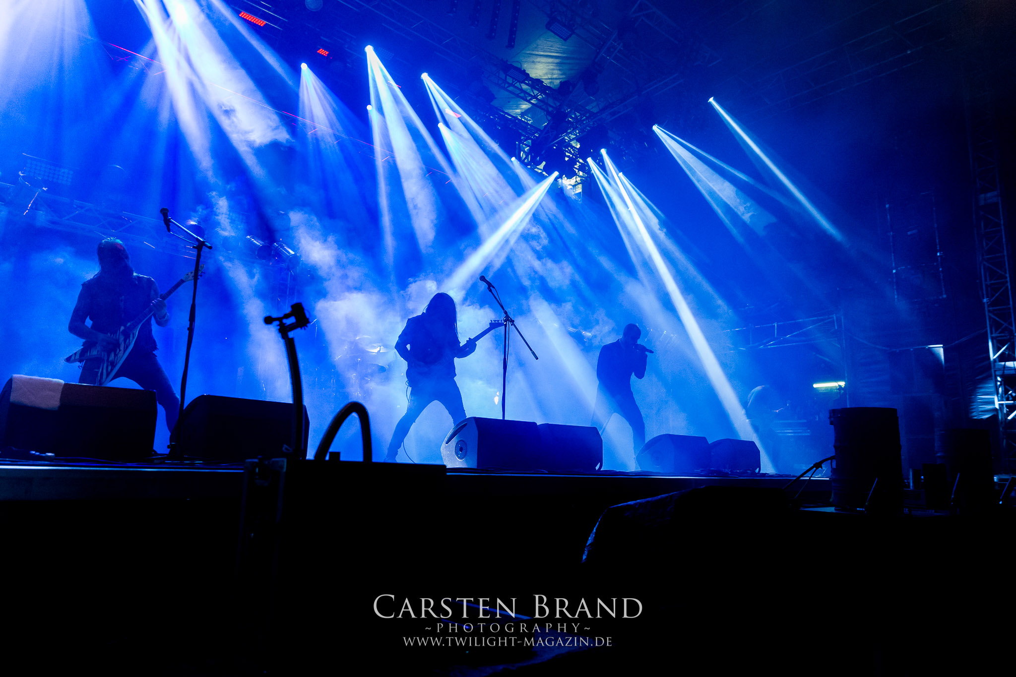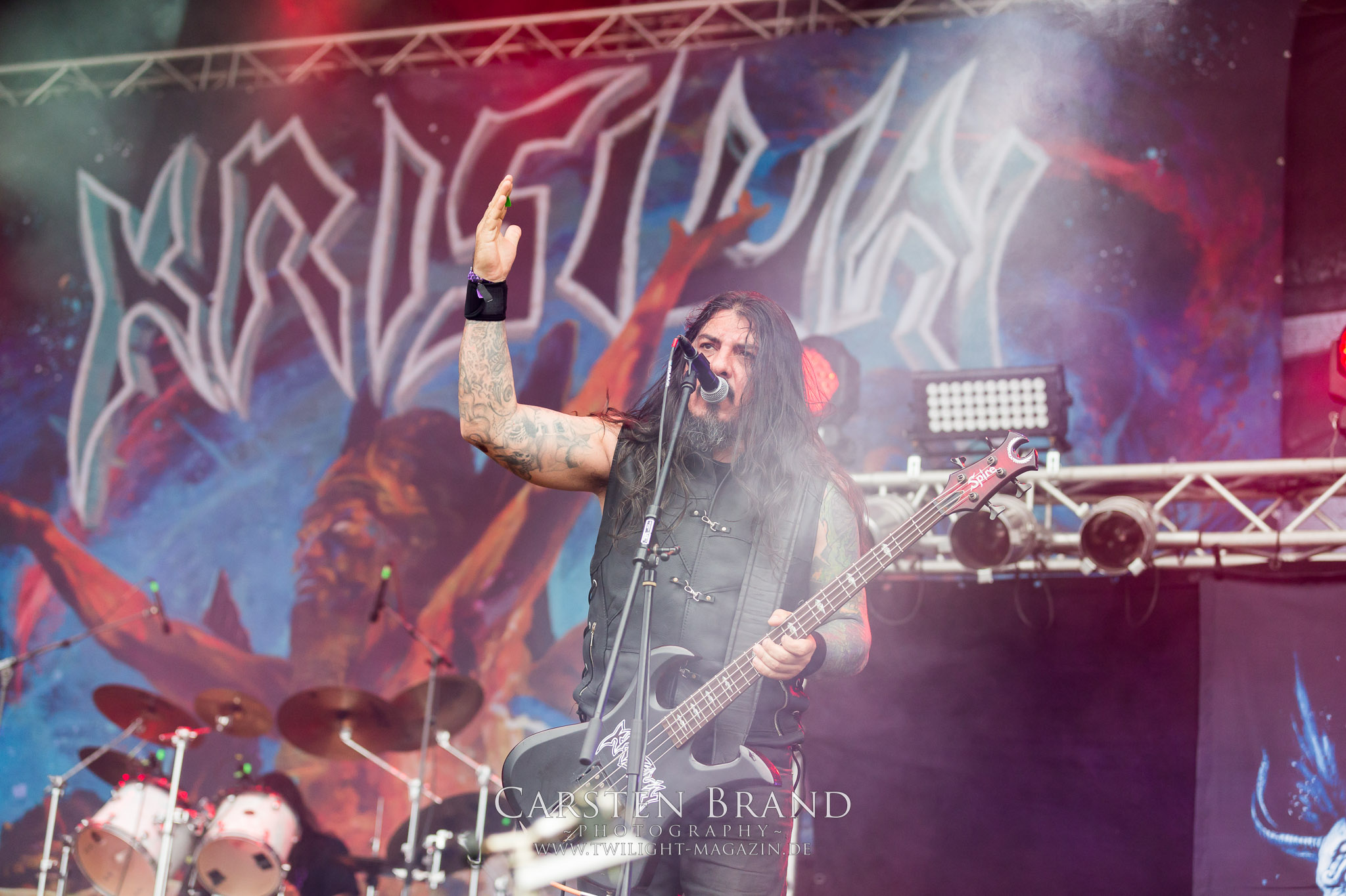 ARKONA aus dem tiefsten Osten sieht man inzwischen gefühlt auf jedem europäischen Festival der härteren Gangart. Vielleicht liegt es an der aufwendigen Bühnenshow mit altertümlichen Instrumenten, Tierfell und Knochenresteverwertung, vielleicht aber auch an der energetischen Sängerin Masha. Auf jeden Fall ist der Bühnenvorplatz immer gut gefüllt und es wird ordentlich mitgesungen, selbst wenn man des Russischen nicht mächtig ist. (MS) NIGHT DEMON machen wie schon vor zwei Jahren eindrucksvoll klar, dass sie als klassische Heavy Metal – Band alles andere als bloßes Beiwerk auf dem Billing sind. Wie schon 2017 funktionieren Night Demon nicht nur musikalisch. Die Band profitiert von ihrer überragenden Live-Qualität und dem starken Song-Material von "Cursed Of The Damned" und "Darkness Remains". Der Maiden-Fan in mir vermisst zwar die "Wasted Years", dafür reißt man mit "Overkill" als Einstieg zu "Dawn Rider" einen Motörhead-Klassiker an. Das muss man auch erstmal so hinbekommen. Night Demon sind motiviert bis in die Haarspitzen und sprudeln über vor metallischer Energie. Selbst am späten Abend ist Frontmann Jarvis Leatherby noch wie ein Duracell-Hase auf dem Gelände anzutreffen.